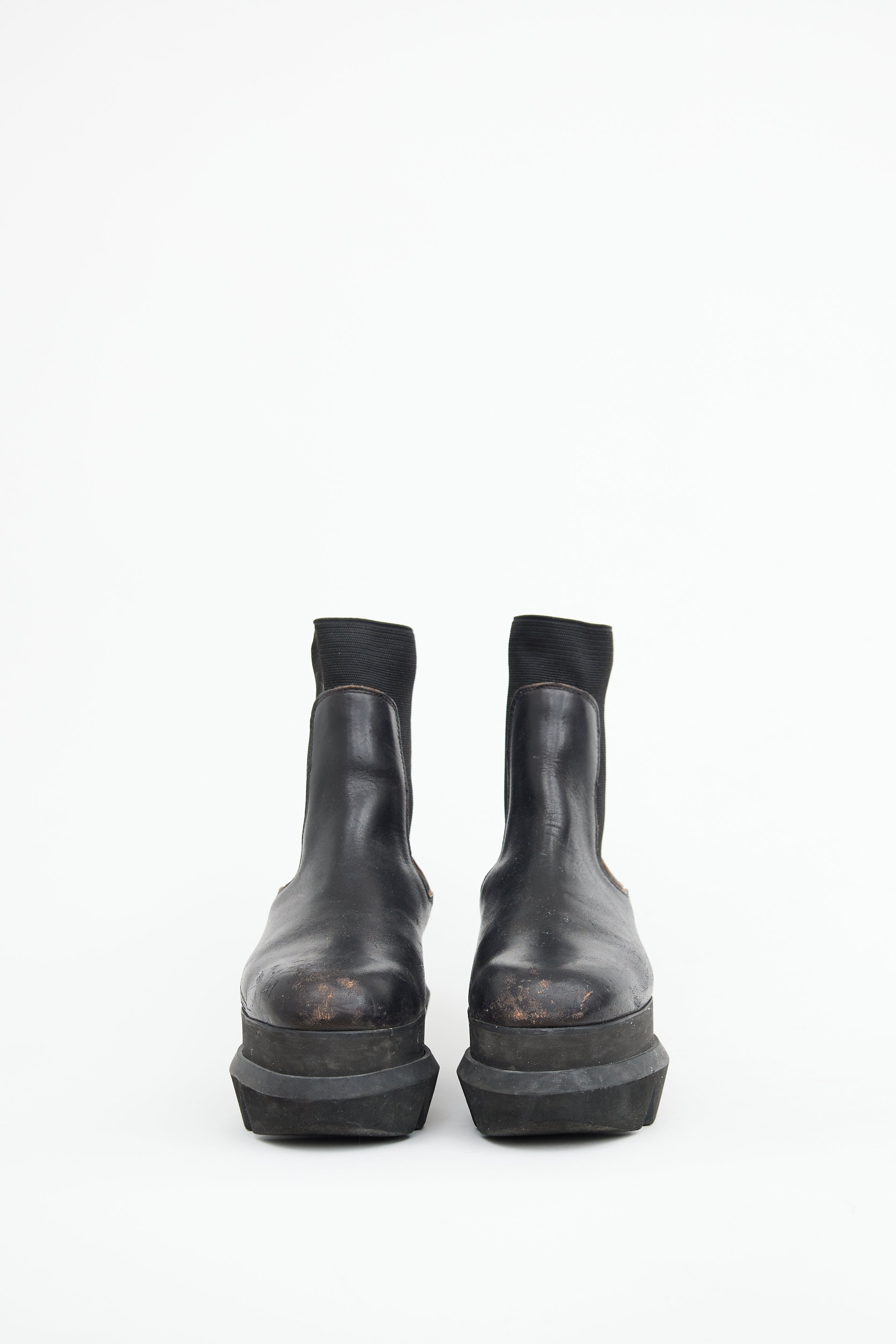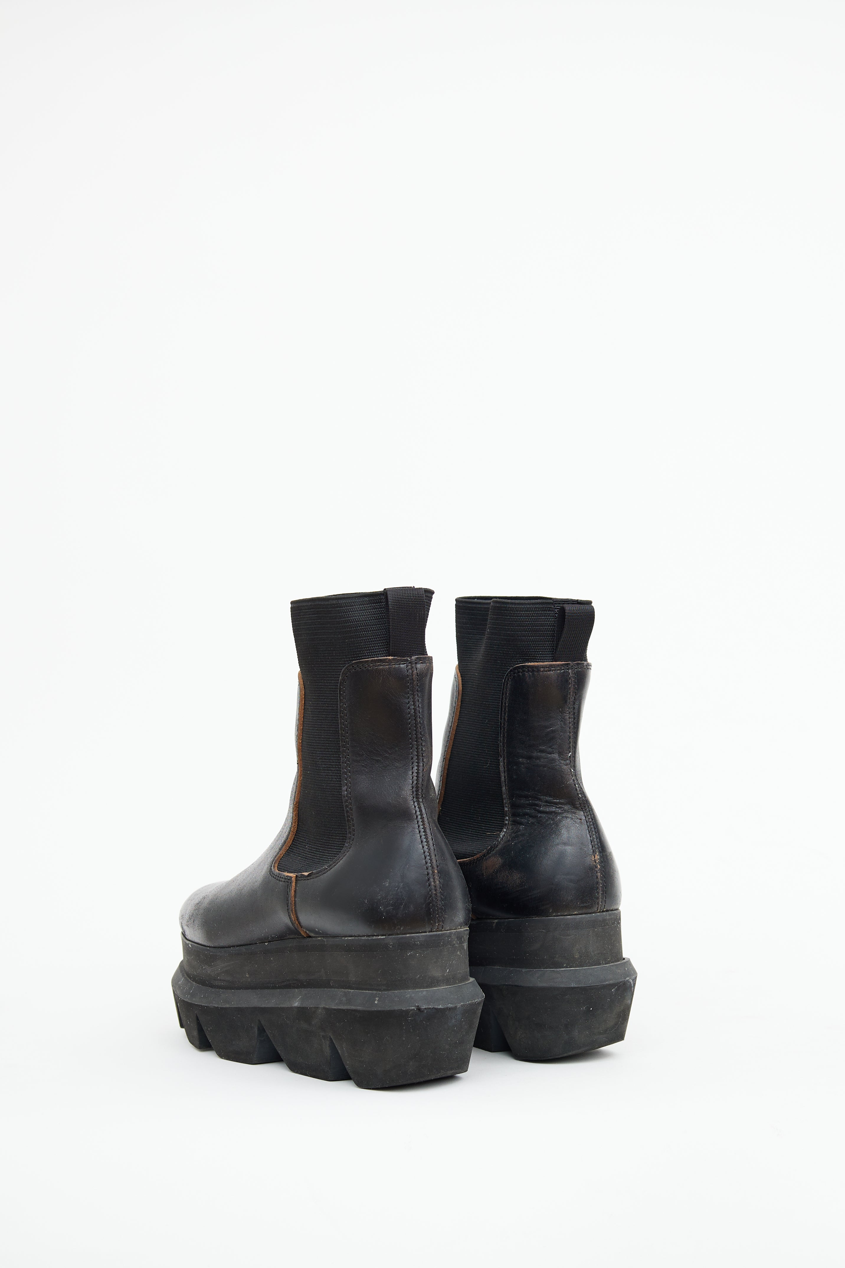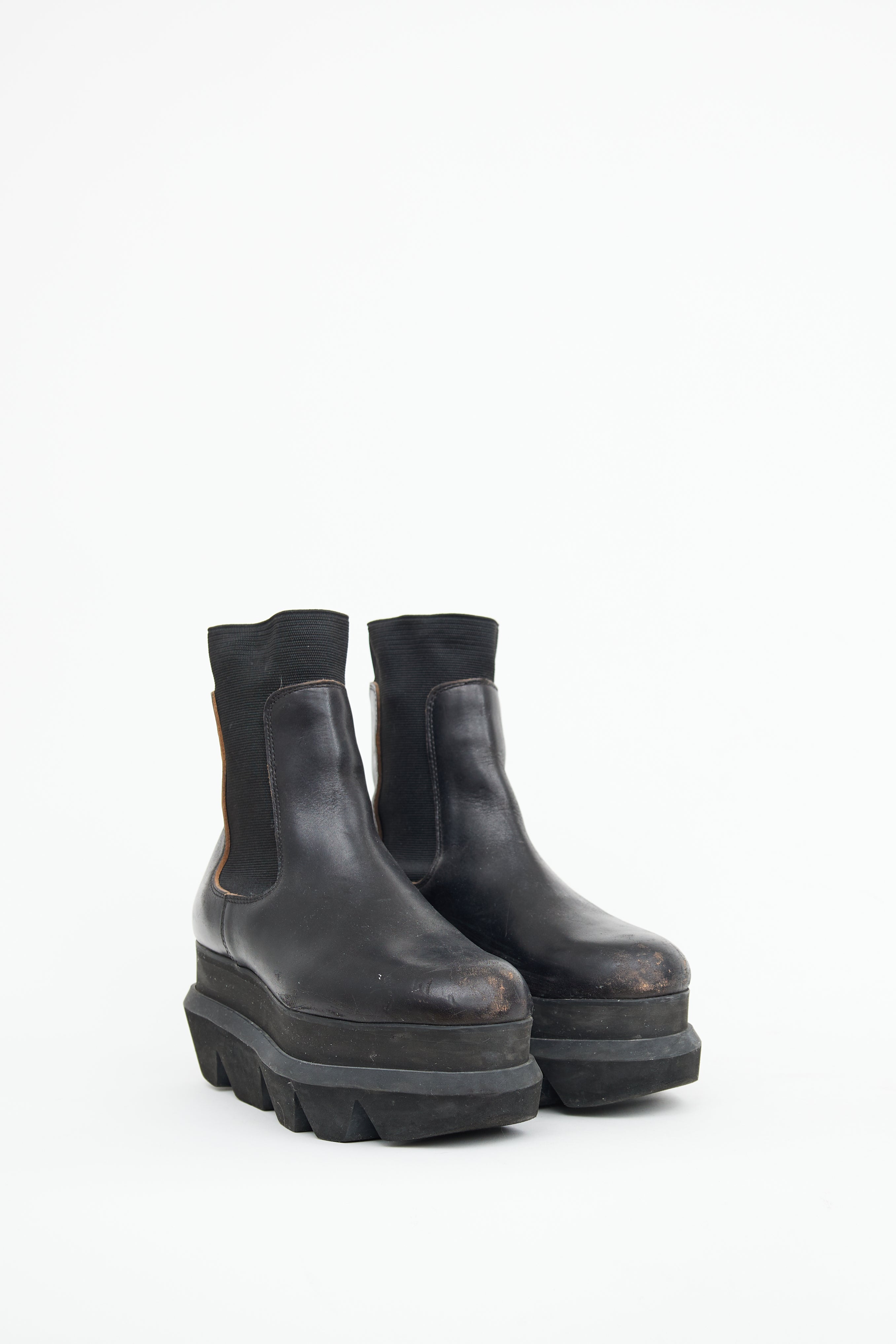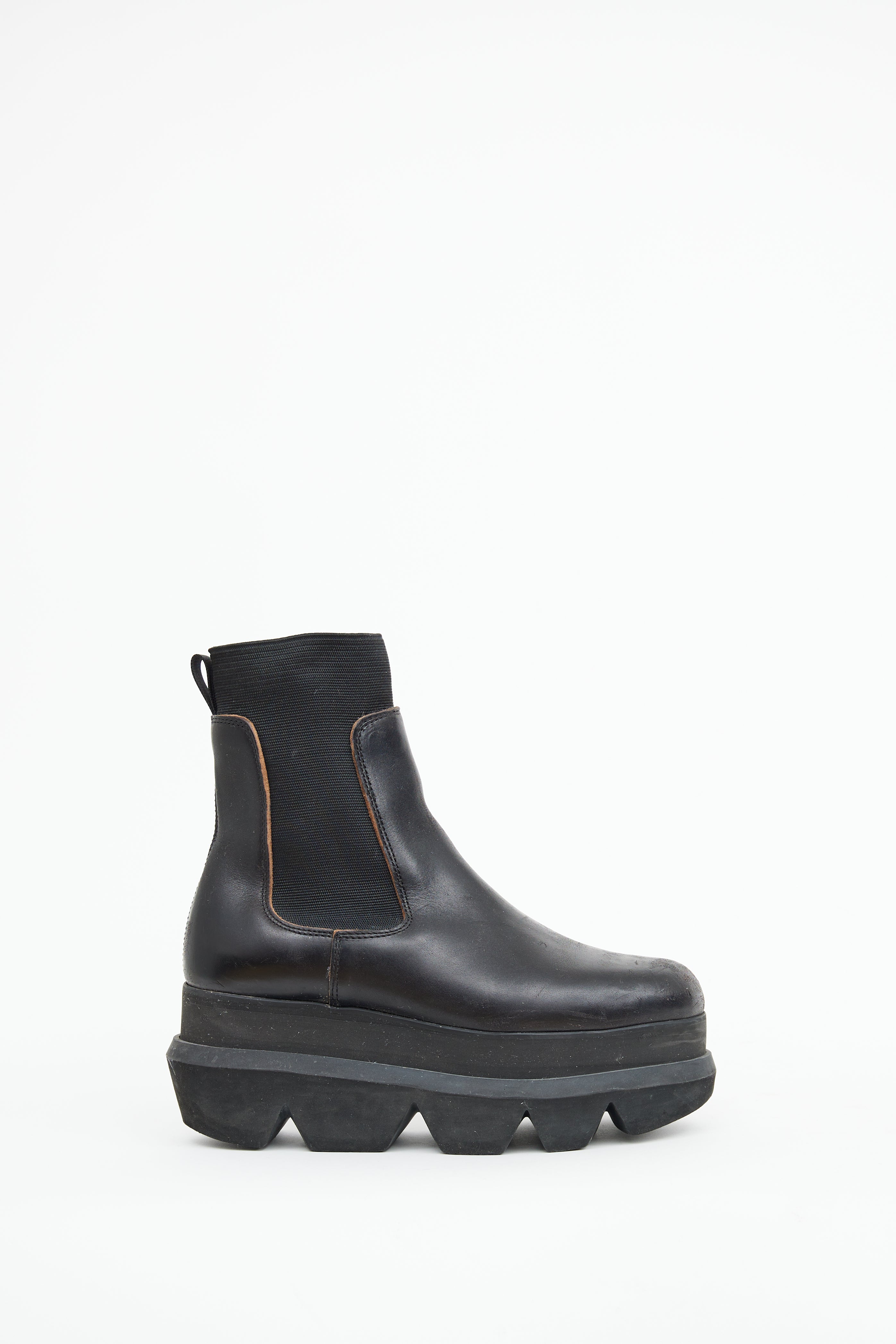 Pre-owned Sacai black Chelsea boots featuring round toe, elastic side gussets, accentuated platform midsole, treaded outsole and pull tab on counter.