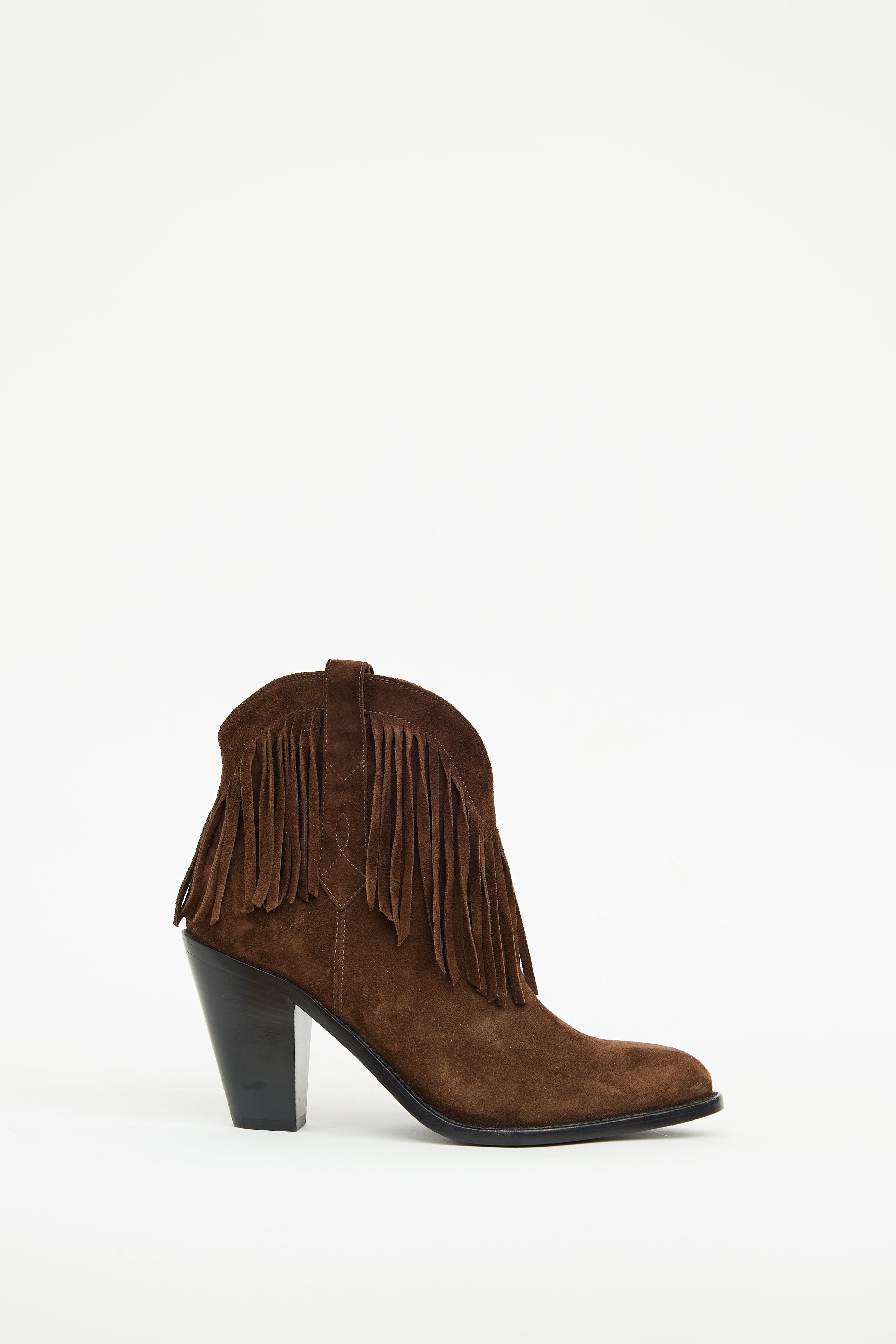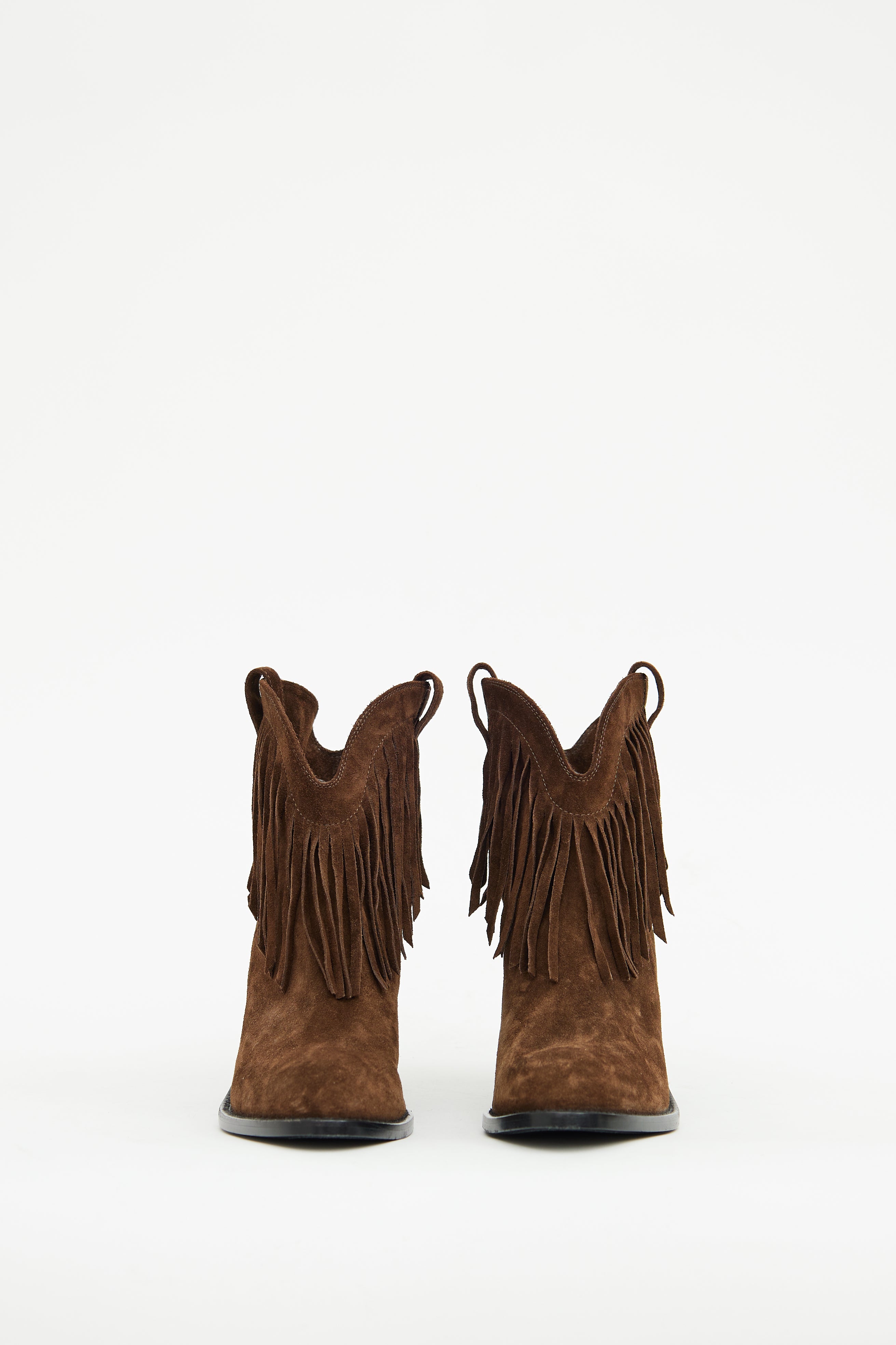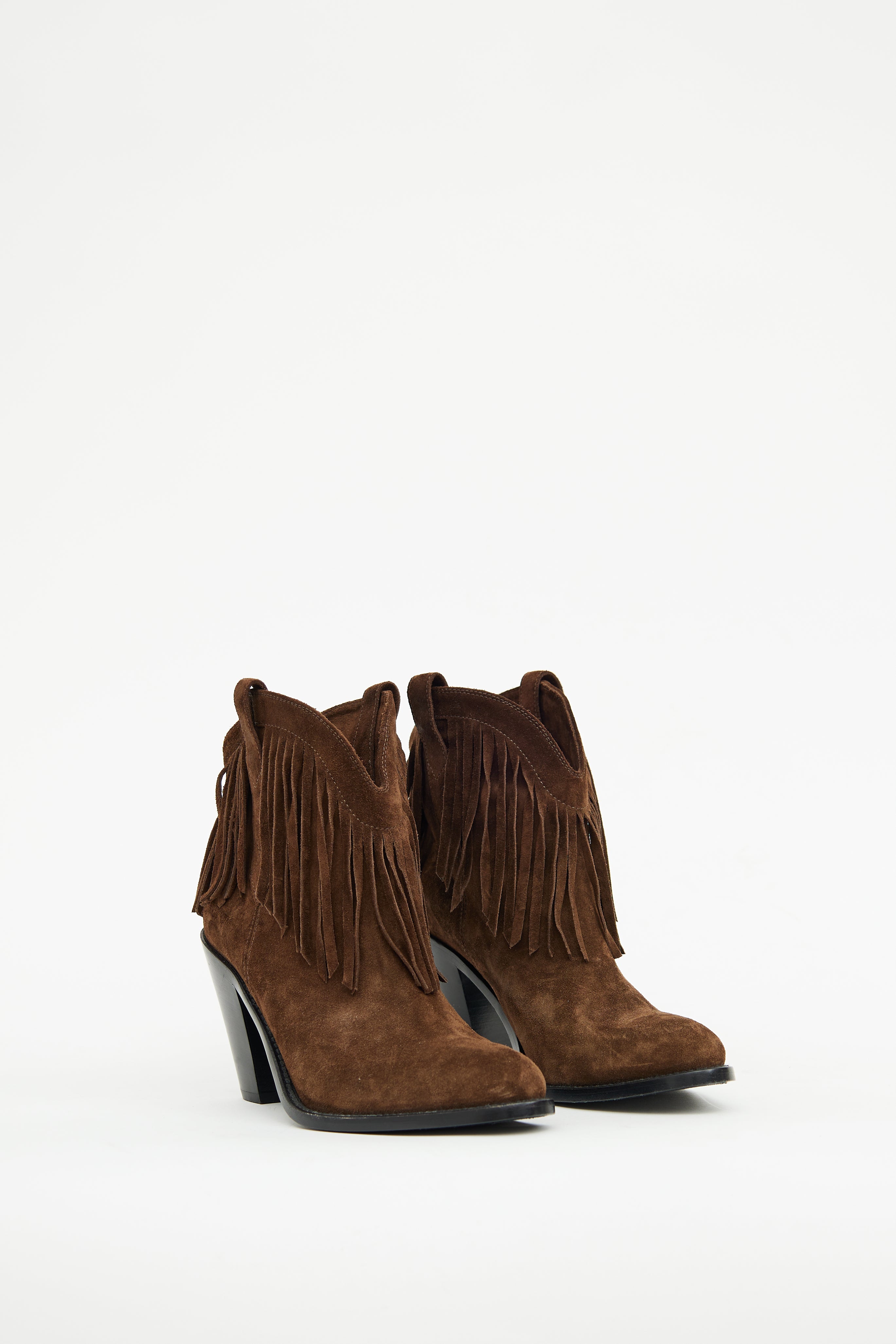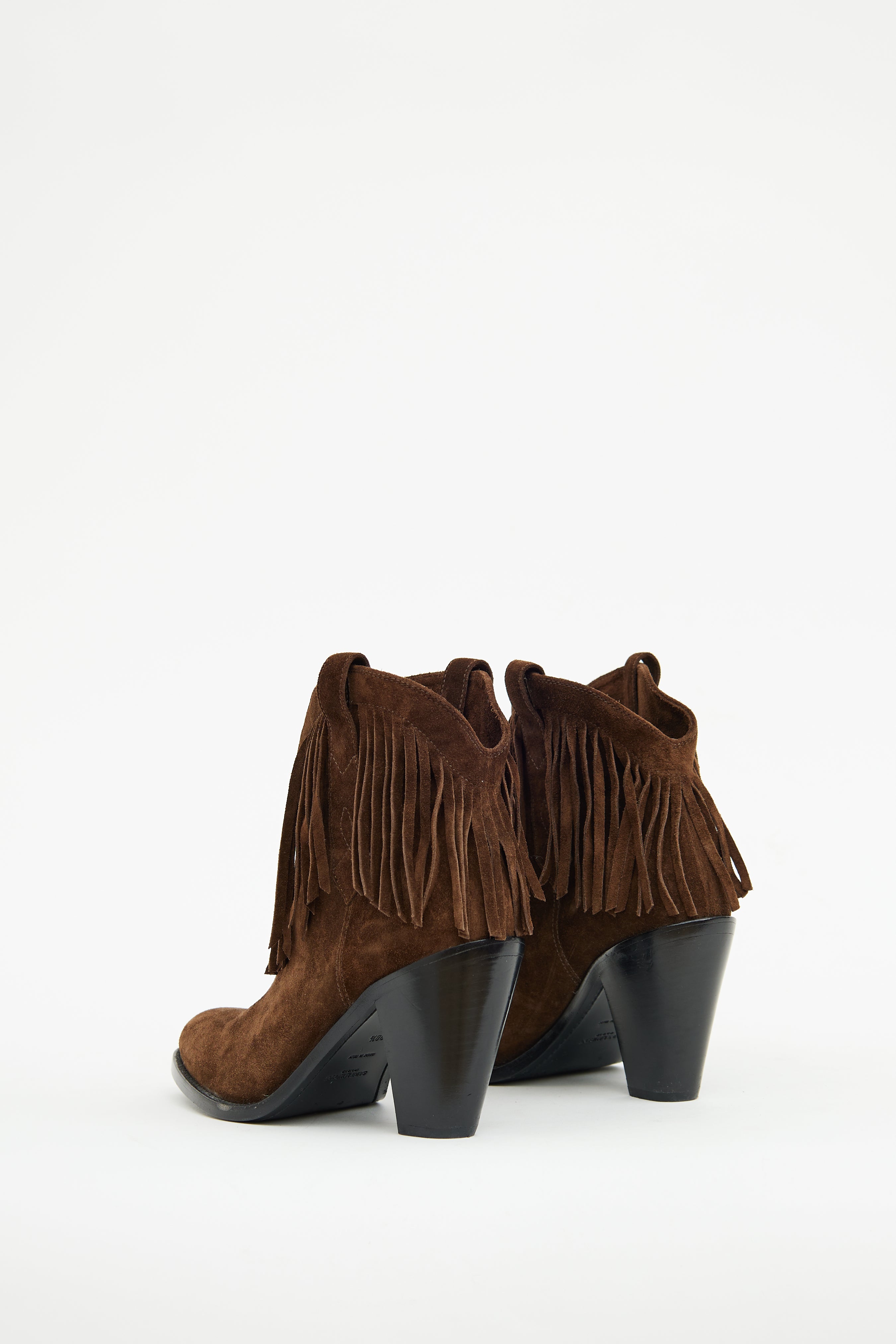 Pre-owned Saint Laurent brown suede heeled booties featuring soft pointed toe, block heel, pull tabs and fringe detailing around collar and tonal embroidery at ankle.