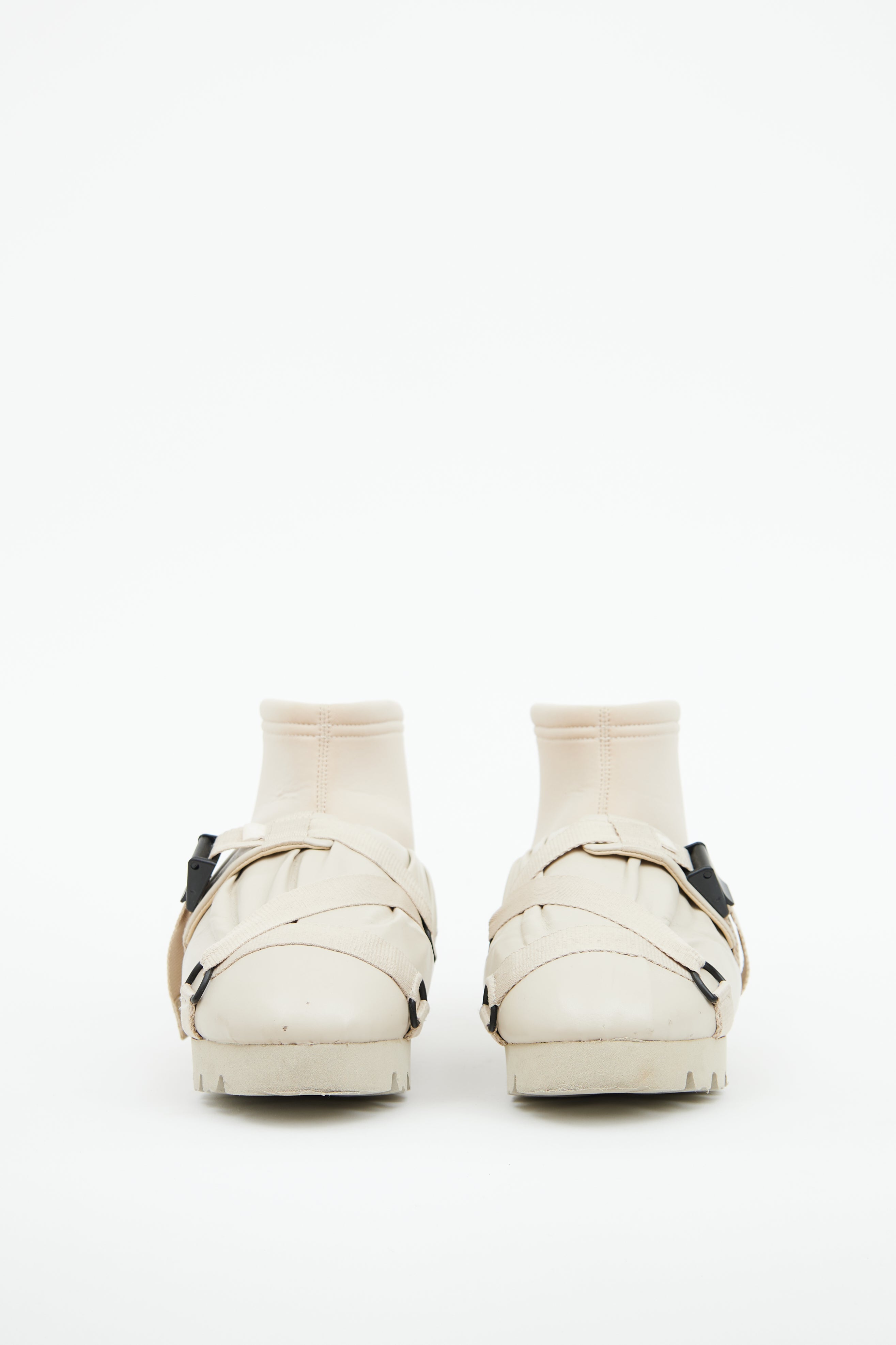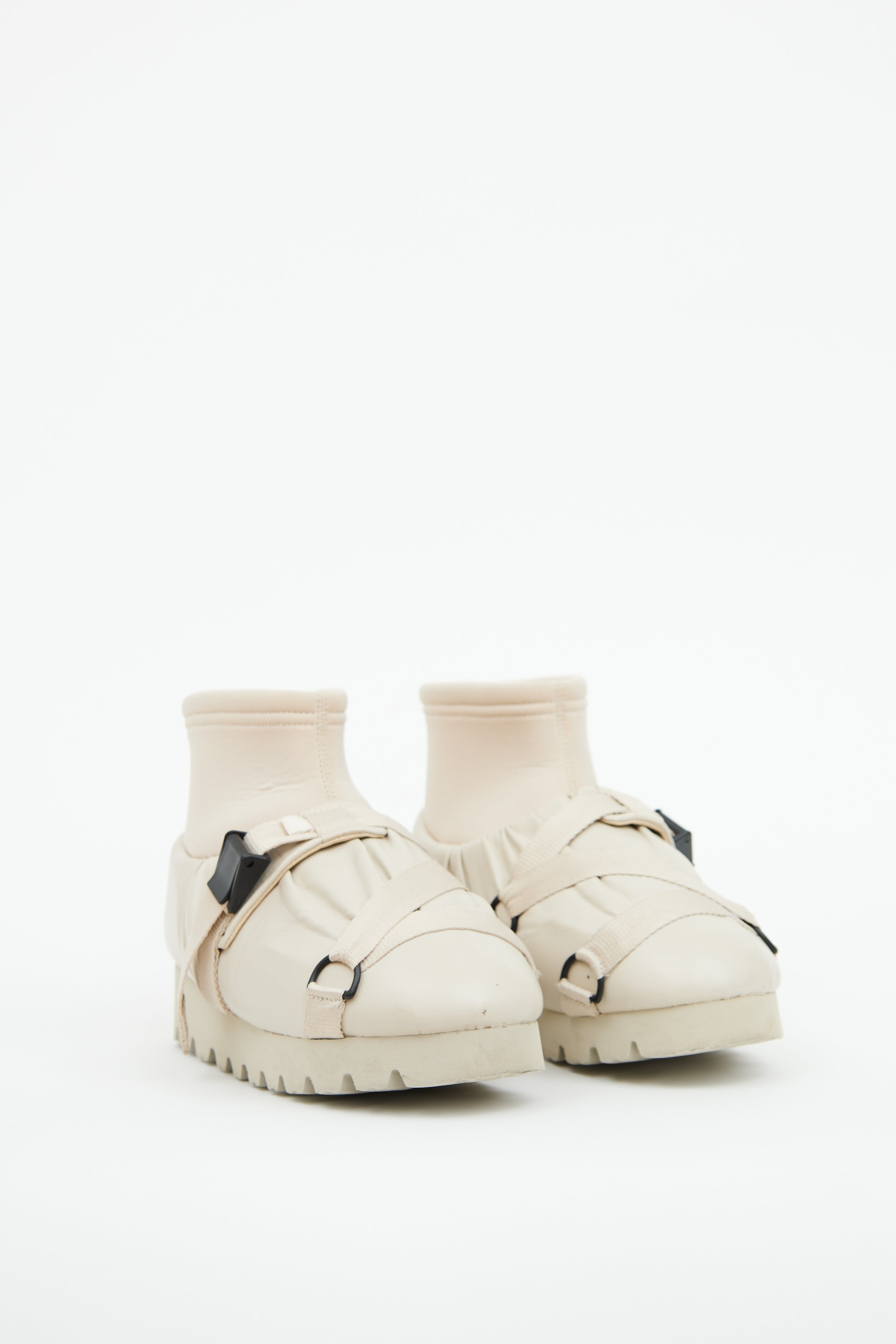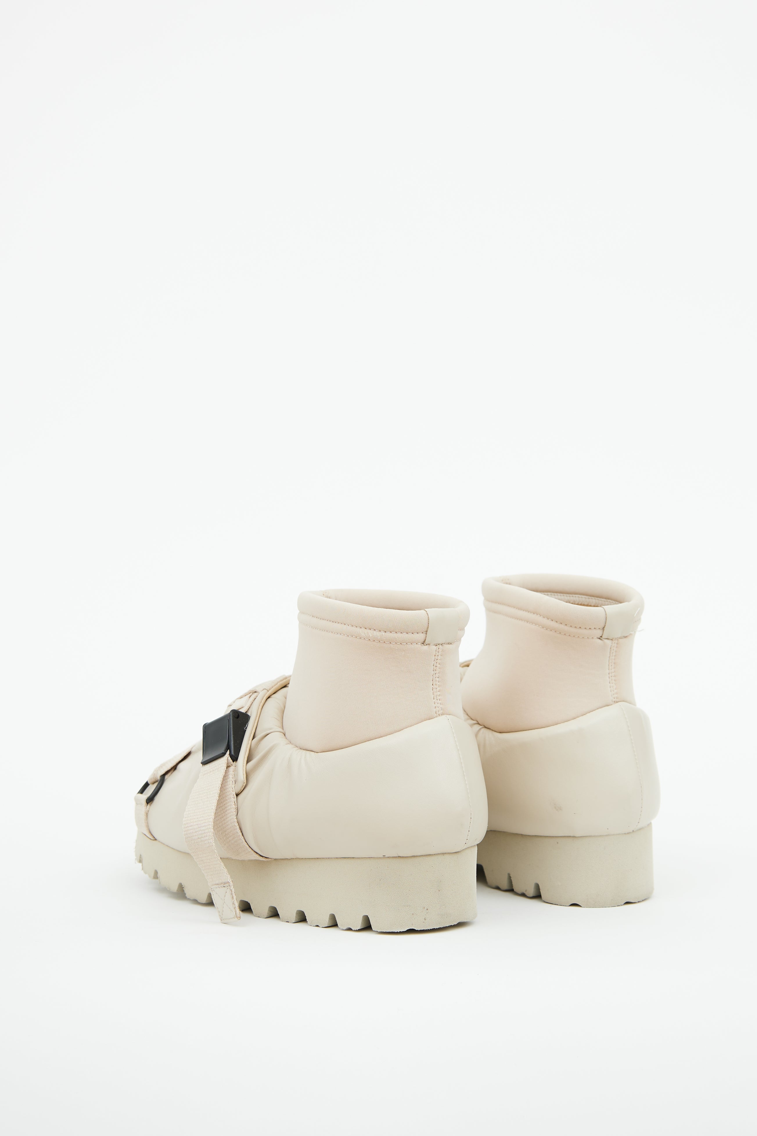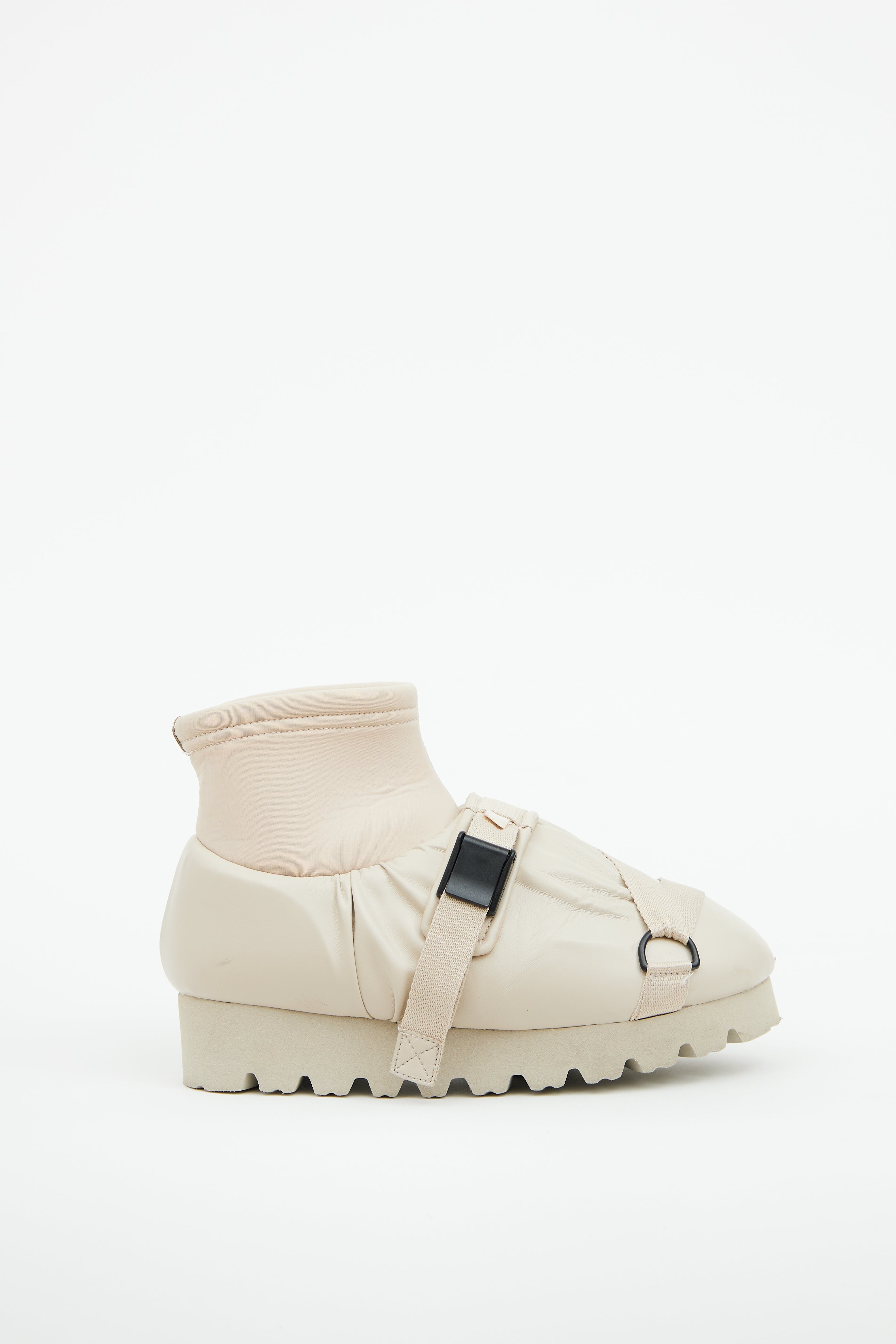 Pre-owned Yume Yume beige faux leather Nawa Camp boot featuring treaded rubber sole, faux leather uppers with gathering throughout, crisscross grosgrain cinch strap at vamp and slip on elastic cuff.