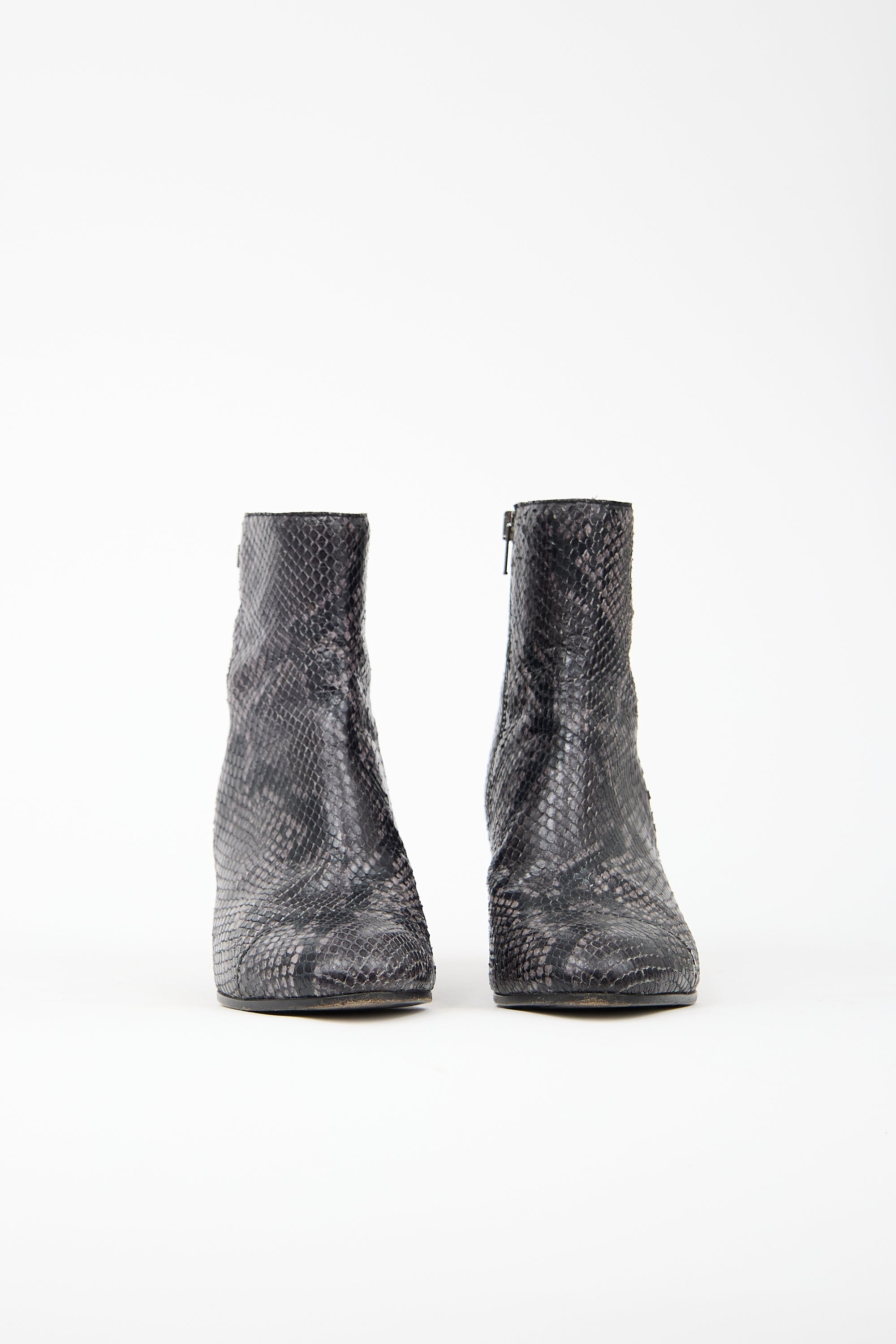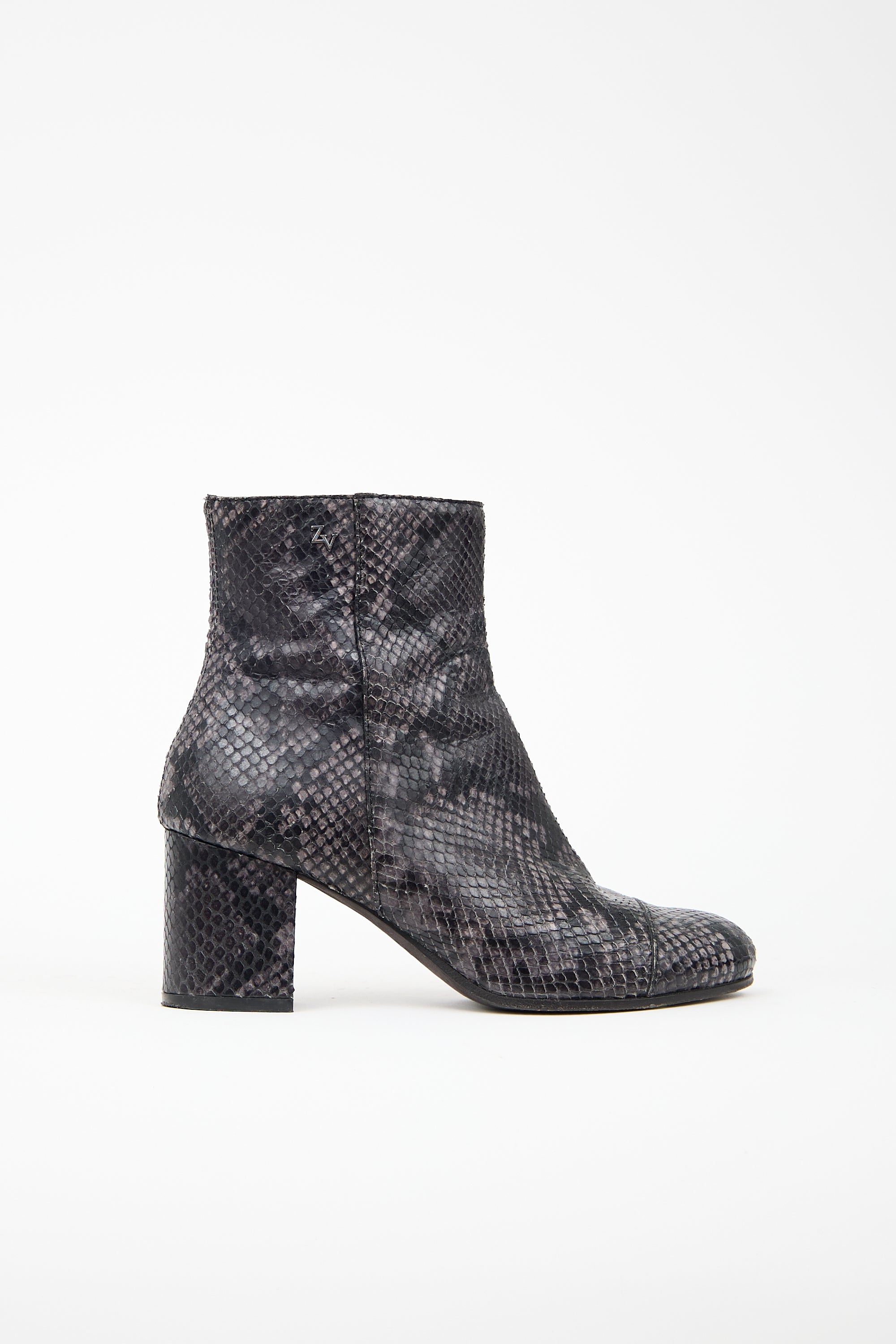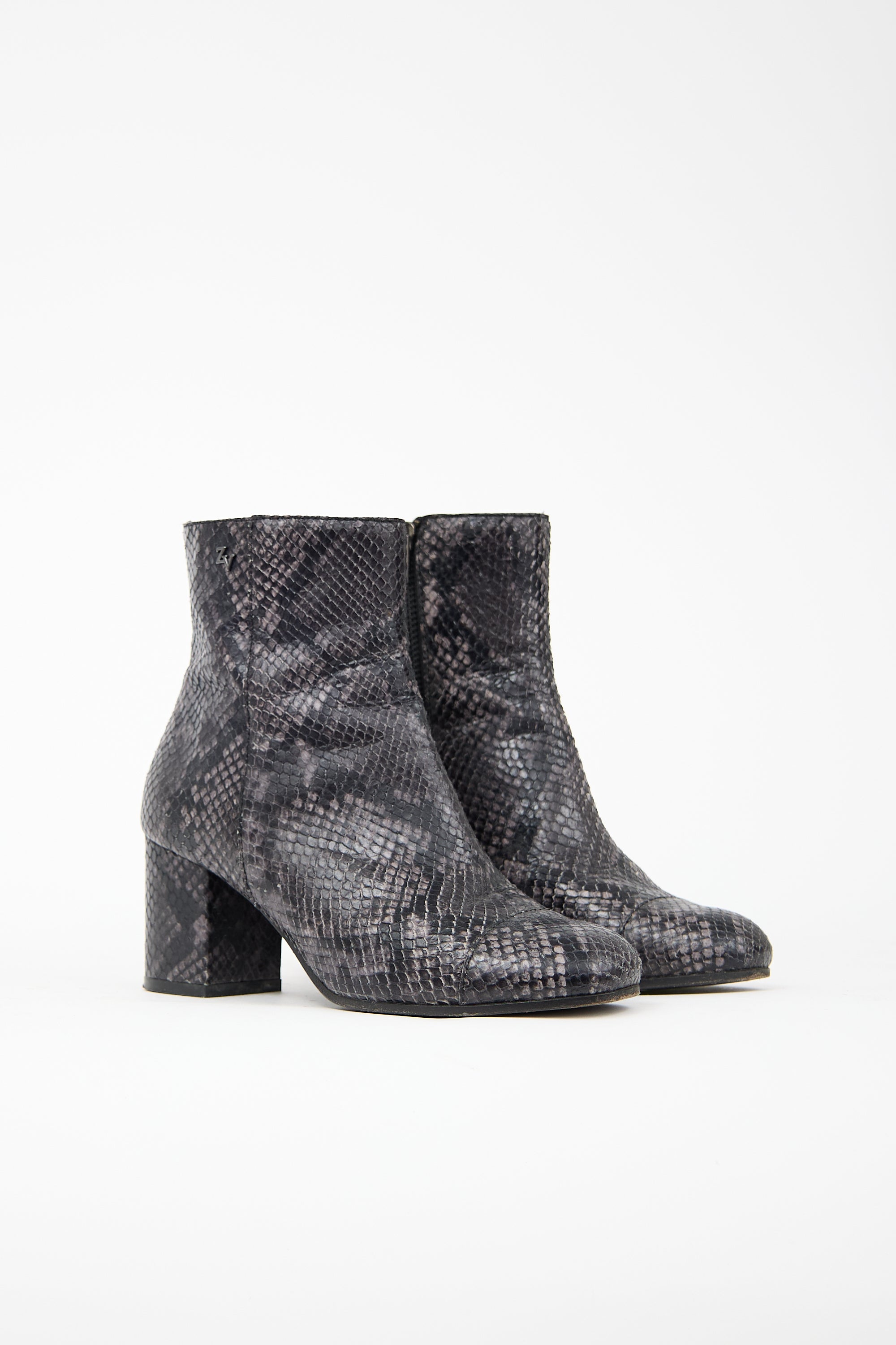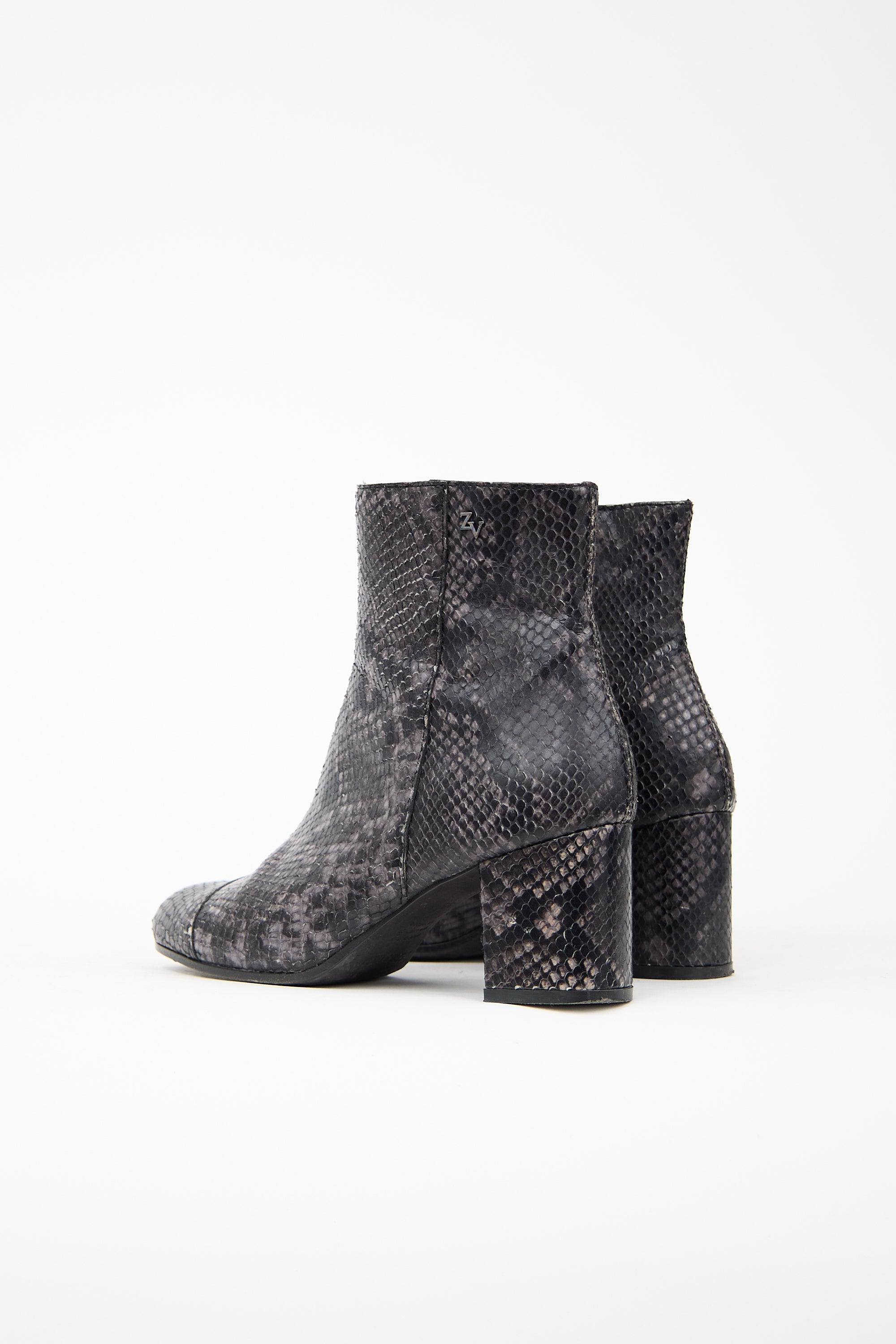 Pre-owned Zadig & Voltaire black and grey embossed leather ankle boot featuring a rounded toe, snakeskin print, inner zip closure, black metal logo hardware at collar, and a covered block heel.