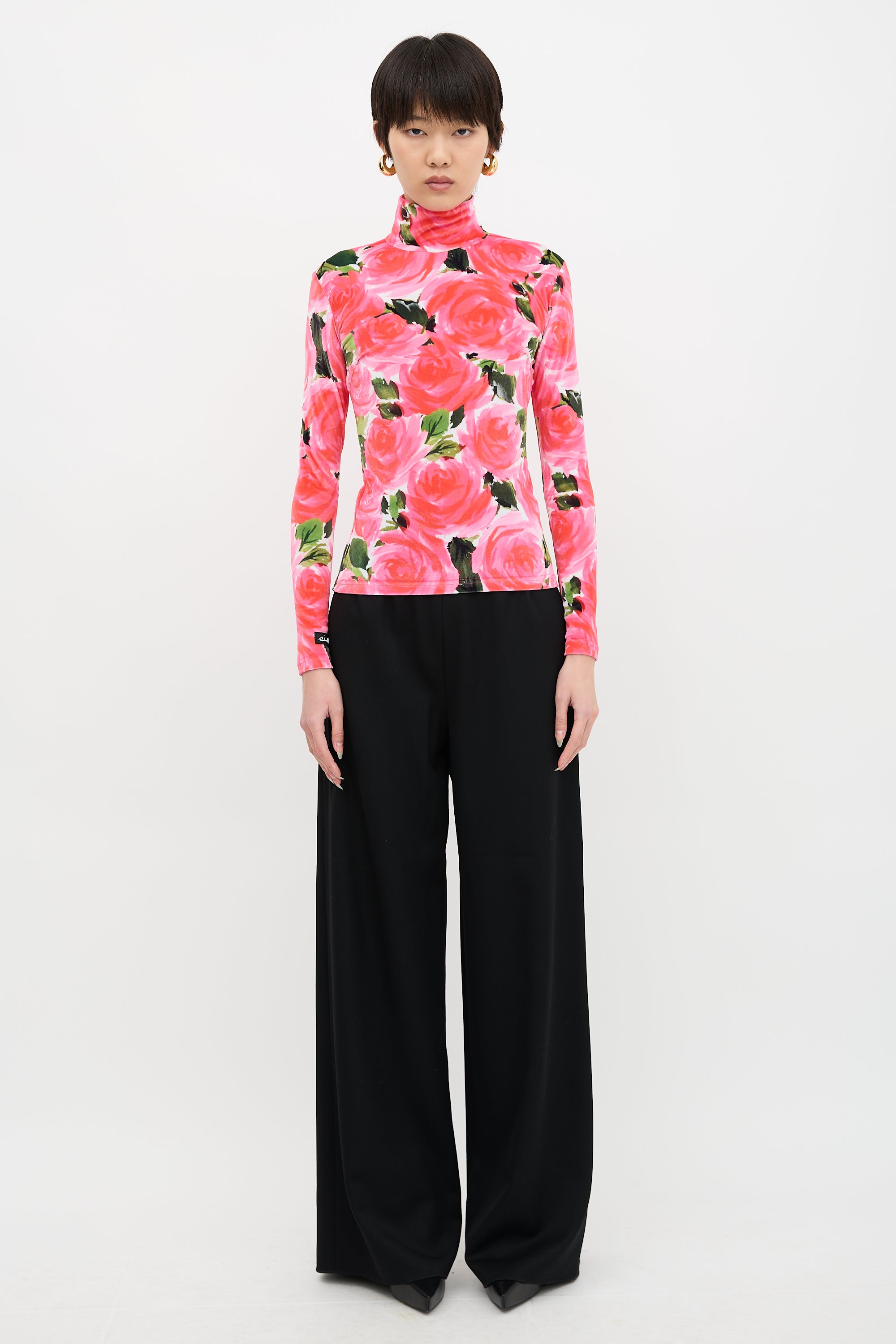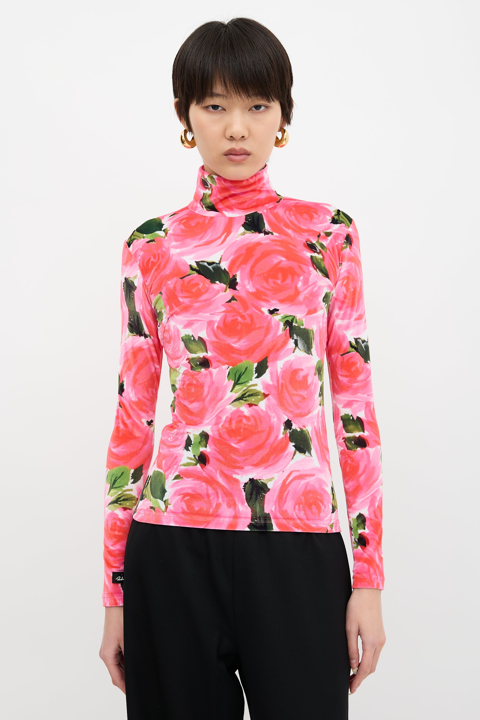 Pre-owned Richard Quinn Fall/Winter 2019 velvet top featuring a multicolour floral print, turtle neckline, concealed back zip, and rubberized logo patch at right cuff.