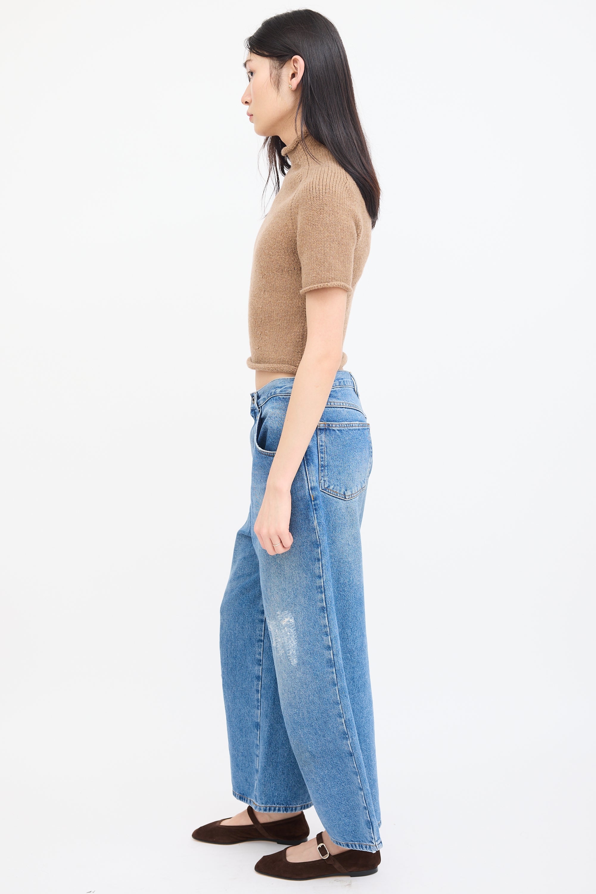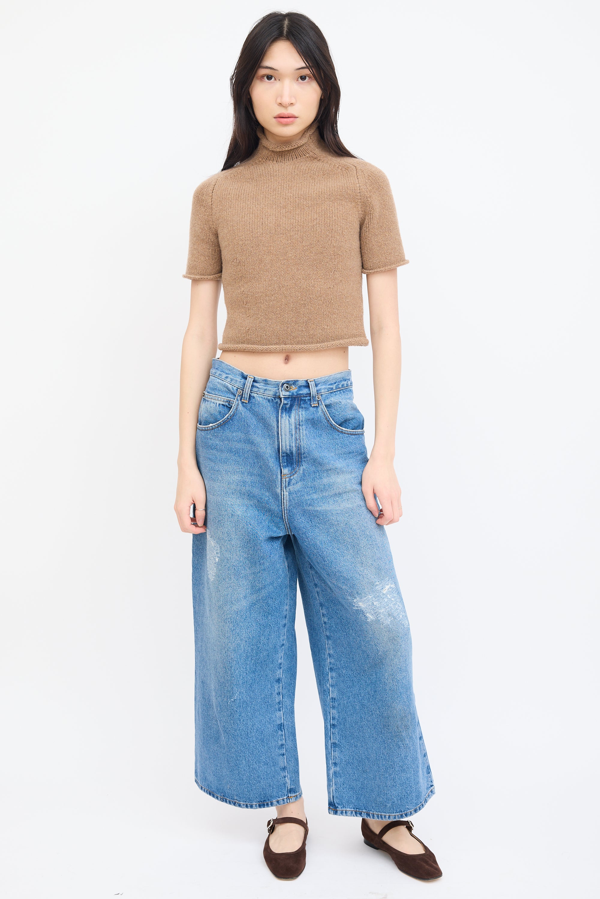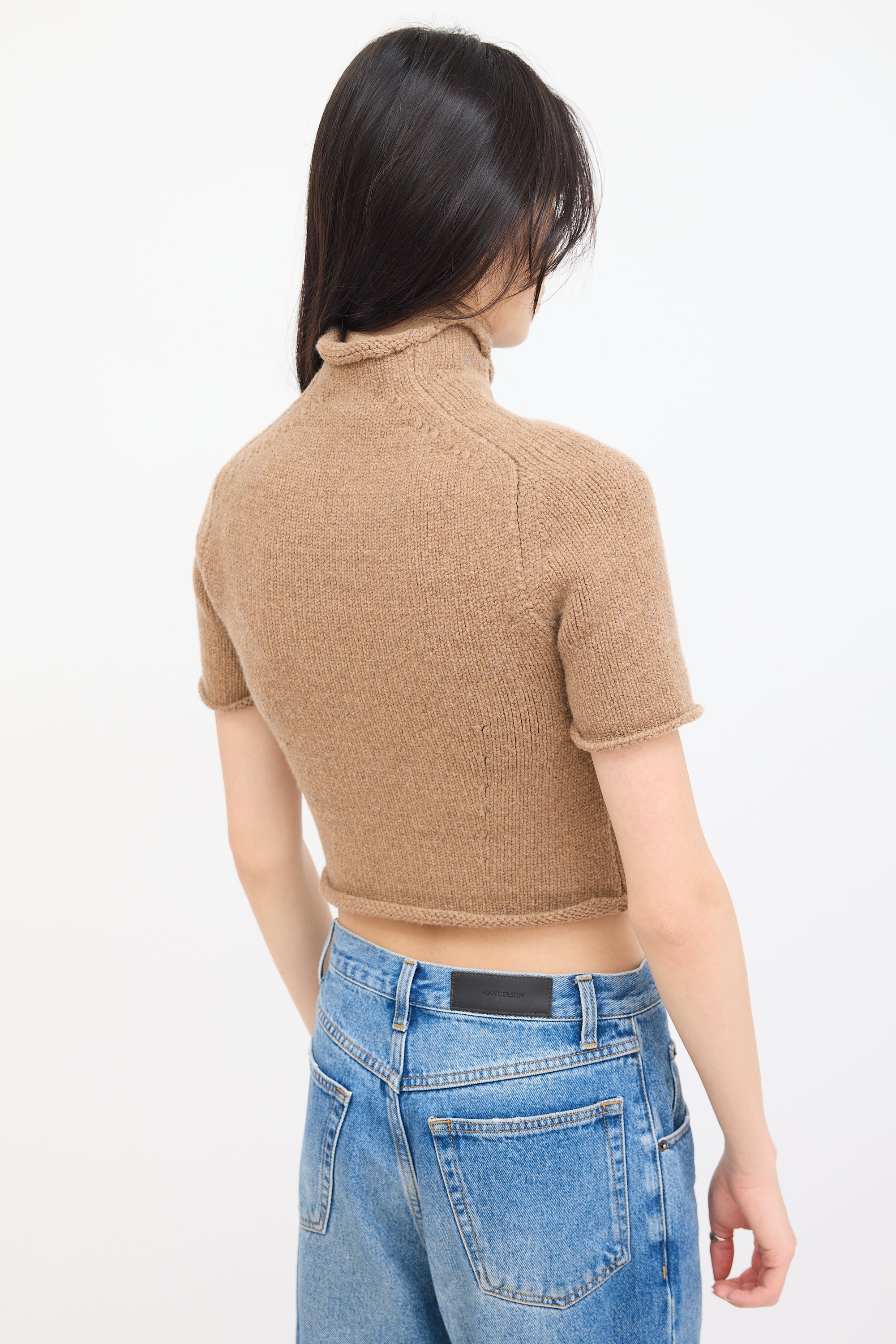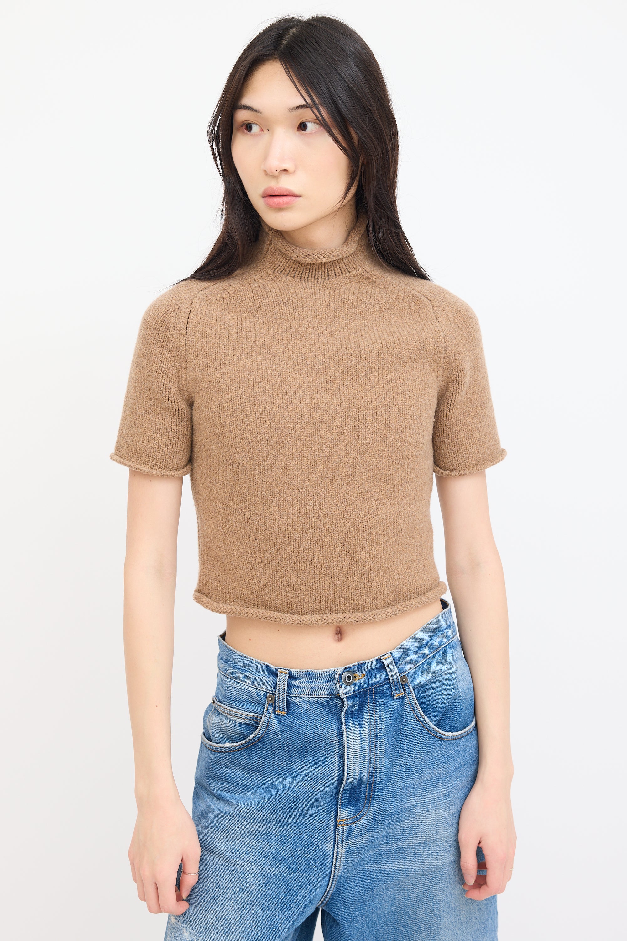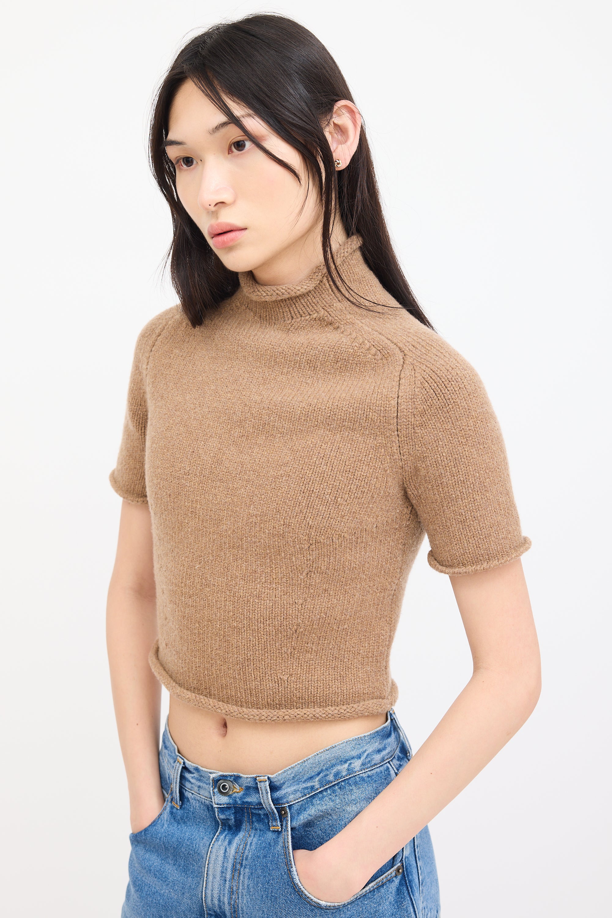 Pre-owned Alexander Wang beige wool knit sweater featuring mock neckline, short sleeves, and rolled hem.