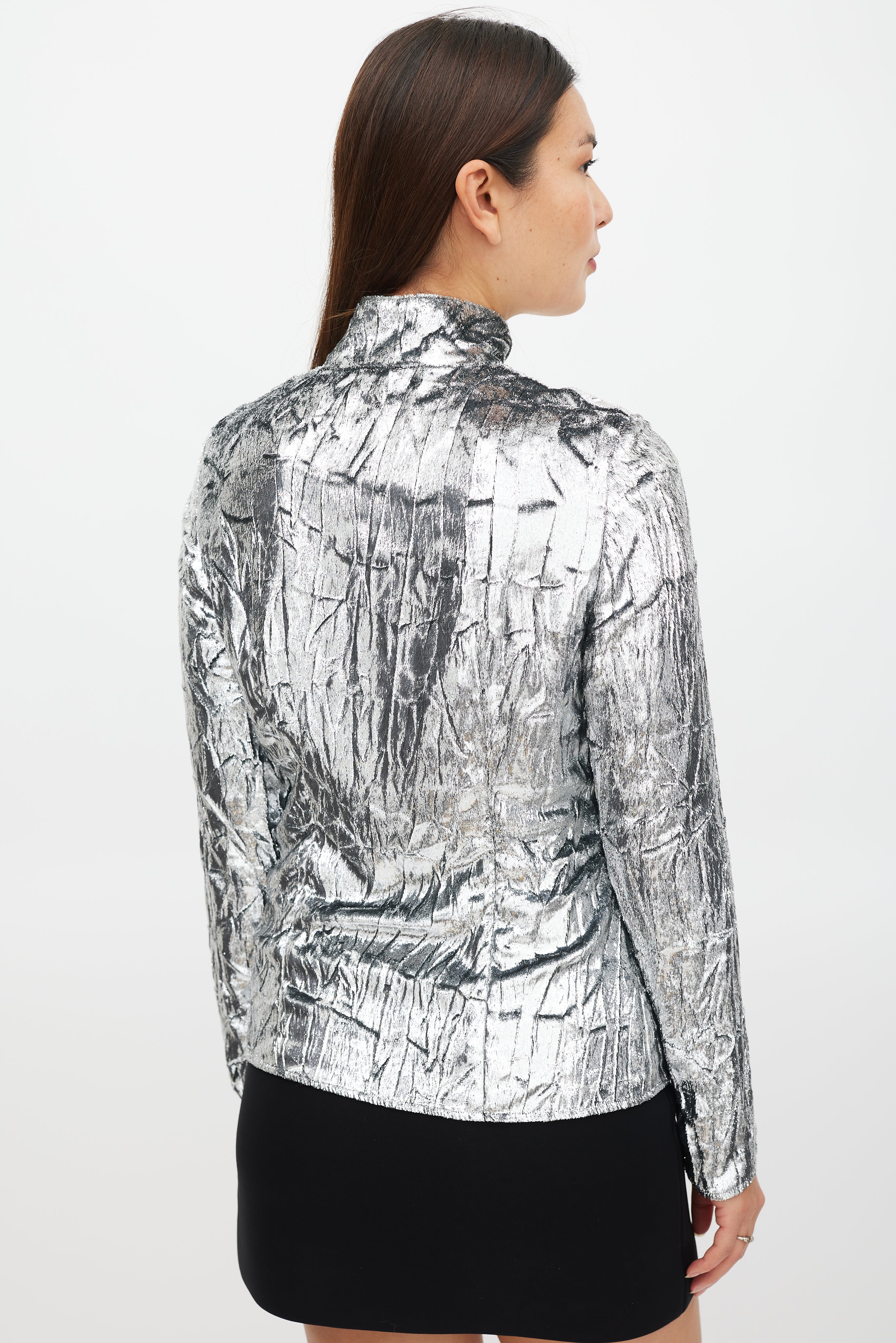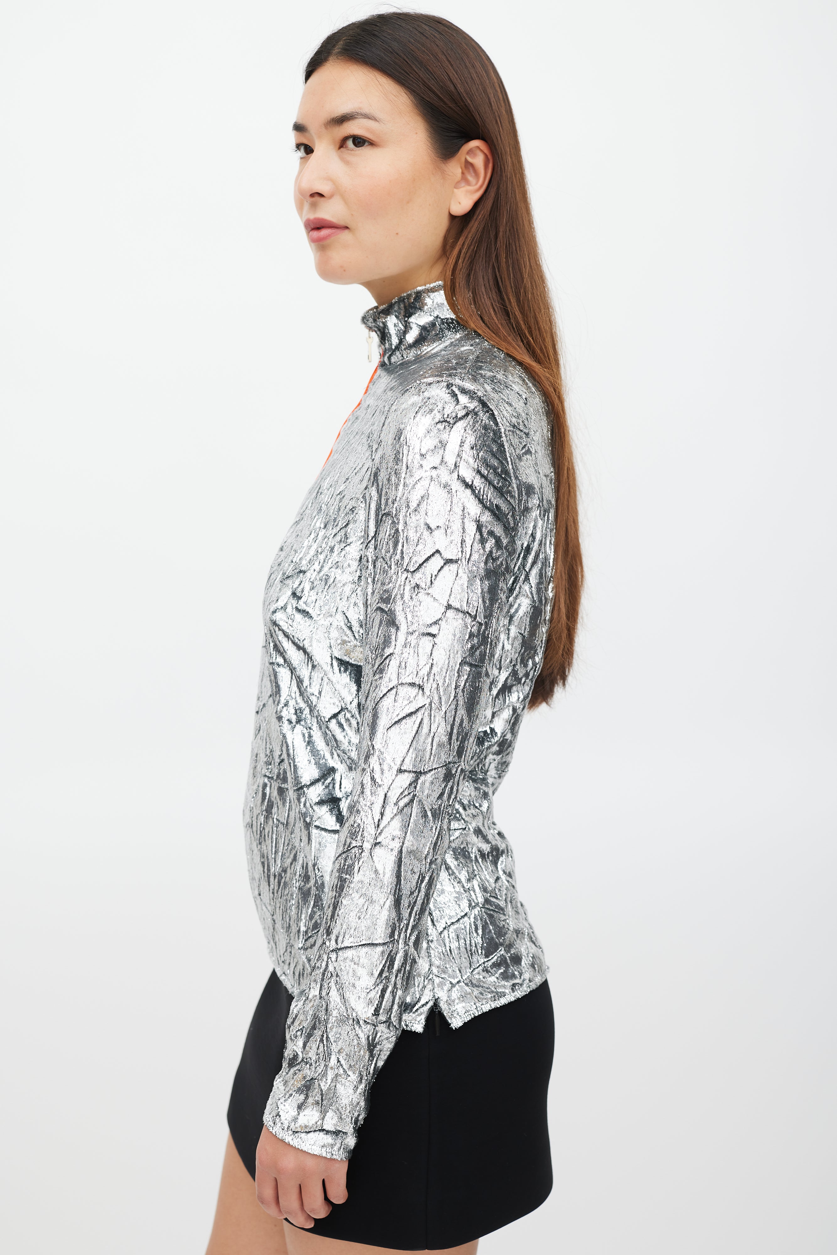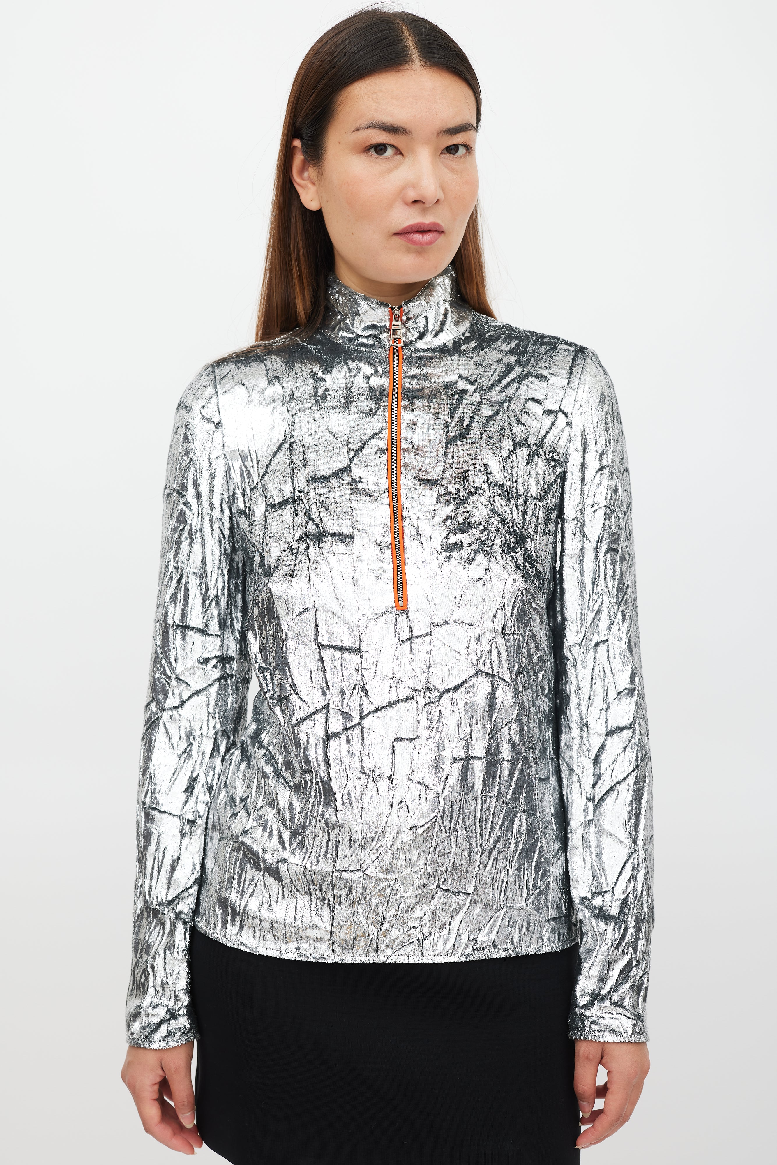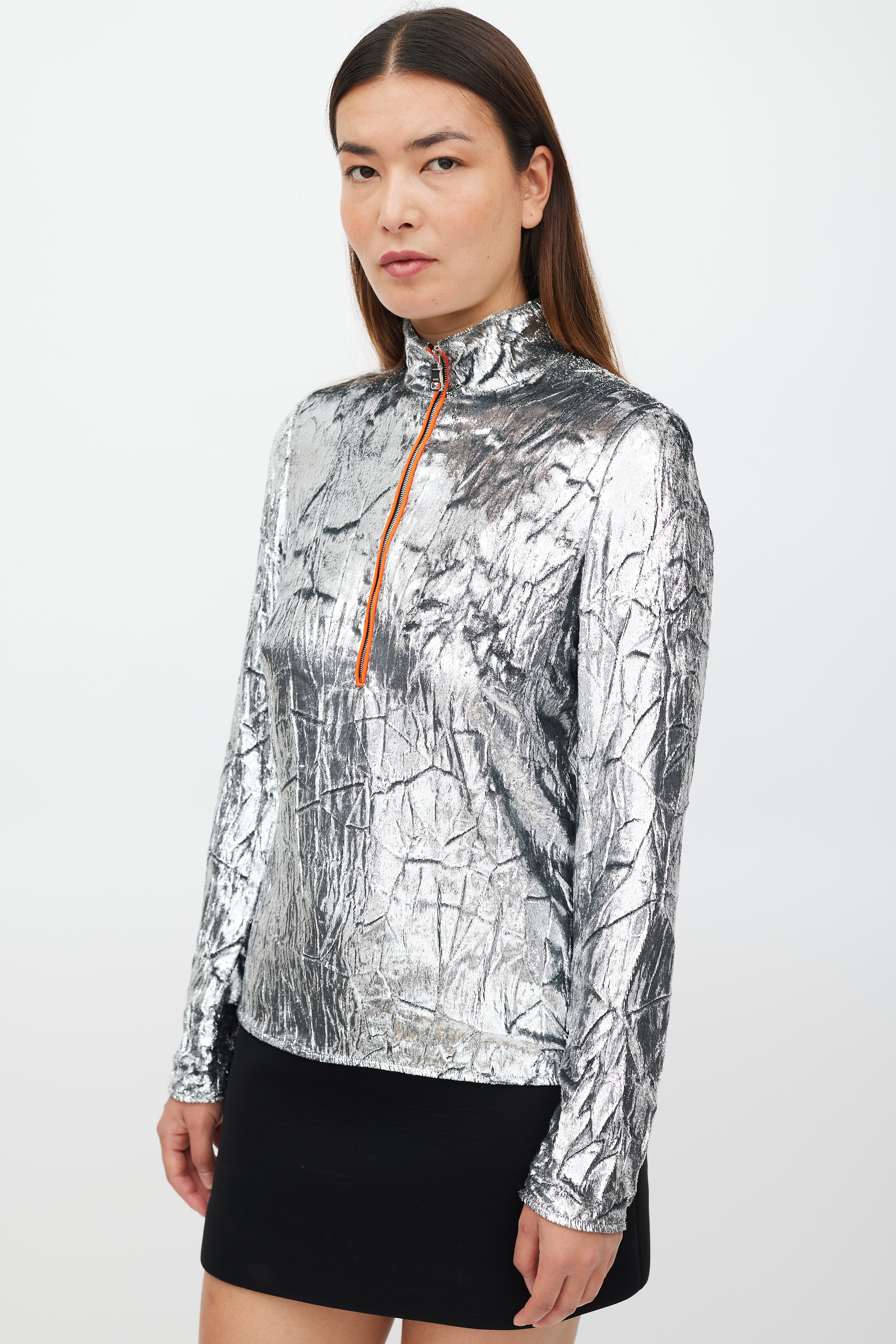 Pre-owned Emilio Pucci silver metallic tinsel top featuring a mock neck collar, long sleeves, zip detail at side, and quarter zip closure with orange trim.