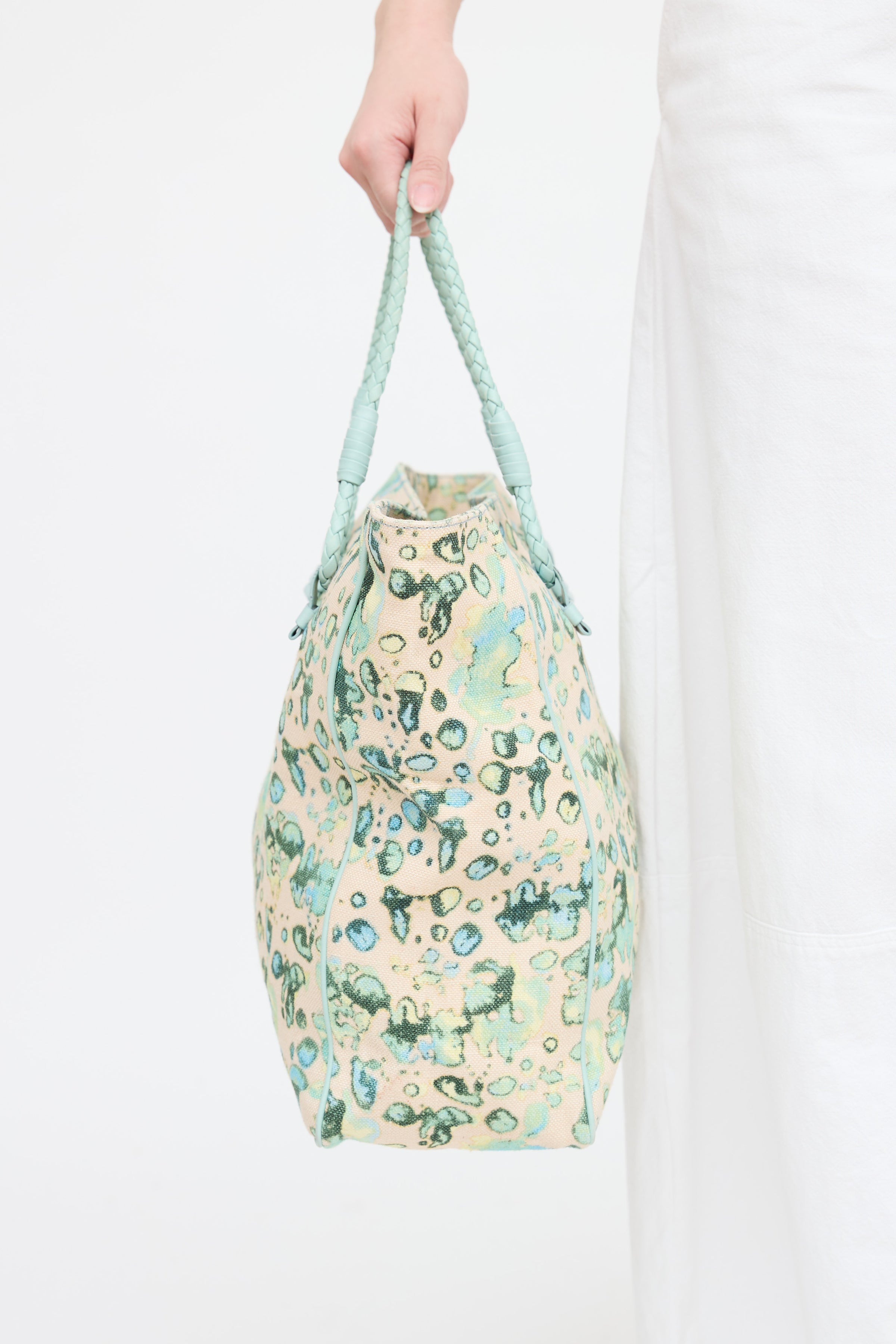 Pre-owned Bottega Veneta multicolour tote bag featuring woven canvas, light green intrecciato handle, leather piping, open top to main compartment, textile lining, one small slip pocket and one zip pocket. Tomas Maier era design.