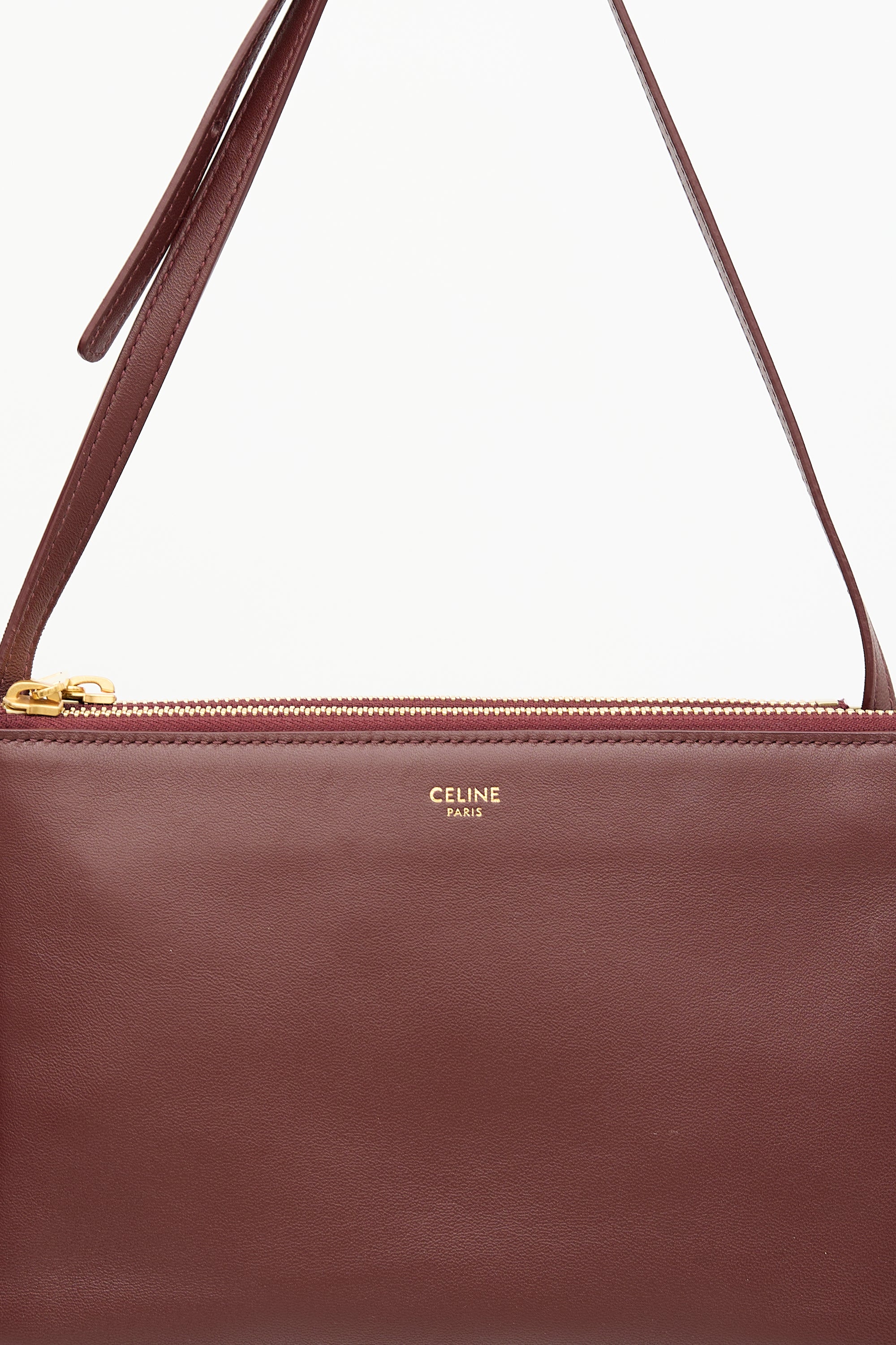 Pre-owned Celine burgundy leather Small Trio crossbody bag featuring stamped front logo, adjustable crossbody strap, and three main compartments with top zip closures,