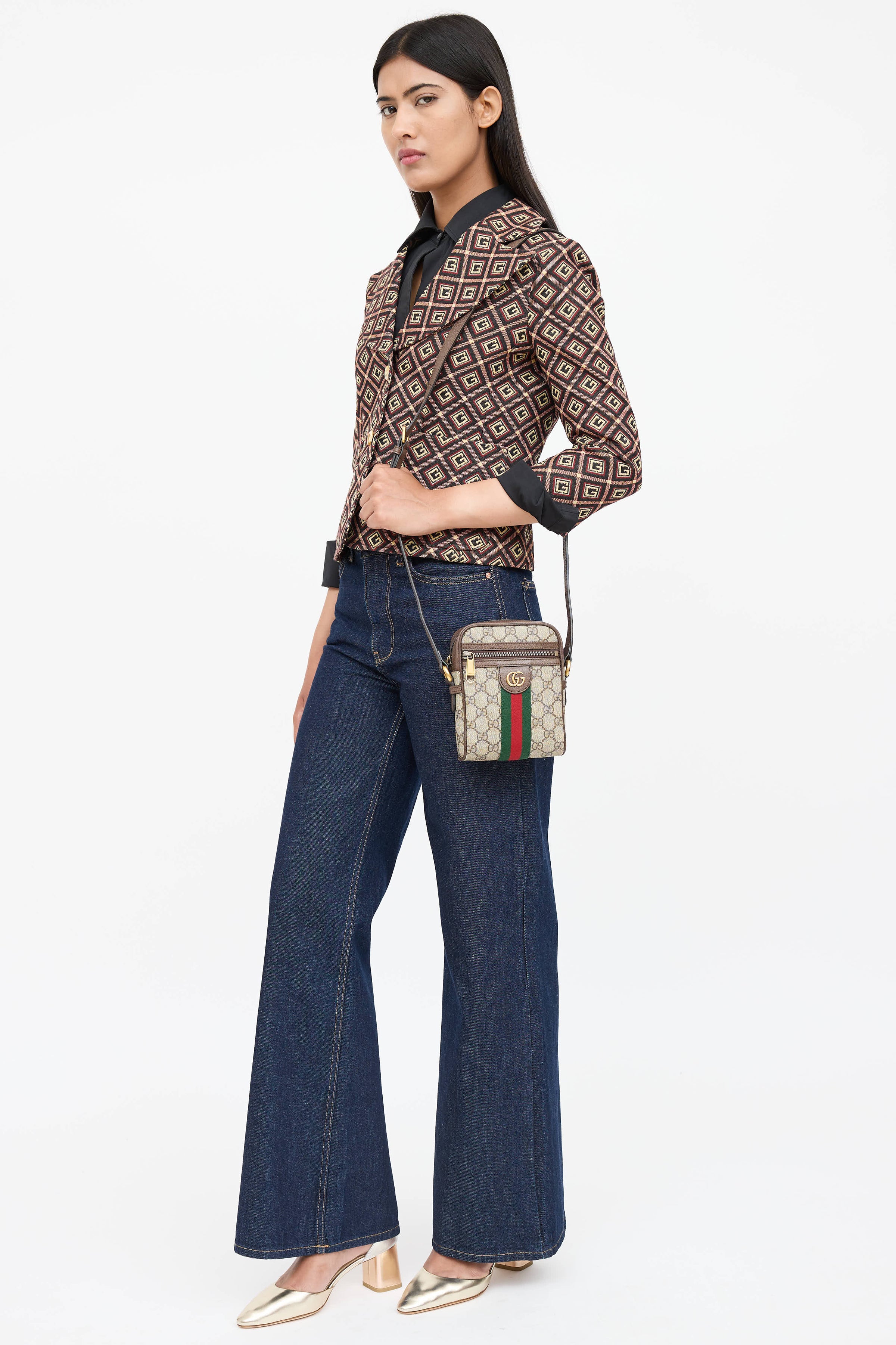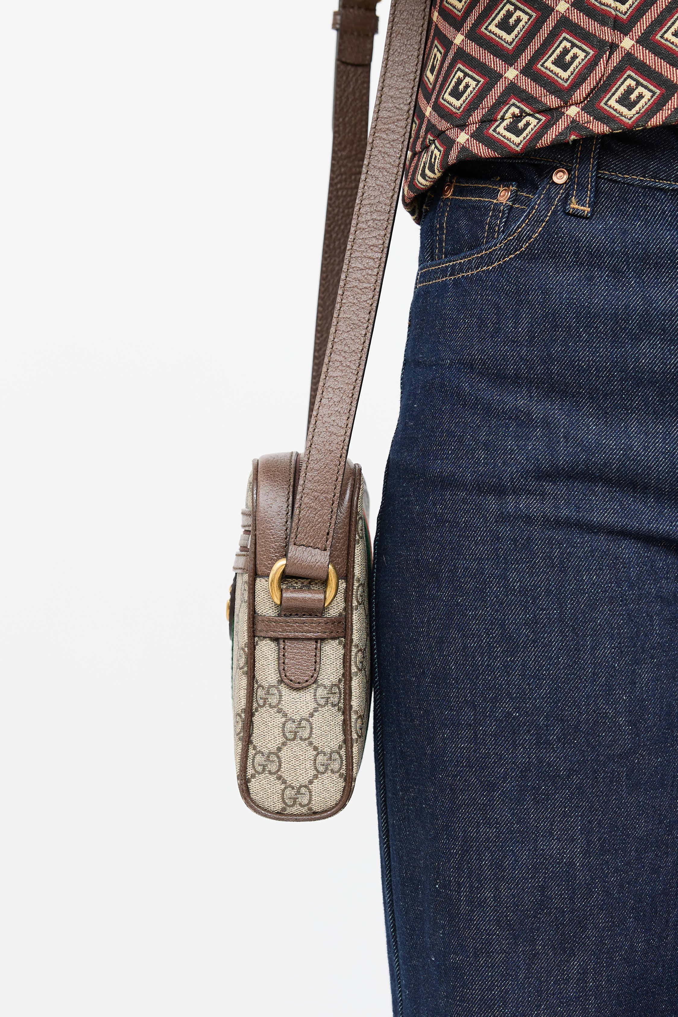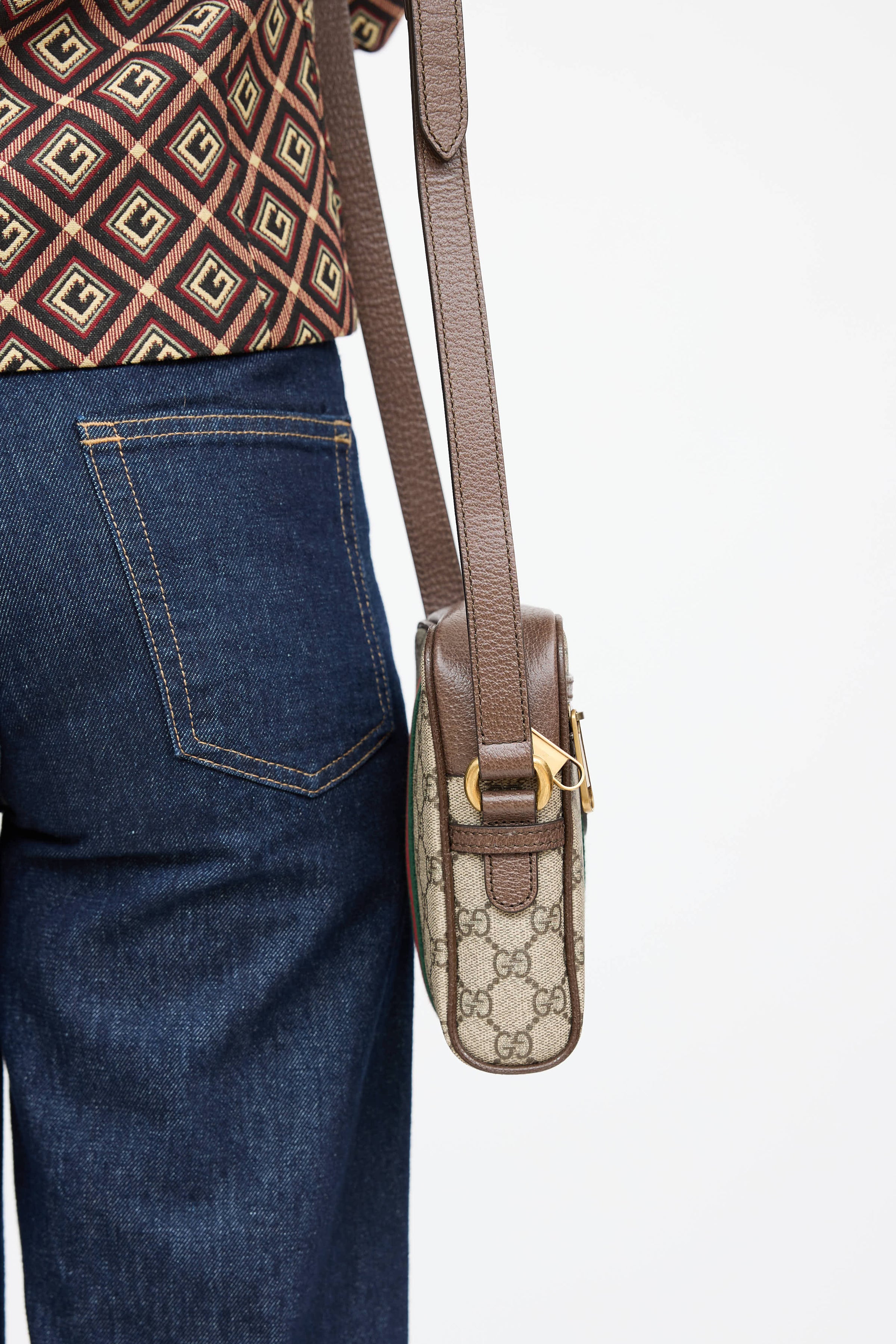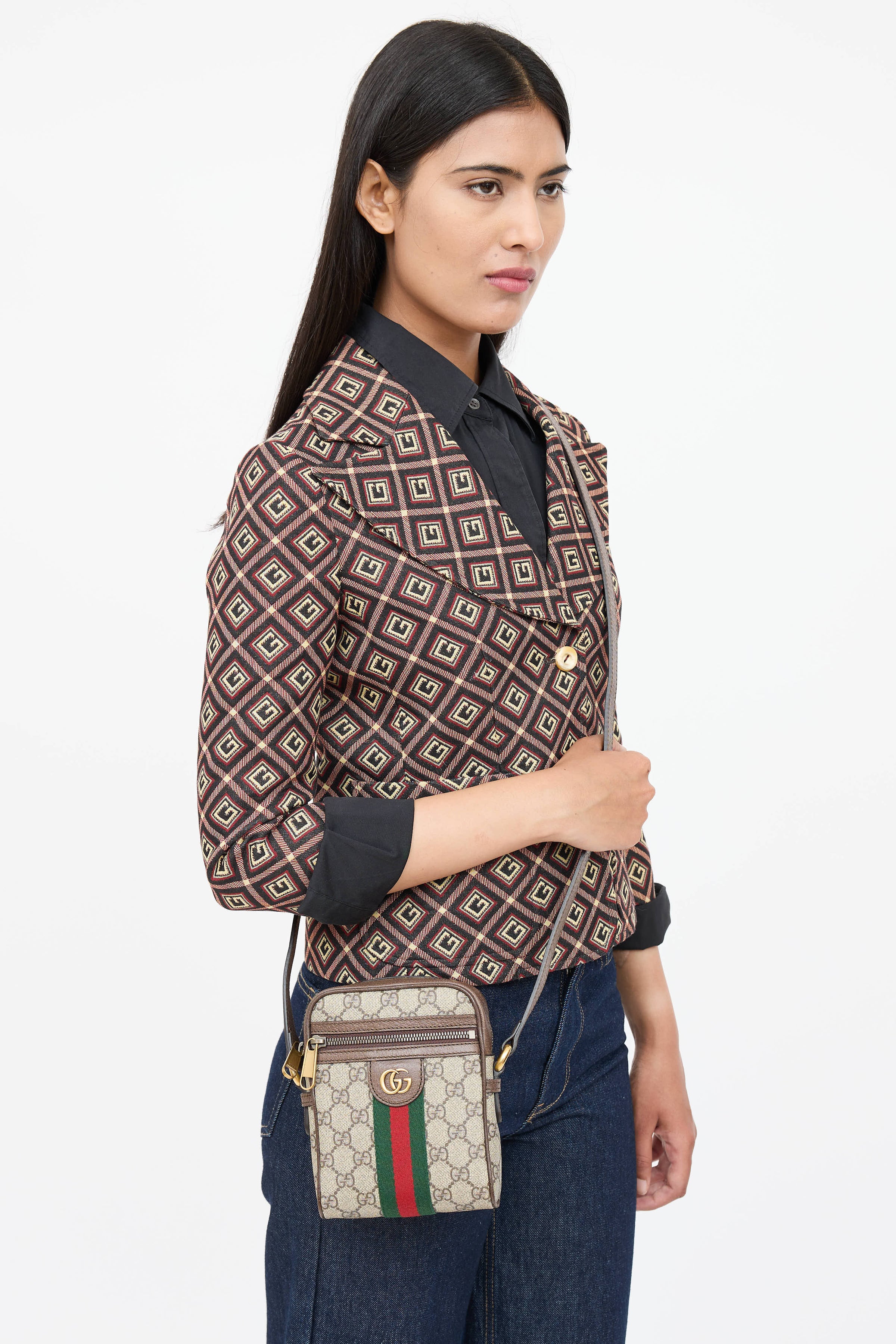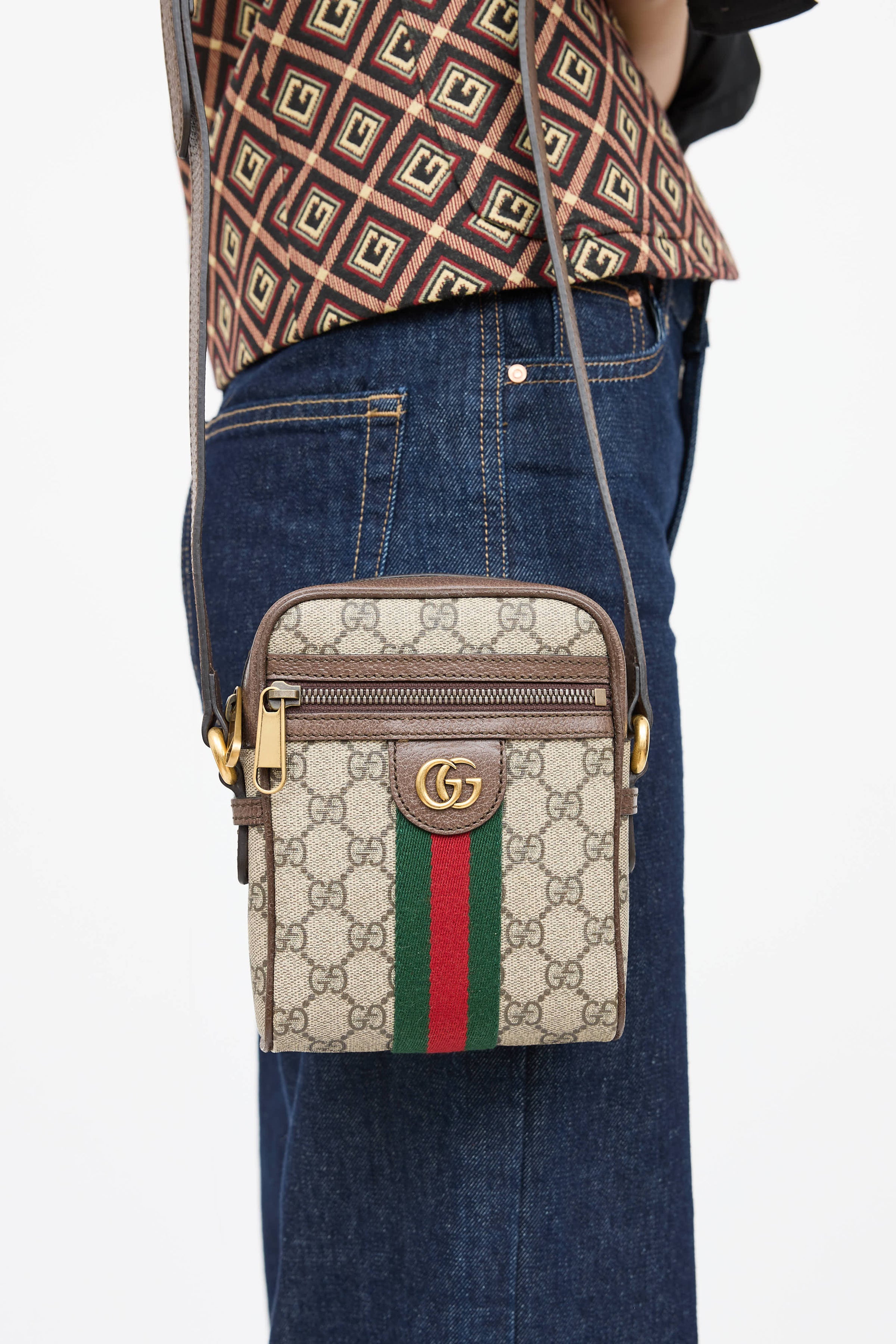 Pre-owned Gucci brown Ophidia messenger mini bag featuring GG Supreme coated canvas, adjustable shoulder strap, old tone GG Marmont embellishment, green and red signature Web stripe trim at front and at back, zip pocket at front, top zip closure, and one main compartment.