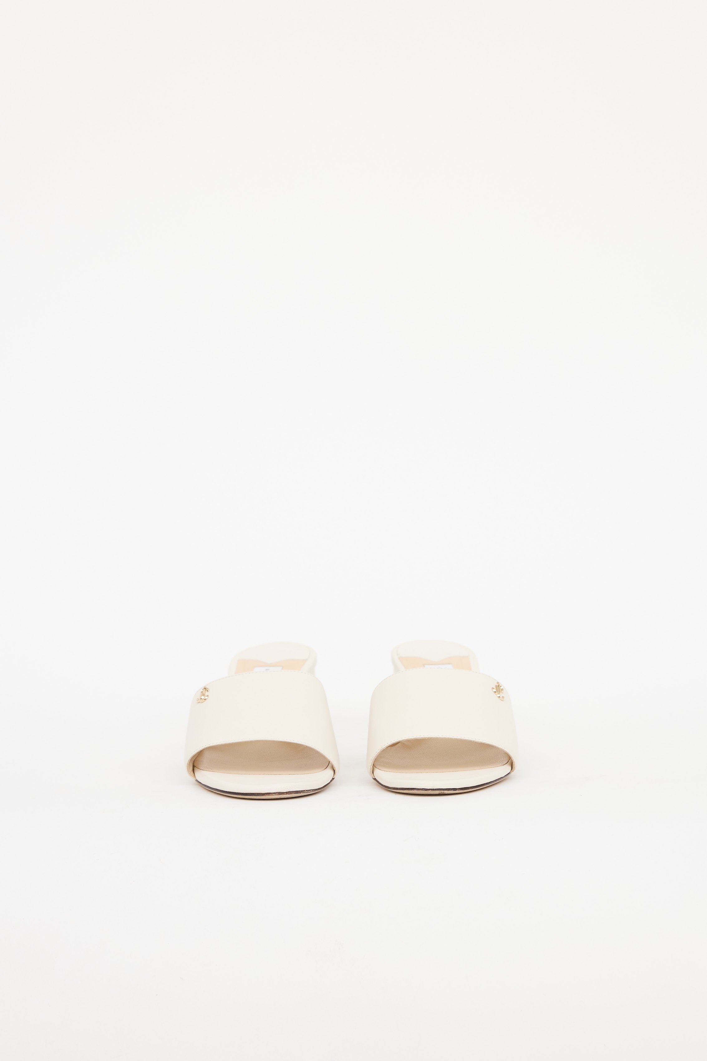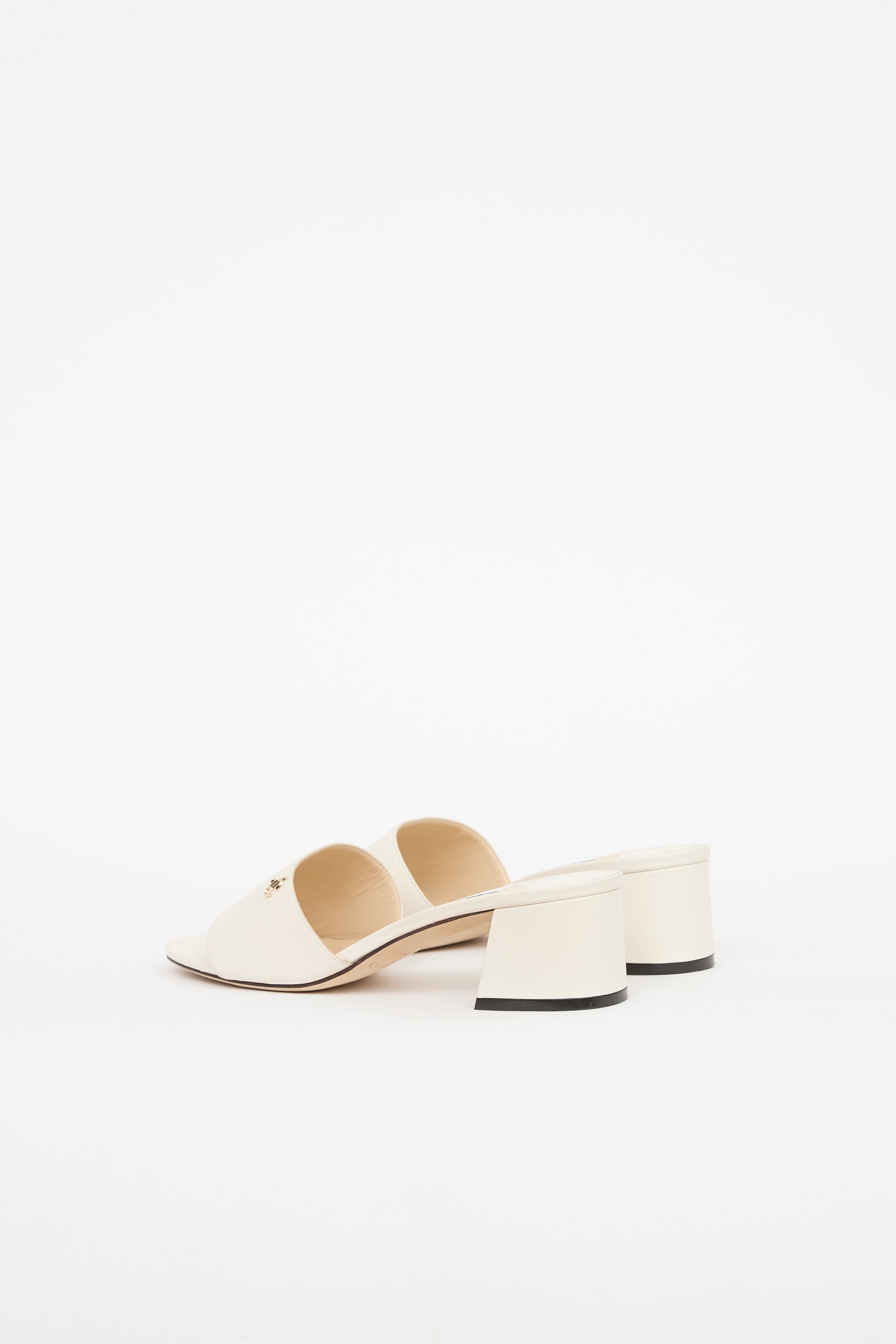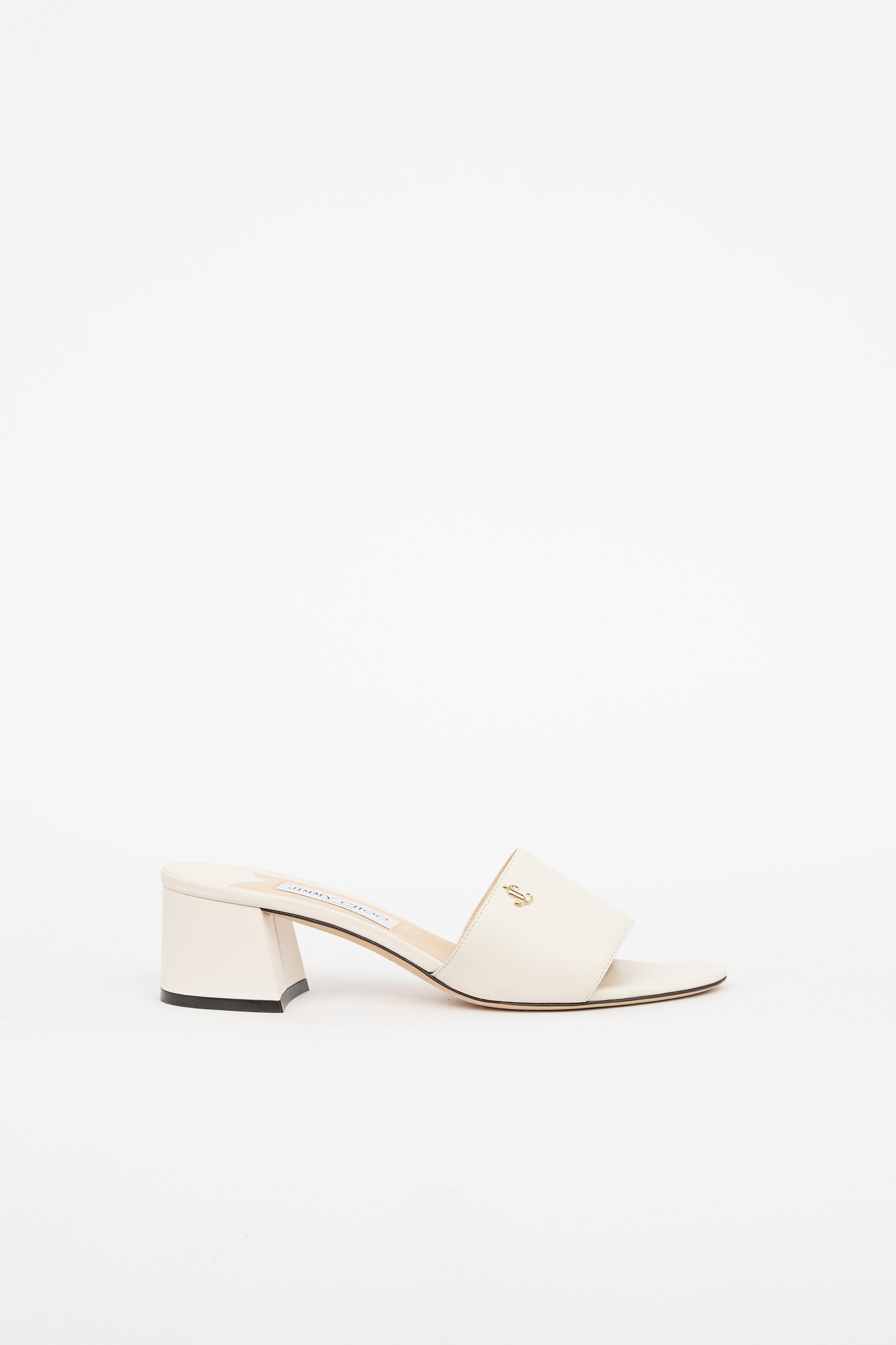 Pre-owned Jimmy Choo white leather Minea mule featuring open almond toe, gold tone logo at vamp, and covered stack heel.