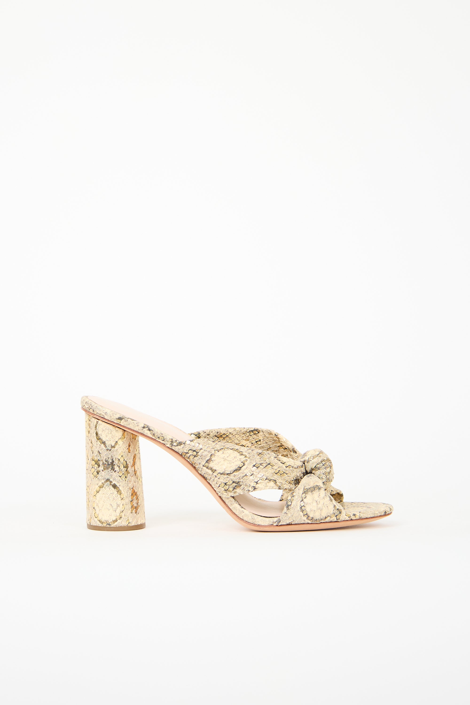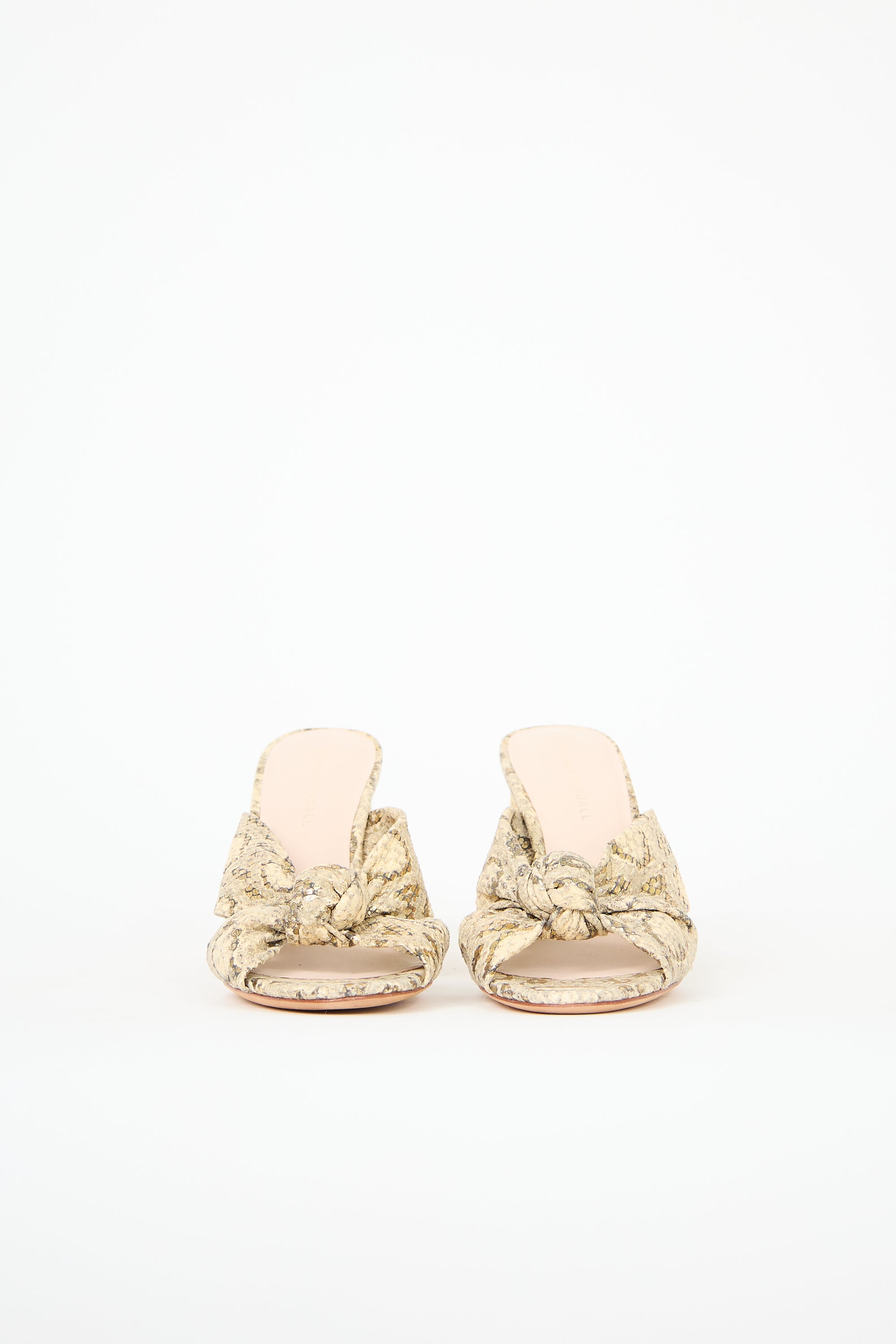 Pre-owned Loeffler Randall cream embossed leather Coco heels featuring open almond toe, snakeskin print with gold metallic leather flecks, knotted upper, and covered cylinder heel.