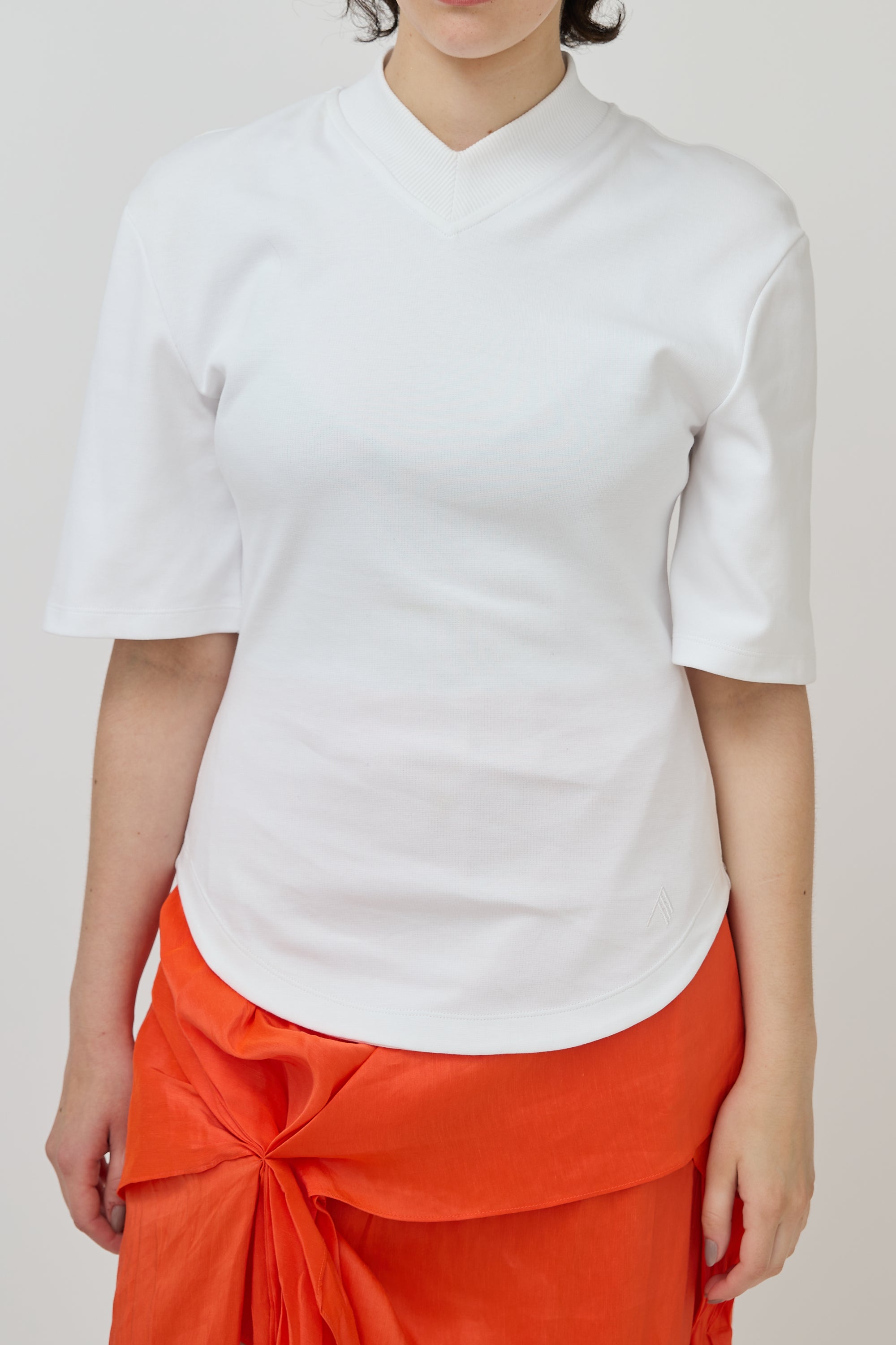 Pre-owned The Attico white T-shirt featuring a ribbed V-neckline, embroidered tonal logo at hem, and half sleeves.