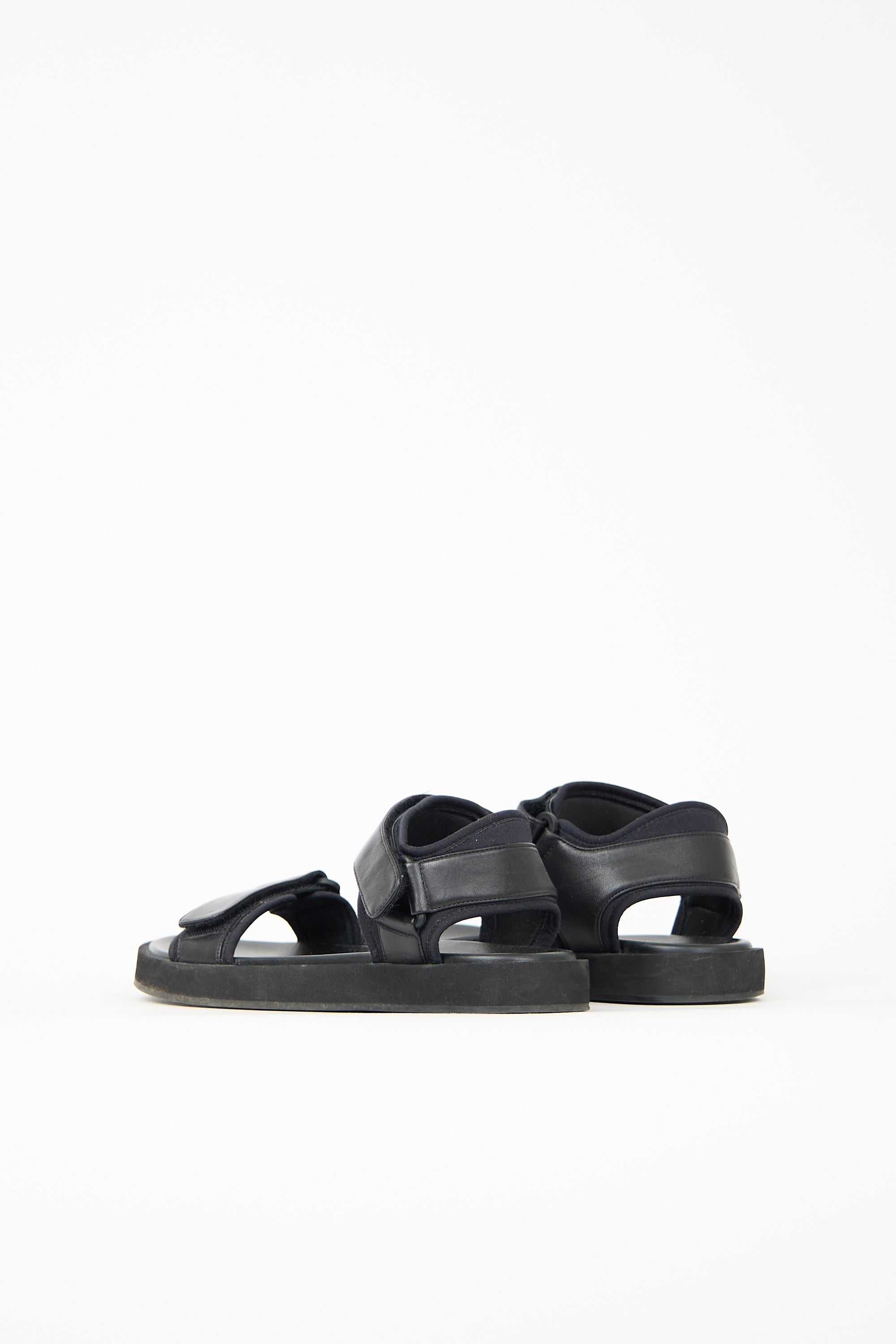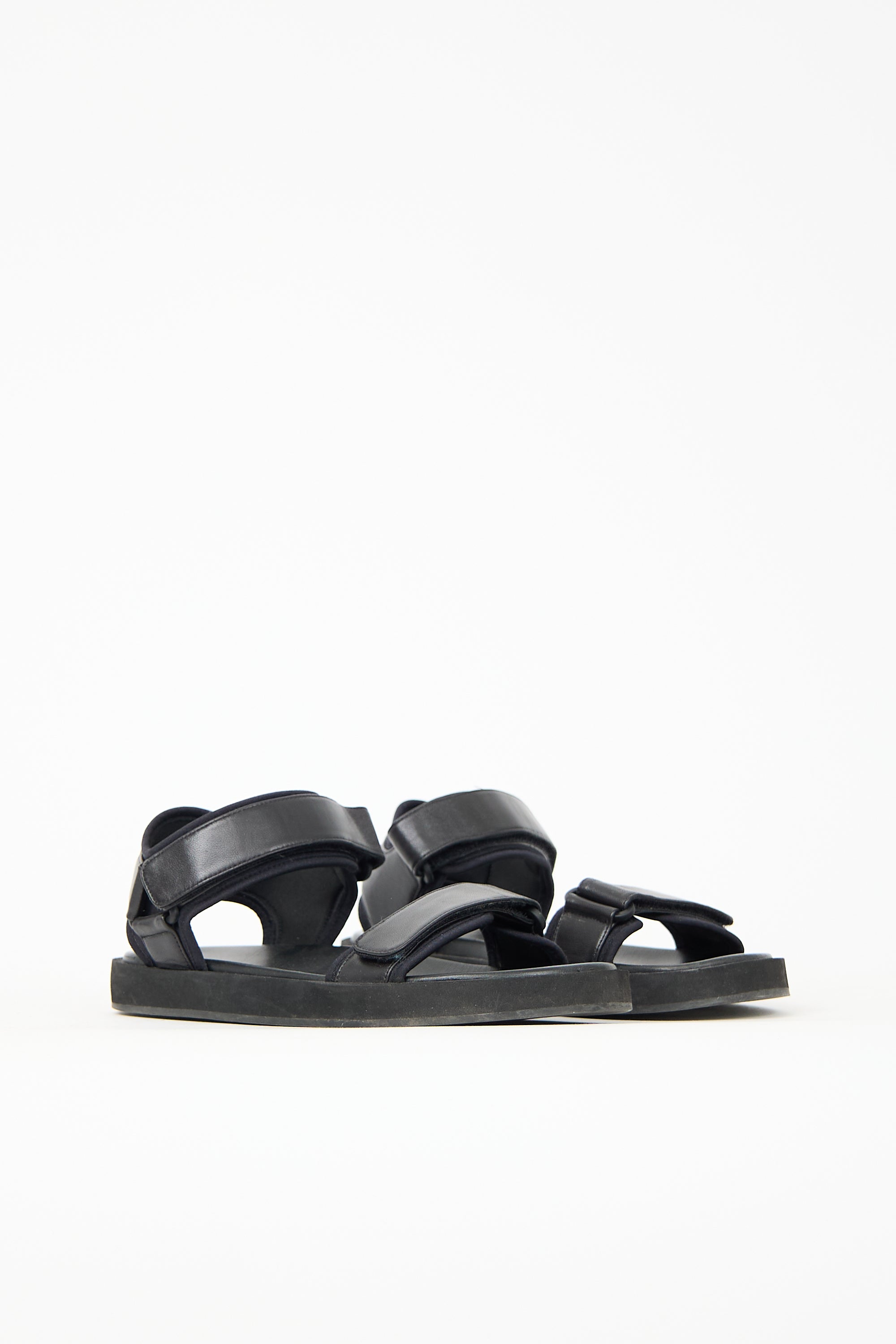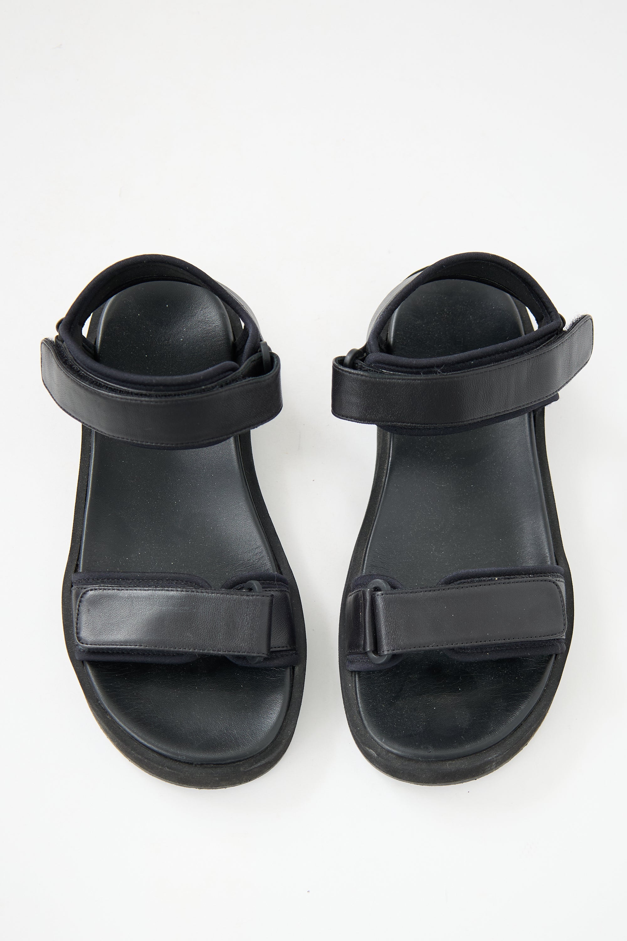 Pre-owned The Row black leather Hook-and-Loop sandals featuring rounded toe and adjustable velcro straps at vamp and ankle.