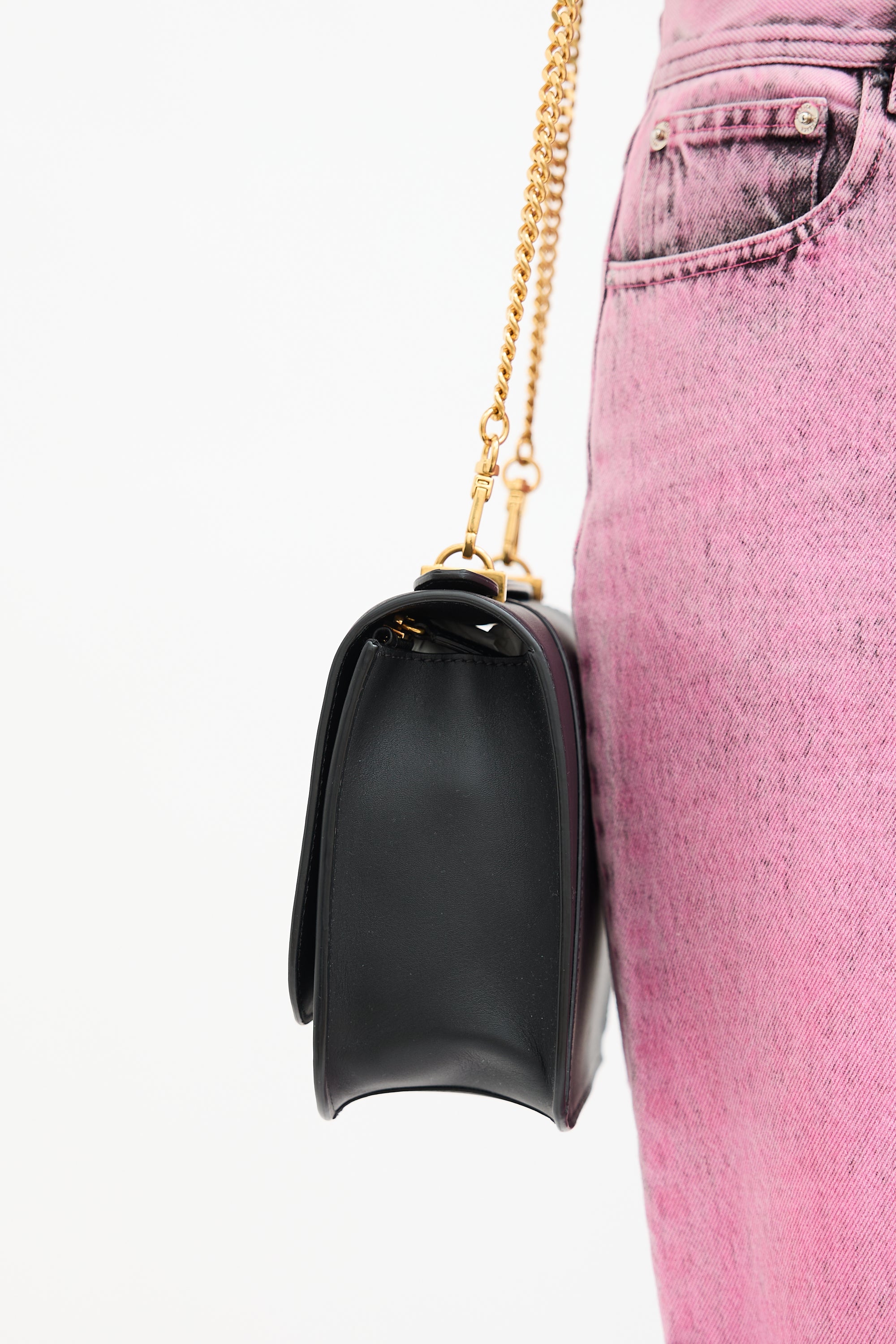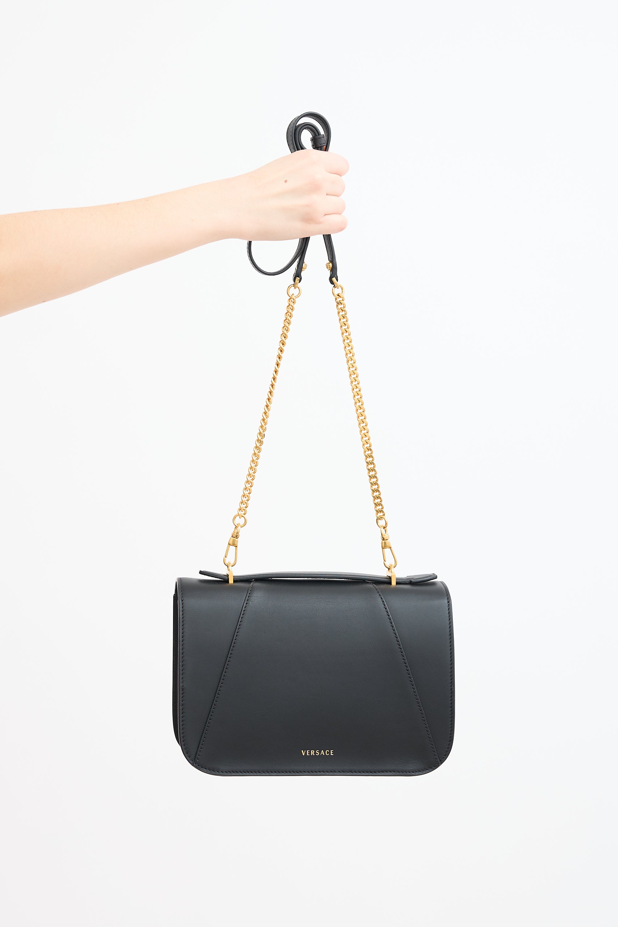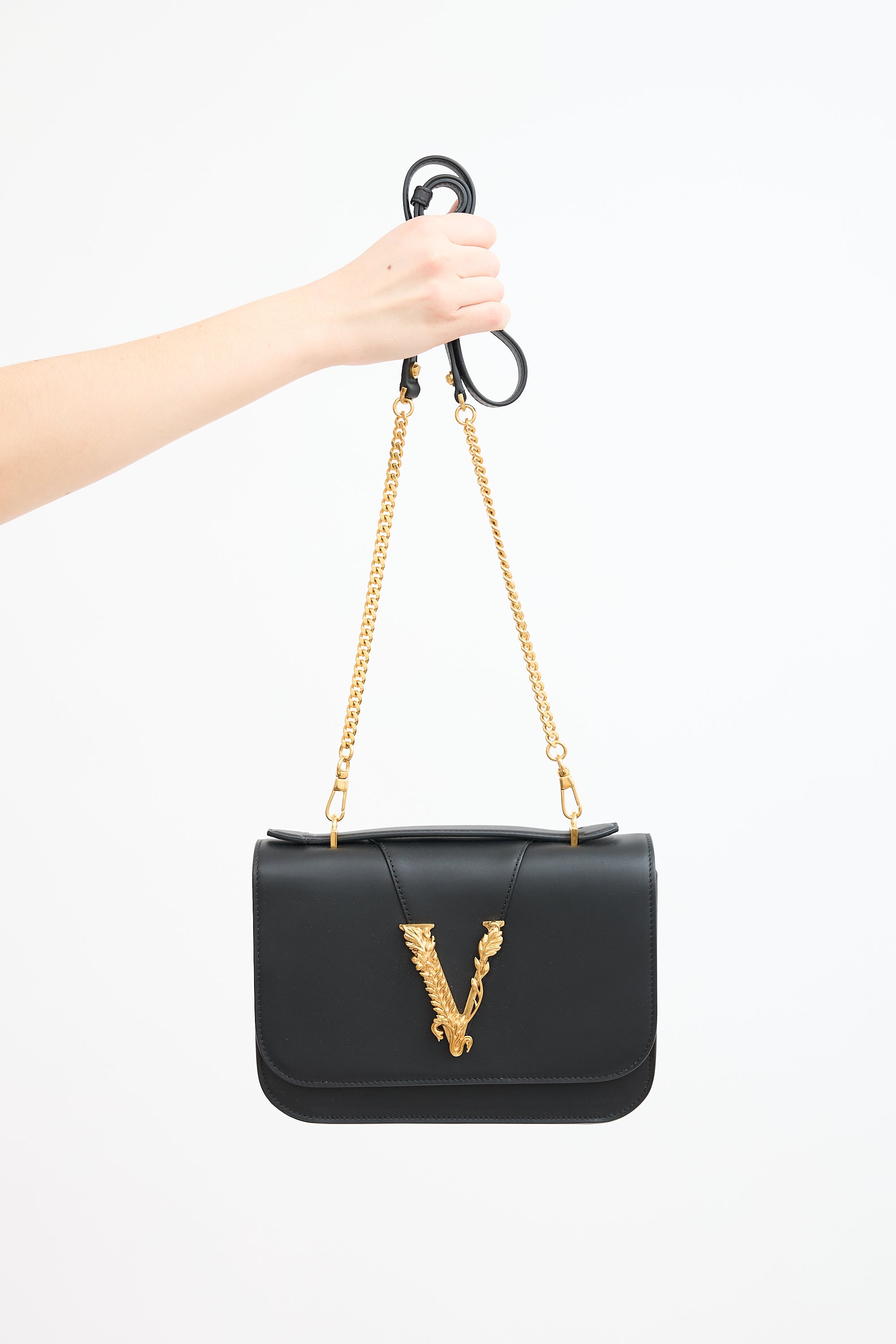 Pre-owned Versace black leather Virtus logo flap bag featuring gold tone hardware, front flap with magnetic snap closure, signature Virtus V logo at front, attached top handle, detachable and adjustable leather chain crossbody strap, stamped logo at back, and one main compartment with one flap pocket and one zip pocket. Comes with original box.