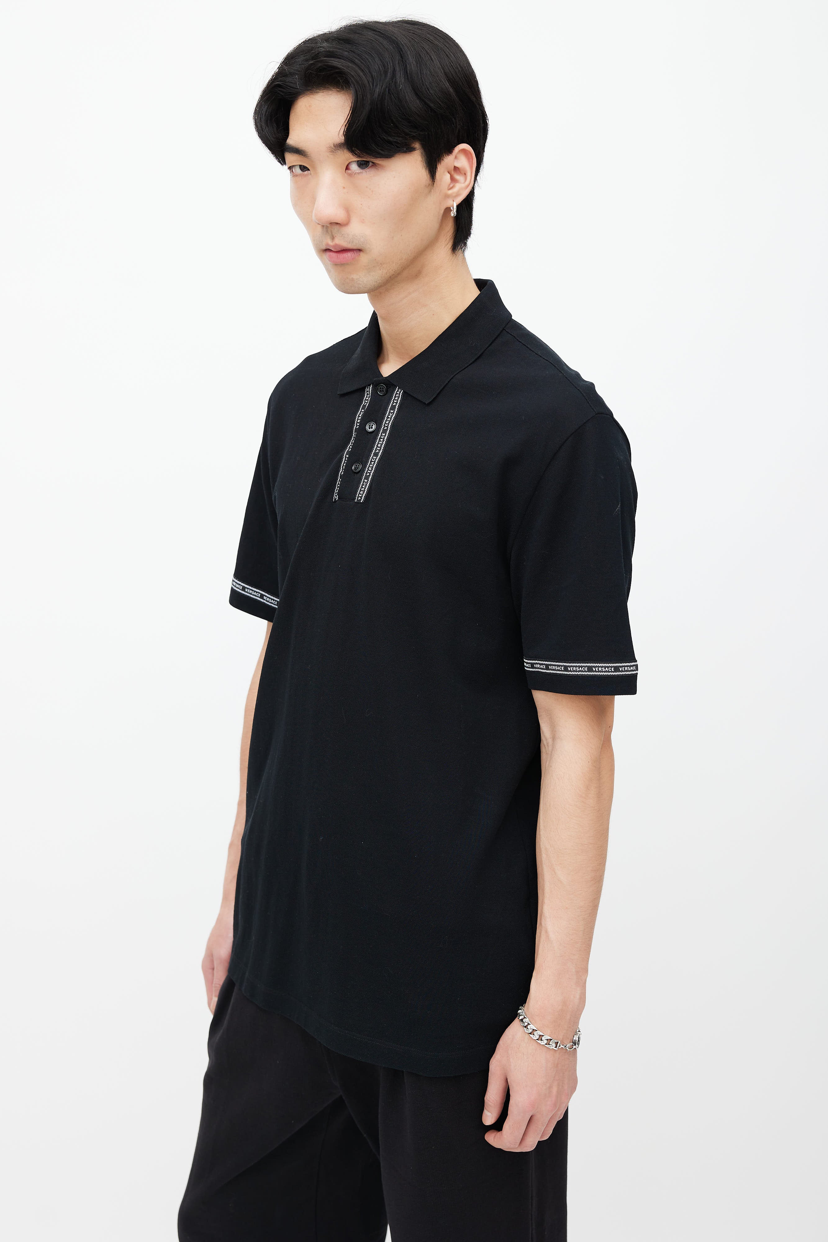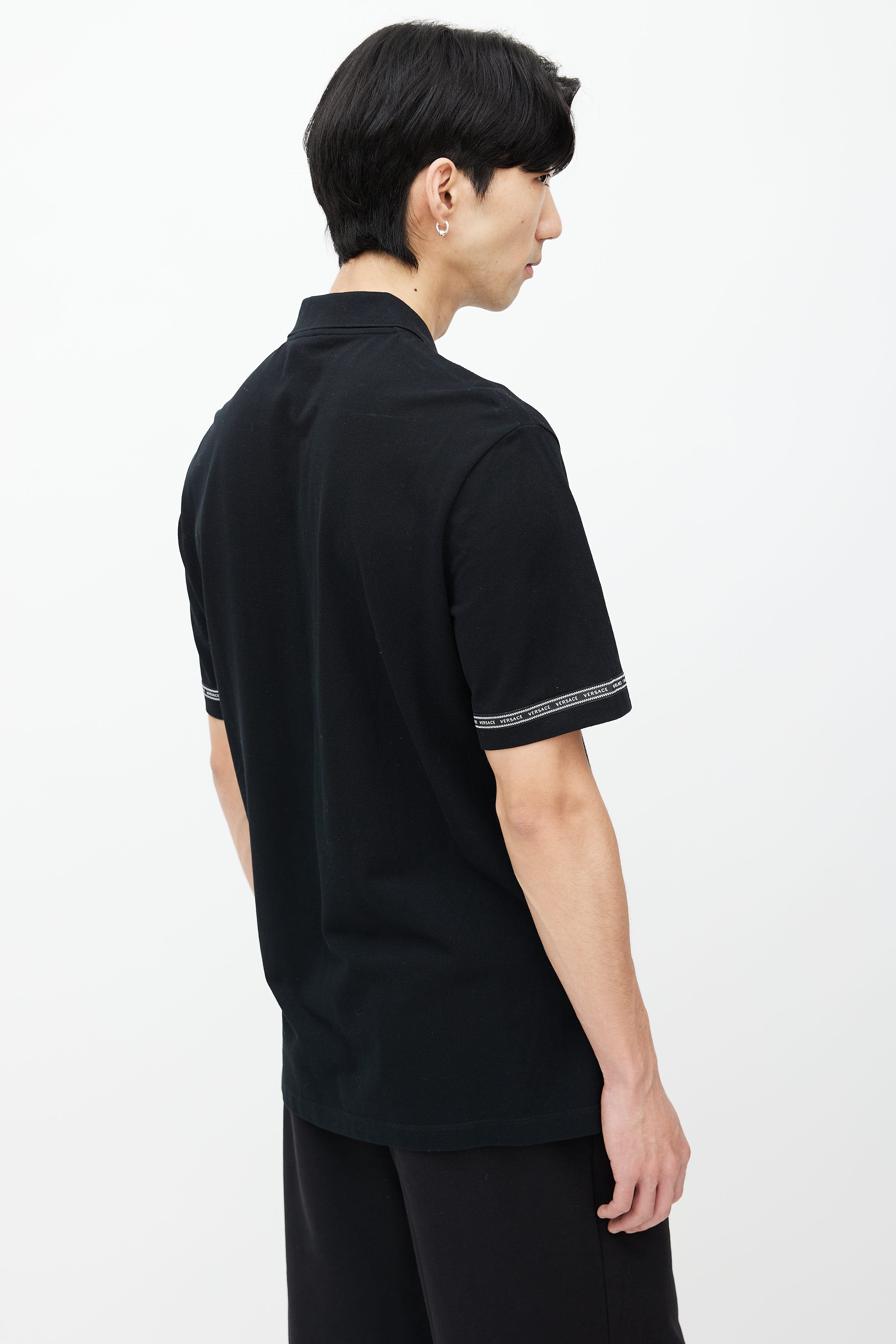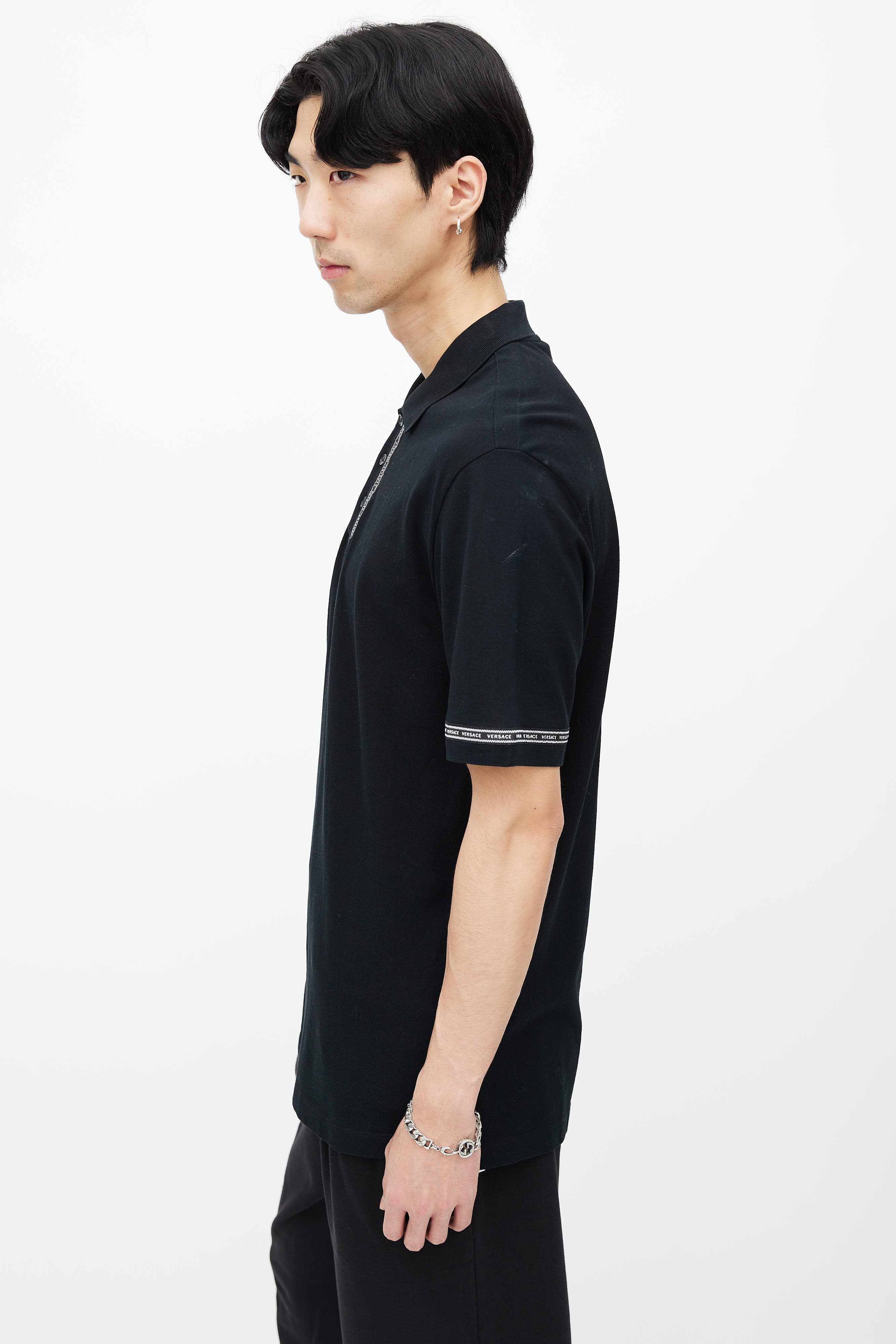 Pre-owned Versace polo in black featuring half button closure at front, classic collar, short sleeves, and white logo trim at closure and cuffs.