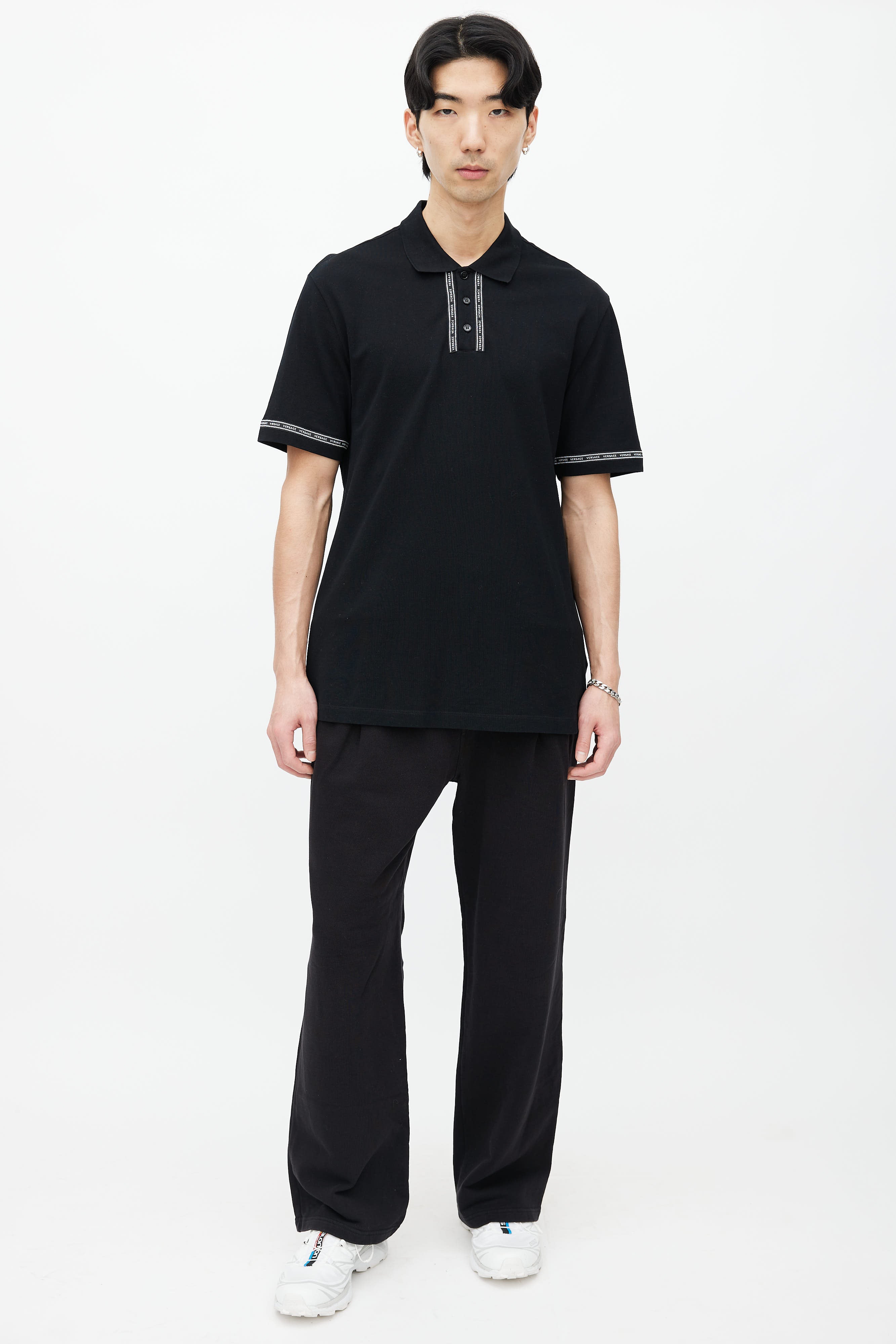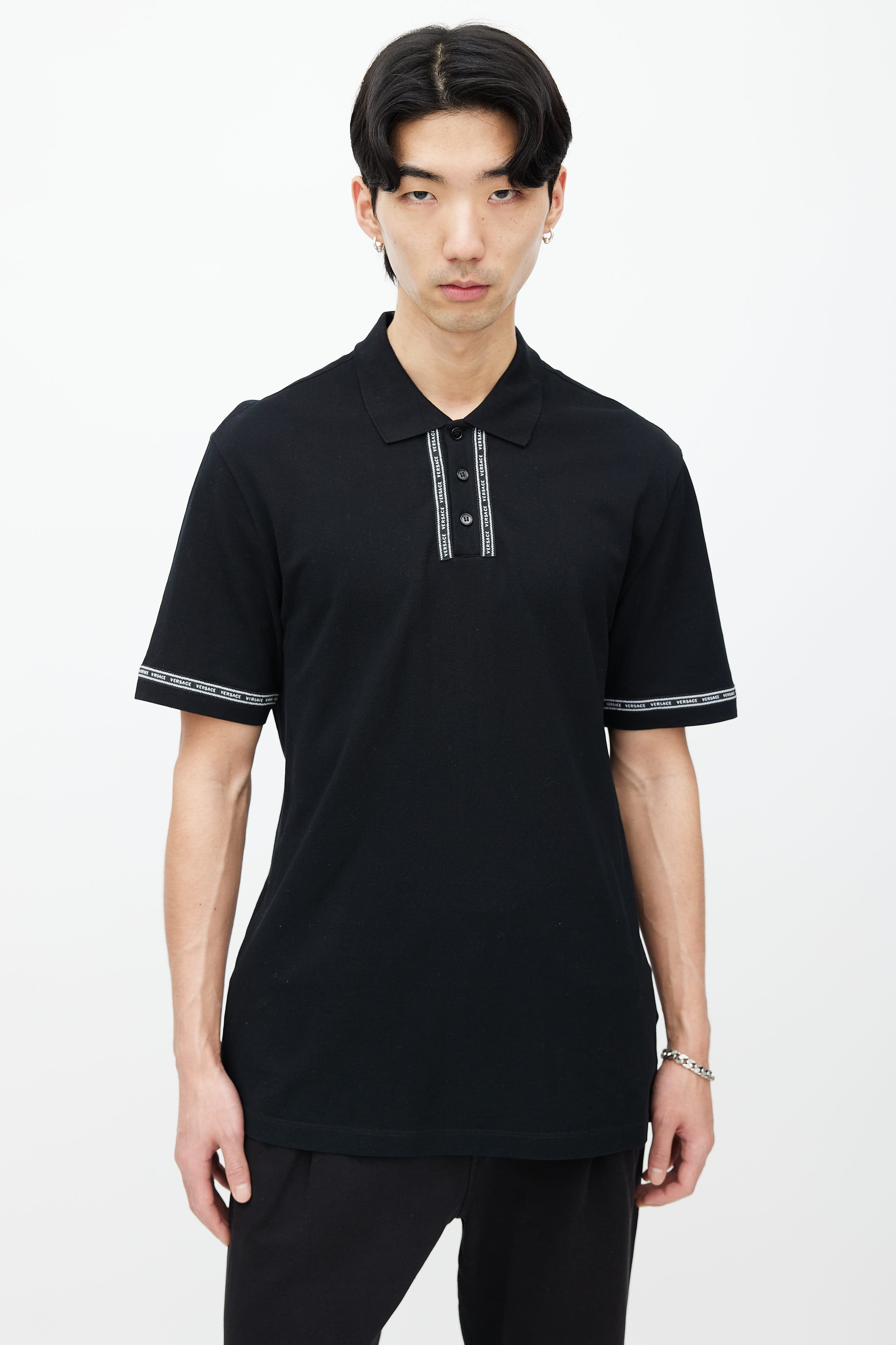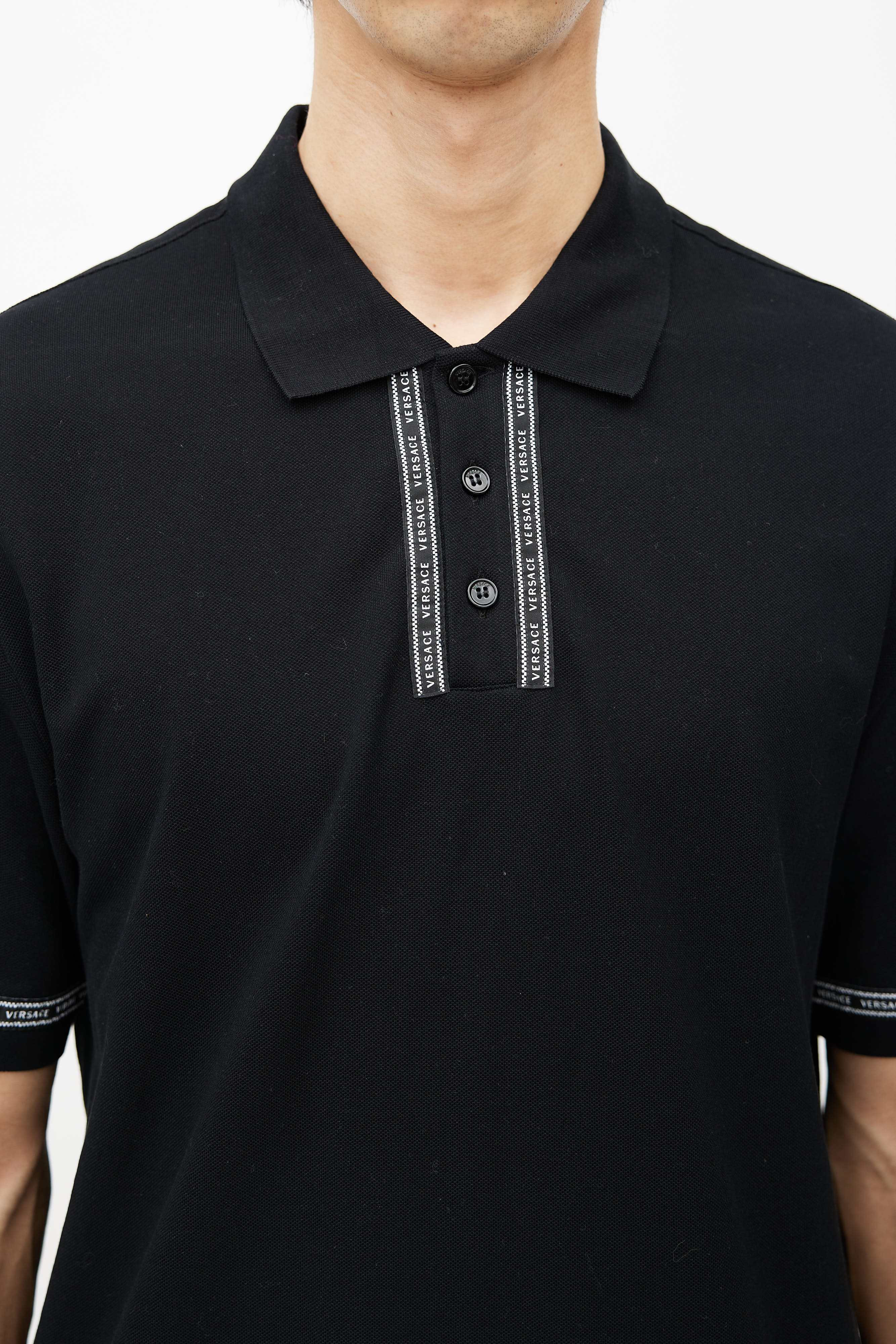 Pre-owned Versace polo in black featuring half button closure at front, classic collar, short sleeves, and white logo trim at closure and cuffs.