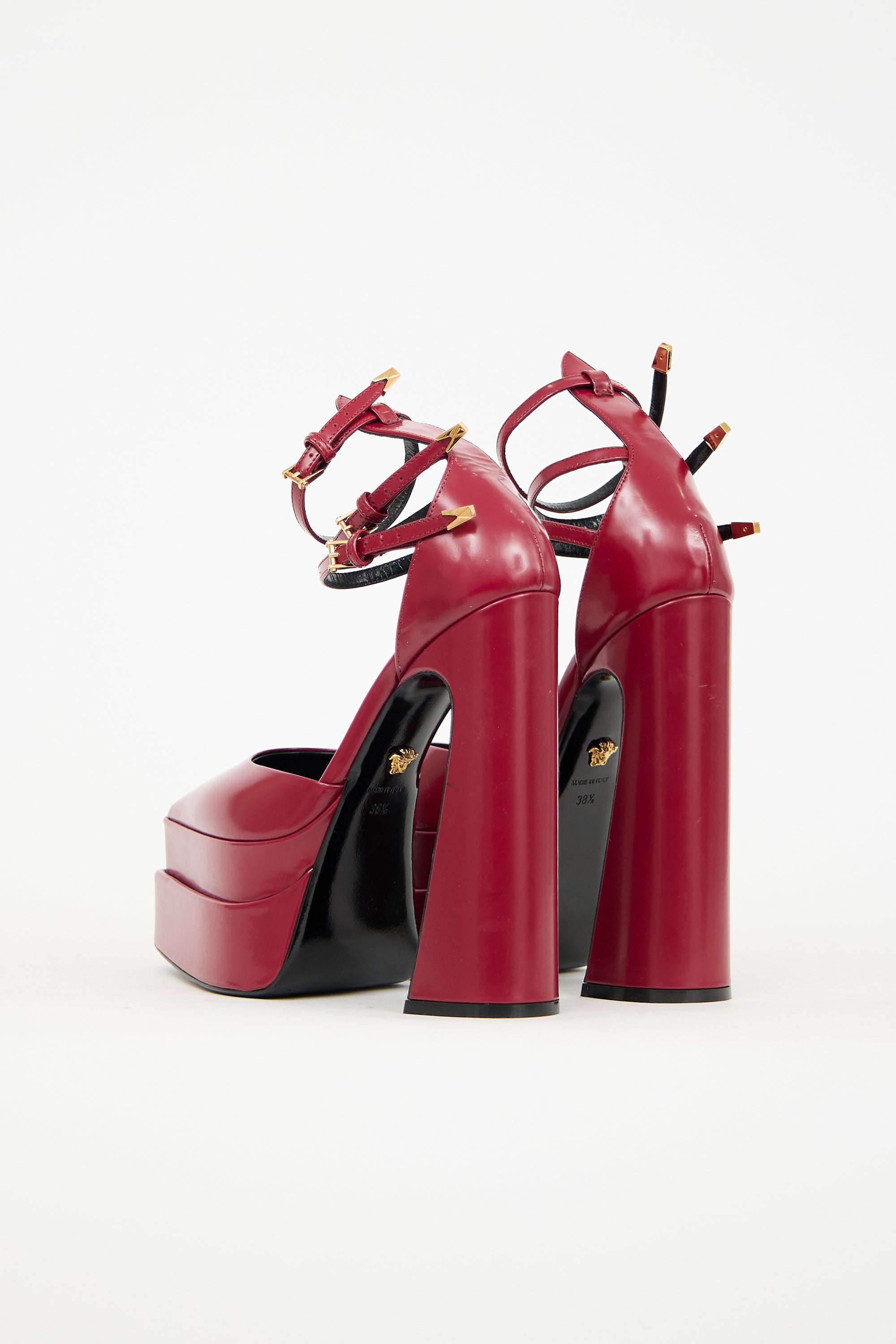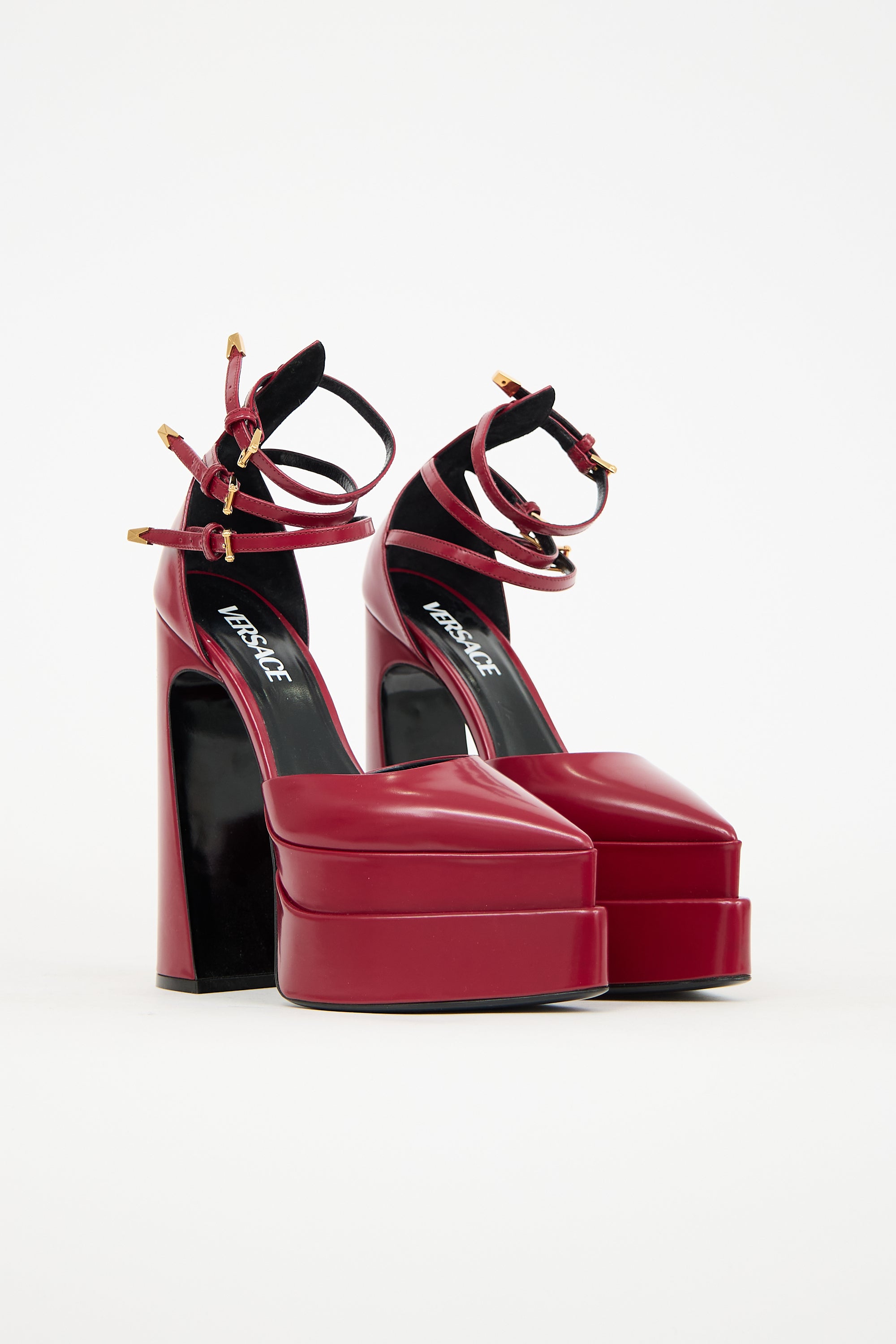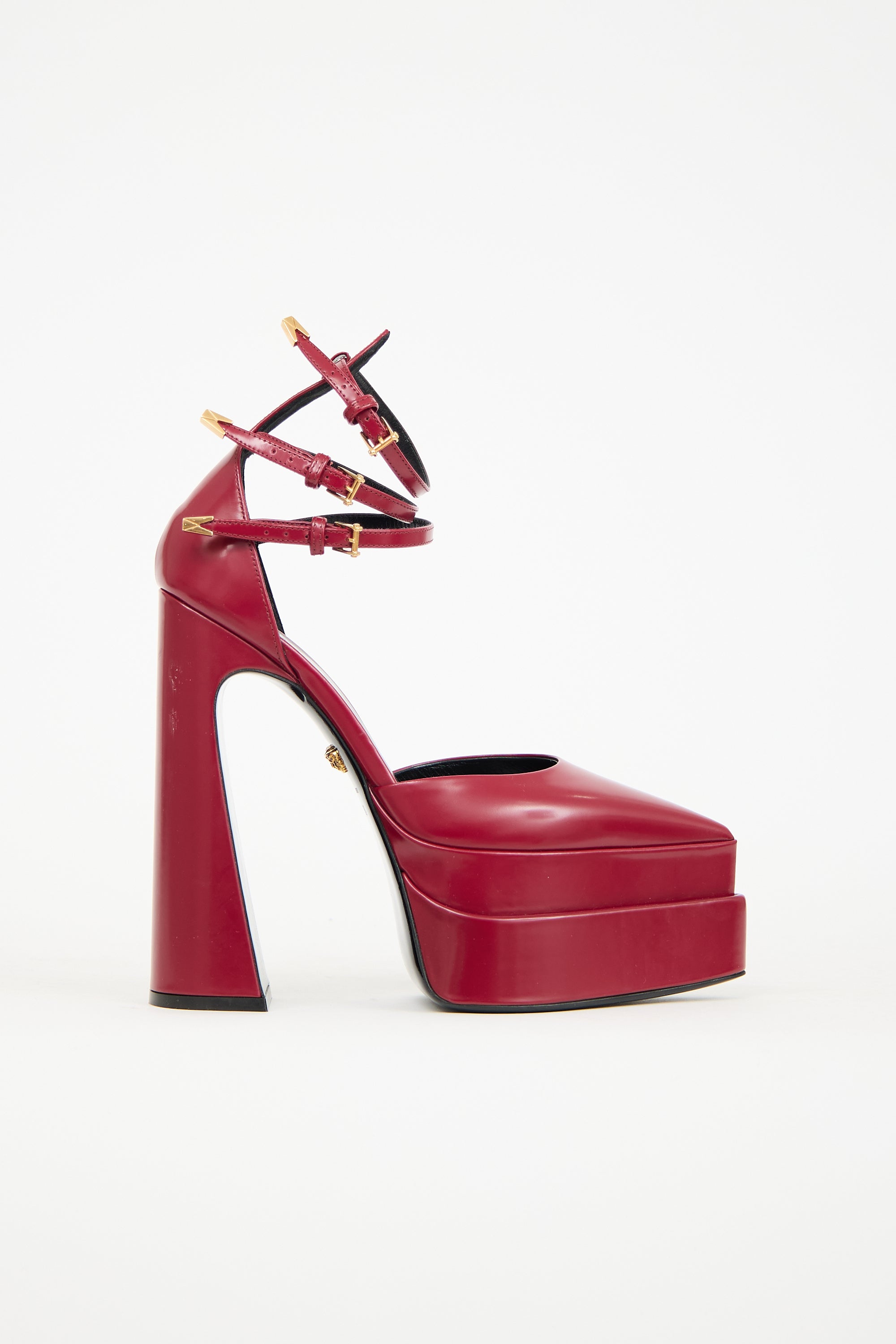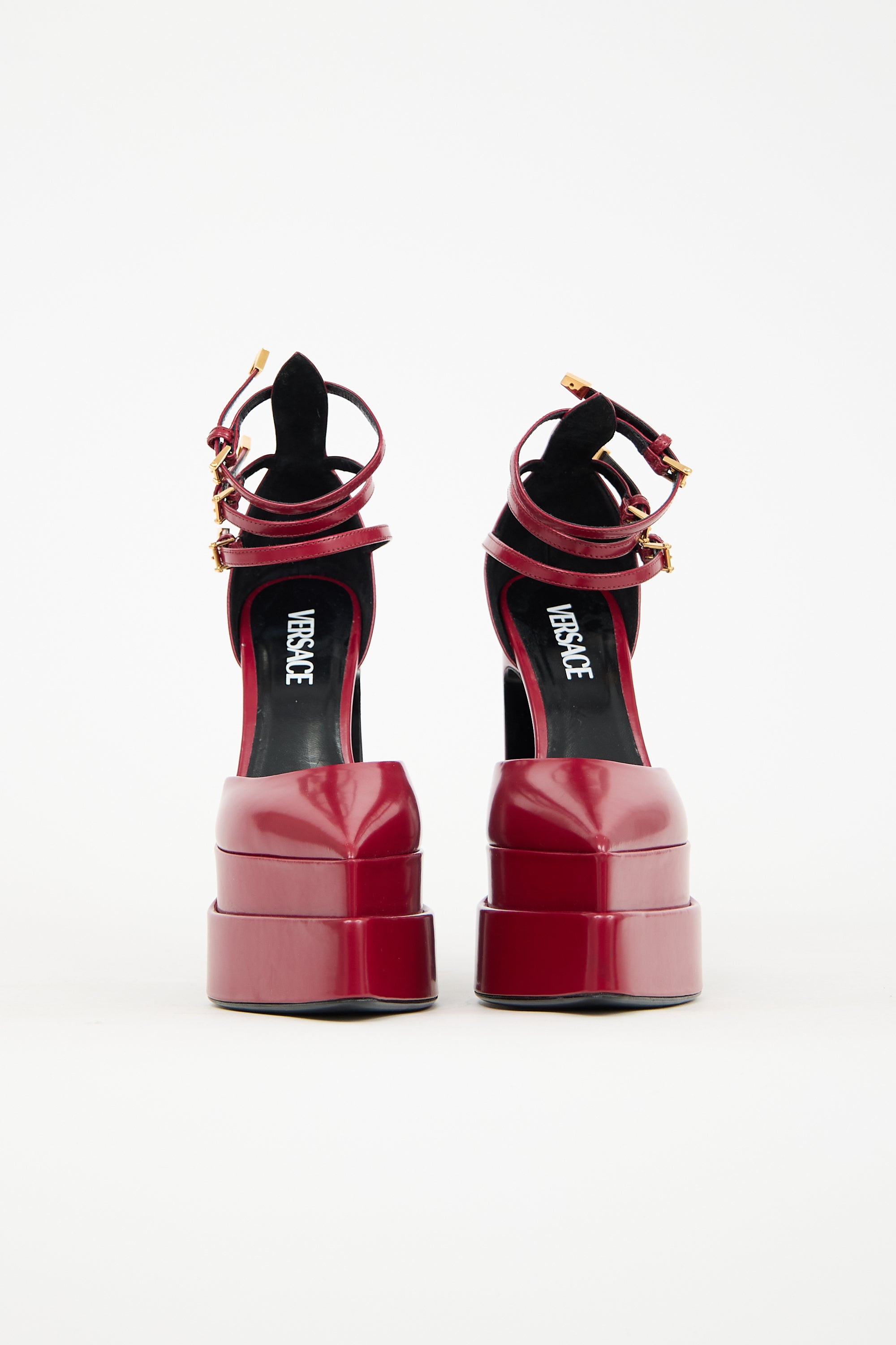 Pre-owned Versace burgundy Aevitas Strappy Platform heels featuring pointed toe, three adjustable ankle straps with buckle fastenings, closed counter, double stacked platform, covered block heel, and with signature Medusa head hardware embellishment at outsole.
