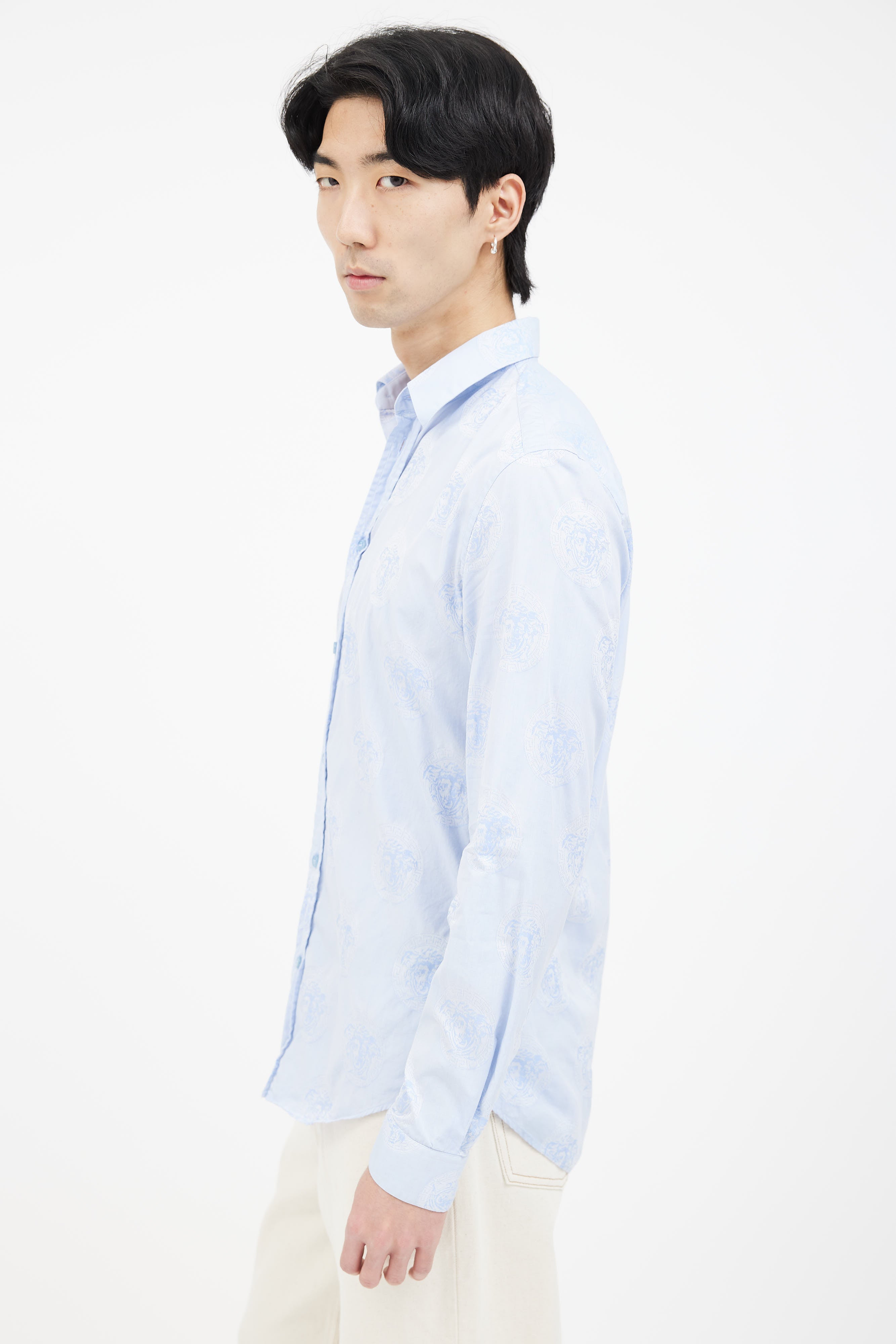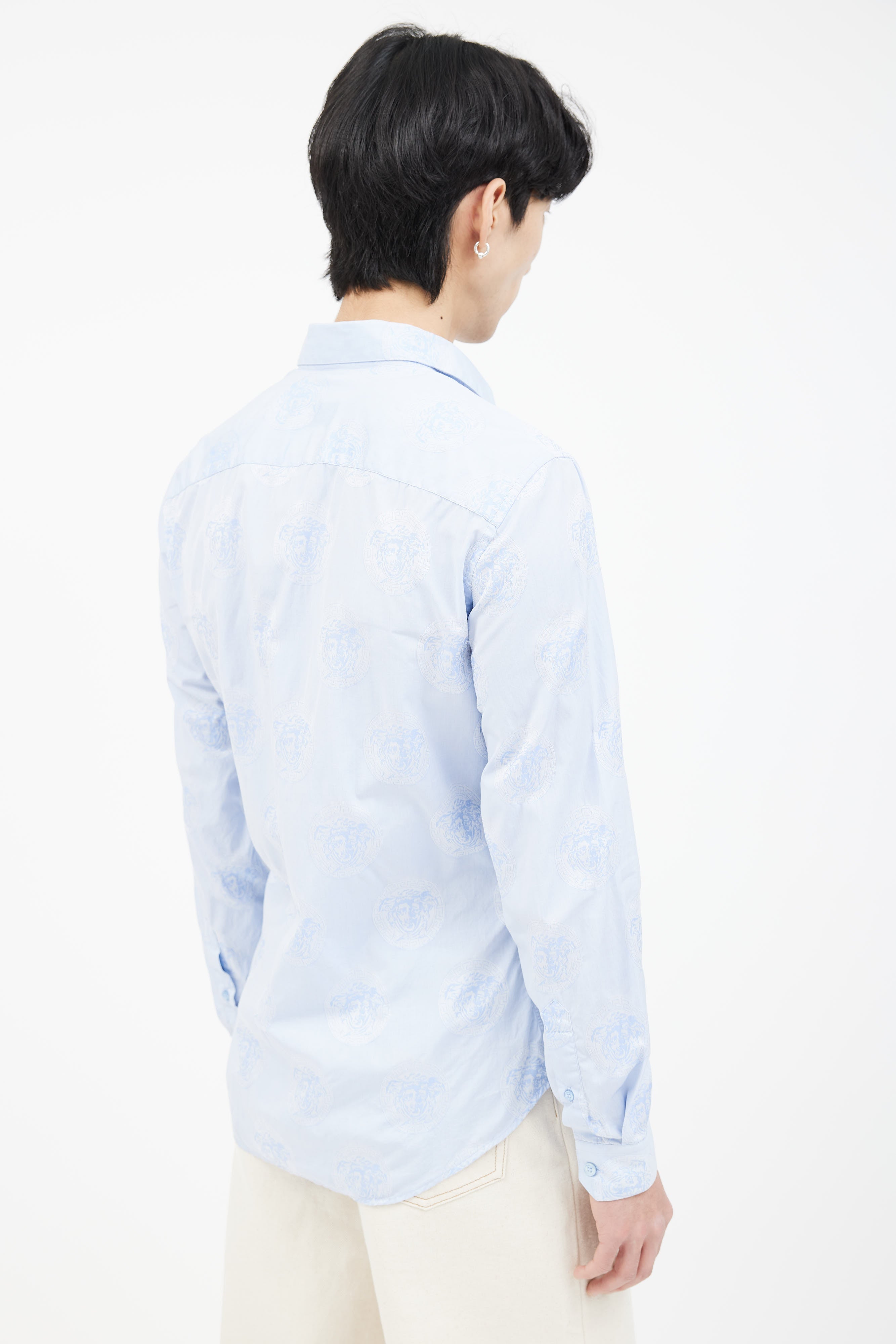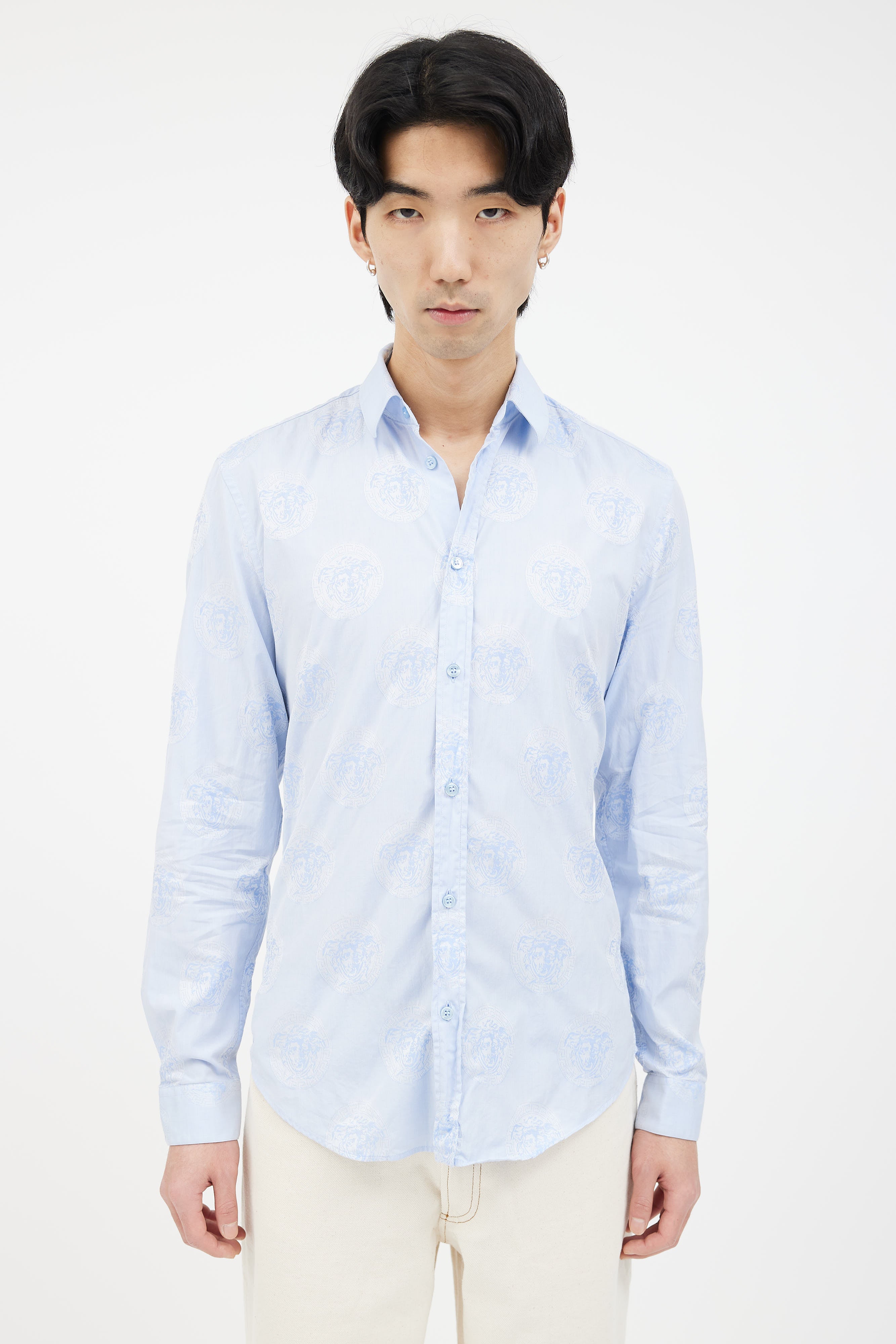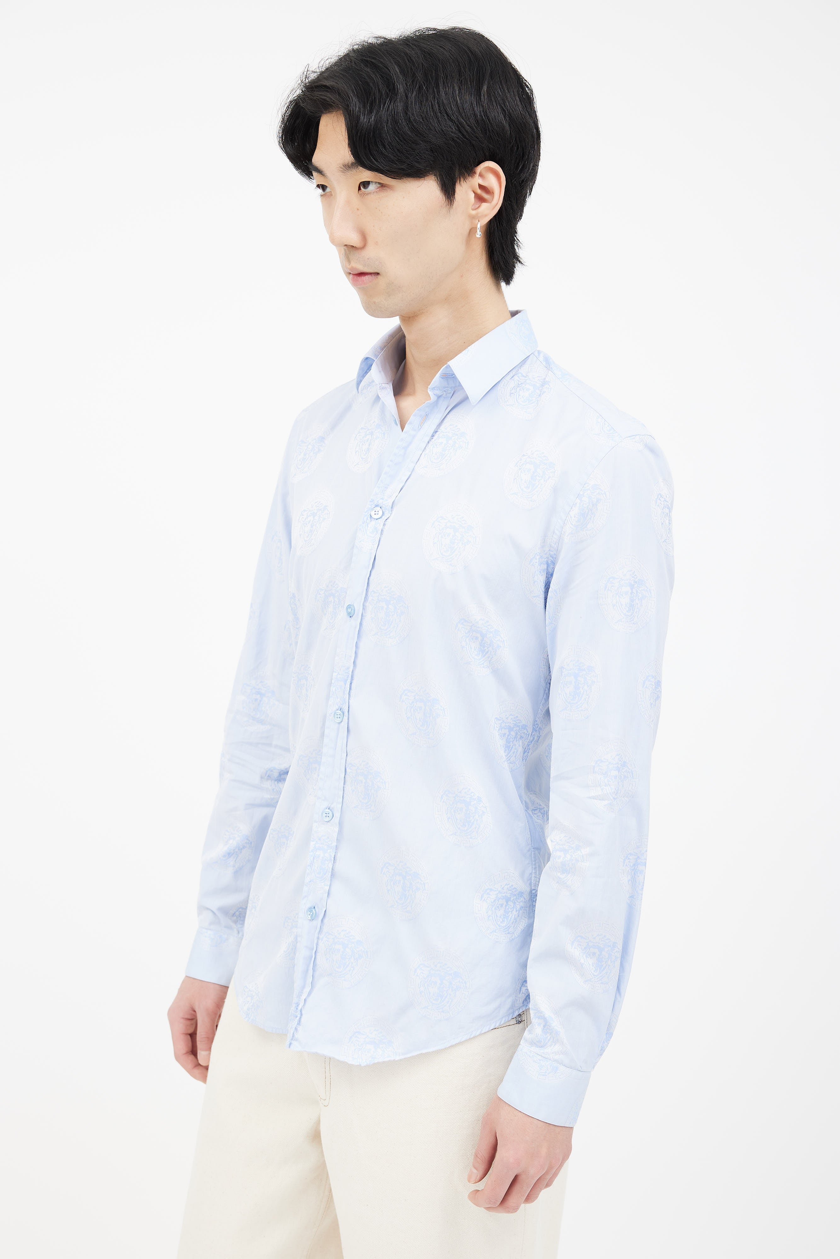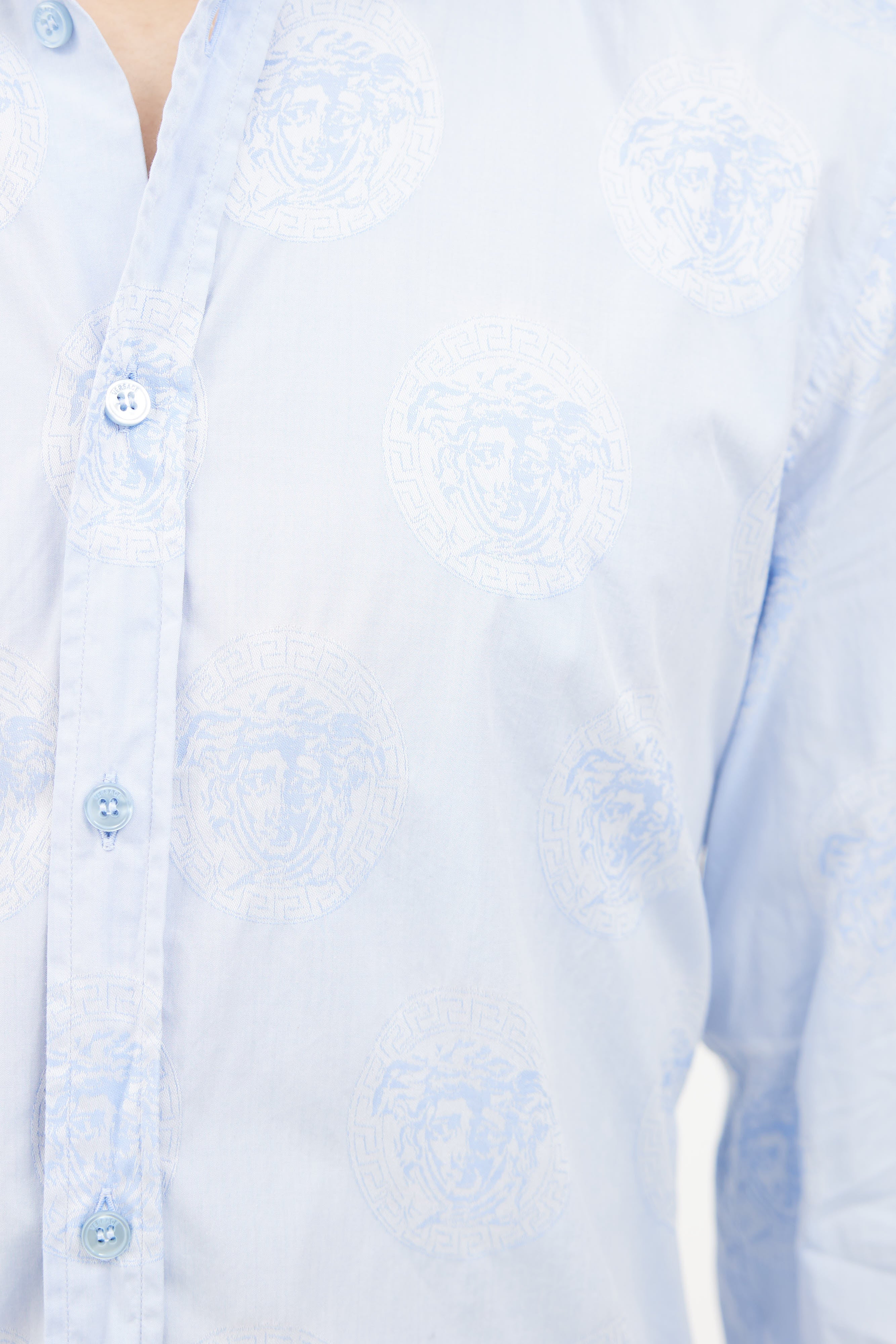 Pre-owned Versace light blue cotton shirt featuring blue jacquard medusa pattern throughout, spread collar, long sleeves, and button-up closure.