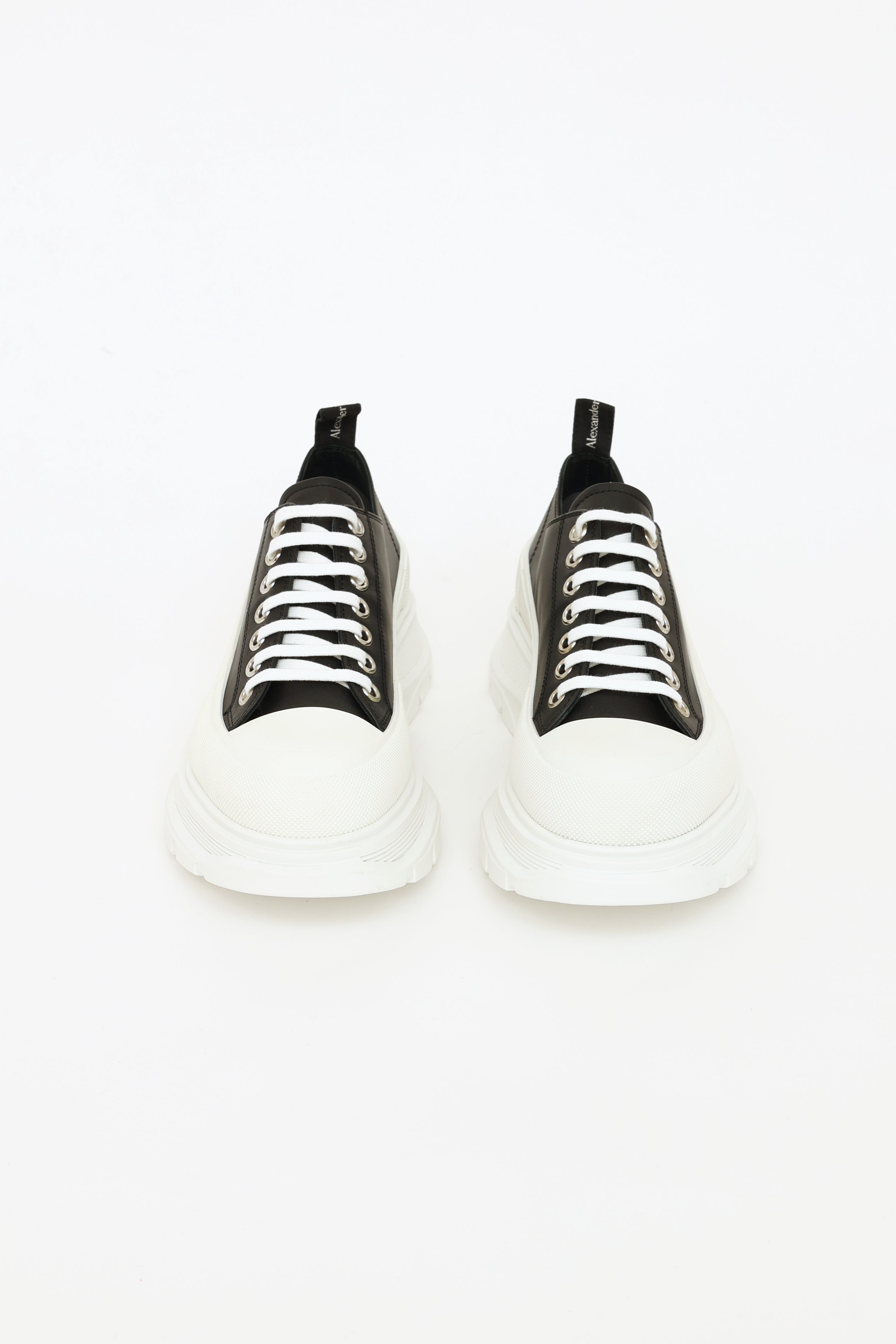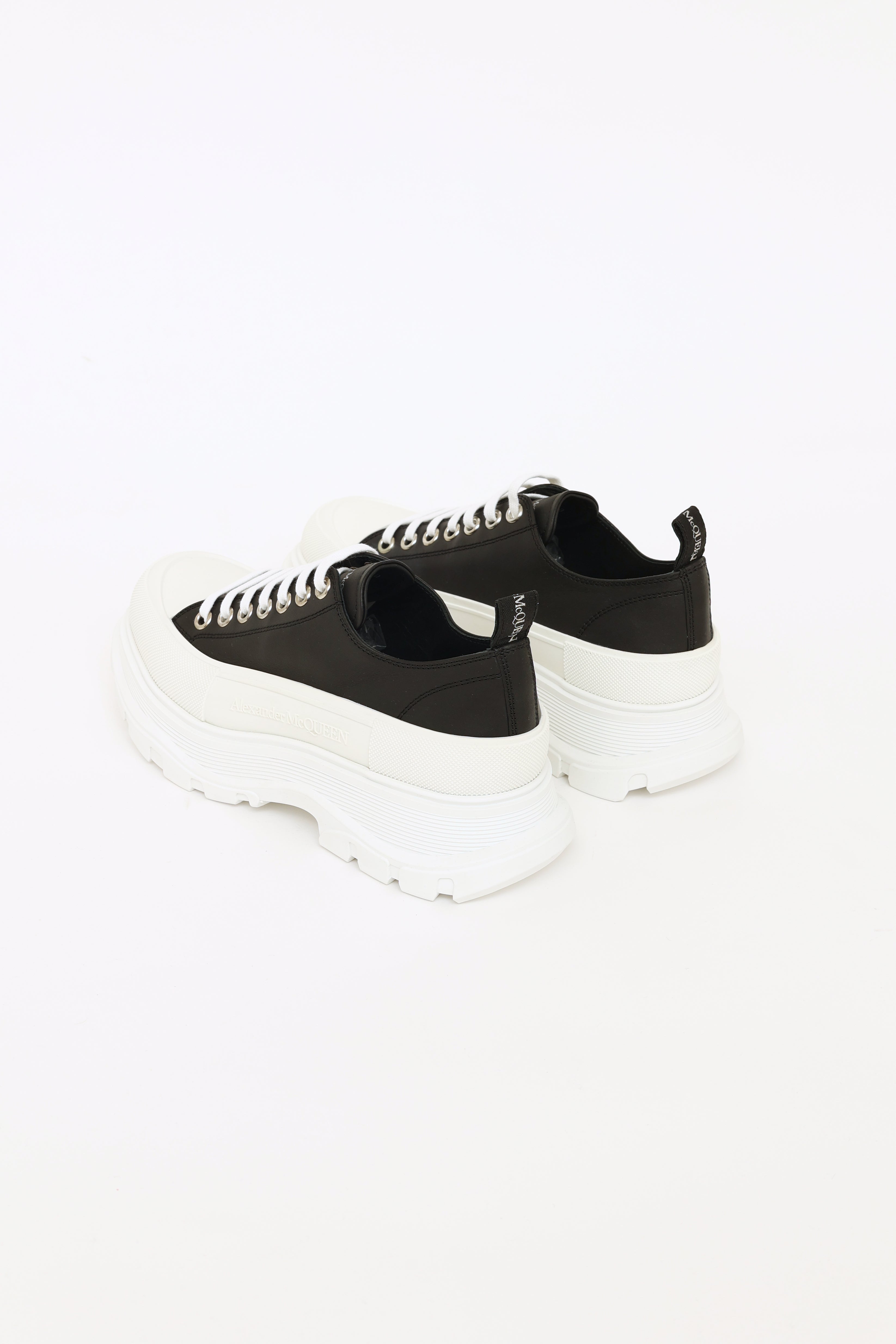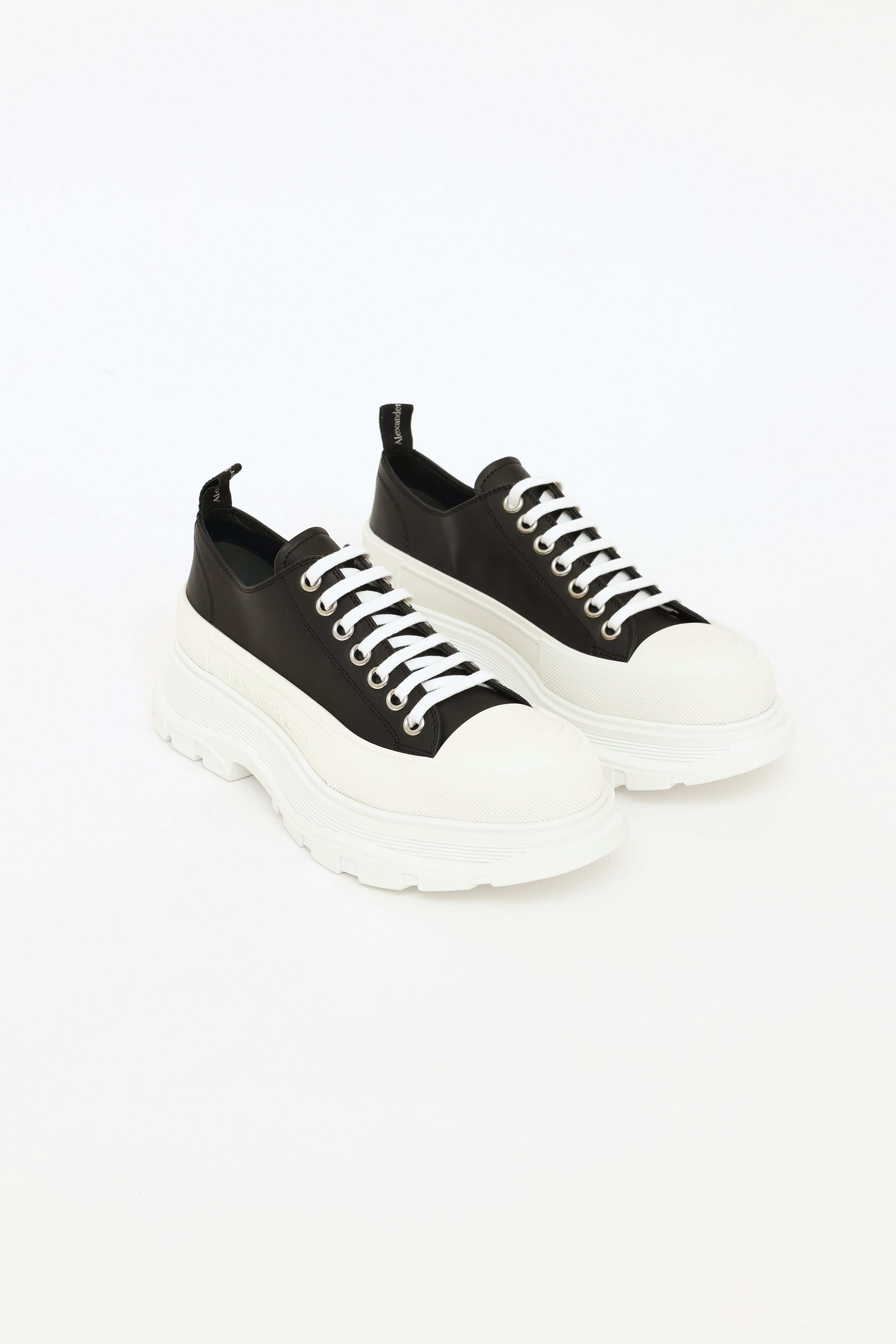 Pre-owned Alexander McQueen black leather treaded sneakers featuring an almond toe, white rubber toe box, black leather upper, lace-up vamp with white laces and Alexander McQueen logo on tongue, exaggerated white rubber treaded midsole with embossed Alexander McQueen logo on exterior side and leather insole.
