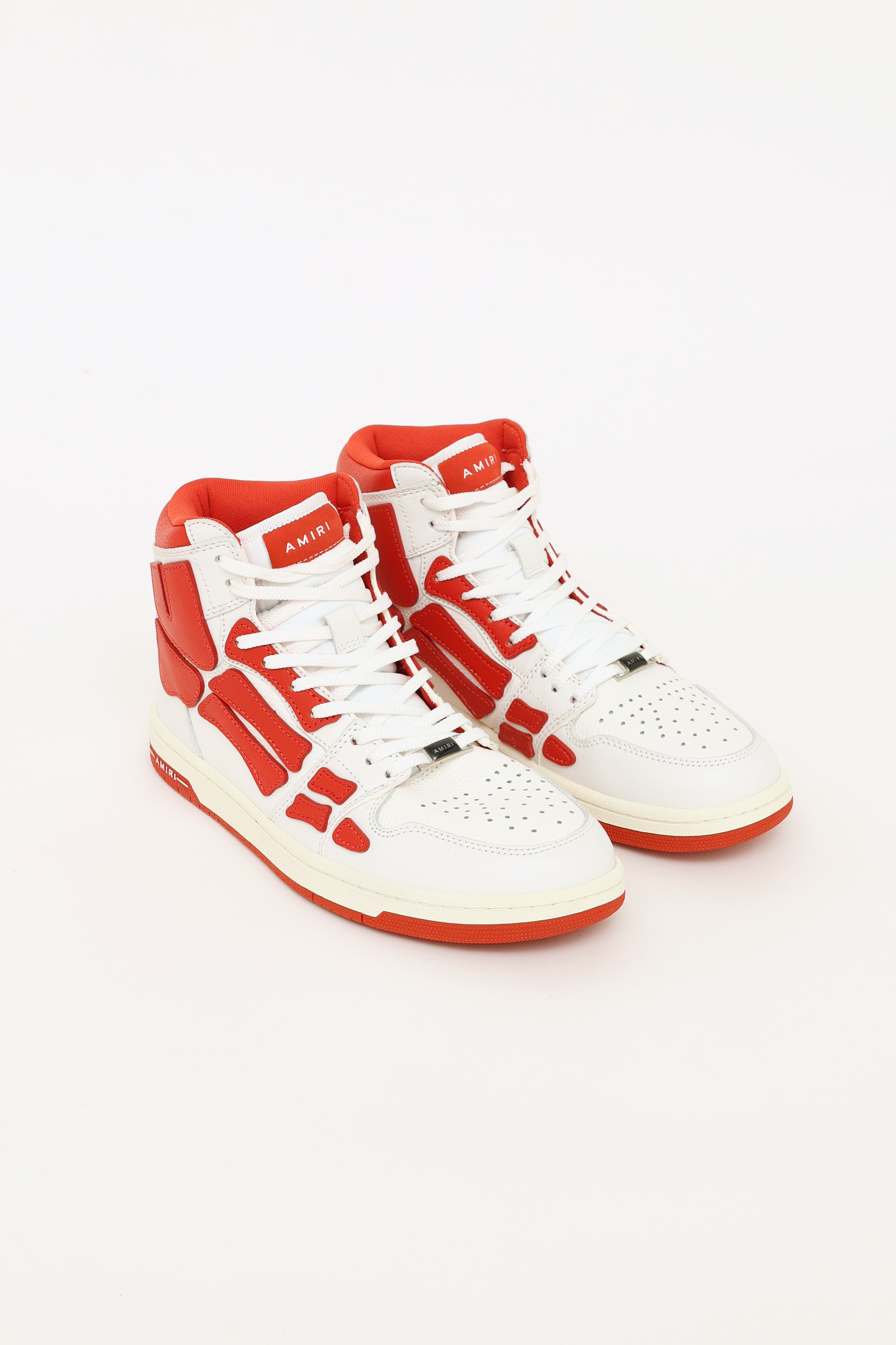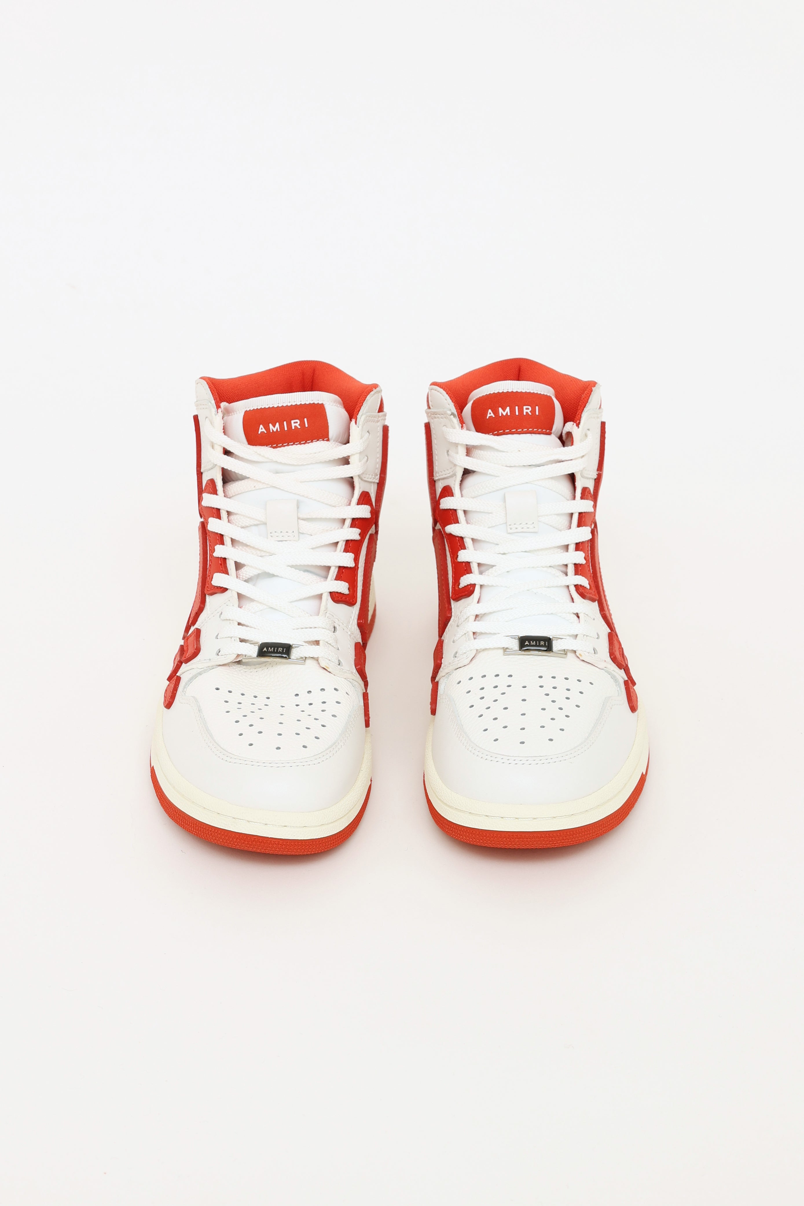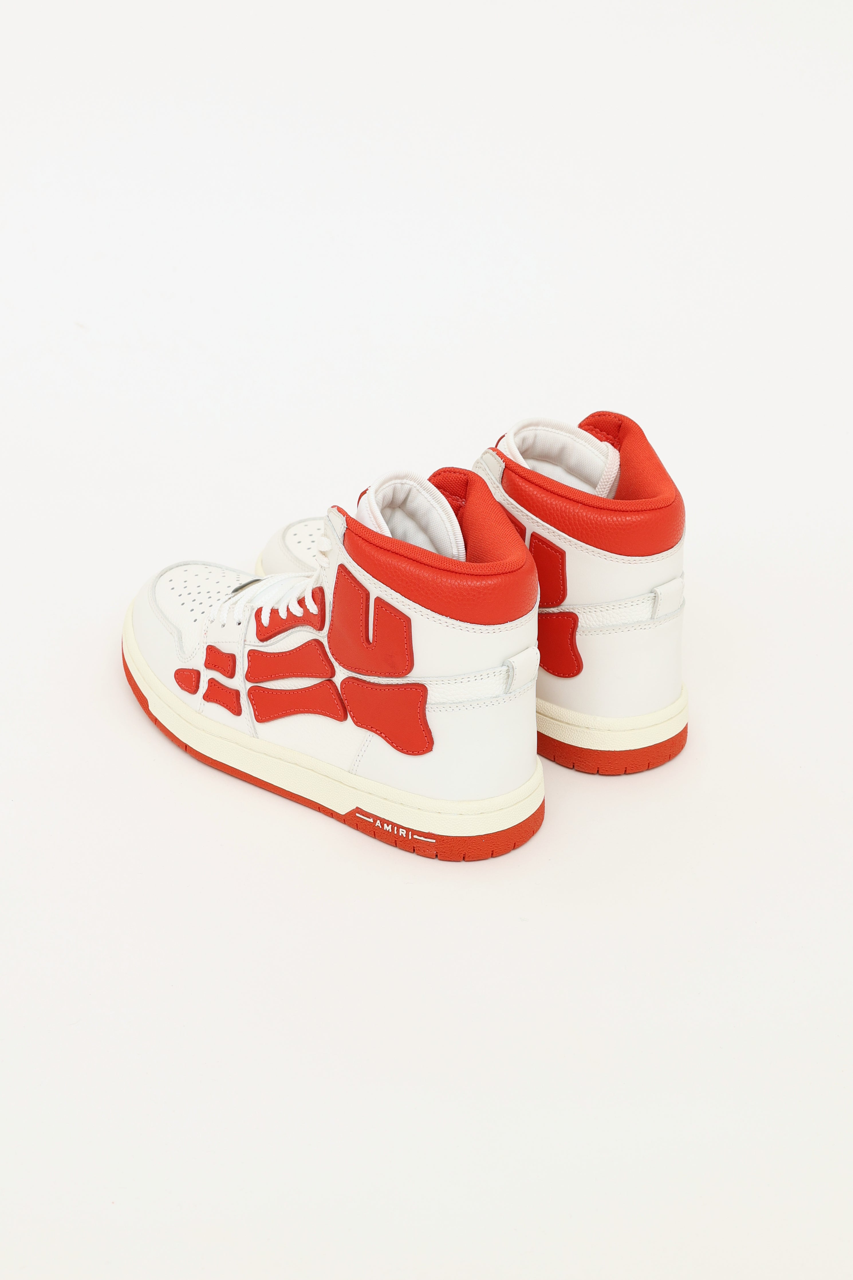 Pre-owned Amiri red Skel Top Hi sneakers featuring a rounded toe, white pebbled leather toe box and sides, lace-up vamp with tonal laces, white smooth leather trim and counter, red smooth leather appliques on sides, white and red midsole and Amiri logo detail on tongue.