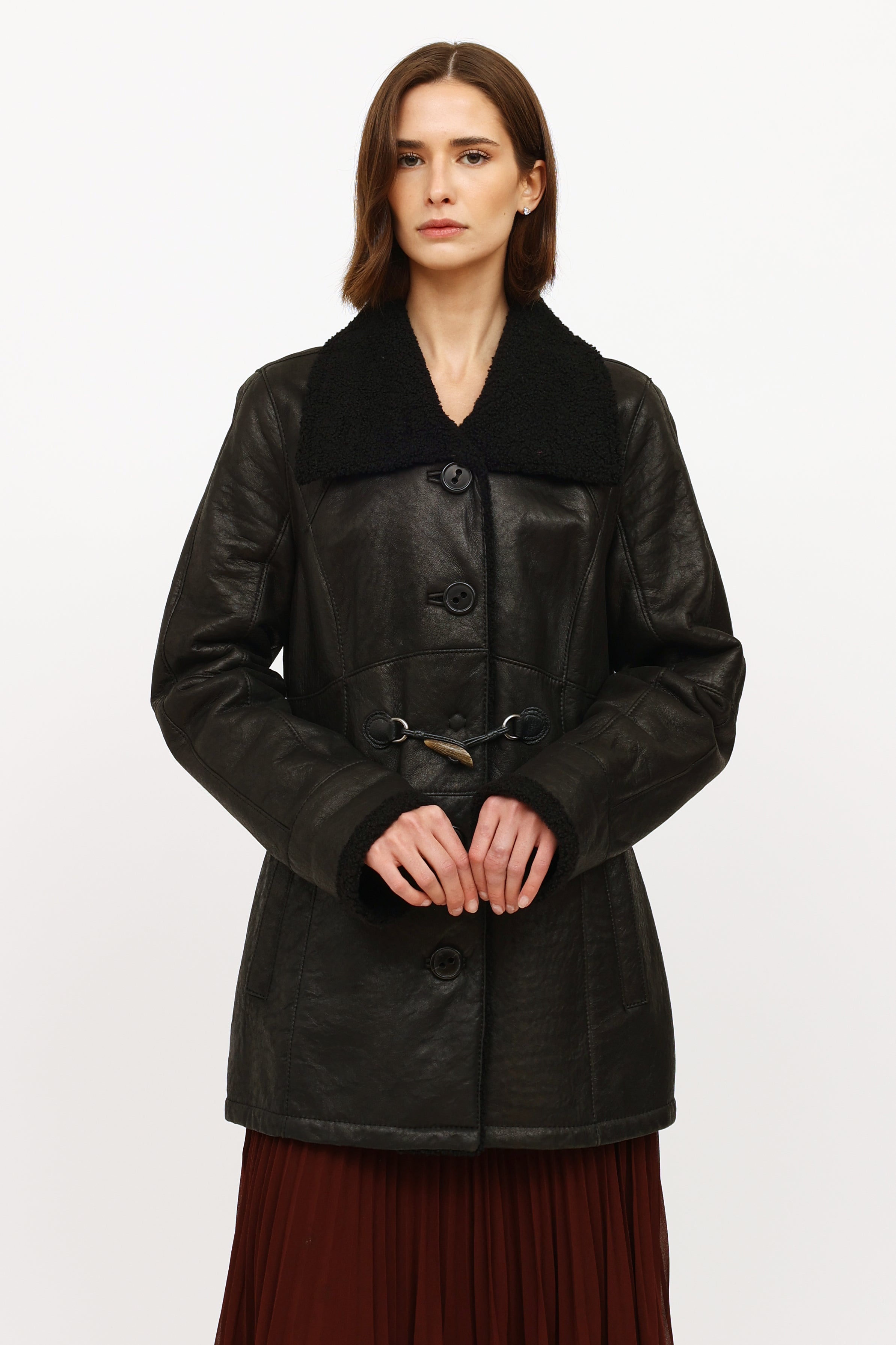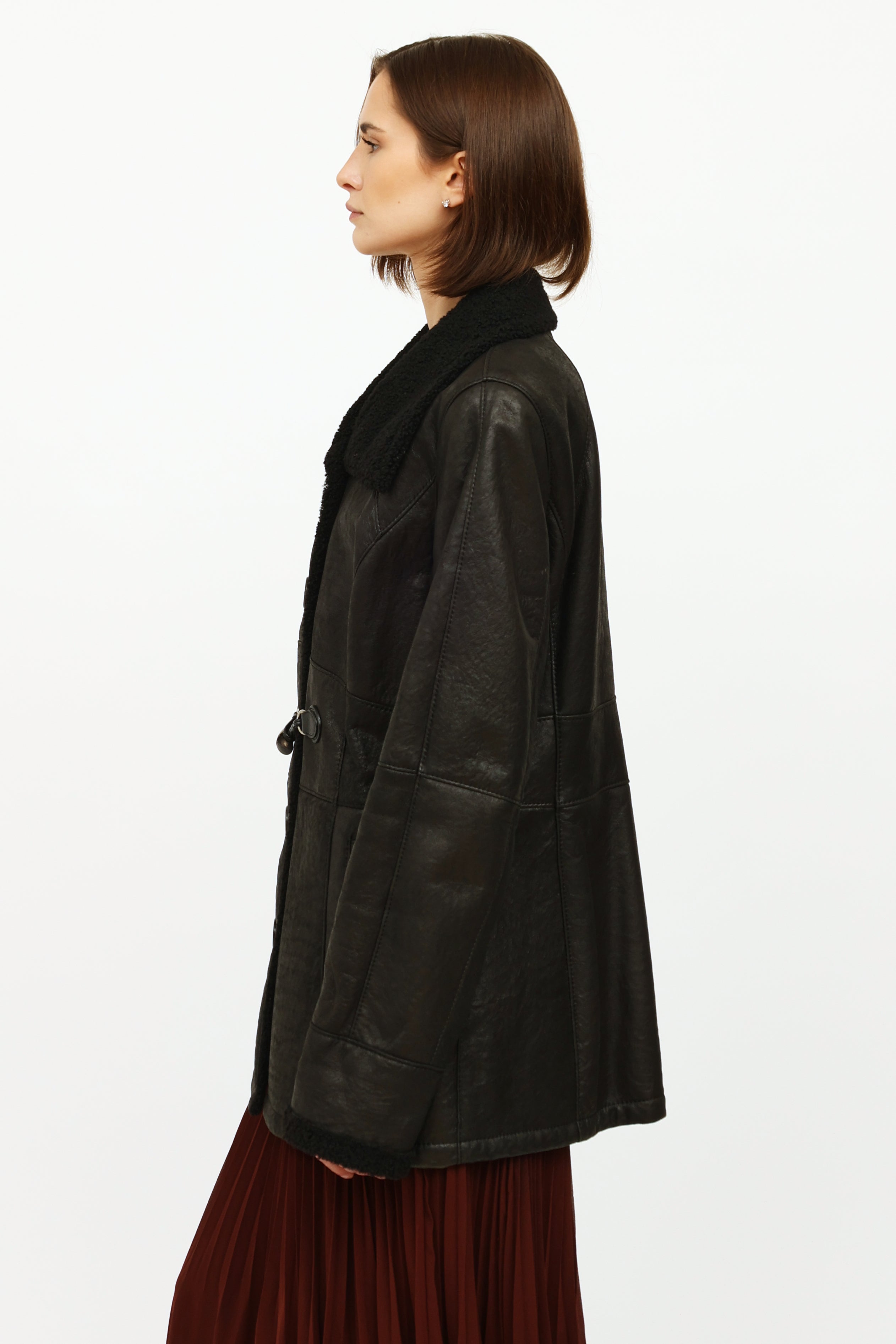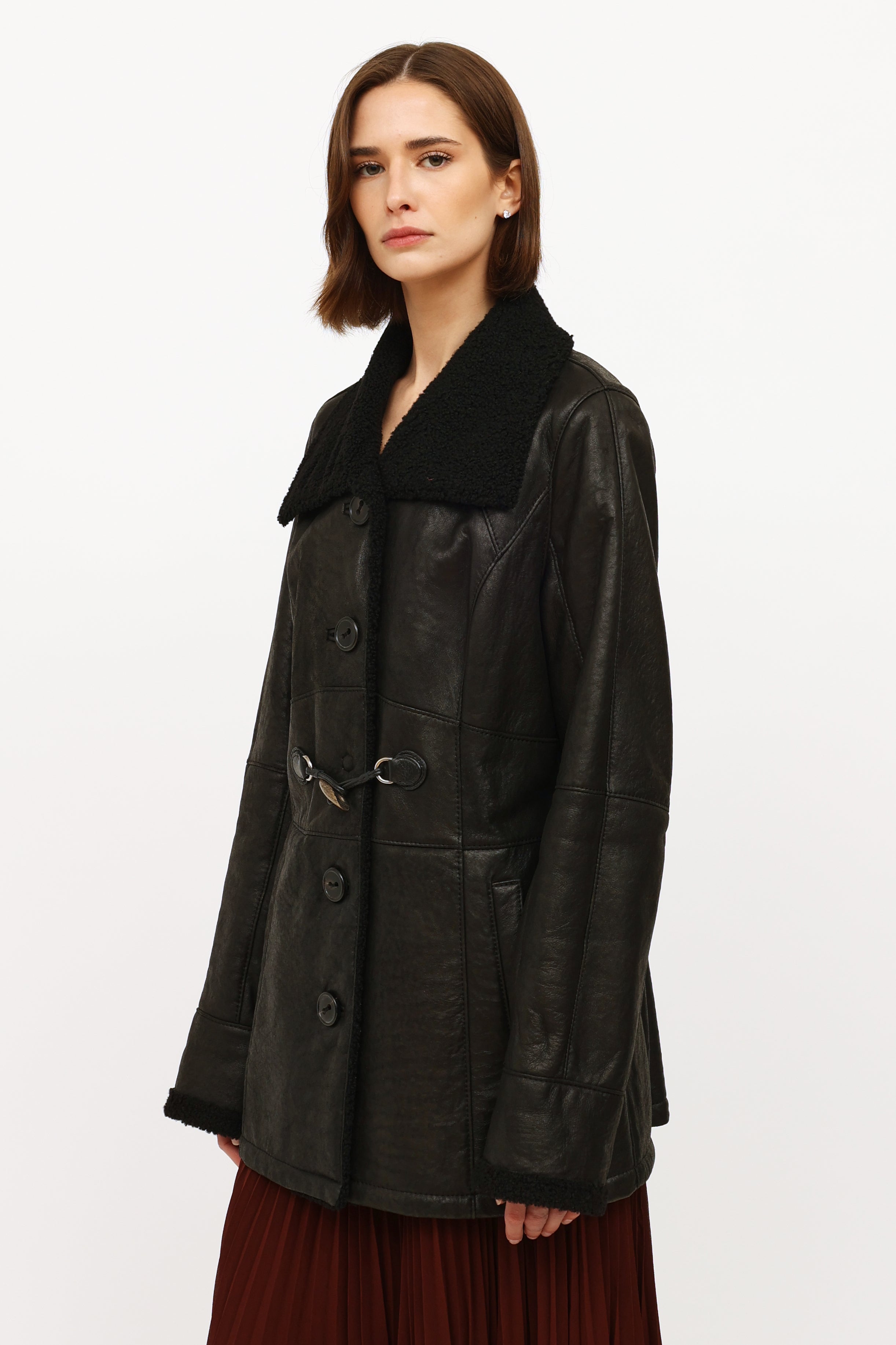 Pre-owned Christ black leather coat featuring a shearling collar and lining, button down closure, decorative boar's tusk closure at waist, pockets at hip, and two interior zip pockets.