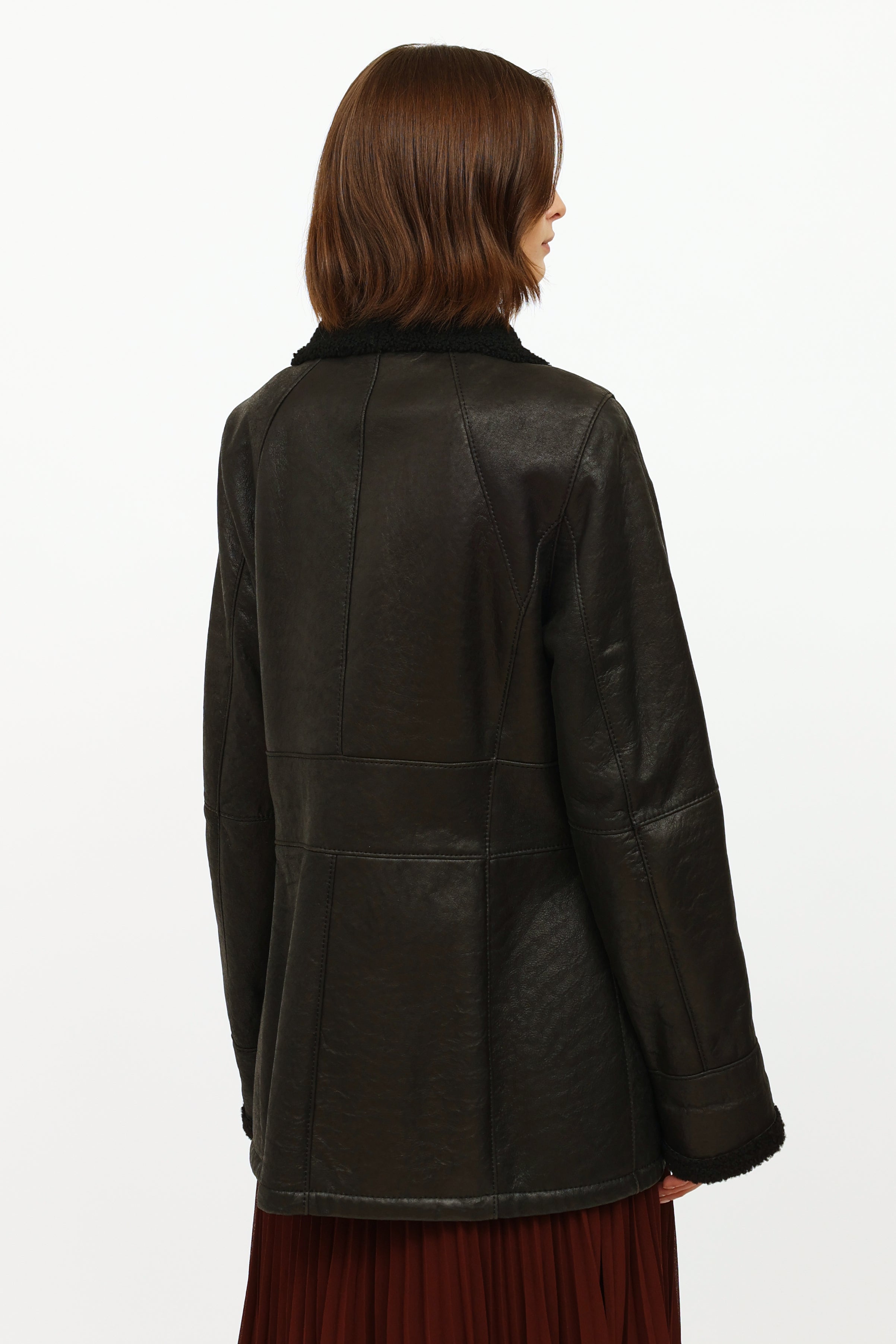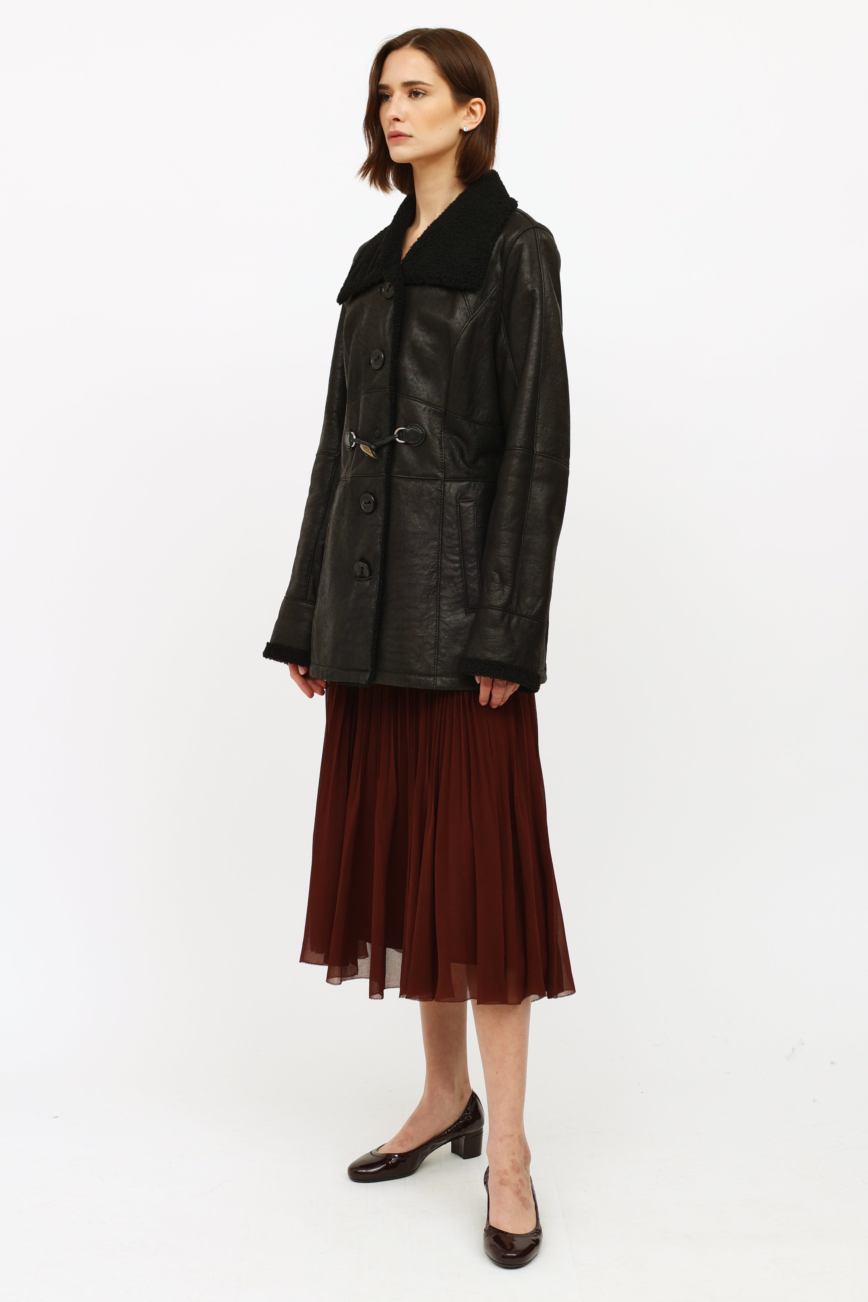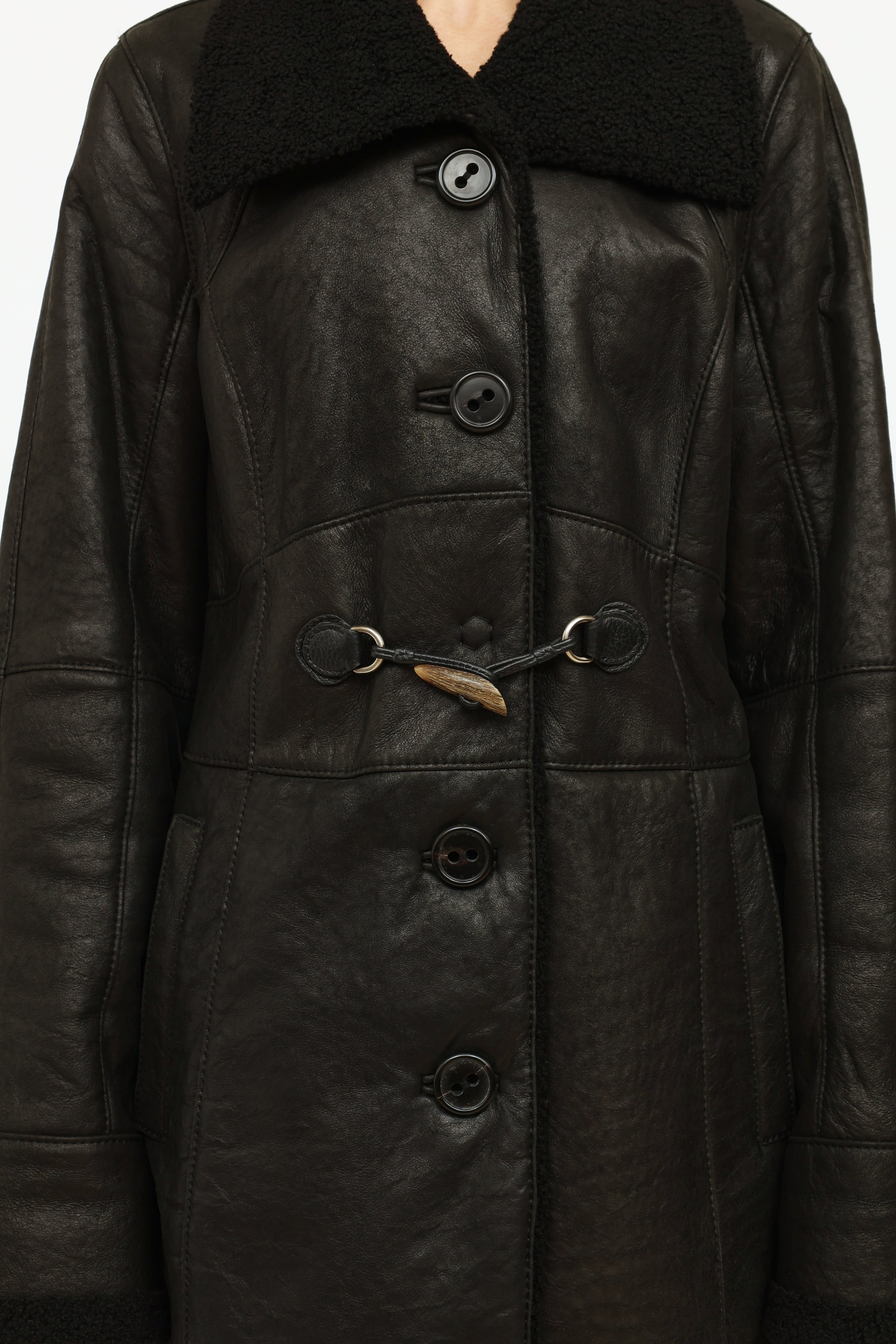 Pre-owned Christ black leather coat featuring a shearling collar and lining, button down closure, decorative boar's tusk closure at waist, pockets at hip, and two interior zip pockets.