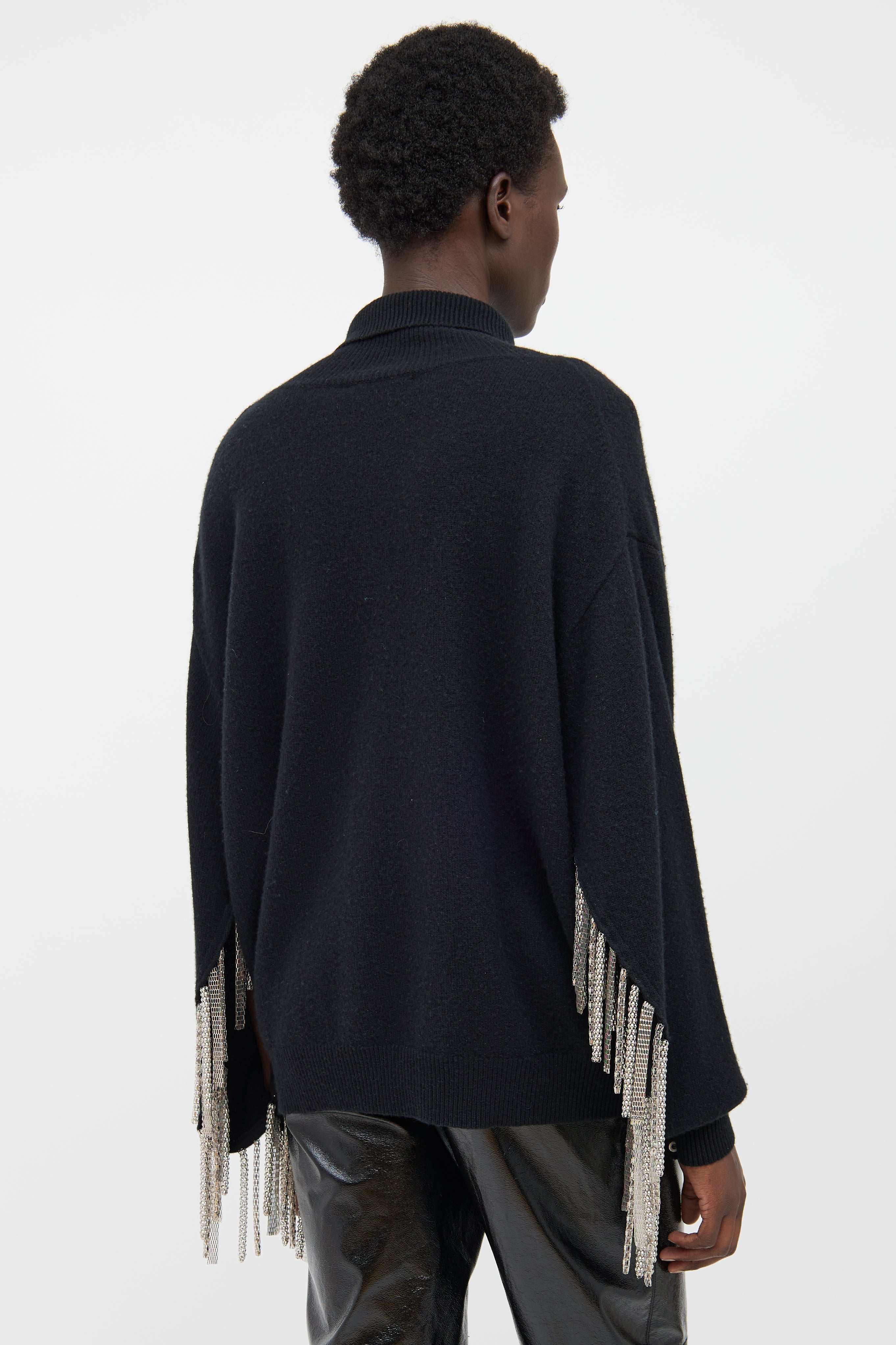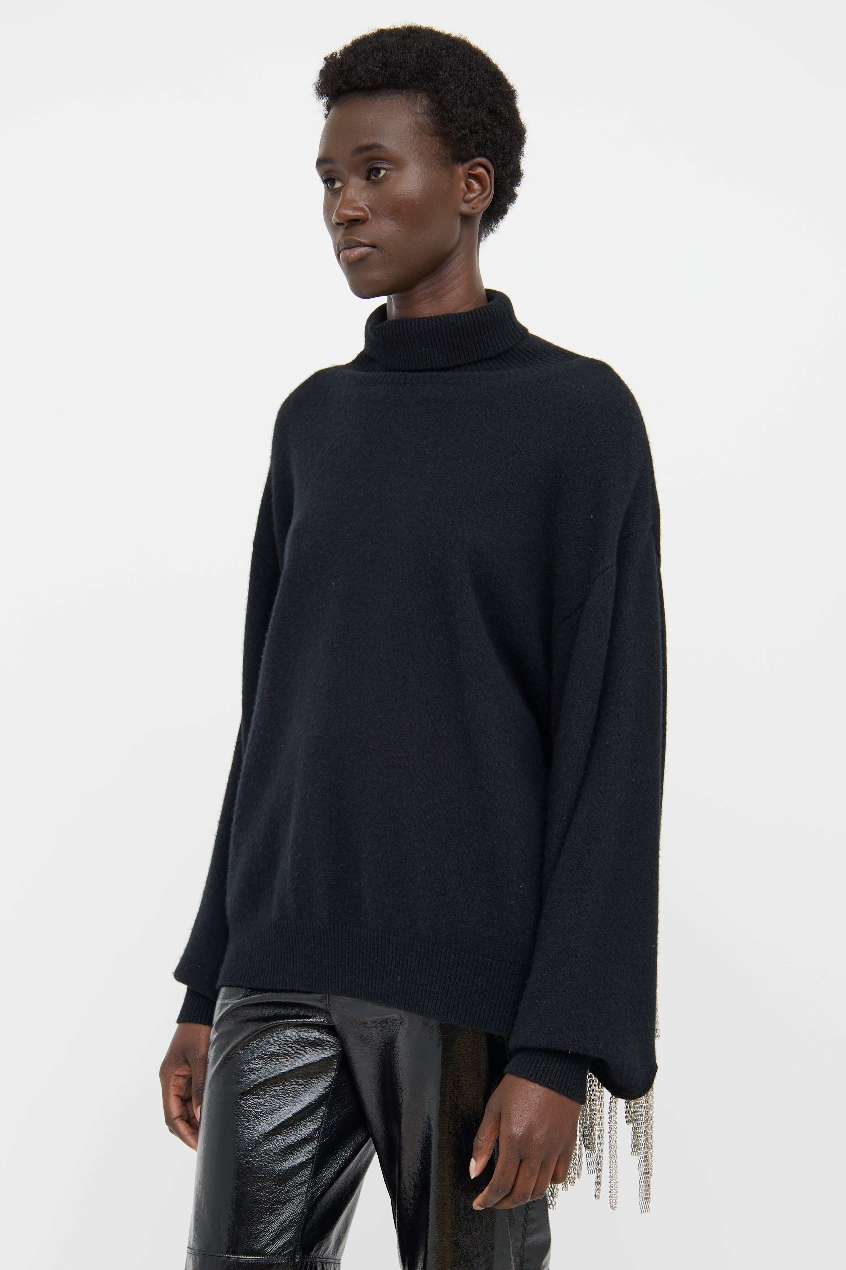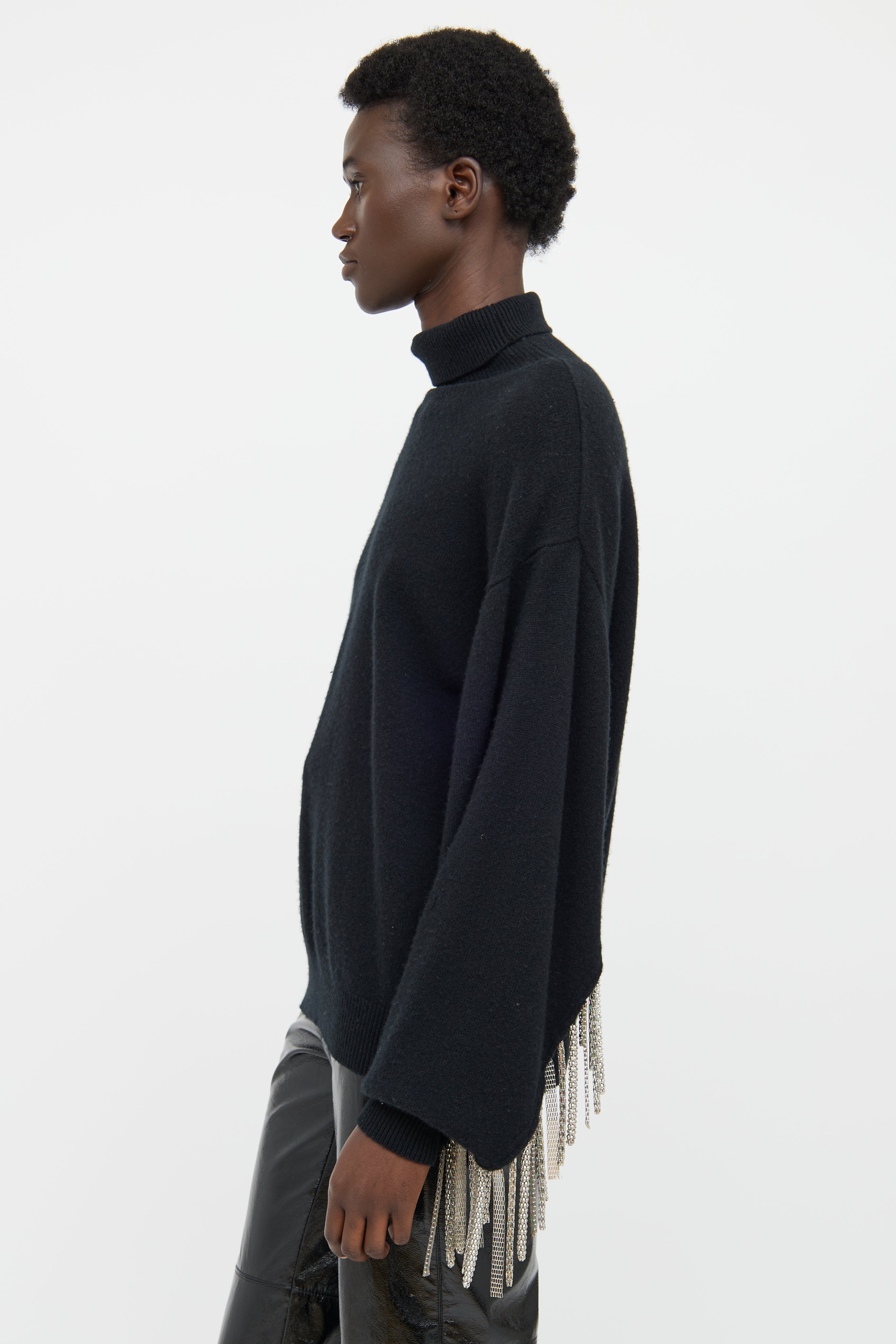 Pre-owned Christopher Kane black chain fringe knitted wool blend sweater featuring a high neck collar, full length sleeve with silver tone chain link fringe detailing, button cuffs, and ribbed hemming throughout.