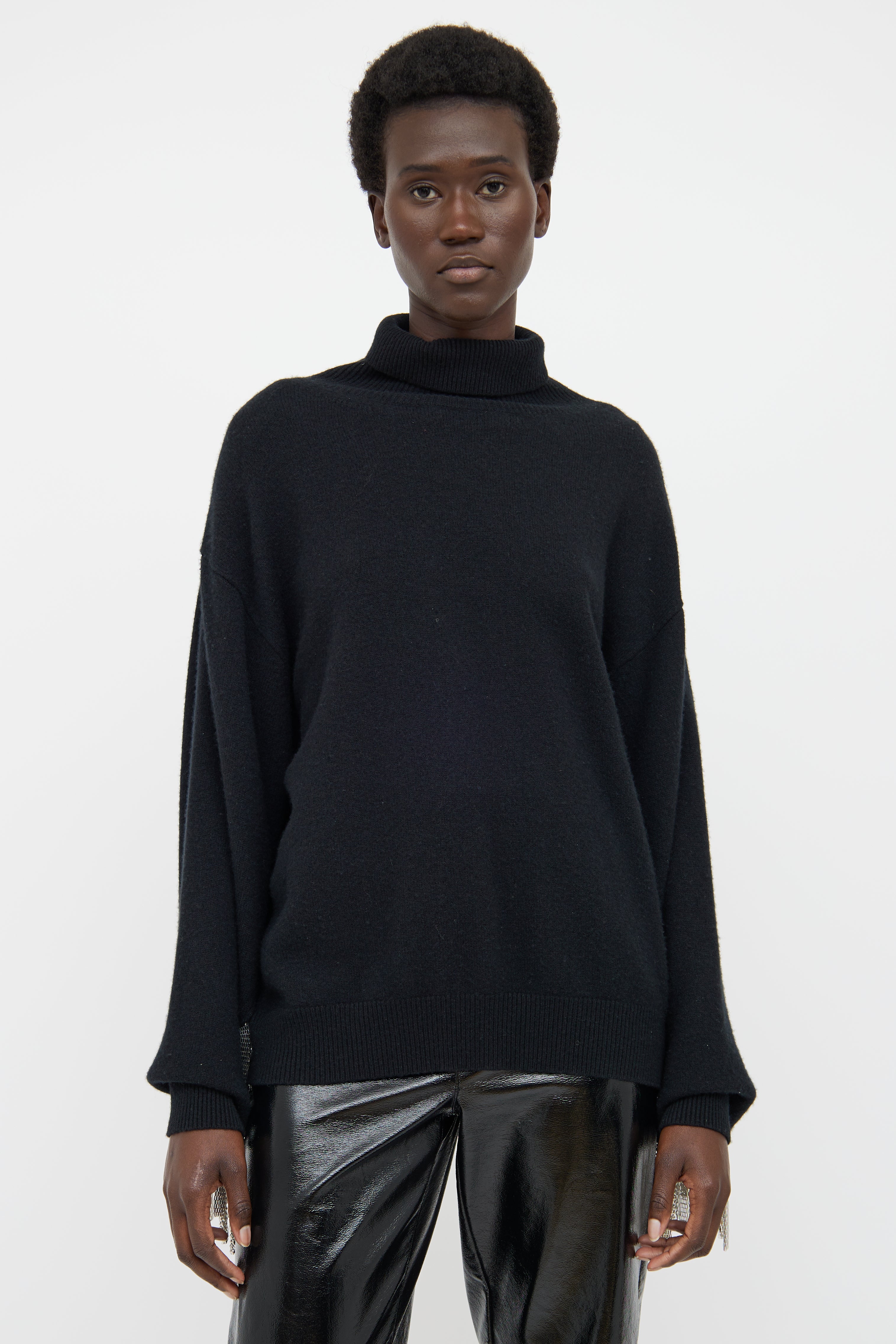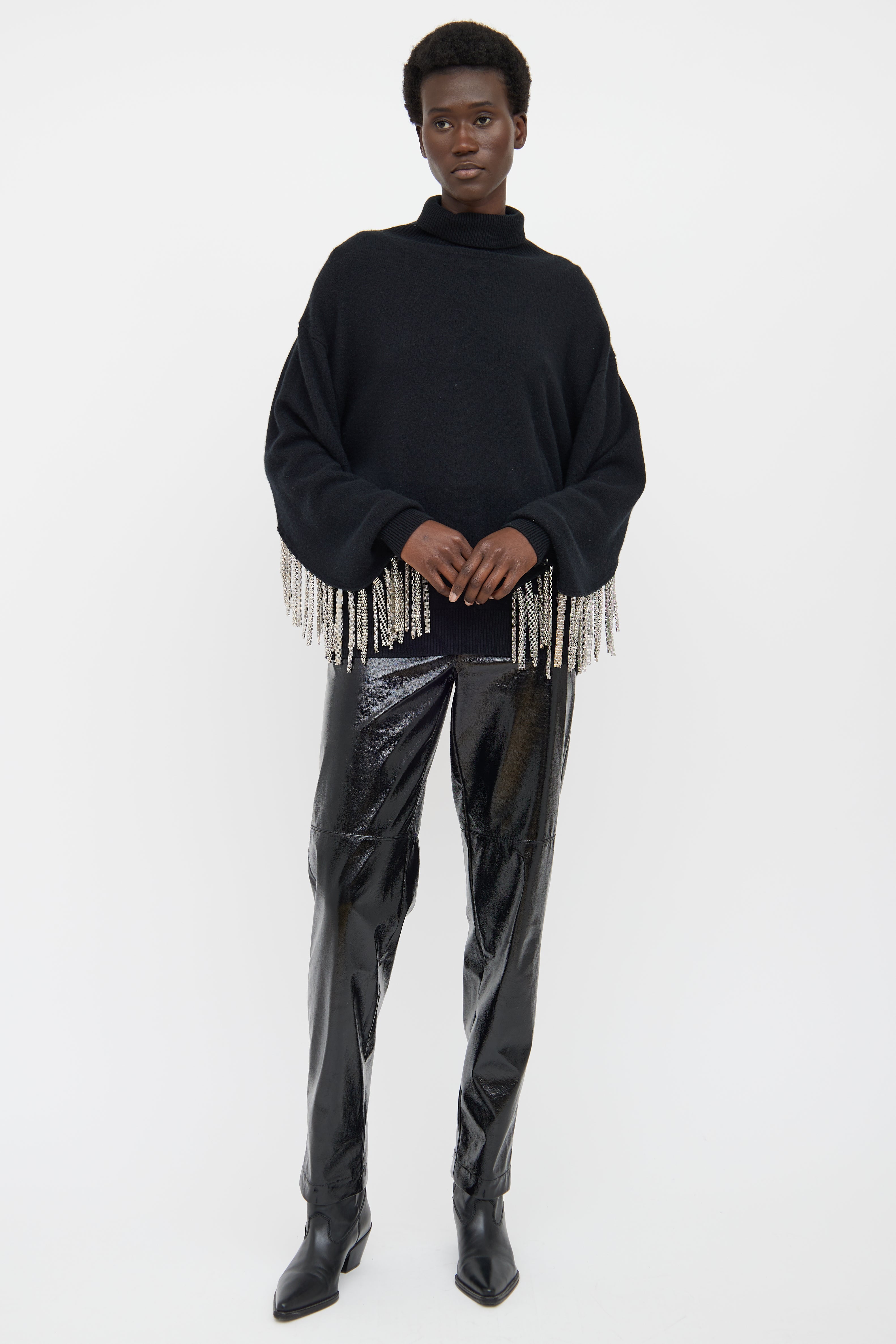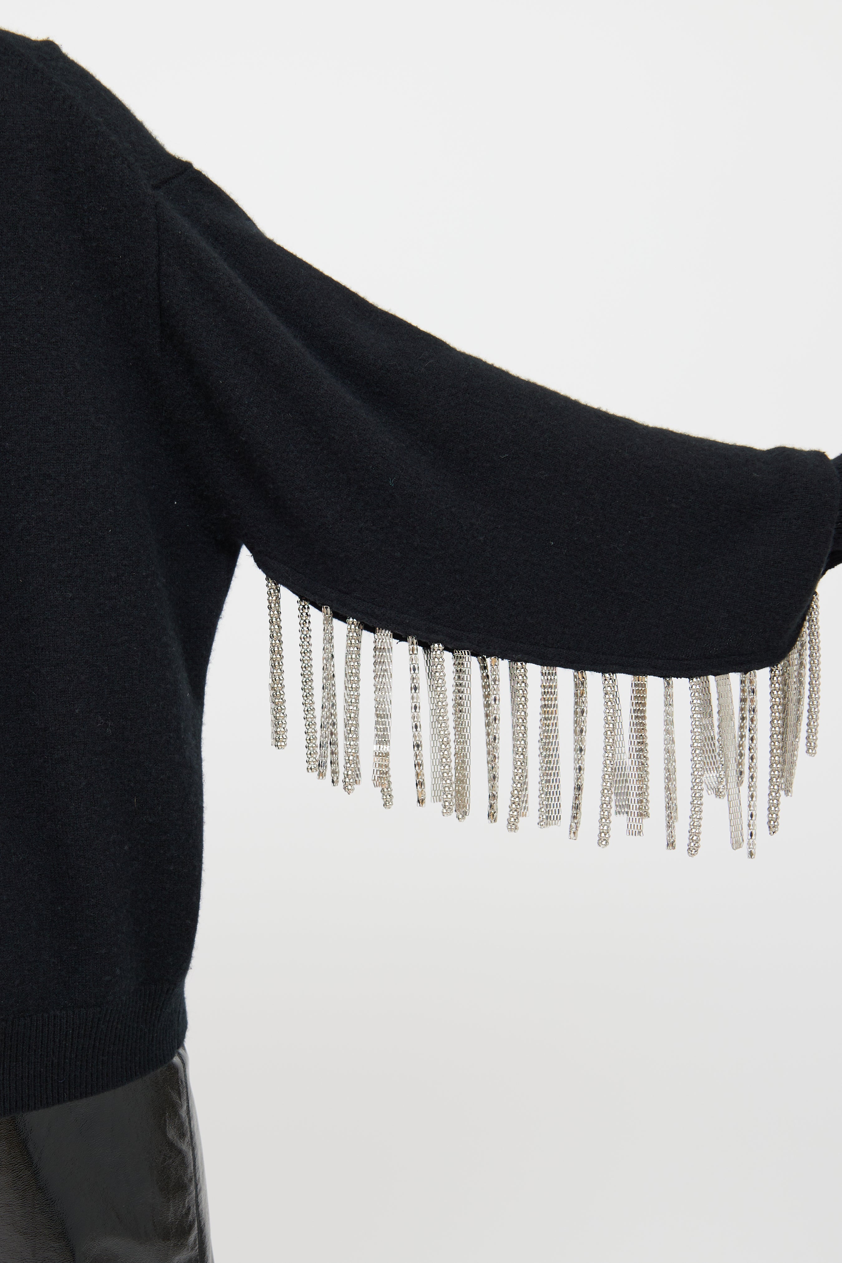 Pre-owned Christopher Kane black chain fringe knitted wool blend sweater featuring a high neck collar, full length sleeve with silver tone chain link fringe detailing, button cuffs, and ribbed hemming throughout.
