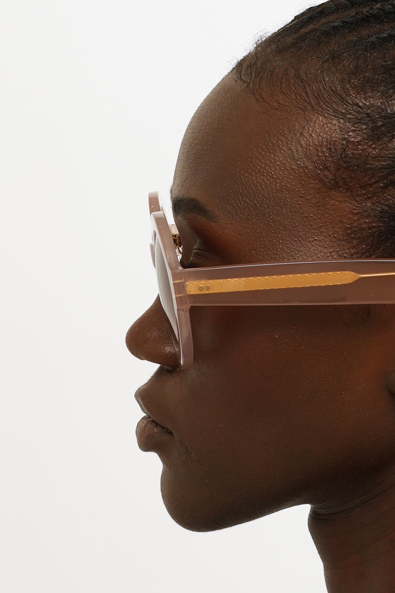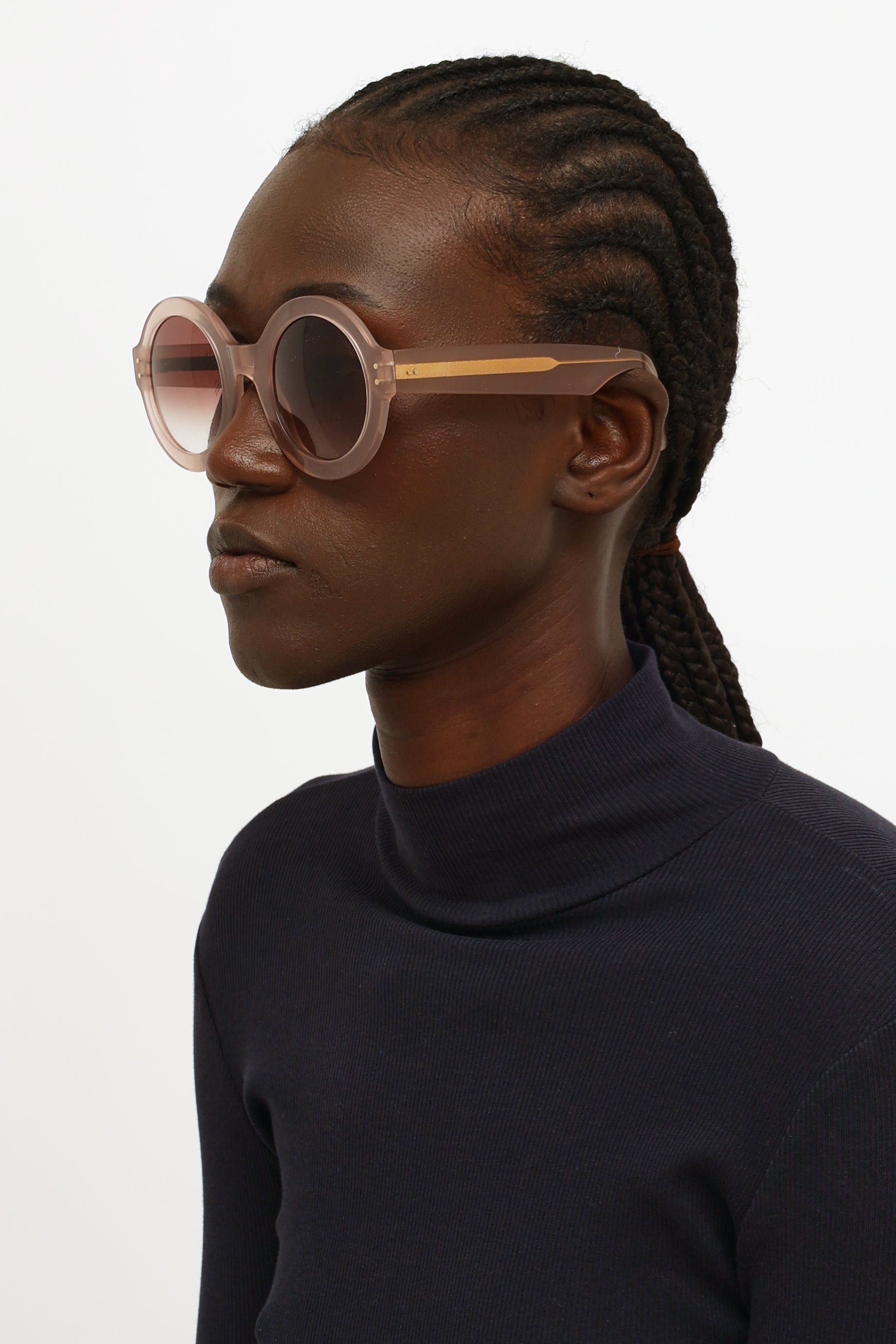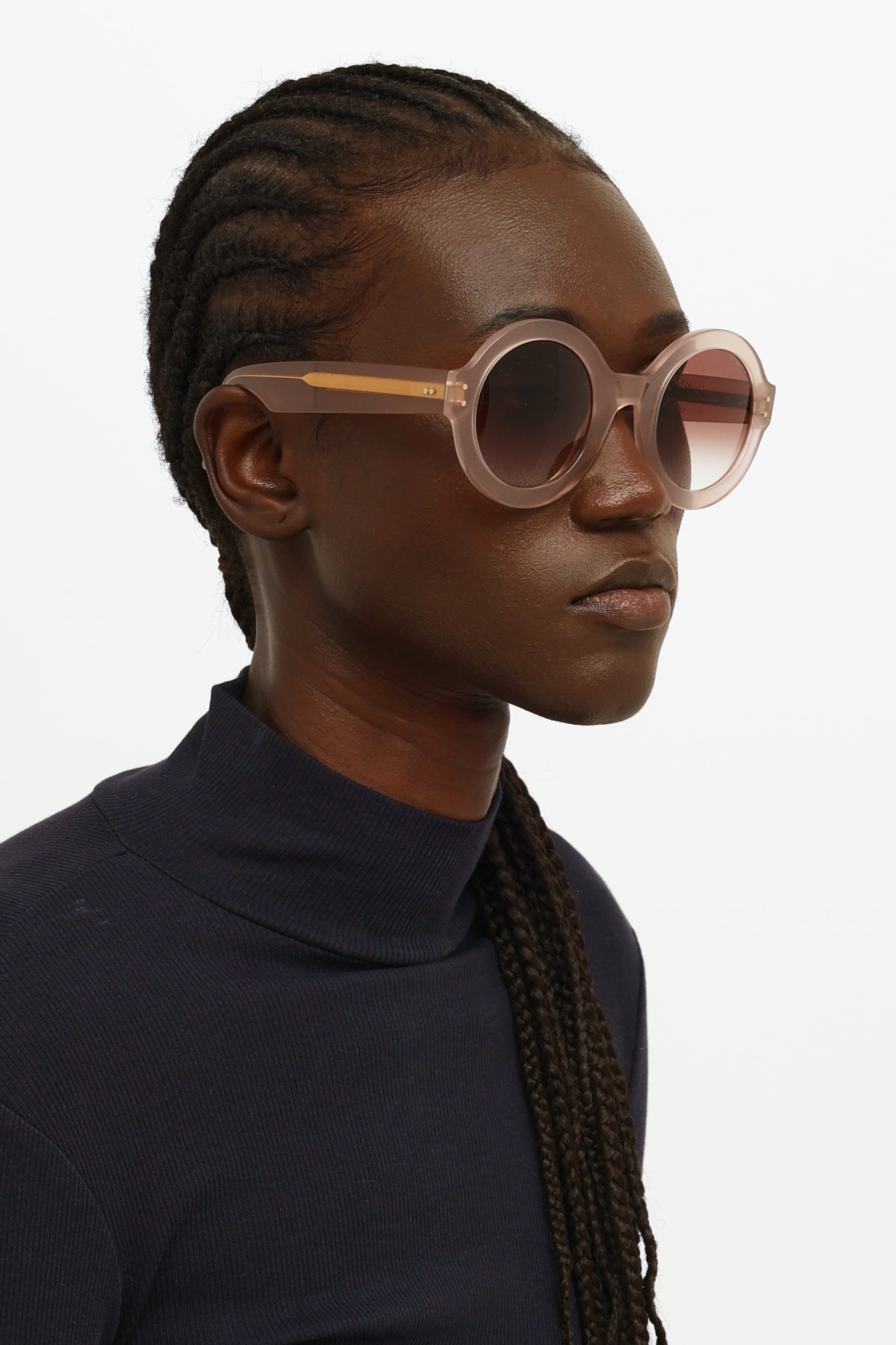 Pre-owned Cutler & Gross pink round sunglasses featuring a round frame, pink translucent rims, brown tinted gradient lenses, tonal temples with gold tone detailing and a saddle bridge.