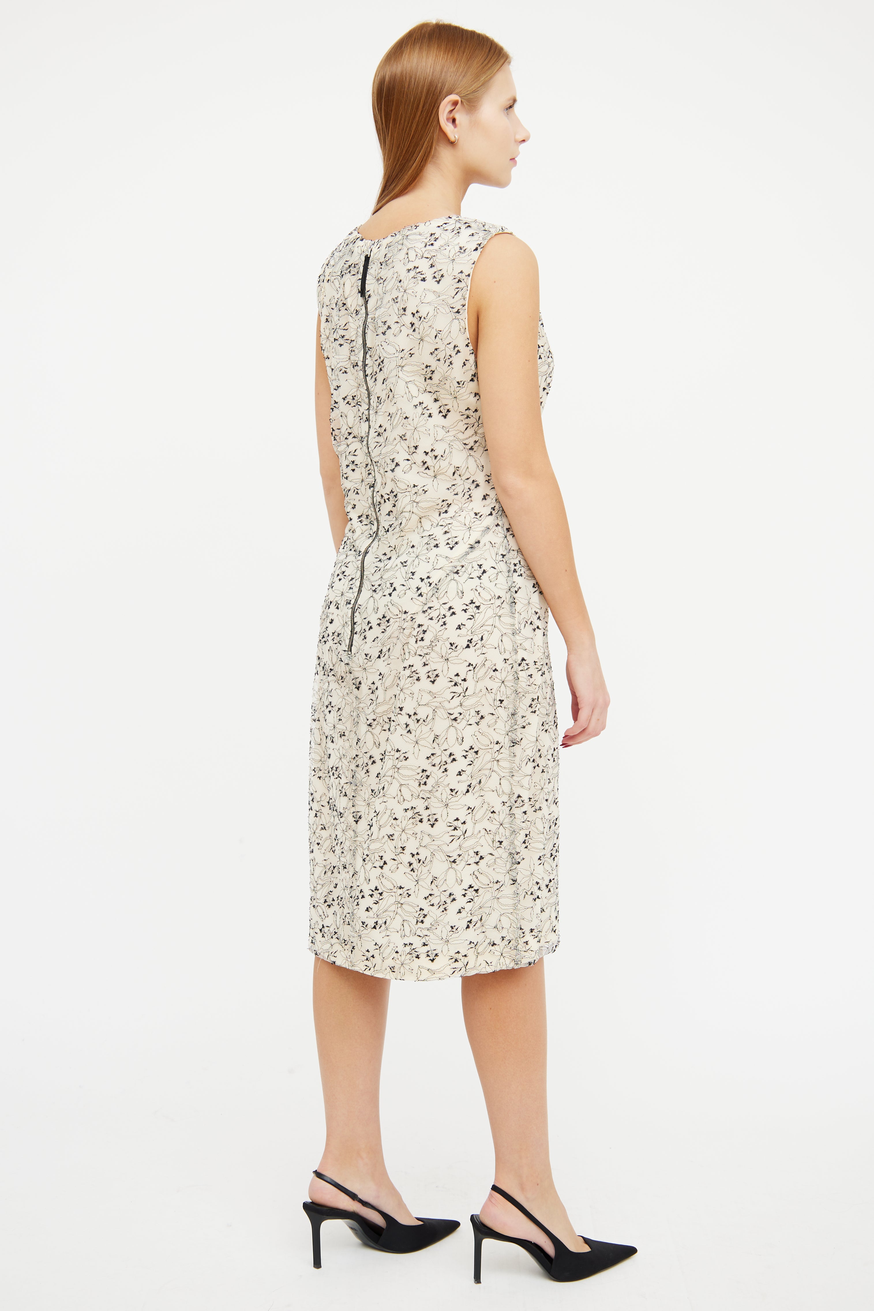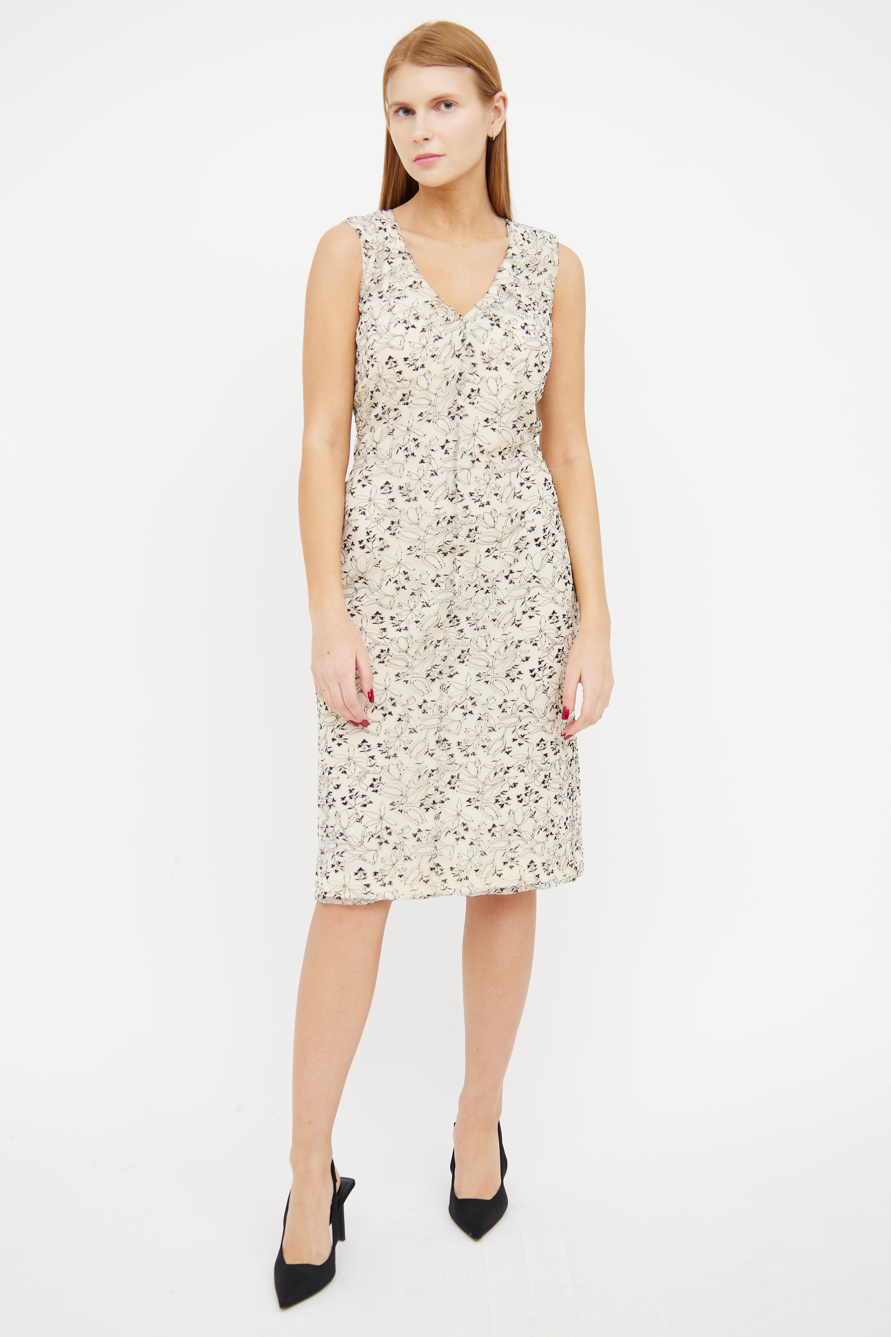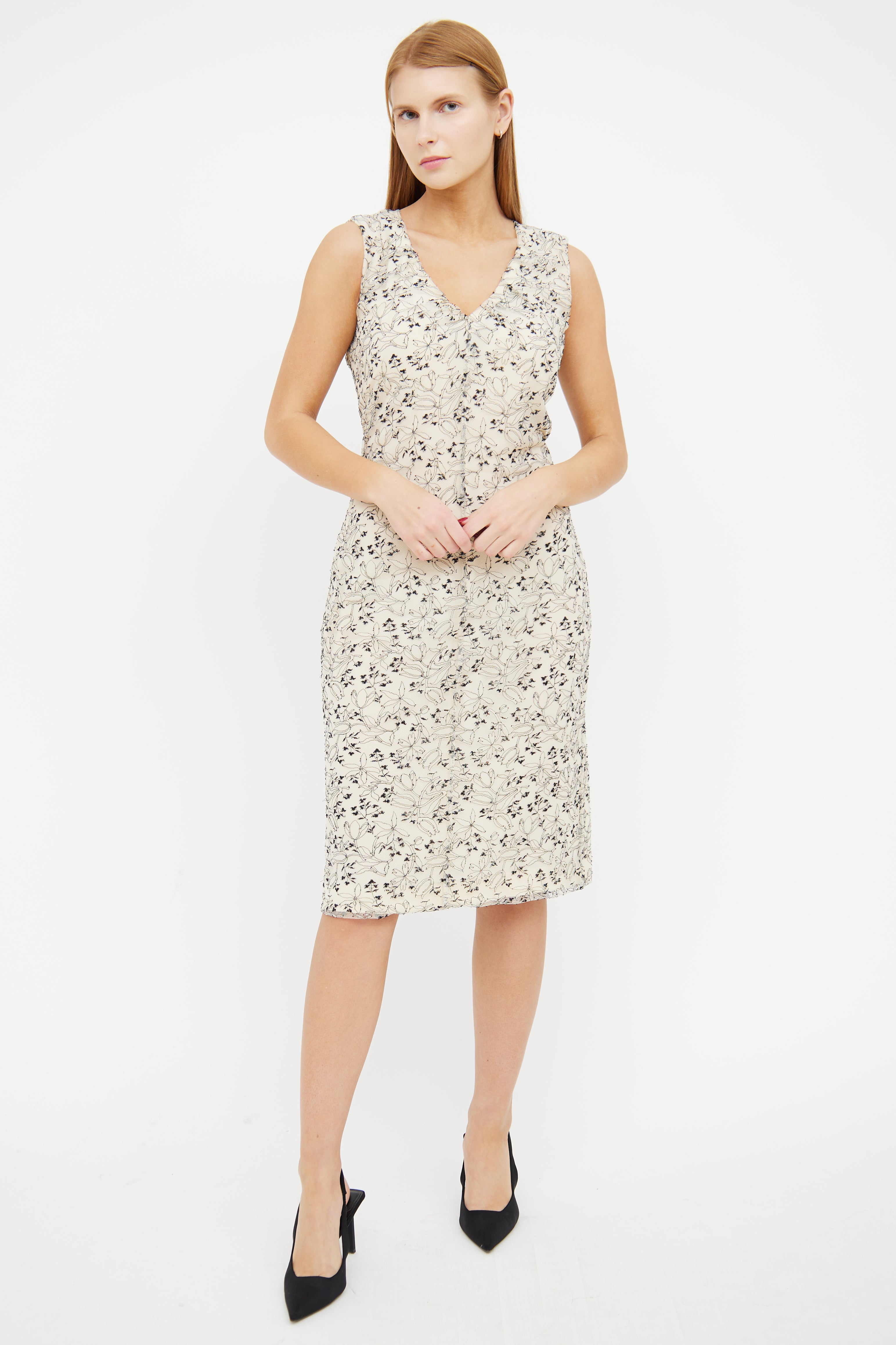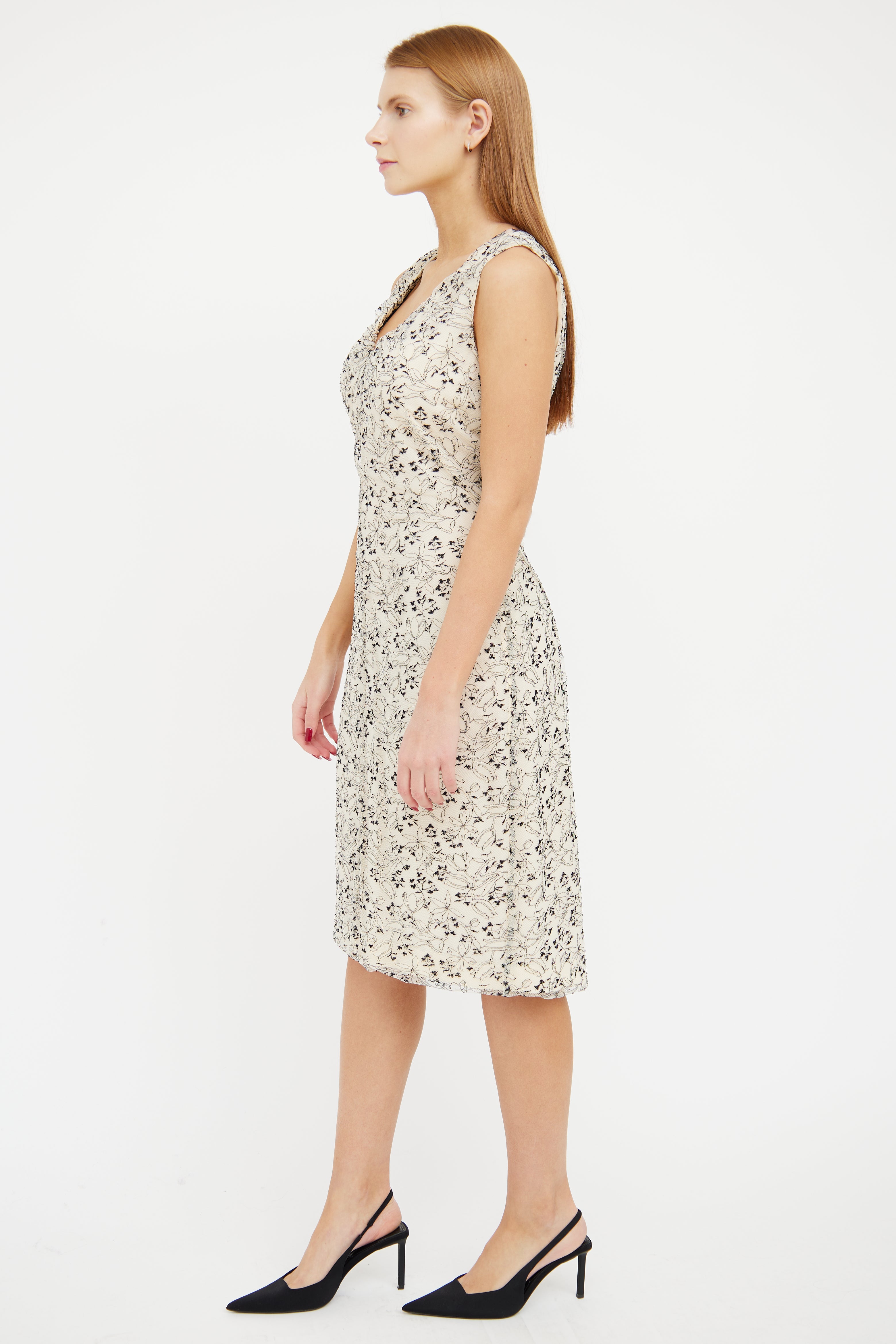 Pre-owned Dolce & Gabbana cream and Black floral lace overlay dress featuring a V neckline, sleeveless, lace floral overlay, and a back zip closure. Lined.
