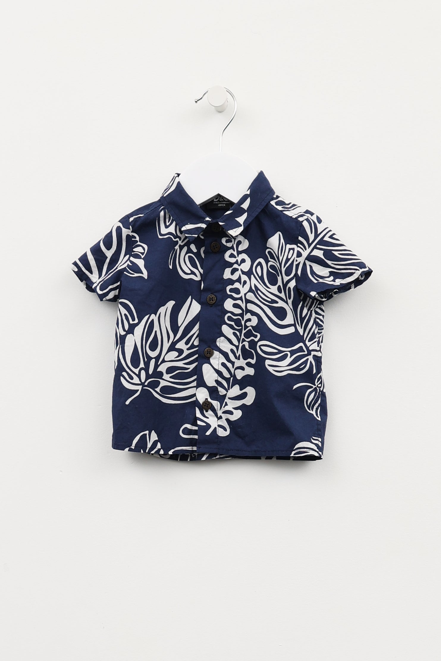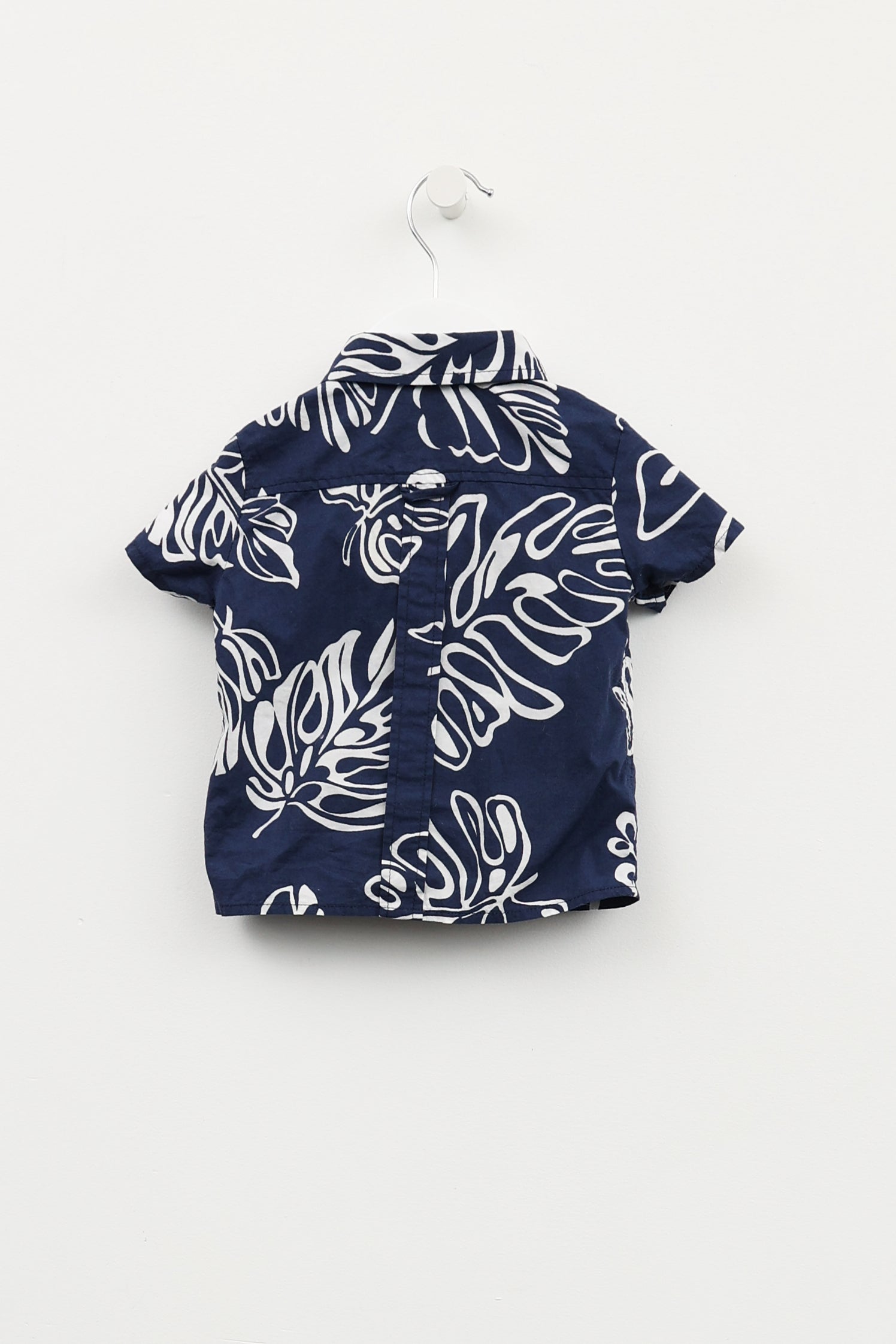 Pre-owned Dolce & Gabbana Junior Kids navy print top featuring a collar, button down closure, tropical white print, and short sleeves.