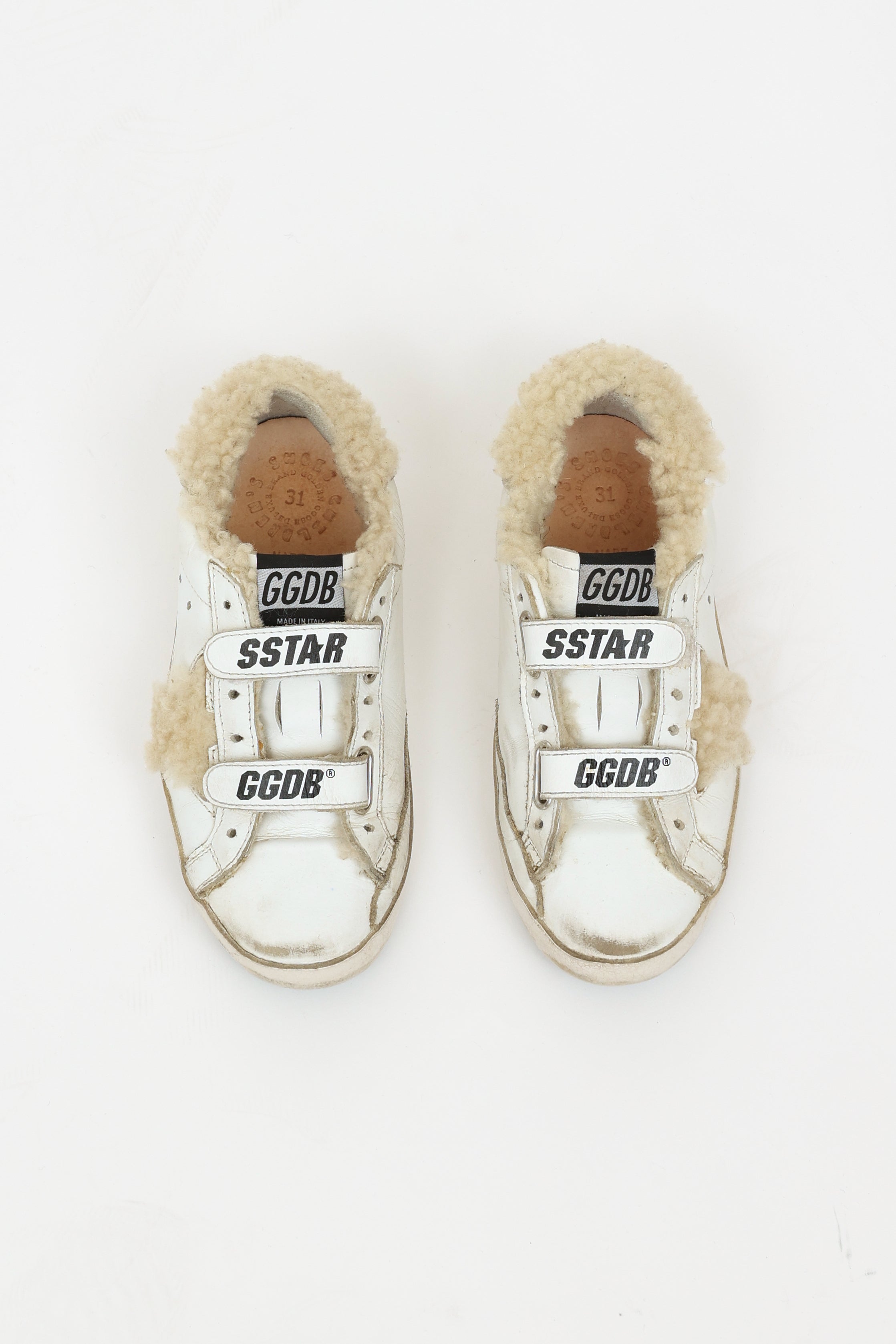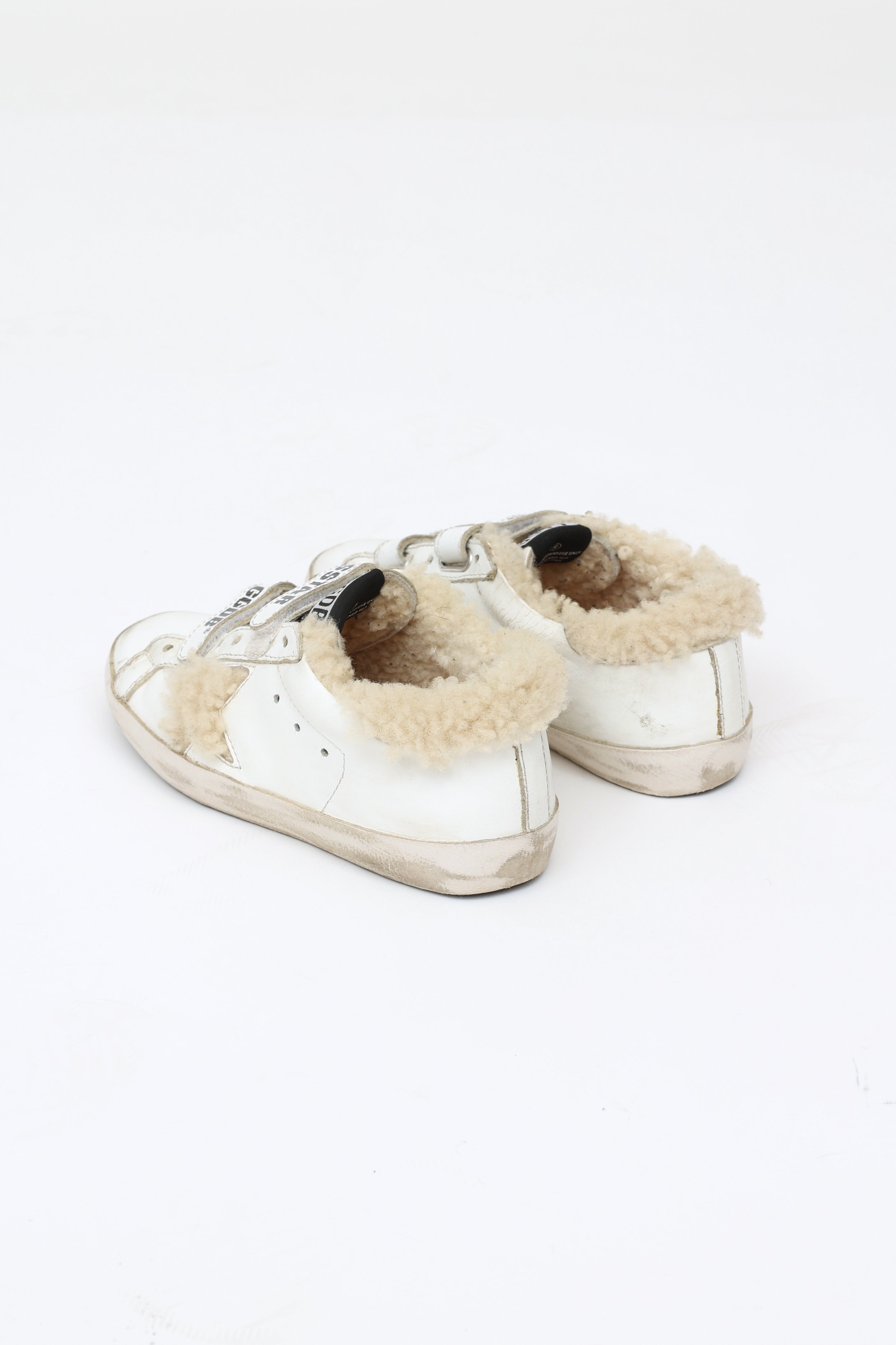 Pre-owned Golden Goose white kids sneaker featuring shearling lining, double velcro closure with black graphic lettering, shearling star at sides.