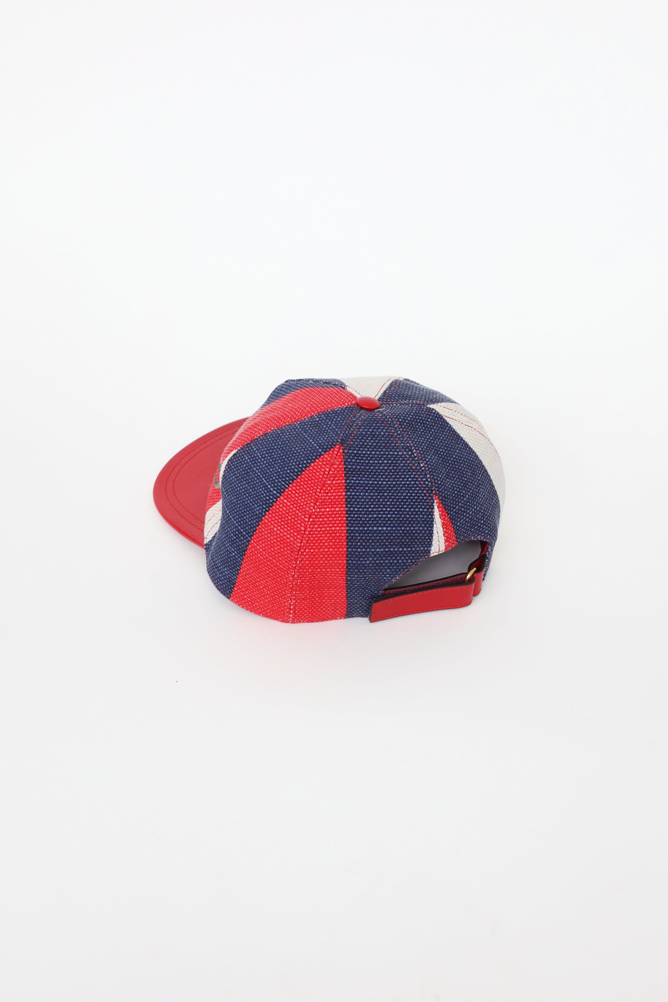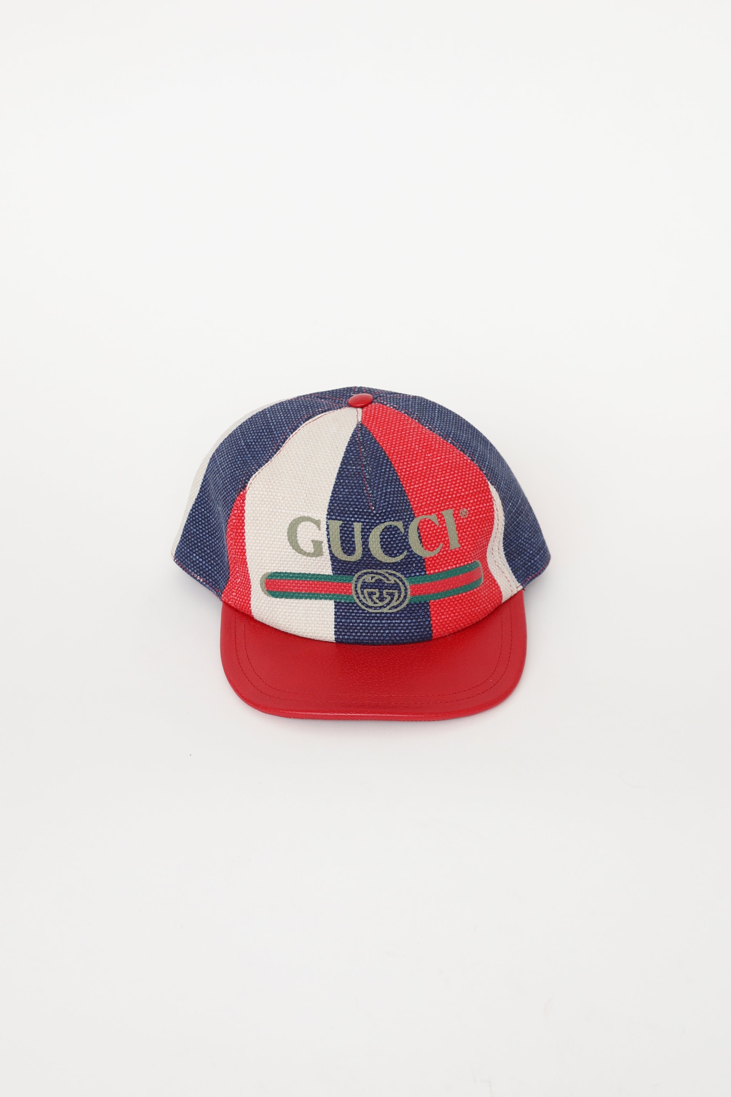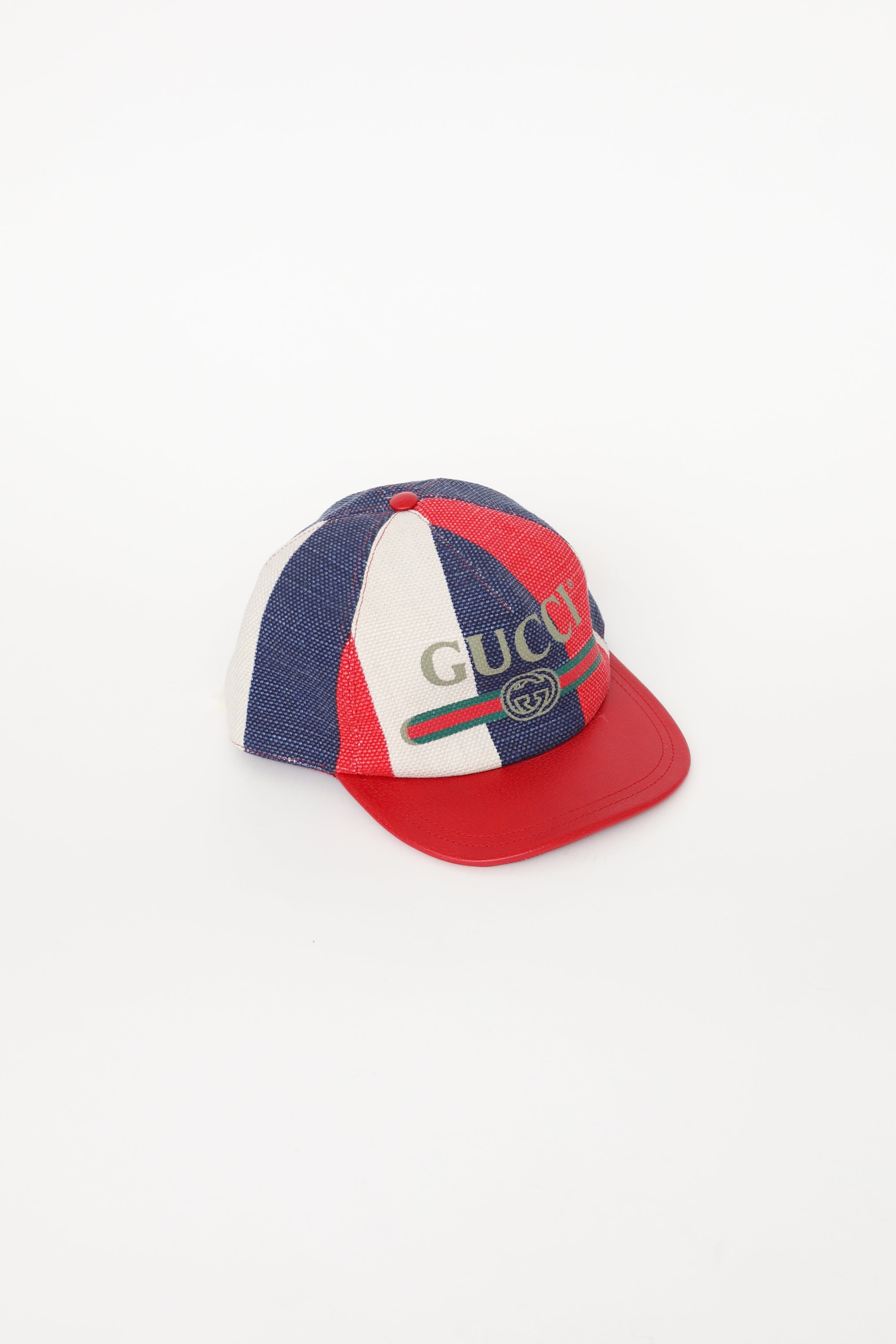 Pre-owned Gucci red, blue and red striped woven baseball hat featuring red leather visor and printed brand logo at front, velcro adjustble strap at back, fully lined.