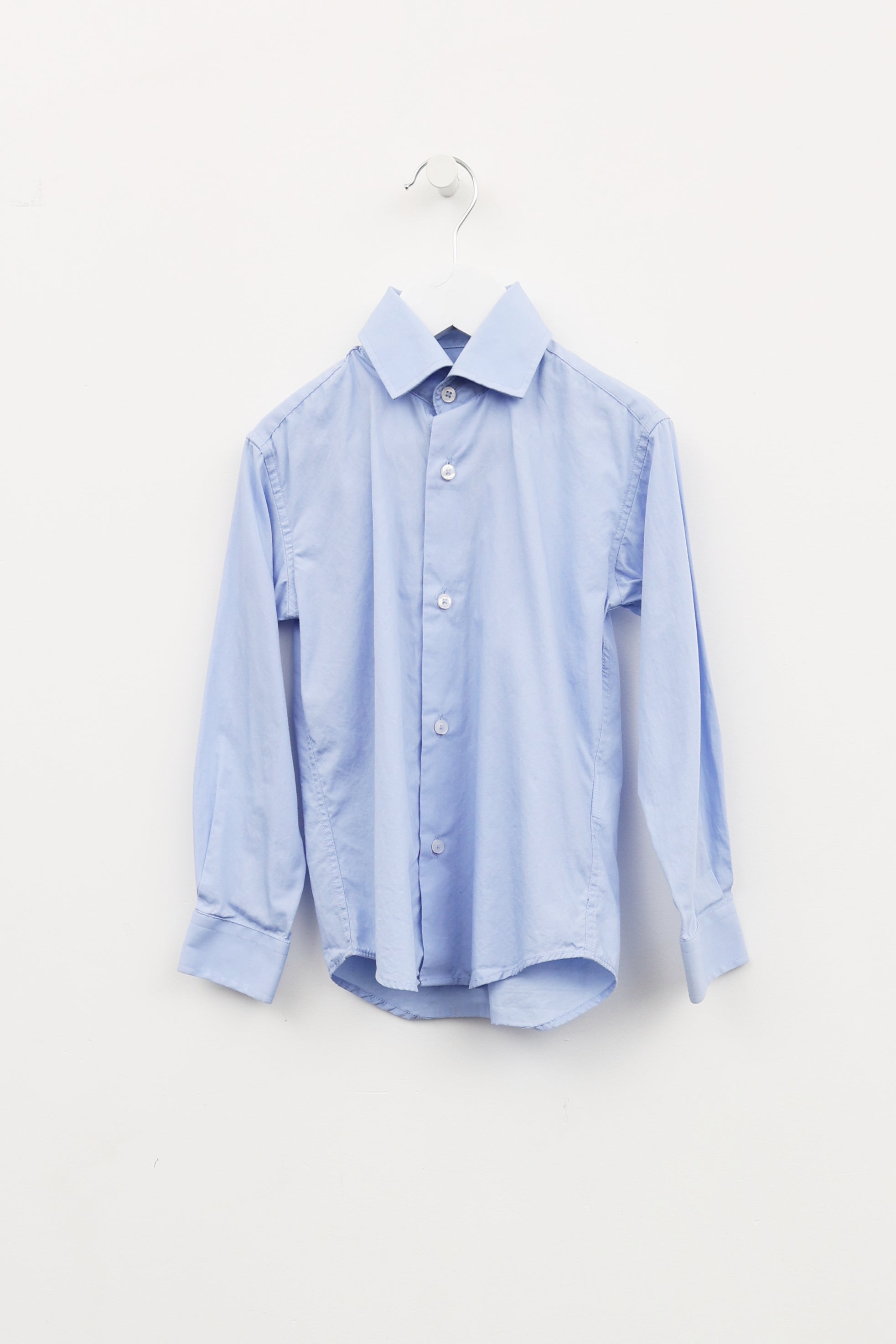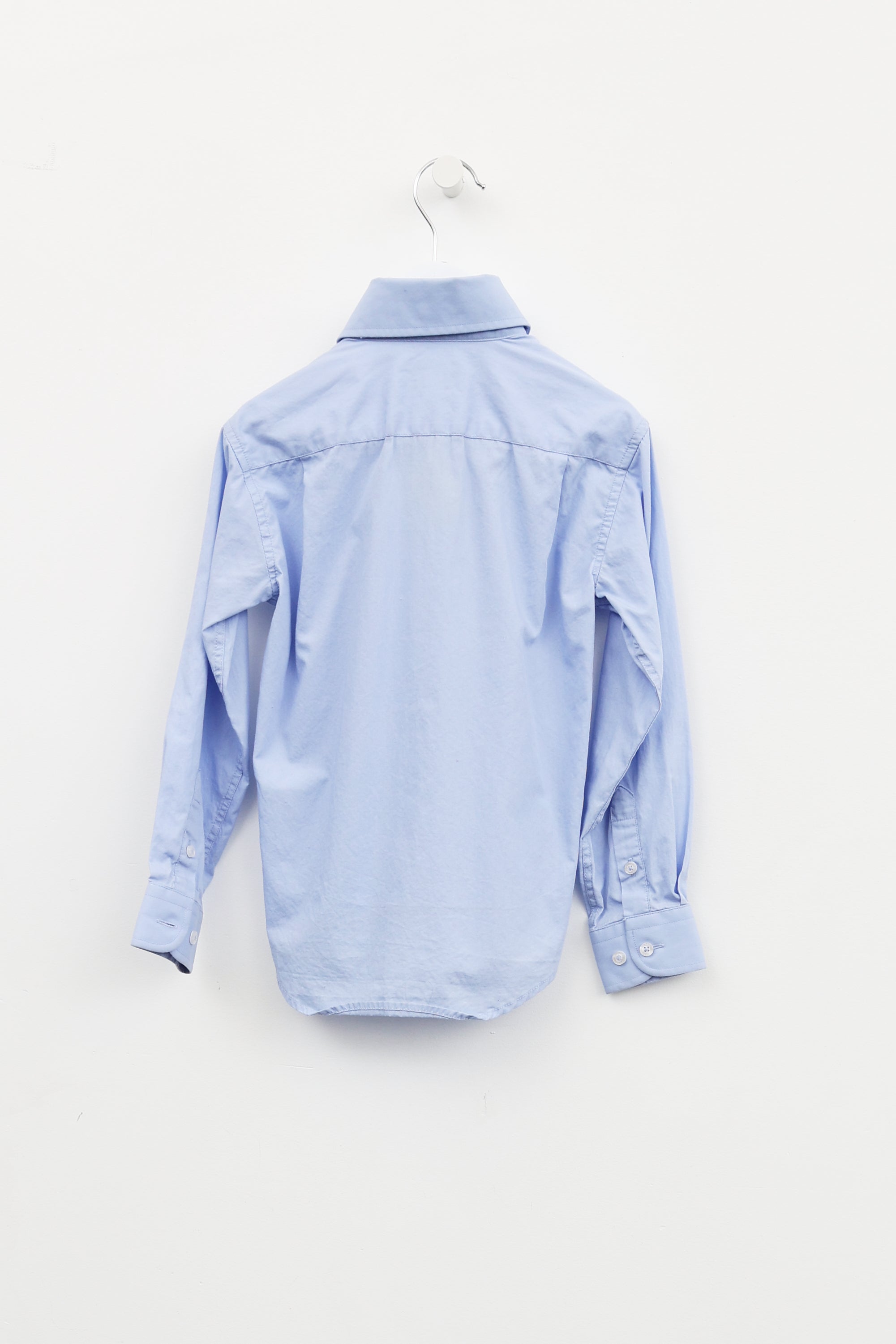 Pre-owned Isaac Mizrahi Kids blue button up shirt featuring a point collar, full length sleeves with buttoned cuffs, button up closure at centre front and yoke at back with dual pleats.