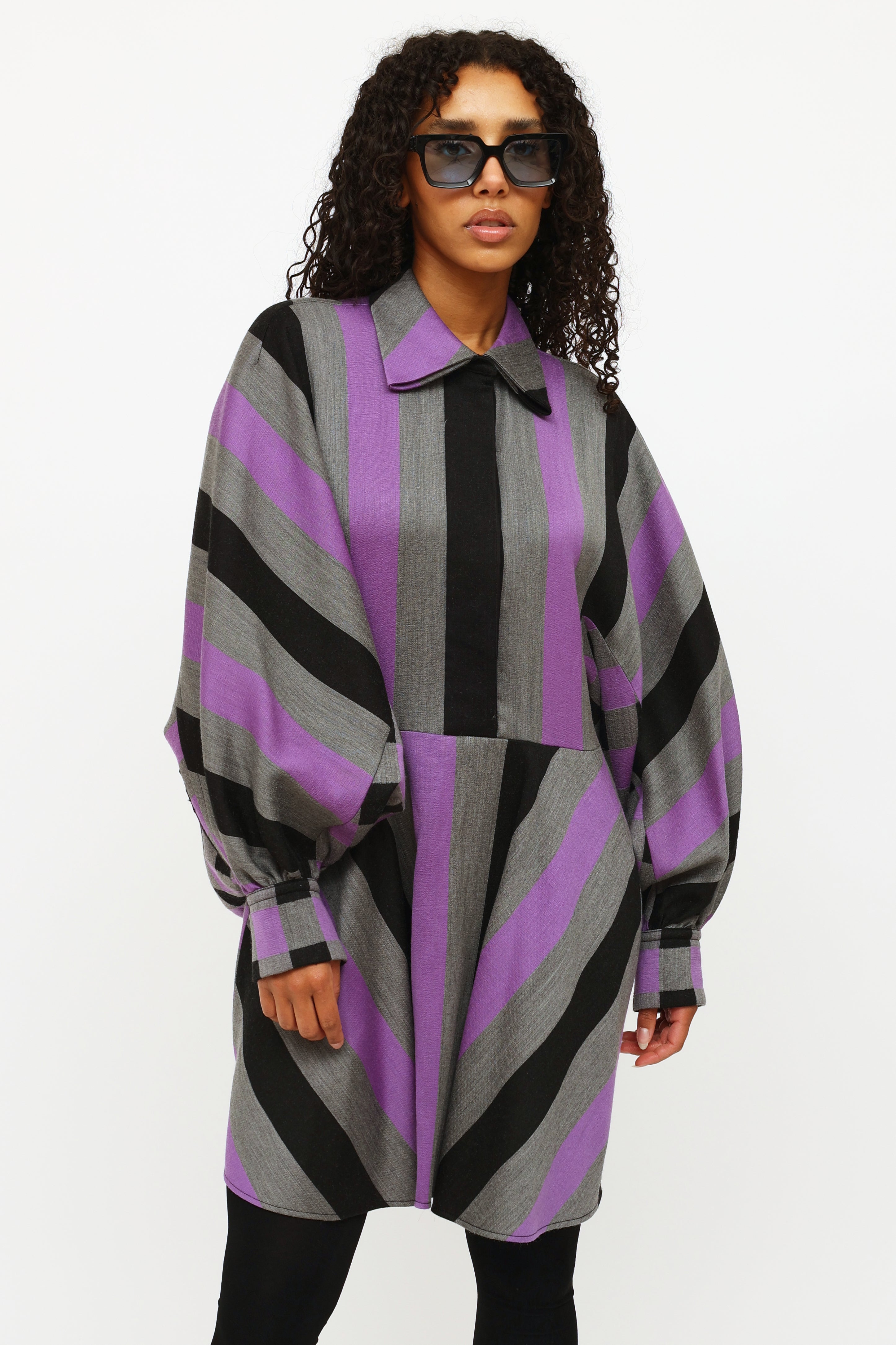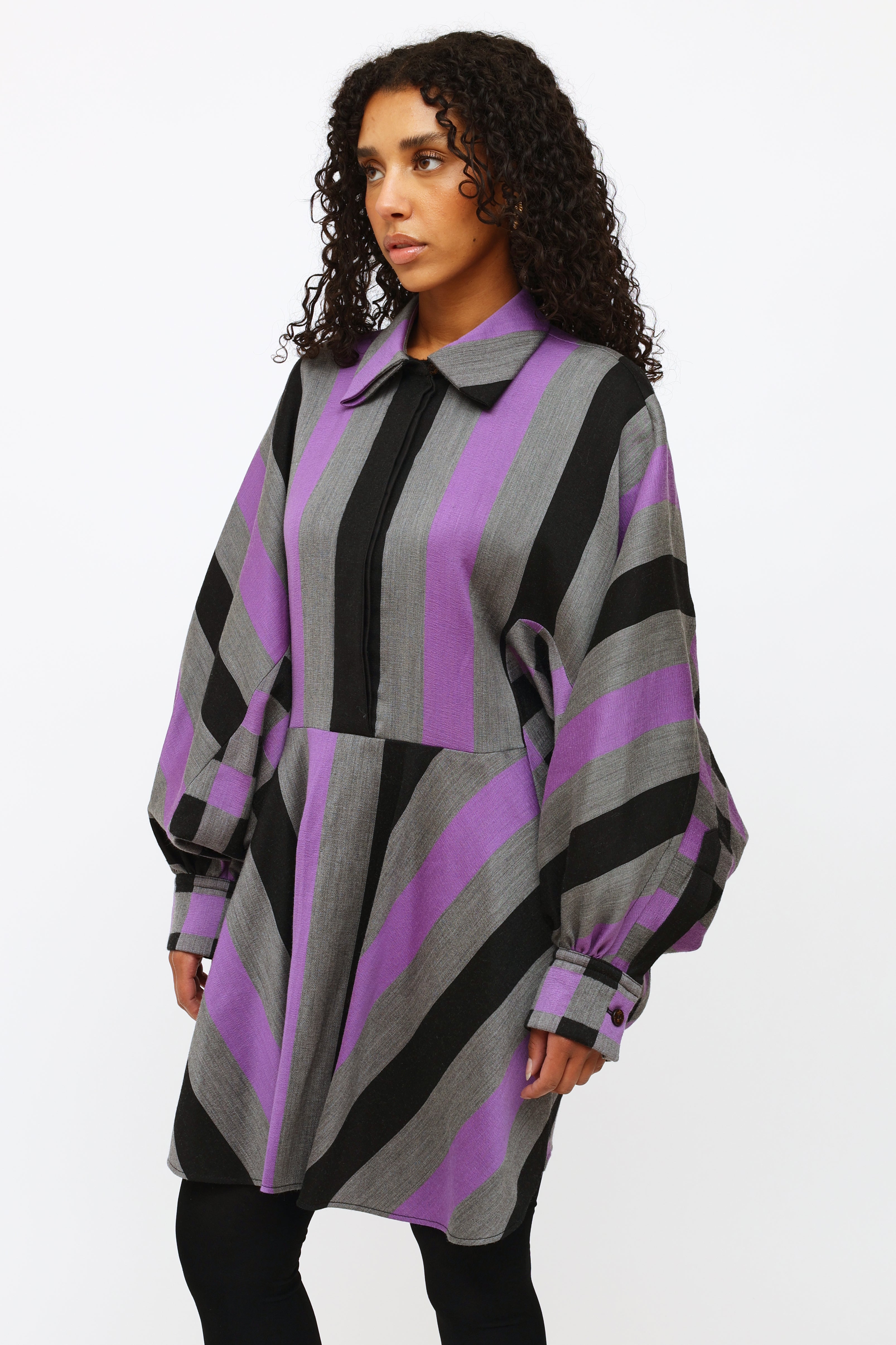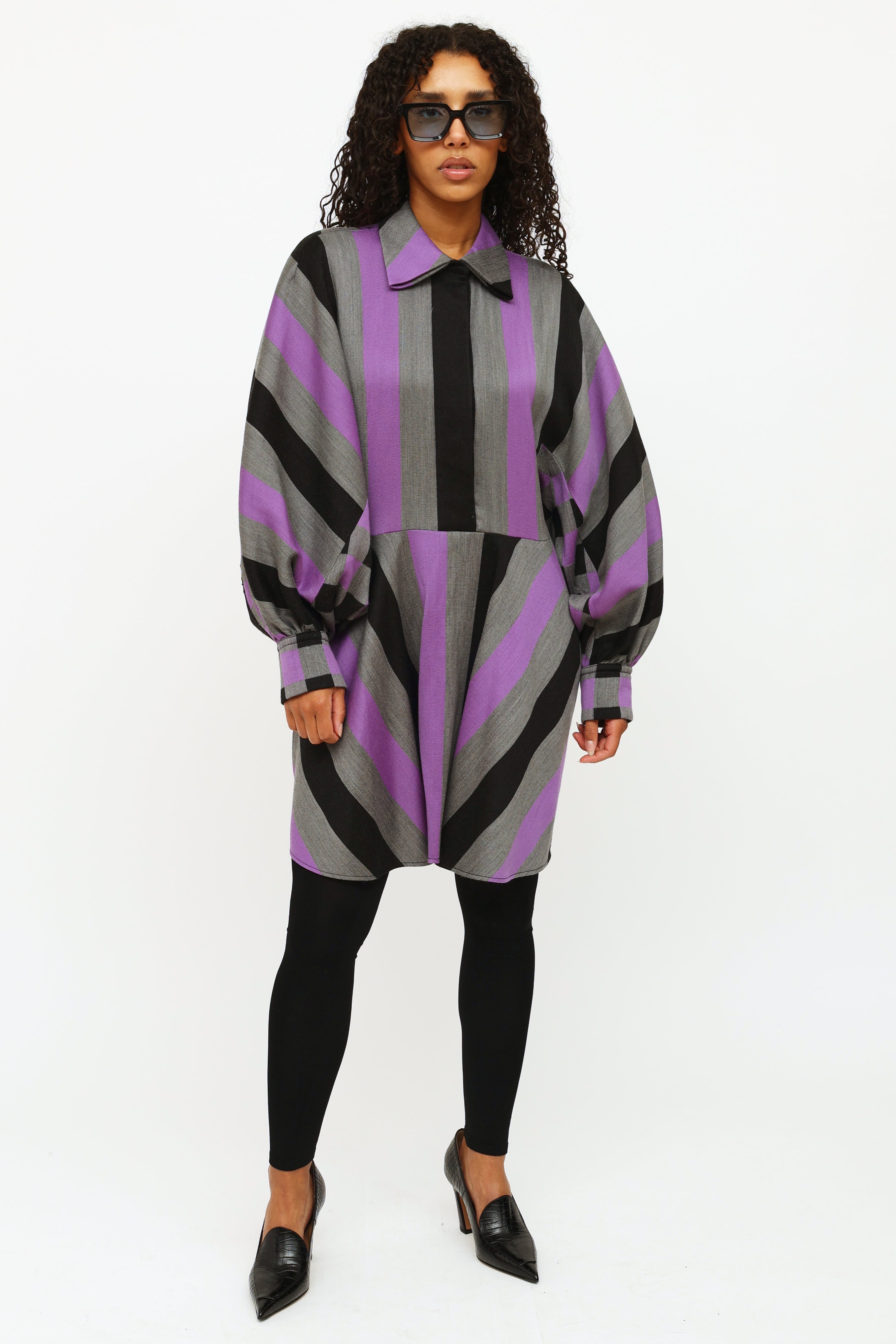 Pre-owned Louis Vuitton 2019 purple, black, and grey striped dress featuring a pointed collar, concealed front button closure, button cuffs with monogram print buttons, wide styled sleeve, asymmetrical cinching at lower back and contrasting checkered pattern at back.