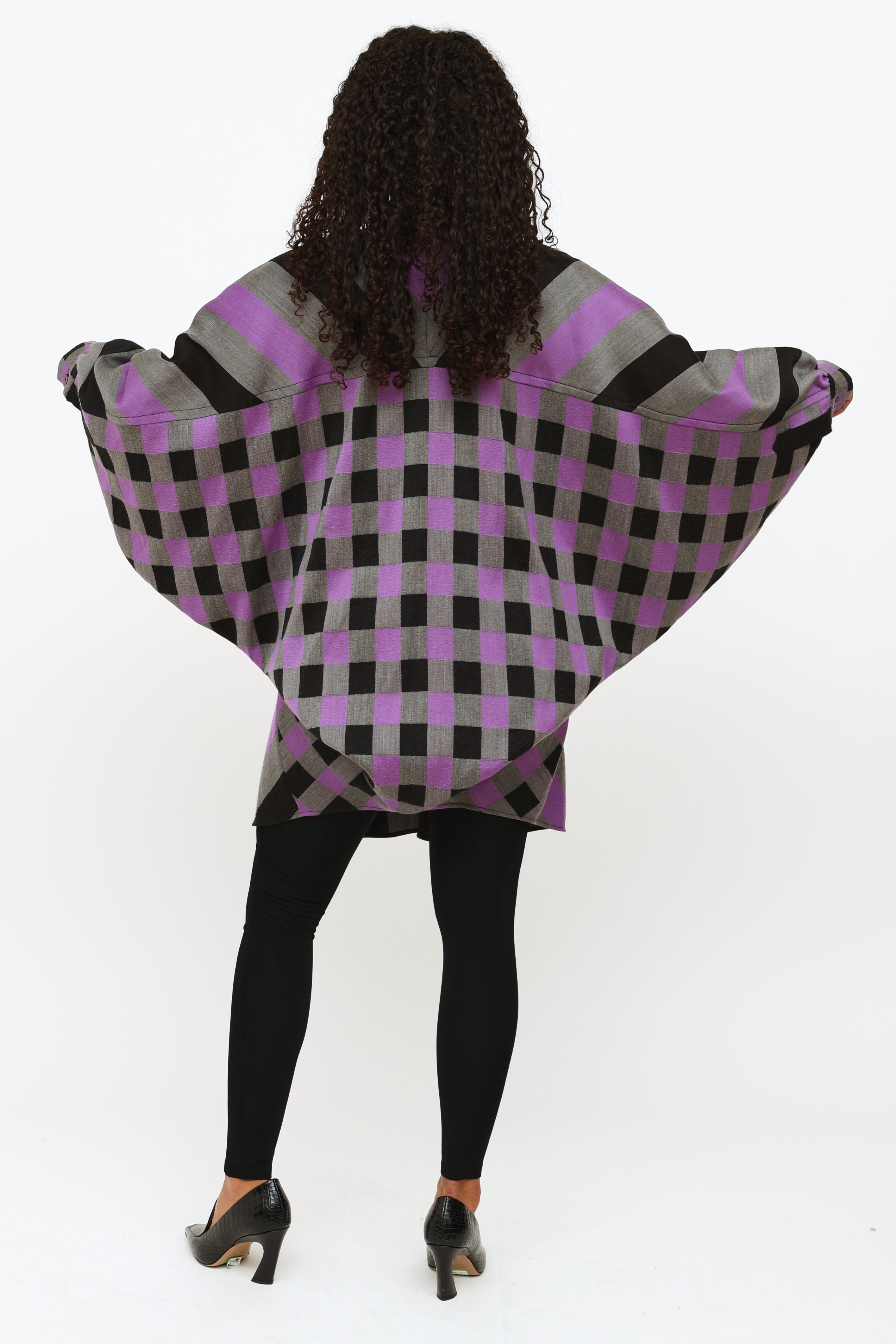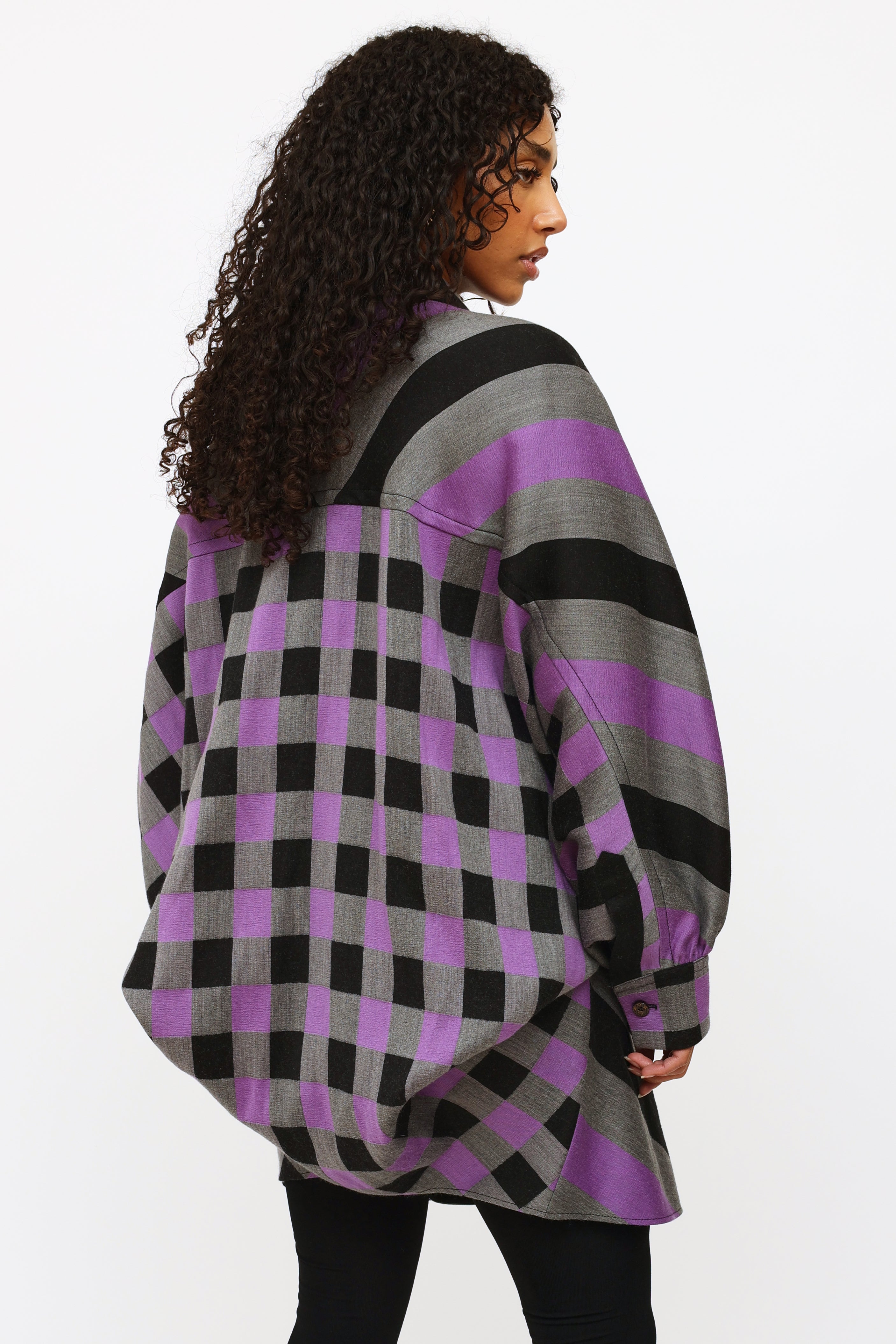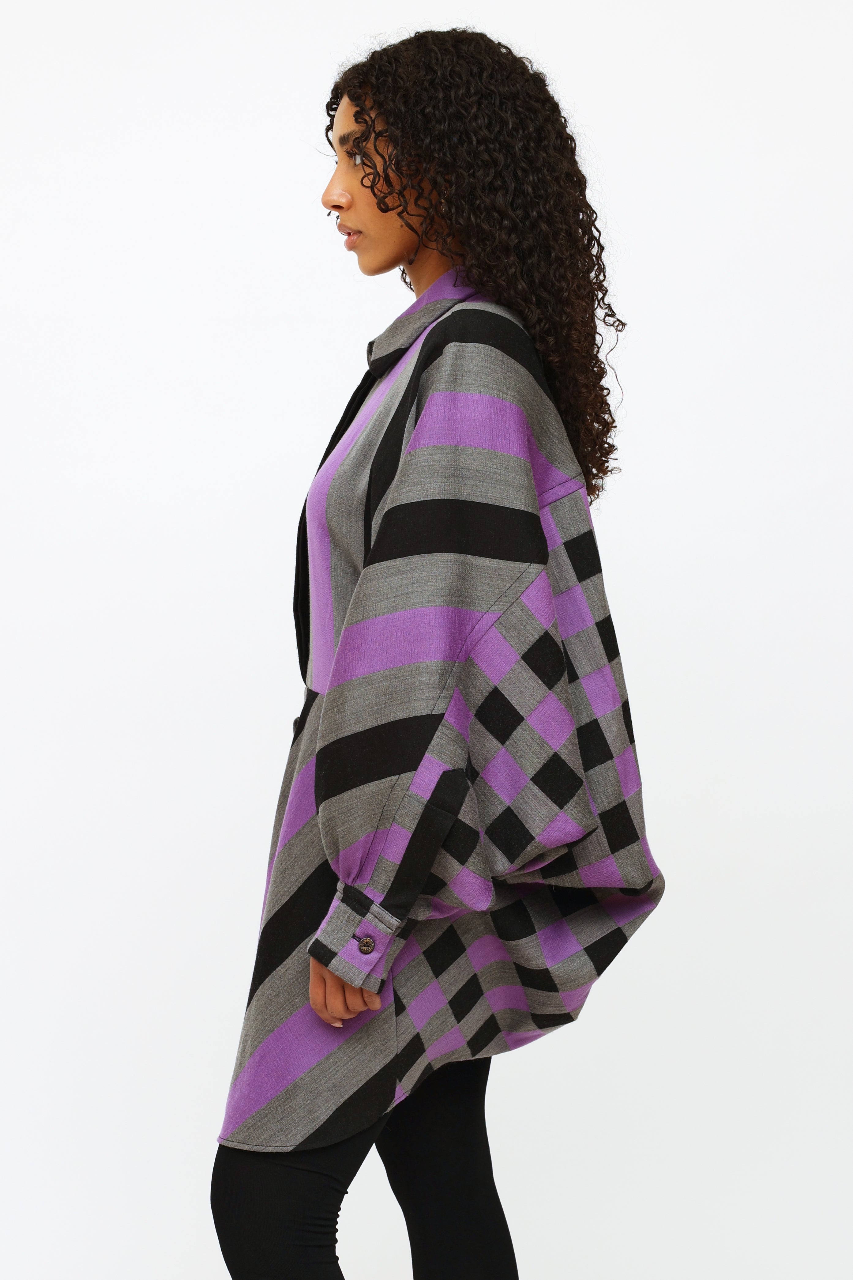 Pre-owned Louis Vuitton 2019 purple, black, and grey striped dress featuring a pointed collar, concealed front button closure, button cuffs with monogram print buttons, wide styled sleeve, asymmetrical cinching at lower back and contrasting checkered pattern at back.
