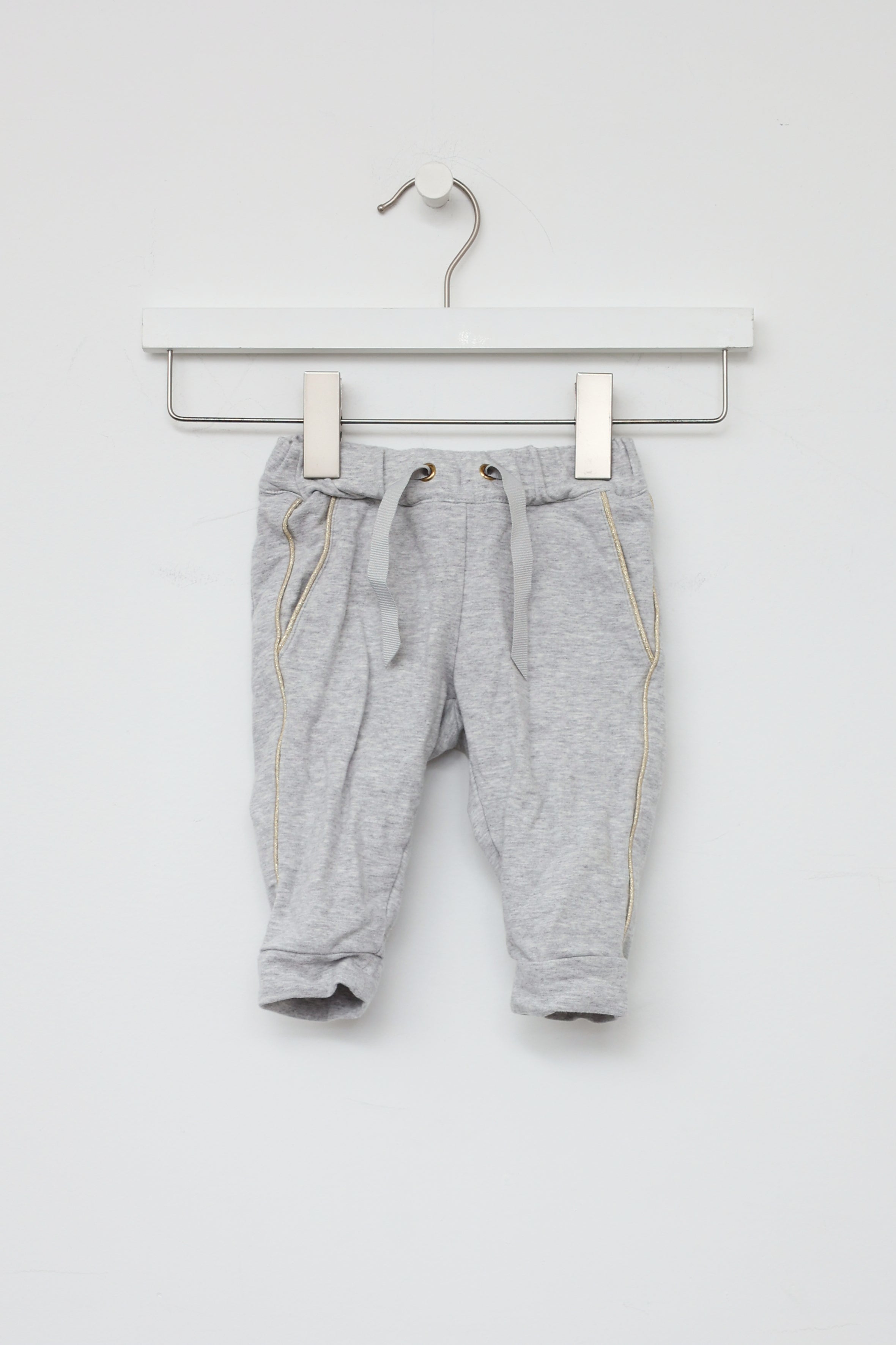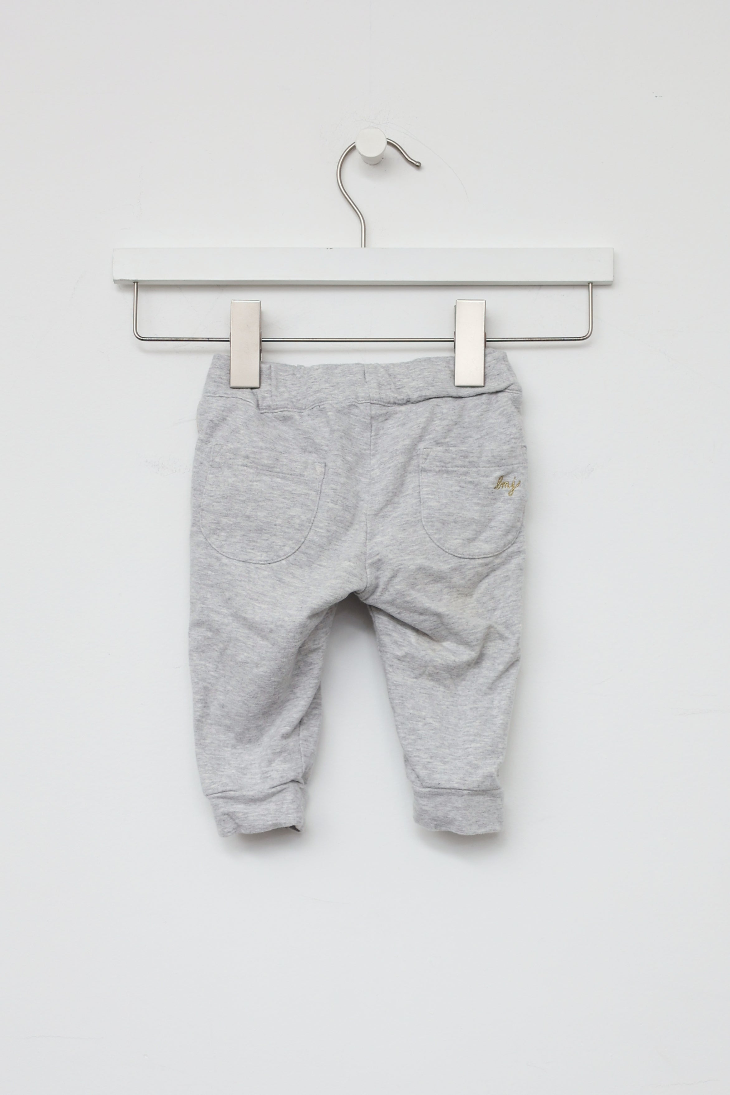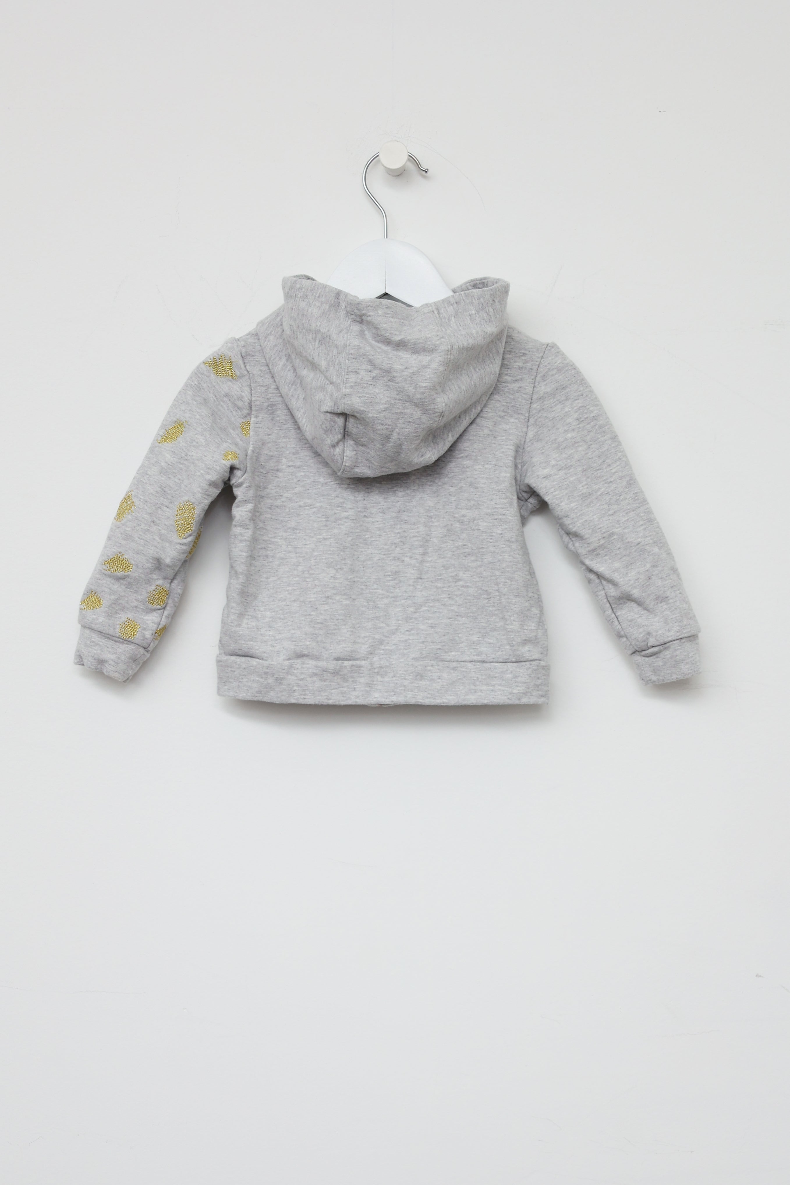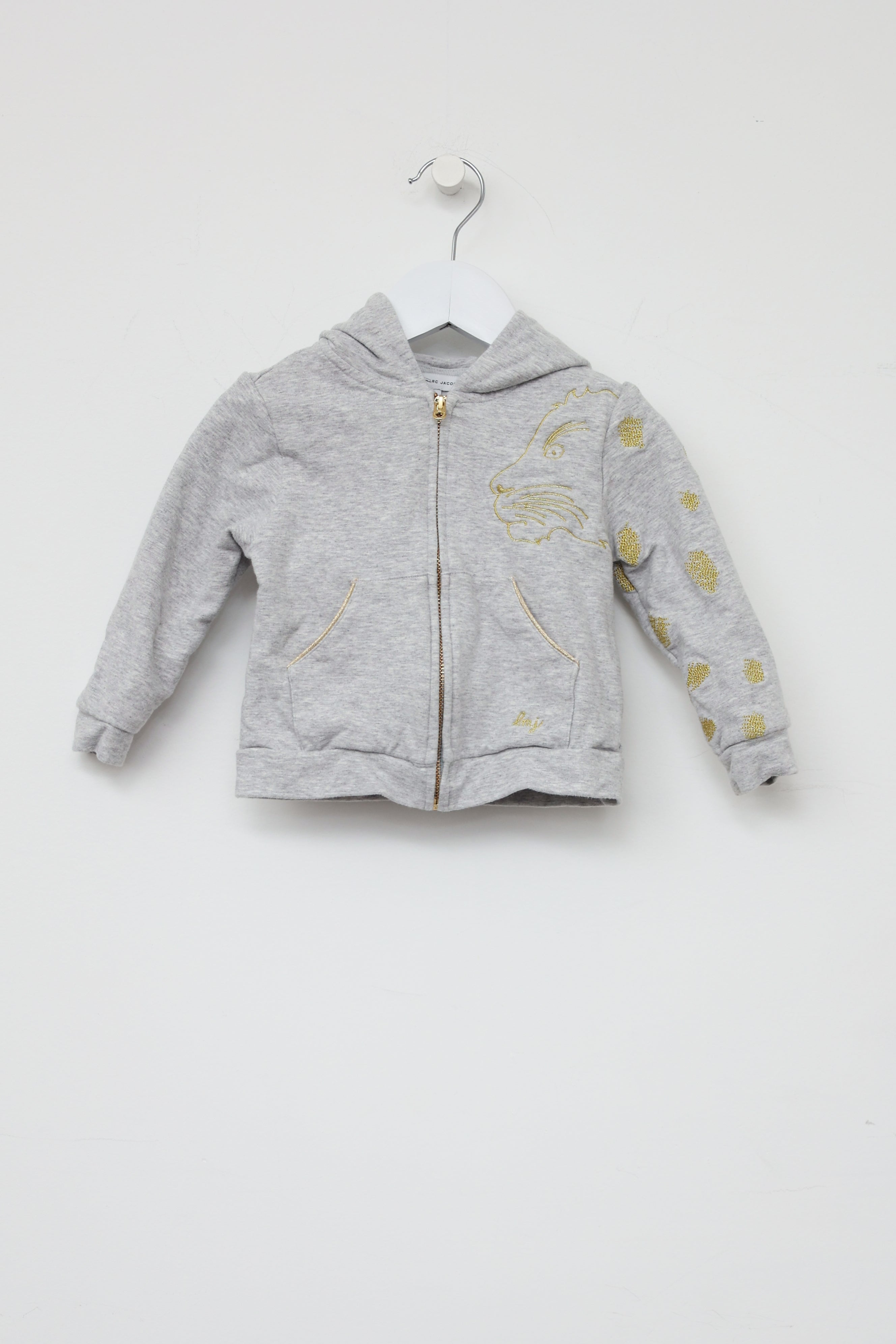 Pre-owned Marc Jacobs Kids grey long-sleeve 2 piece tracksuit, jacket features attached hood, front zipper closure, gold trims and embroidered animal face at front and large polka dot on sleeve, two front pockets. Pants features gold trim, ribbon-tie elasticated waist, two front pockets. Gold-tone hardware.