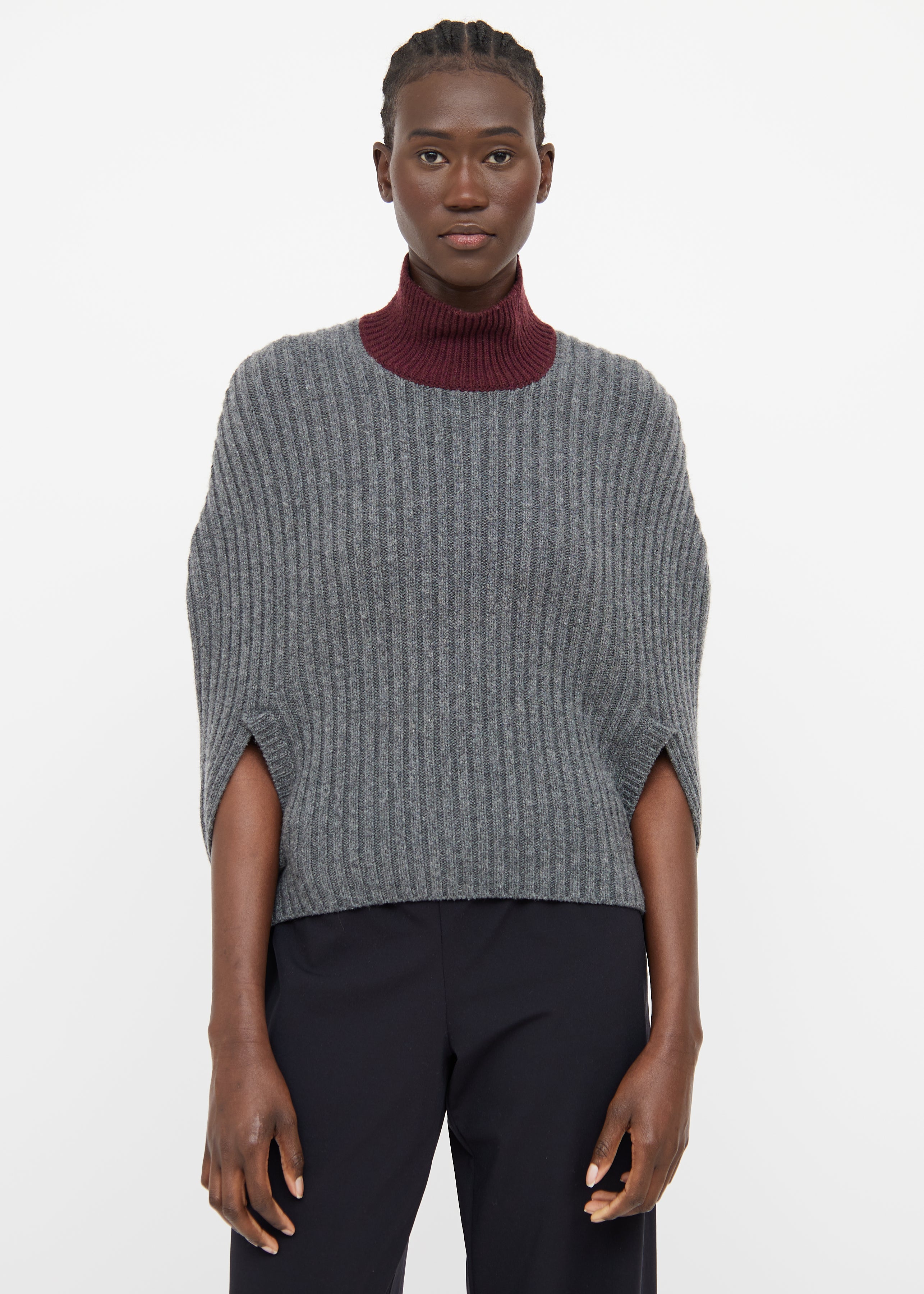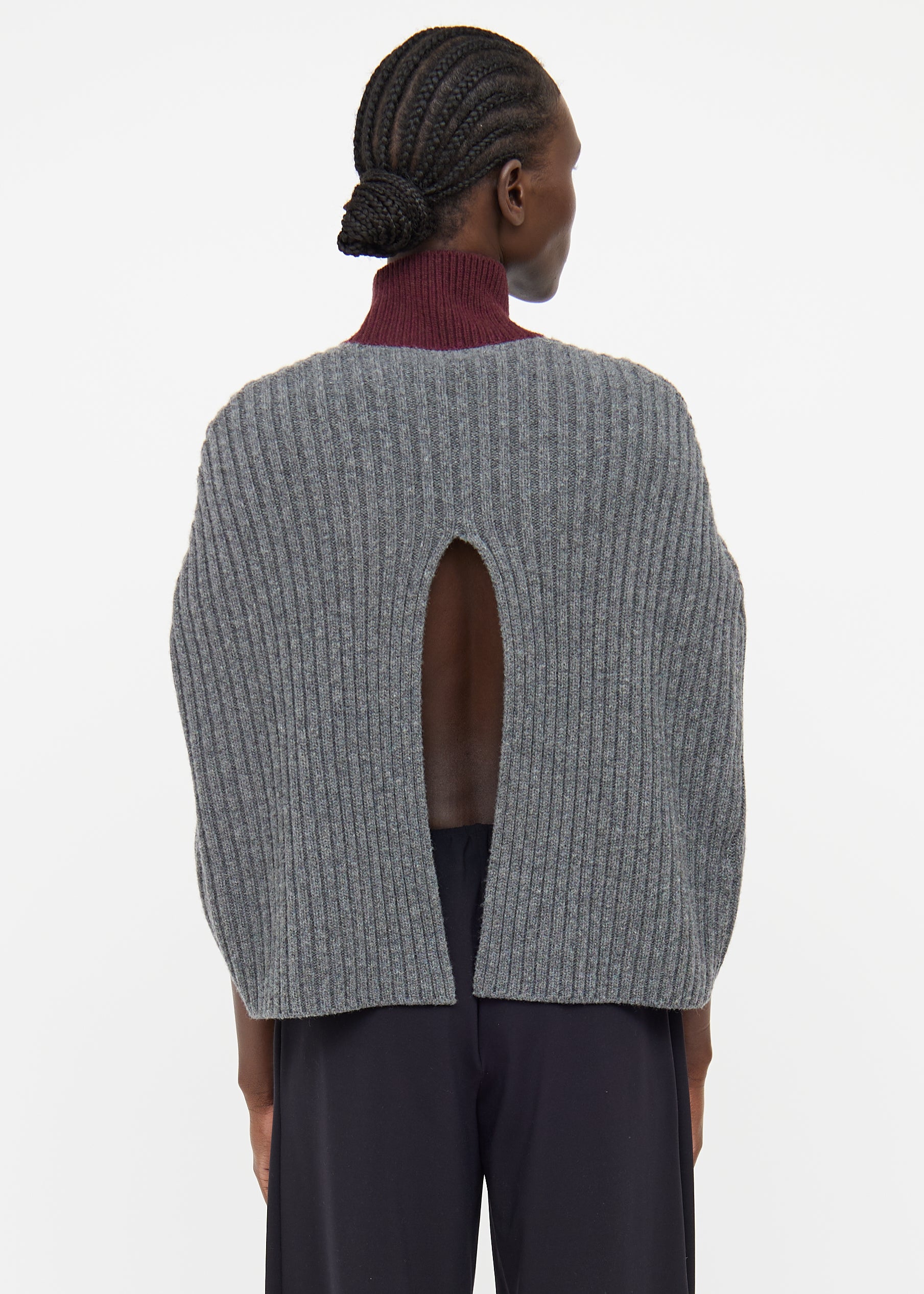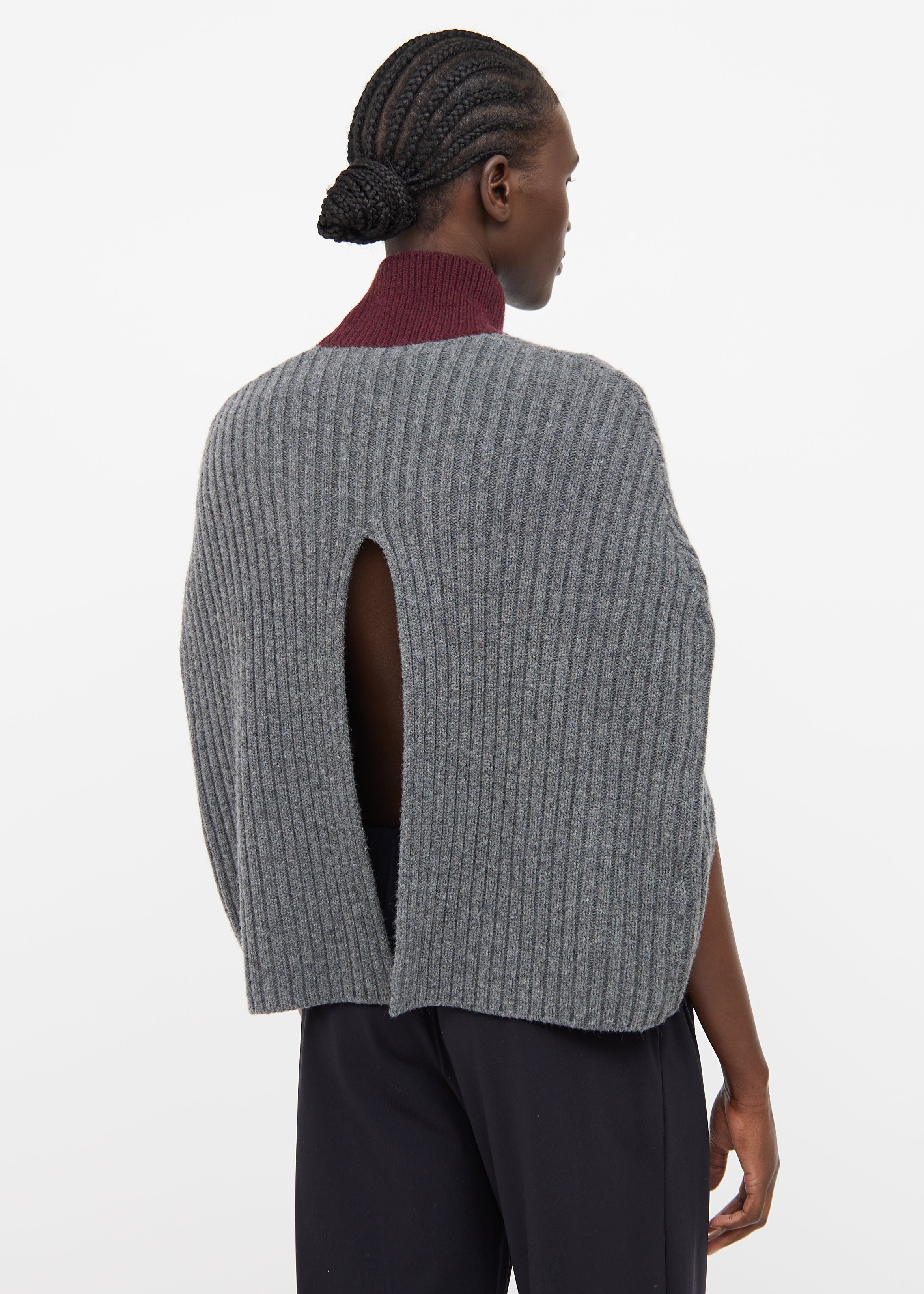 Pre-owned Marni grey and burgundy wool blend poncho featuring a burgundy turtle neck, ribbed detailing throughout, and a centre back cutout.