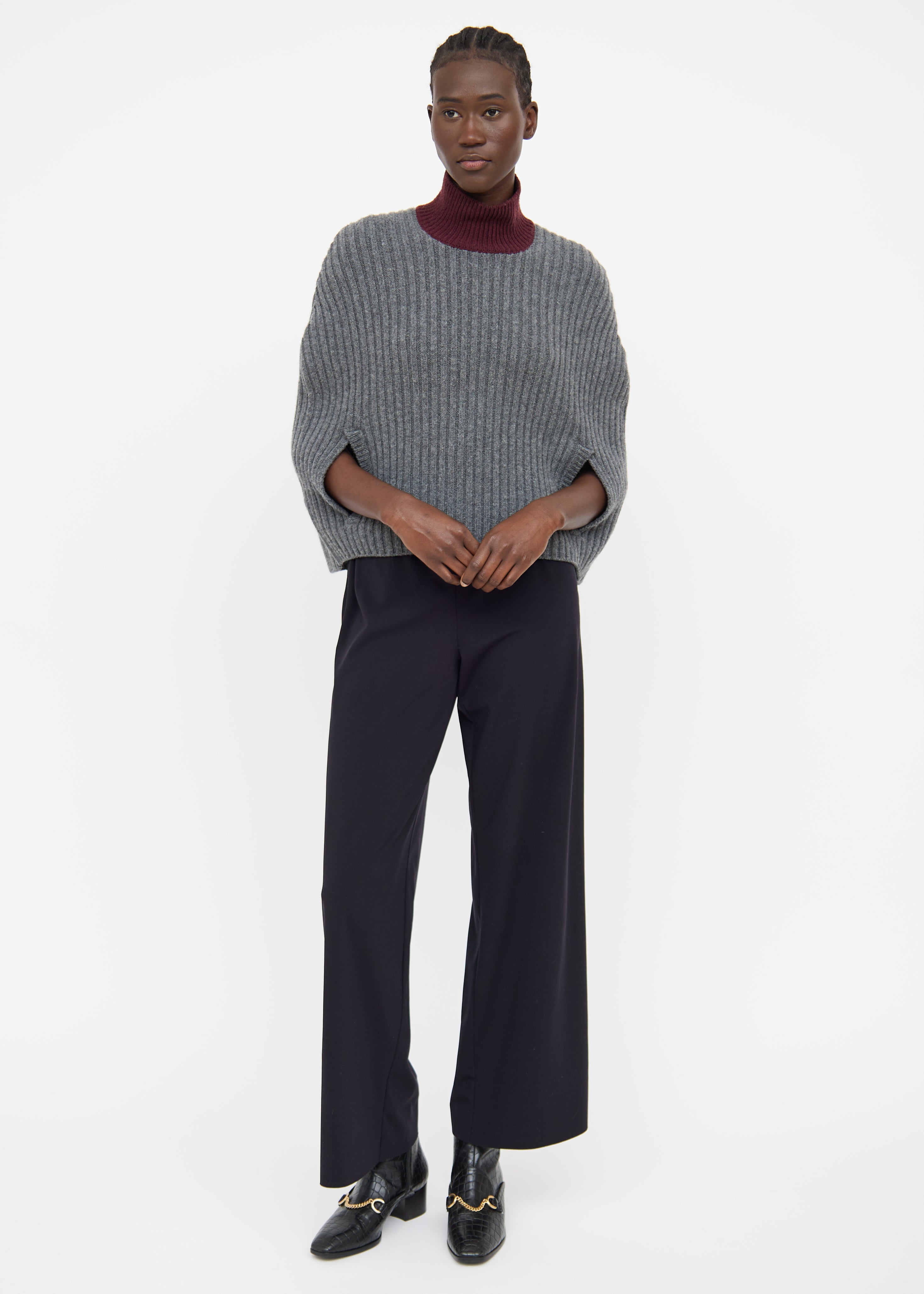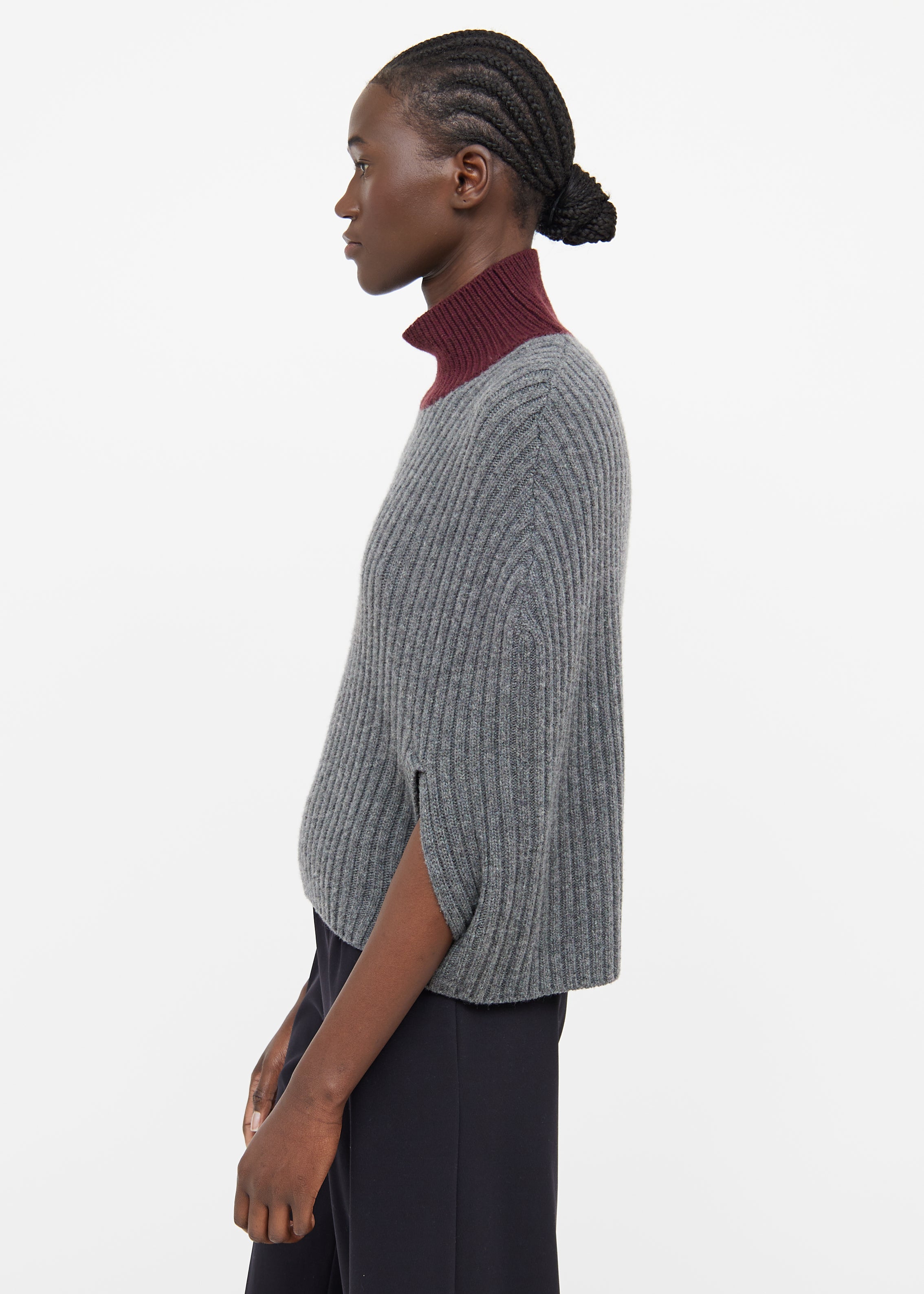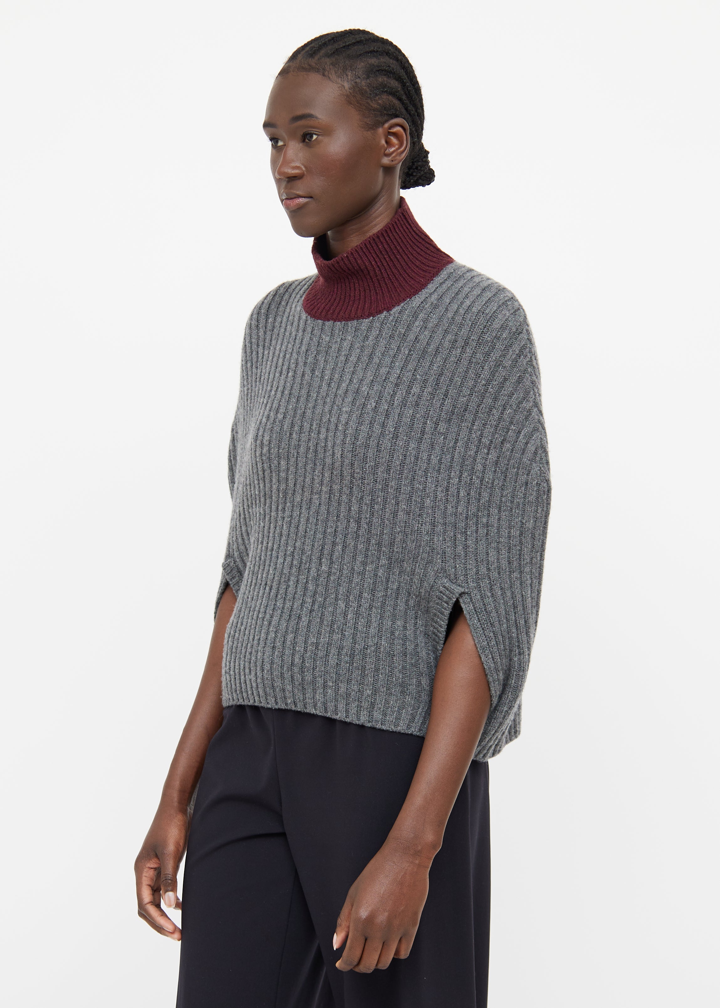 Pre-owned Marni grey and burgundy wool blend poncho featuring a burgundy turtle neck, ribbed detailing throughout, and a centre back cutout.