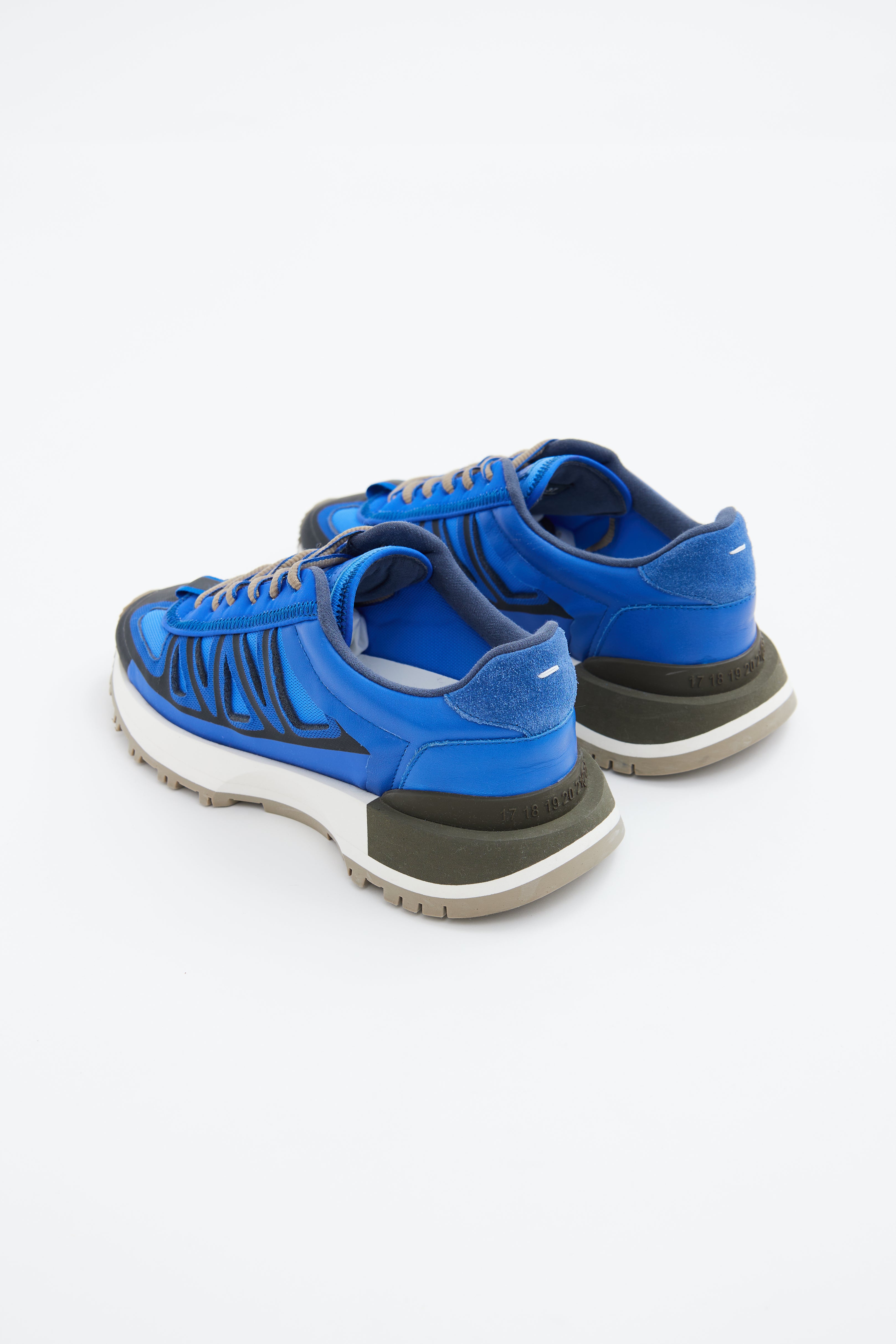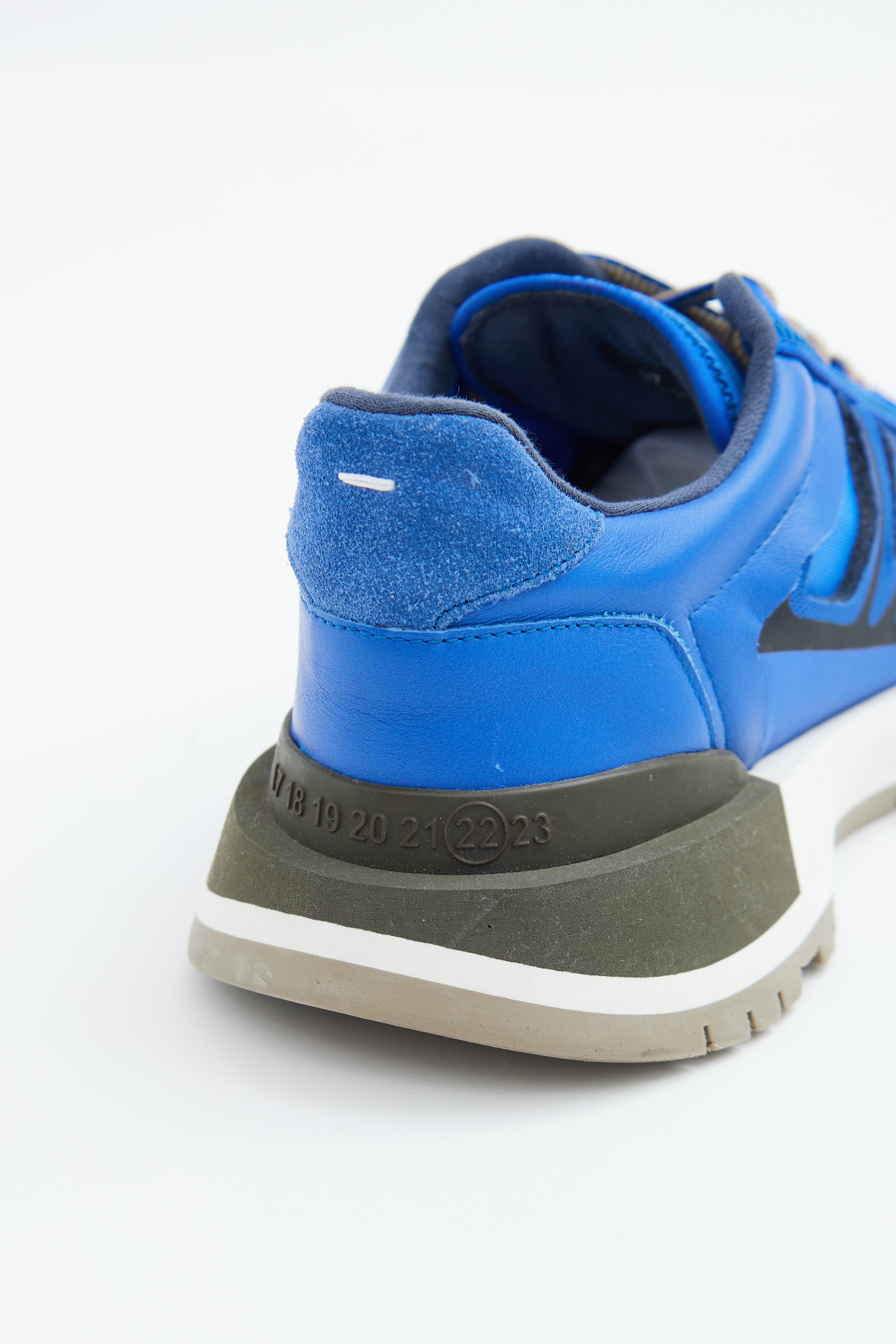 Pre-owned Maison Margiela blue 50/50 sneakers featuring lace-up closure, low-top mesh paneling and grained leather trim, leather logo patch at tongue, suede heel tab with embossed number logo at back, white and black rubber midsole and leather insole.