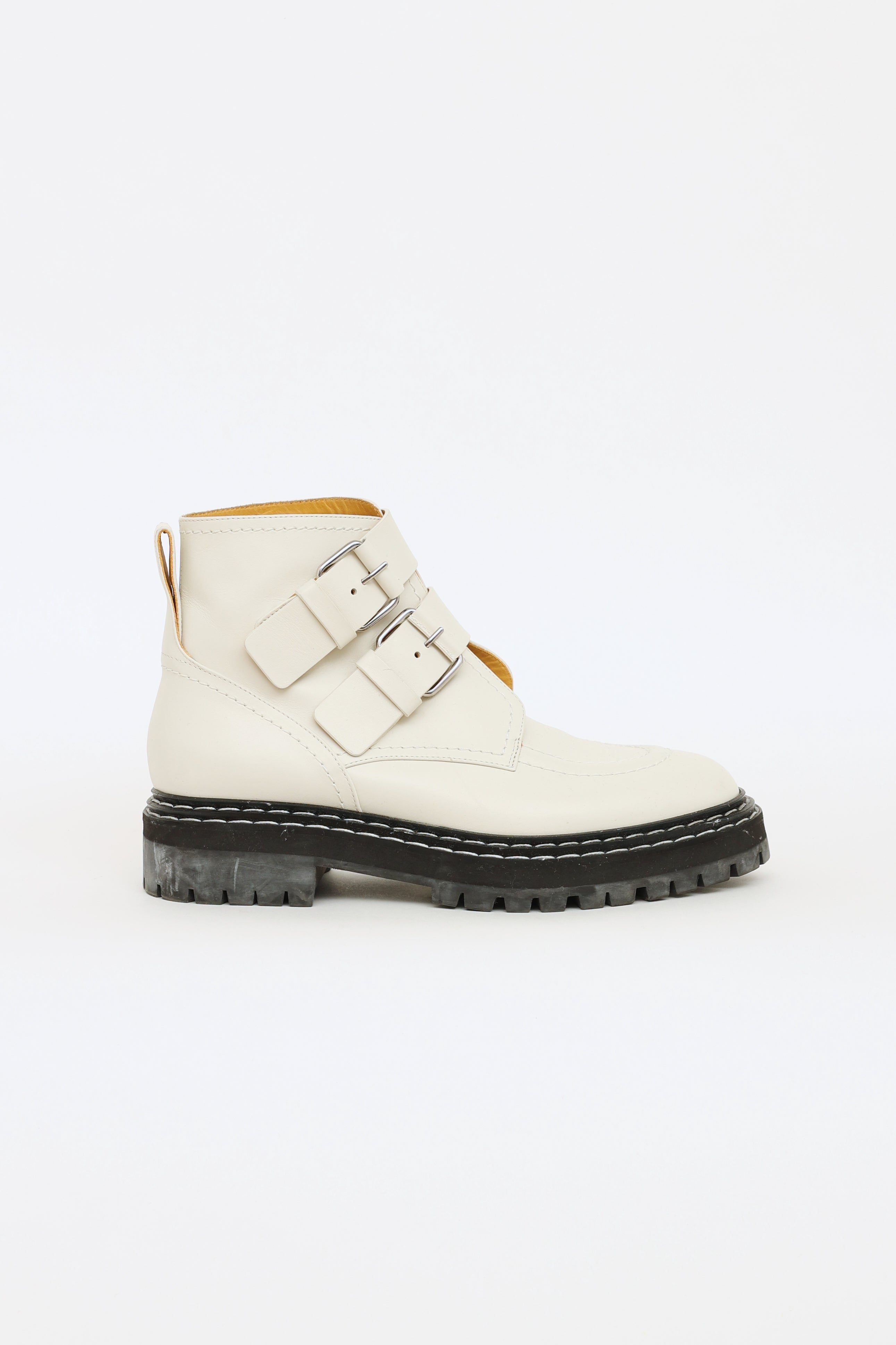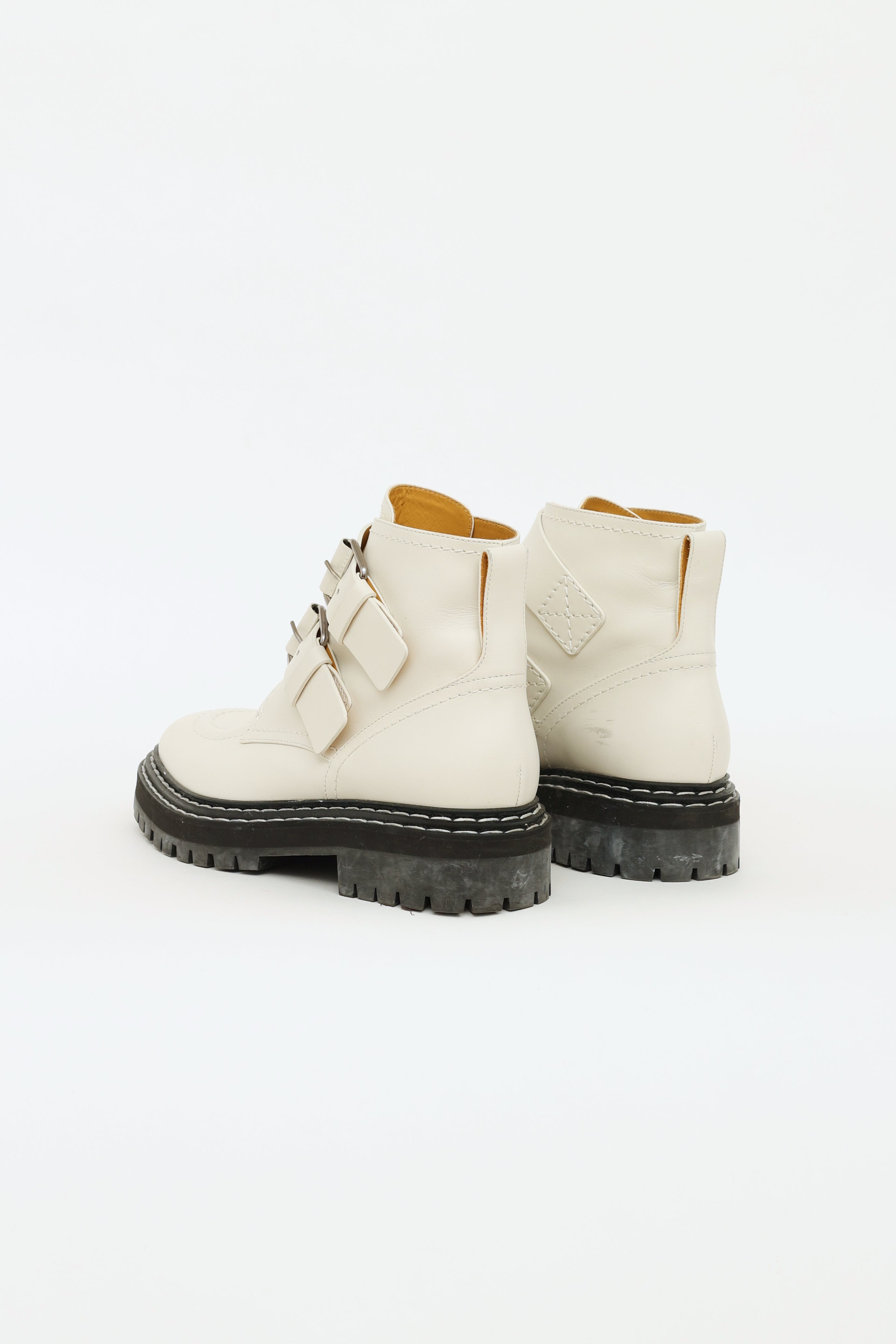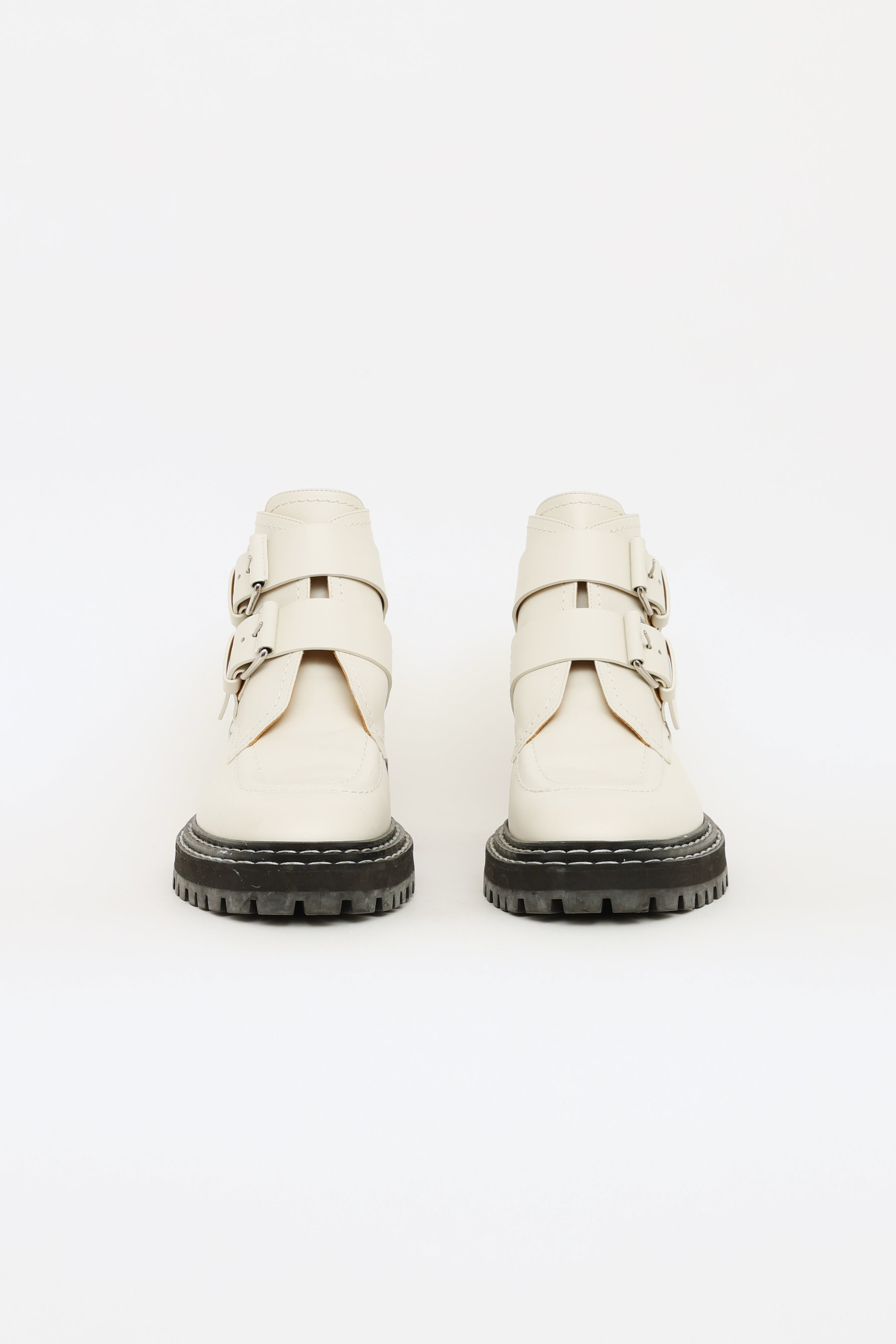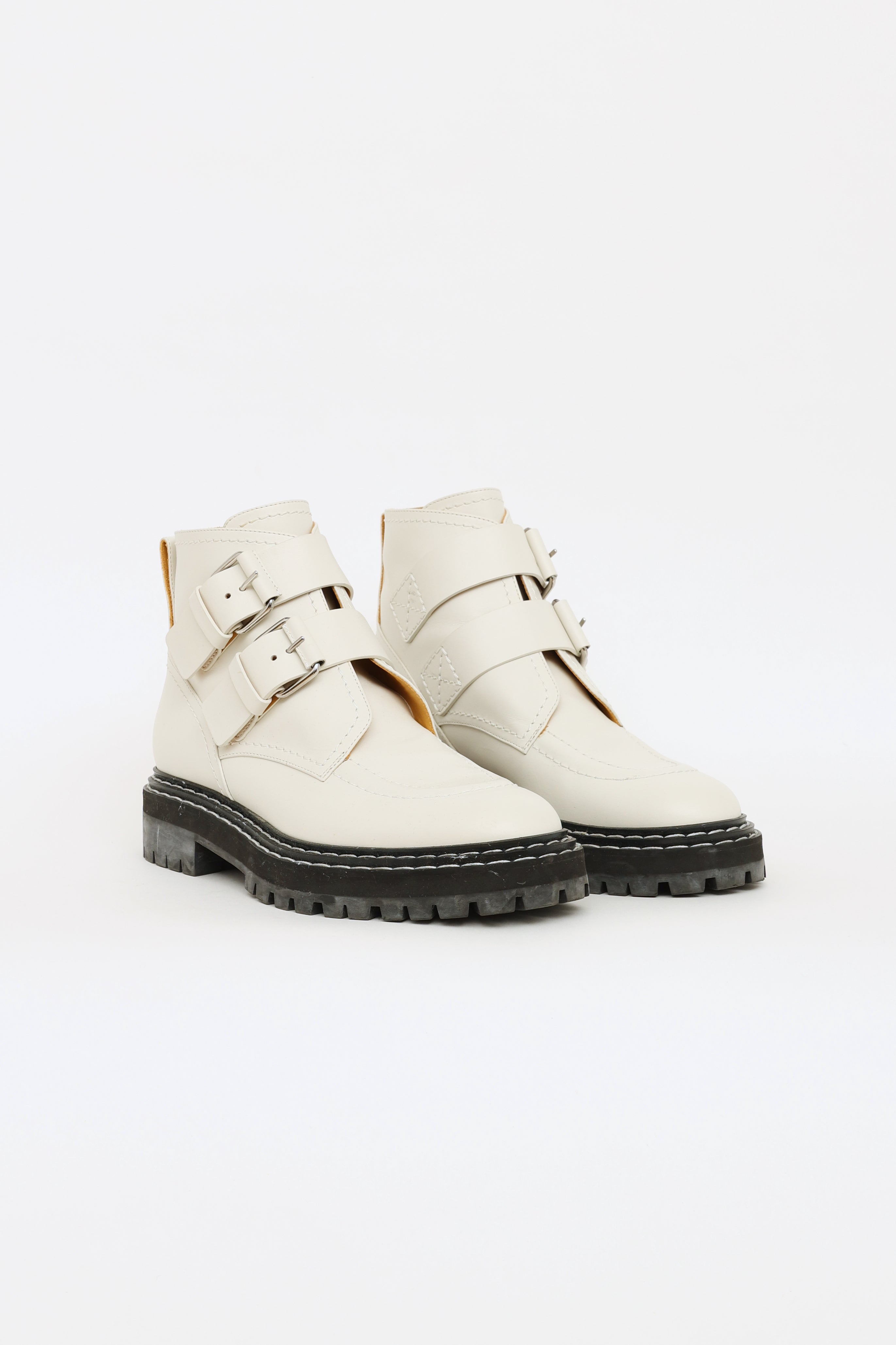 Pre-owned Proenza Schouler white combat boots featuring double buckle entry at upper, silver tone hardware, pull tab at counter, leather insoles and signature topstitched rubber lug soles.