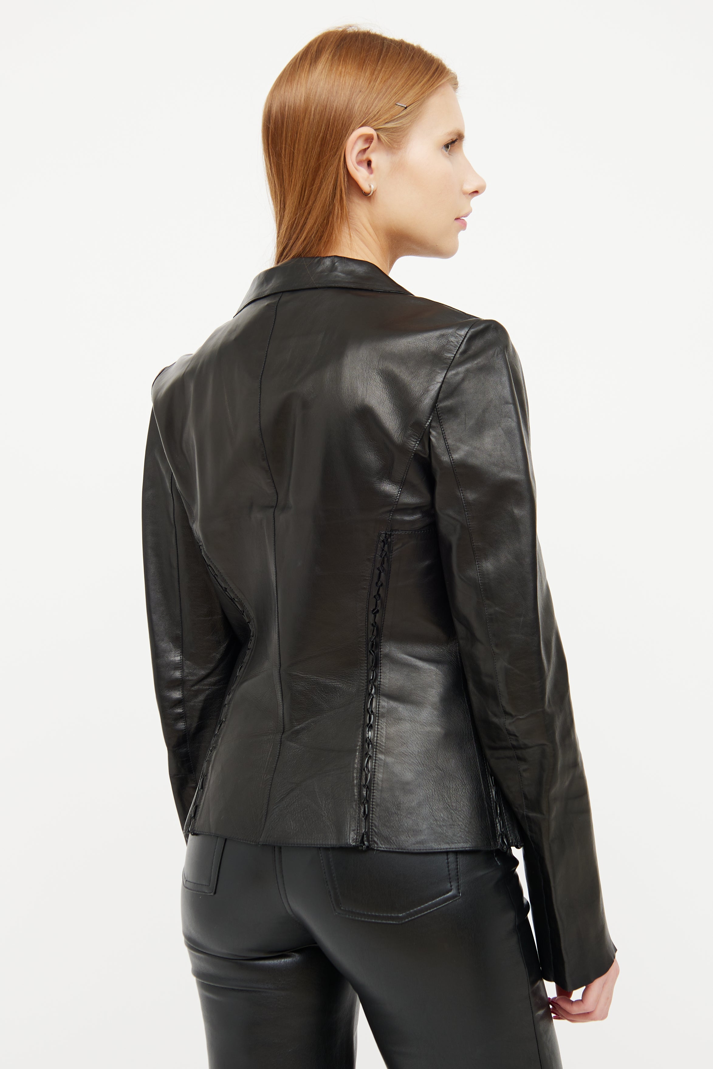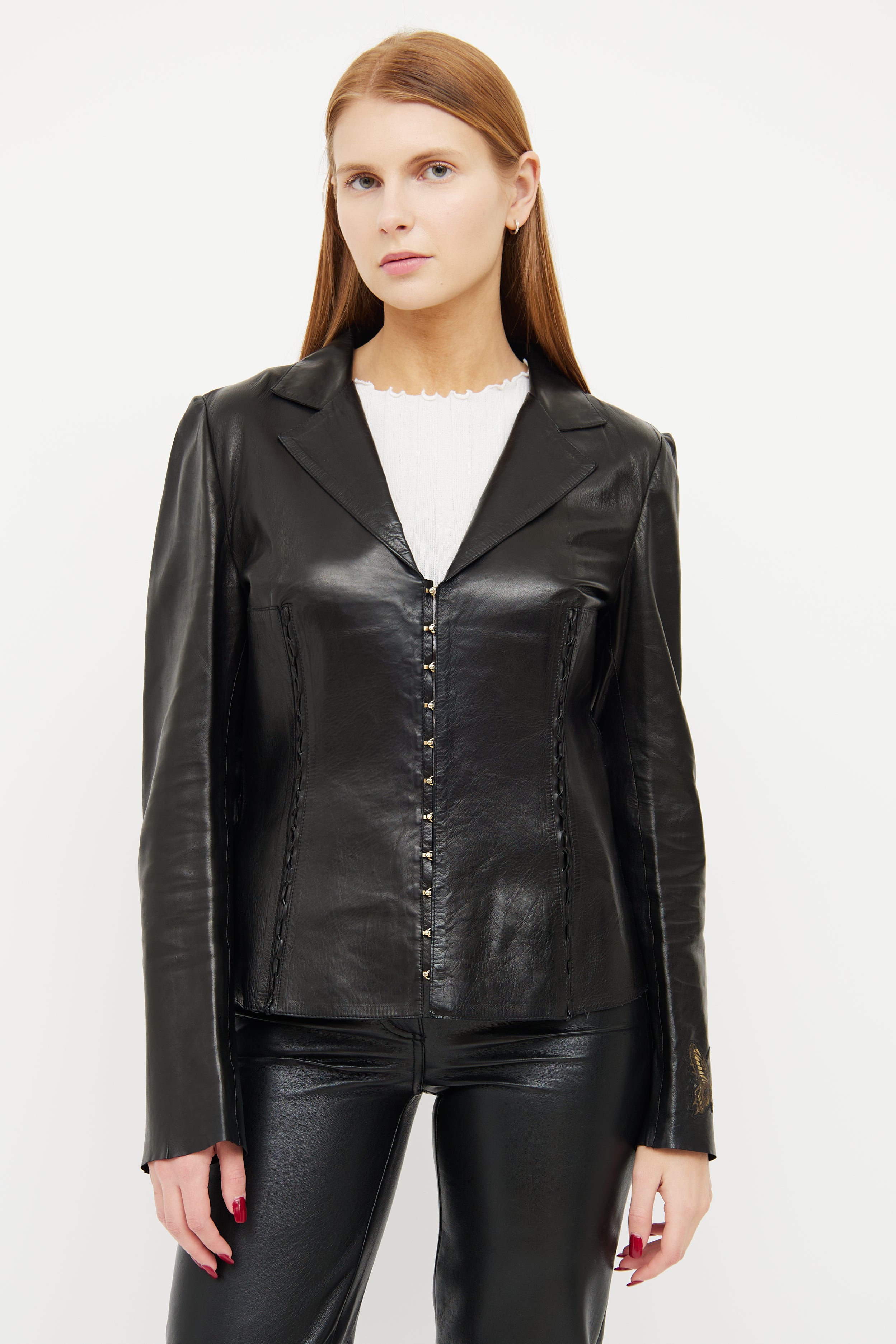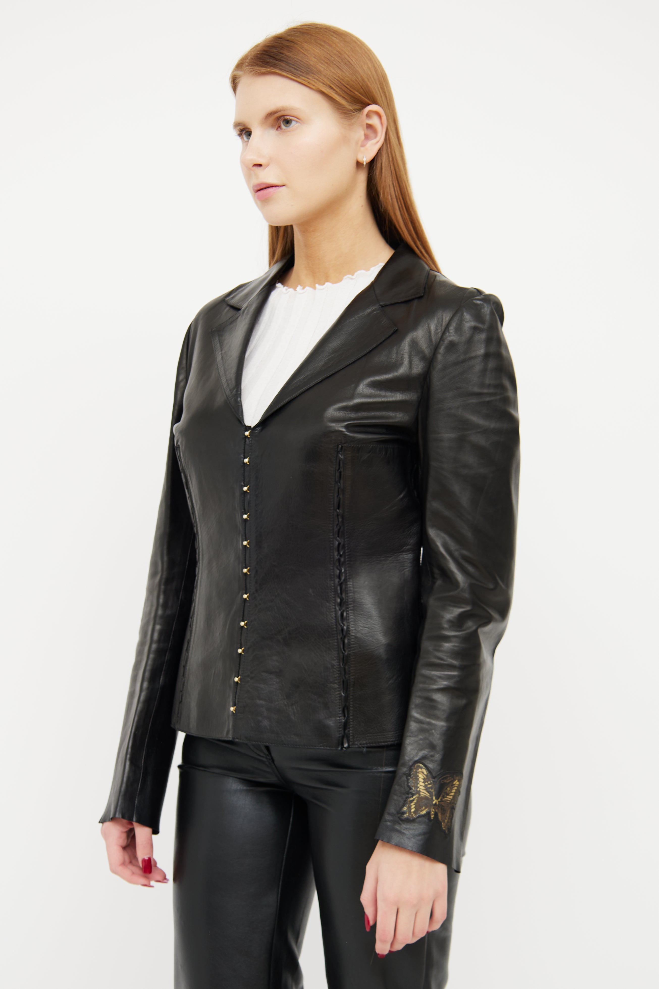 Pre-owned Roberto Cavalli black leather jacket featuring a notch lapel collar, French hook closure, butterfly detail and lace paneling throughout.