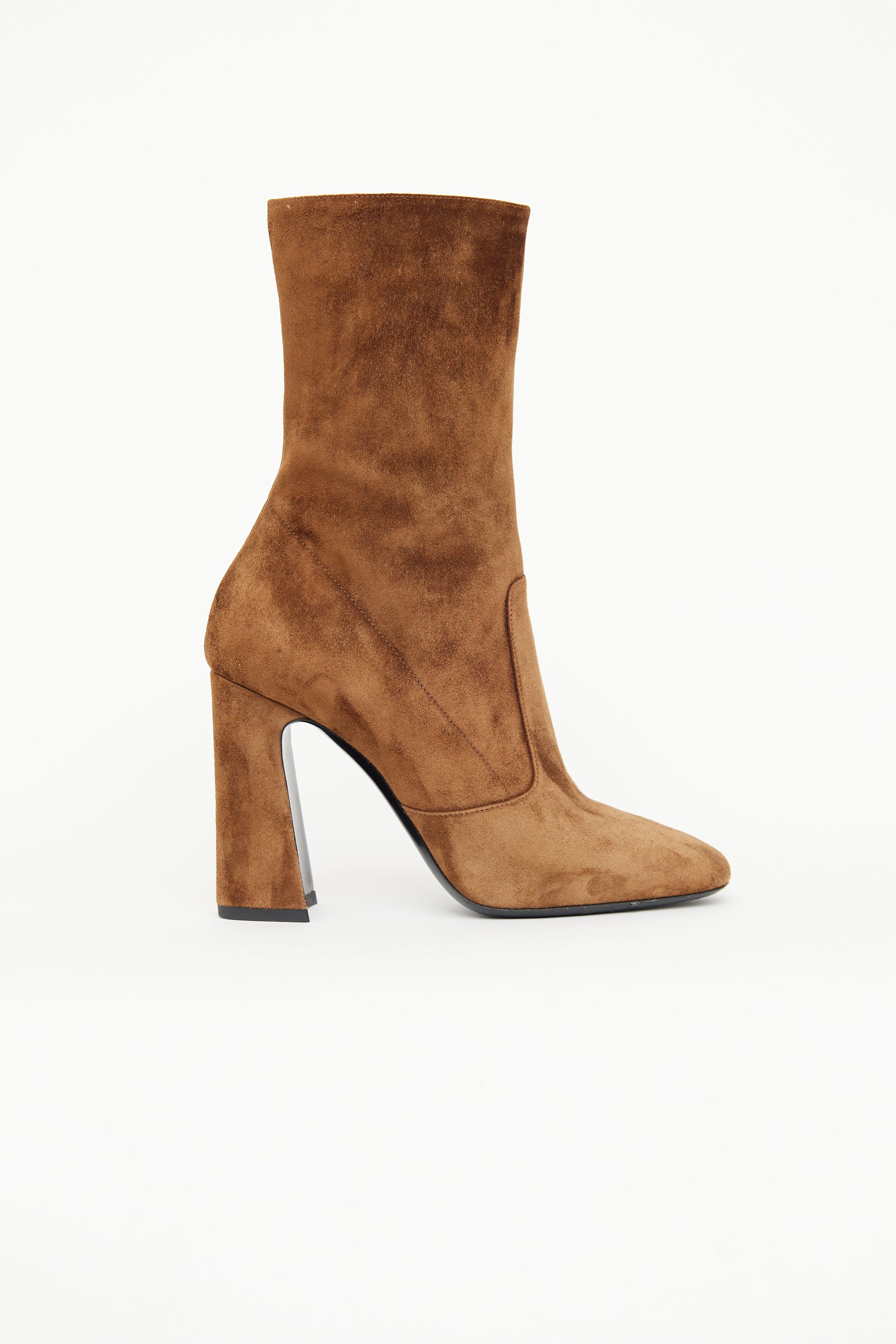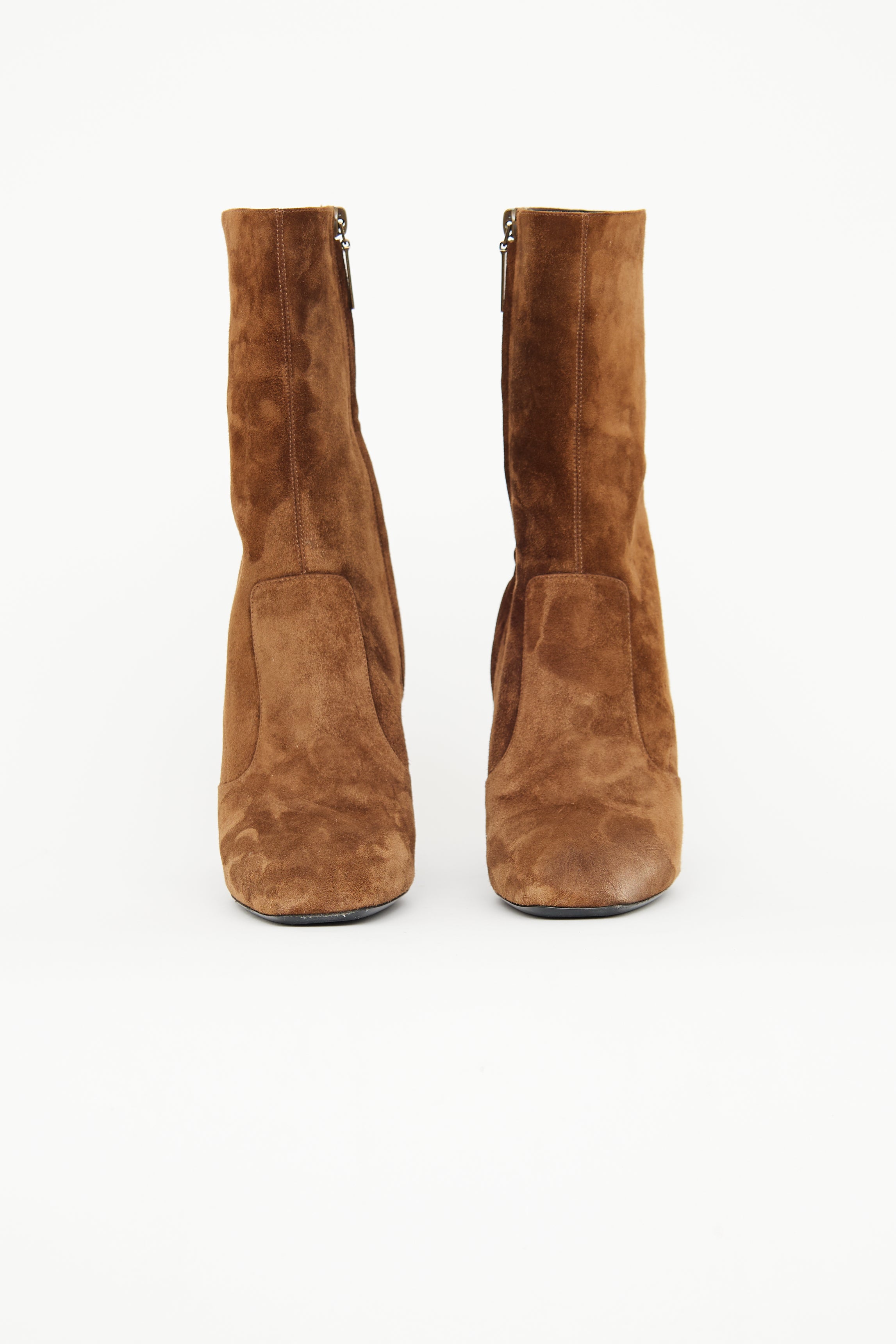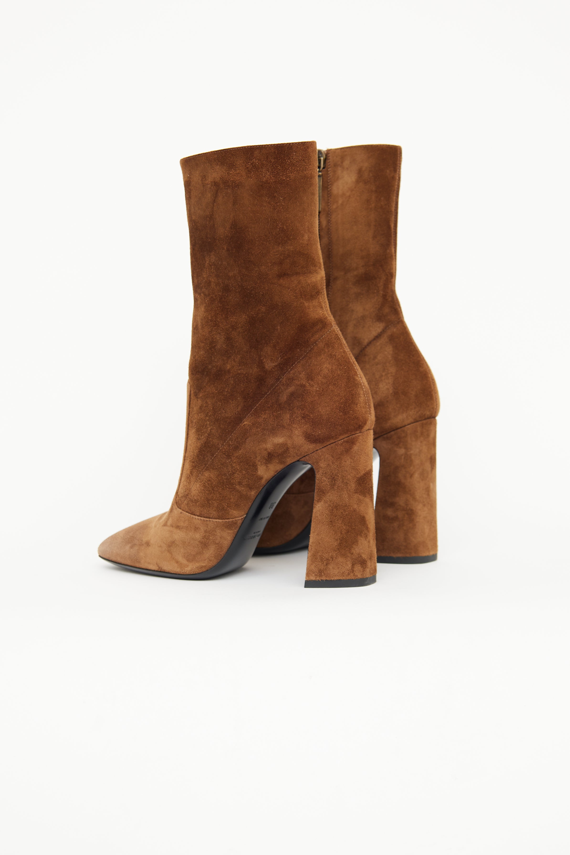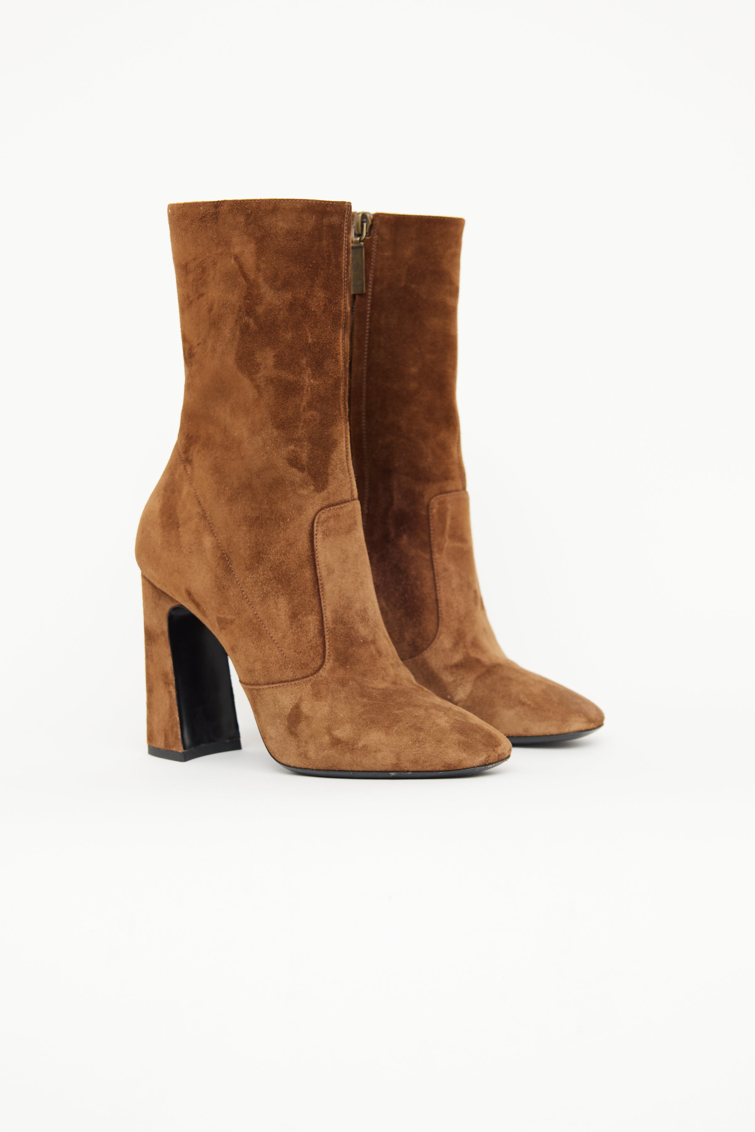 Pre-owned Saint Laurent brown suede bootie featuring almond toe, short ankle shaft, side zip entry, and block heel.