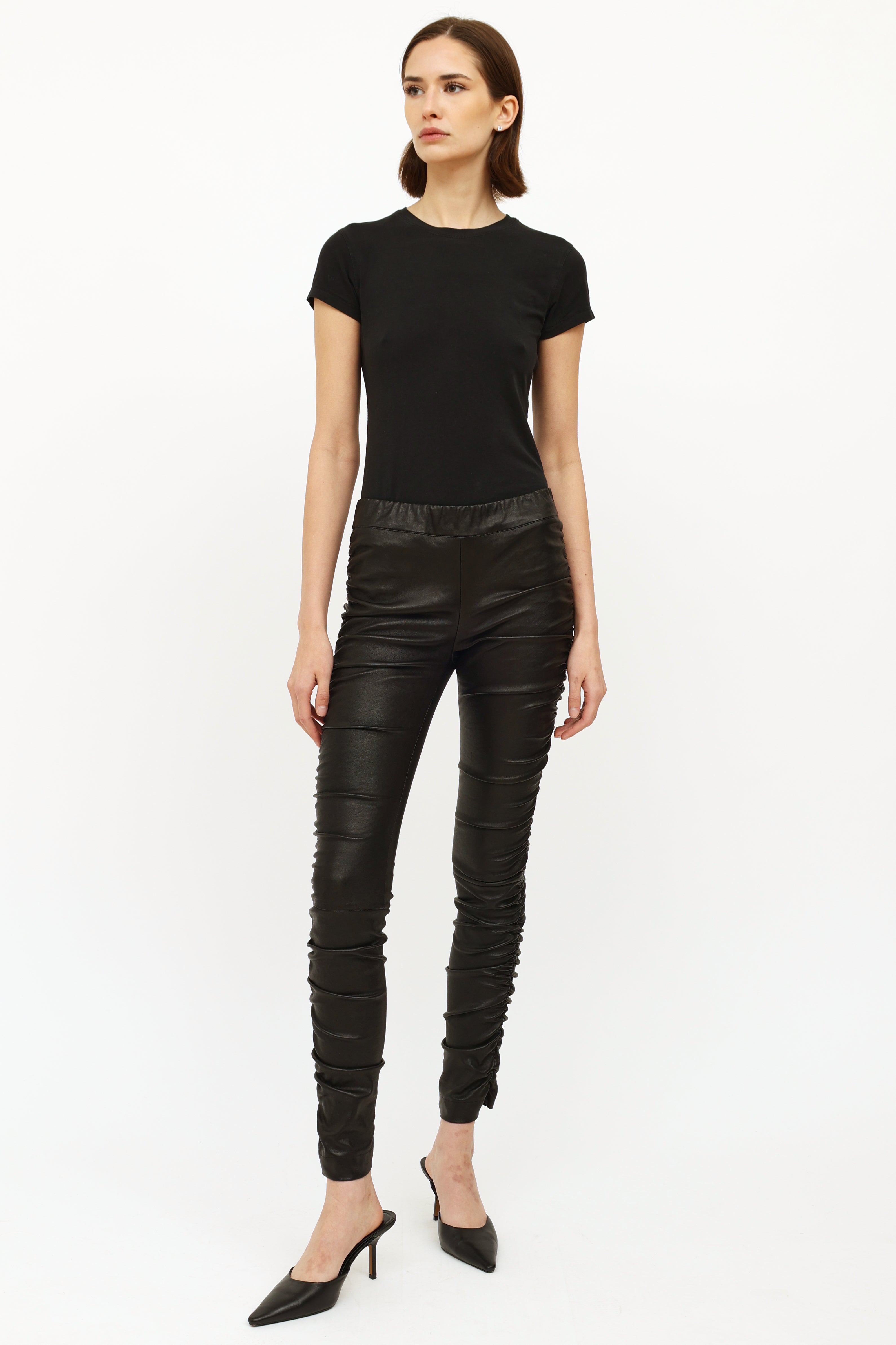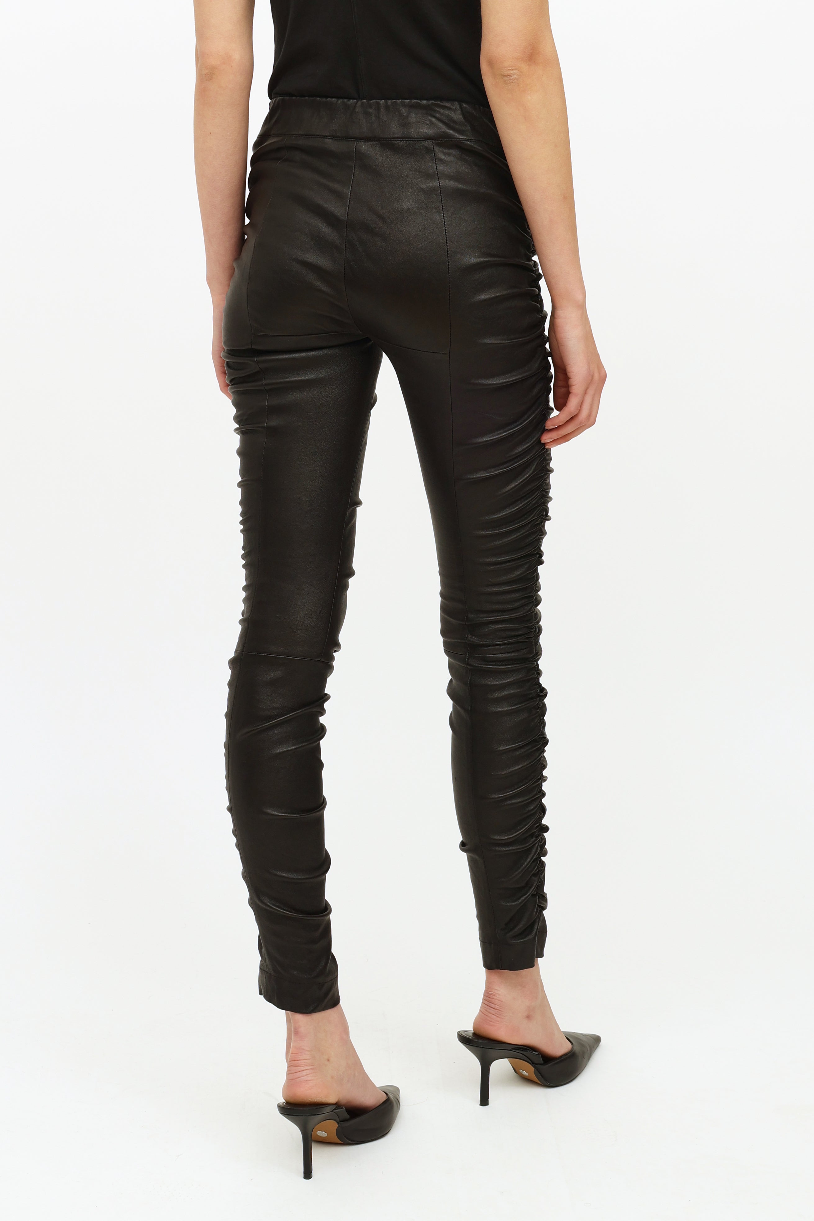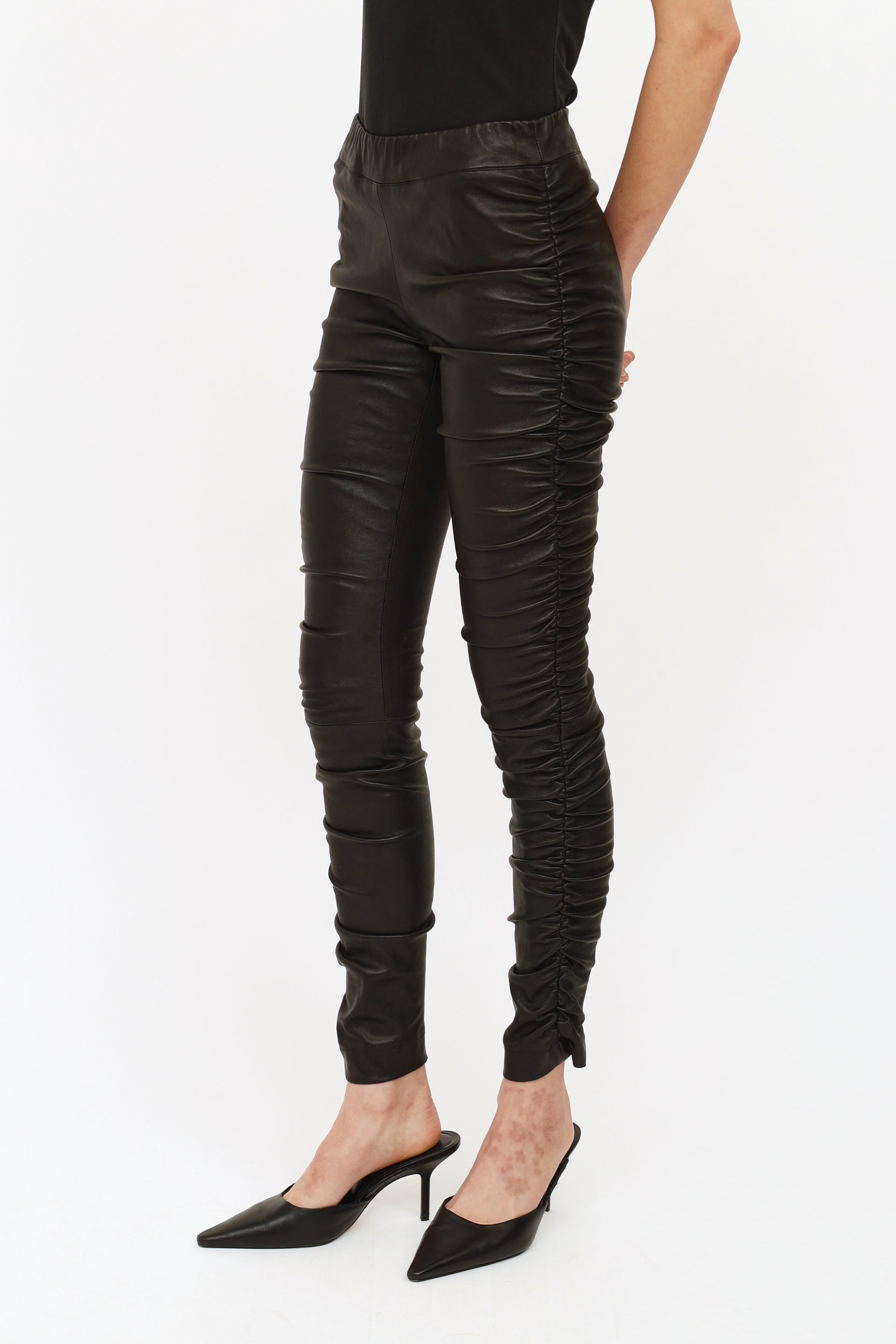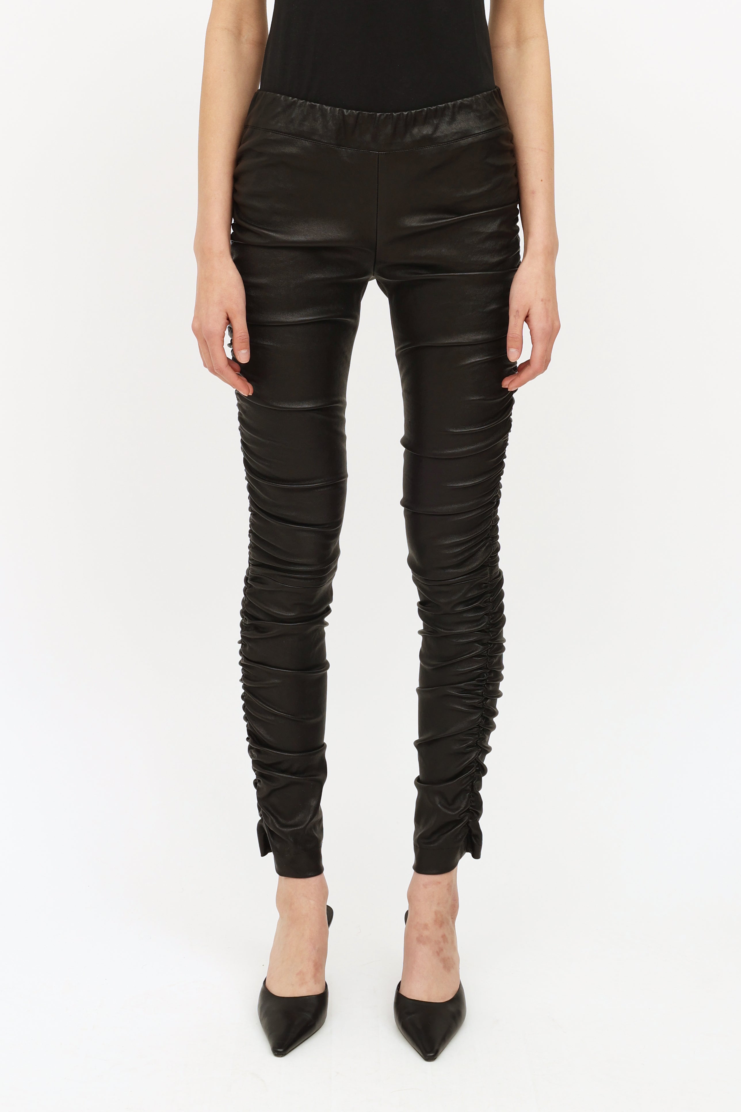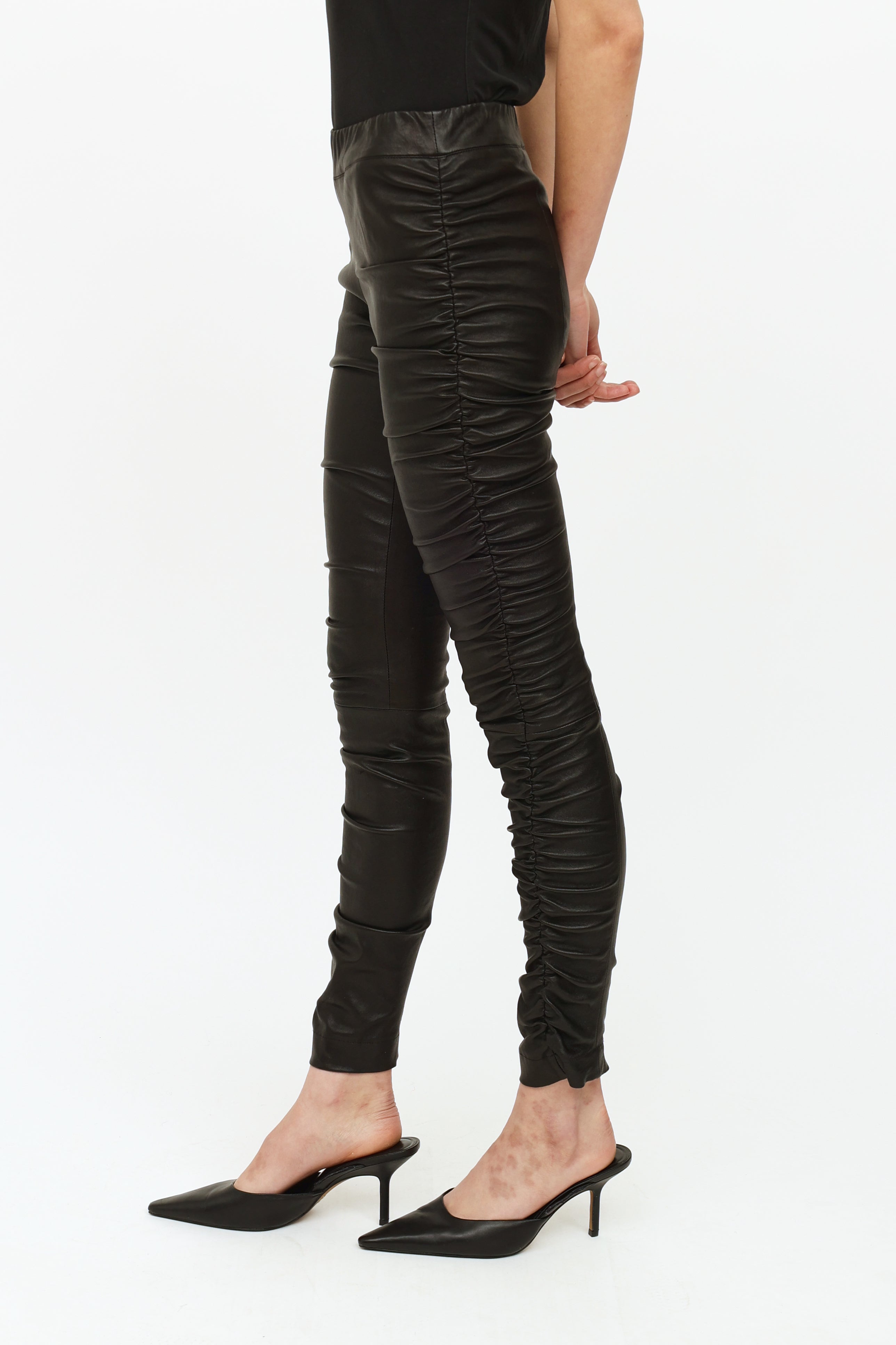 Pre-owned The Row black Orshen leather leggings featuring ruching throughout, cinched elasticized waistband, seam at knee and band detailing at hem.