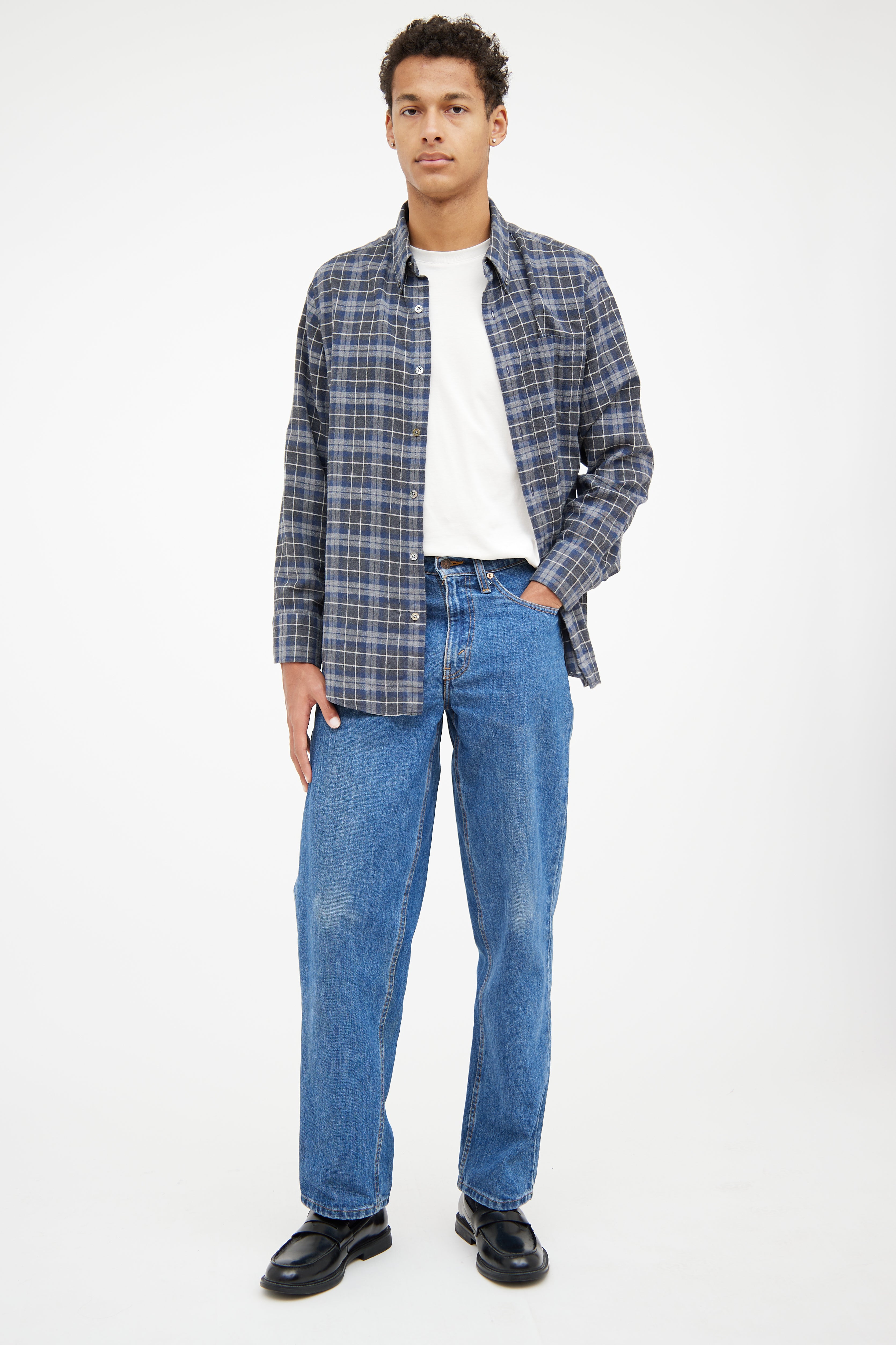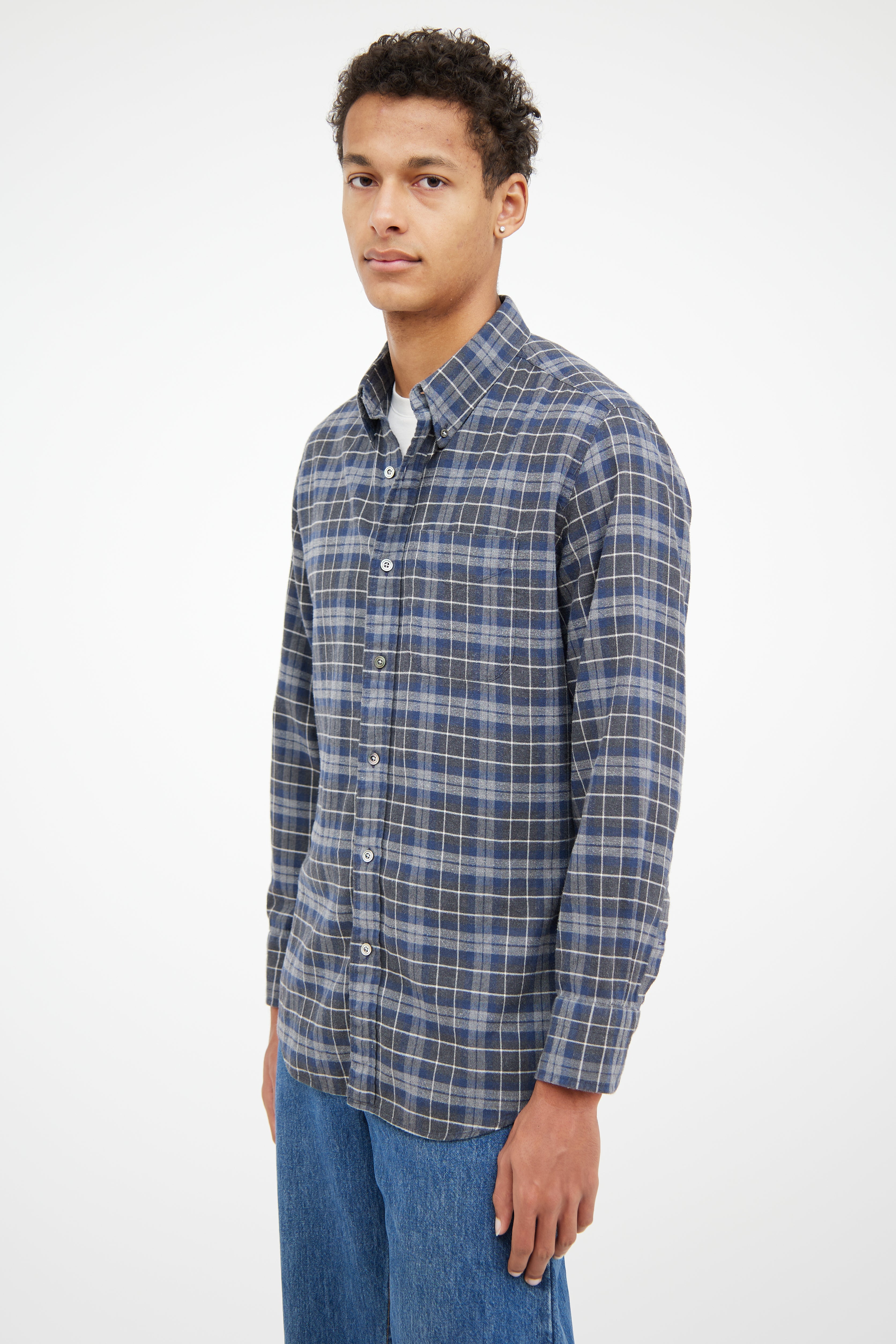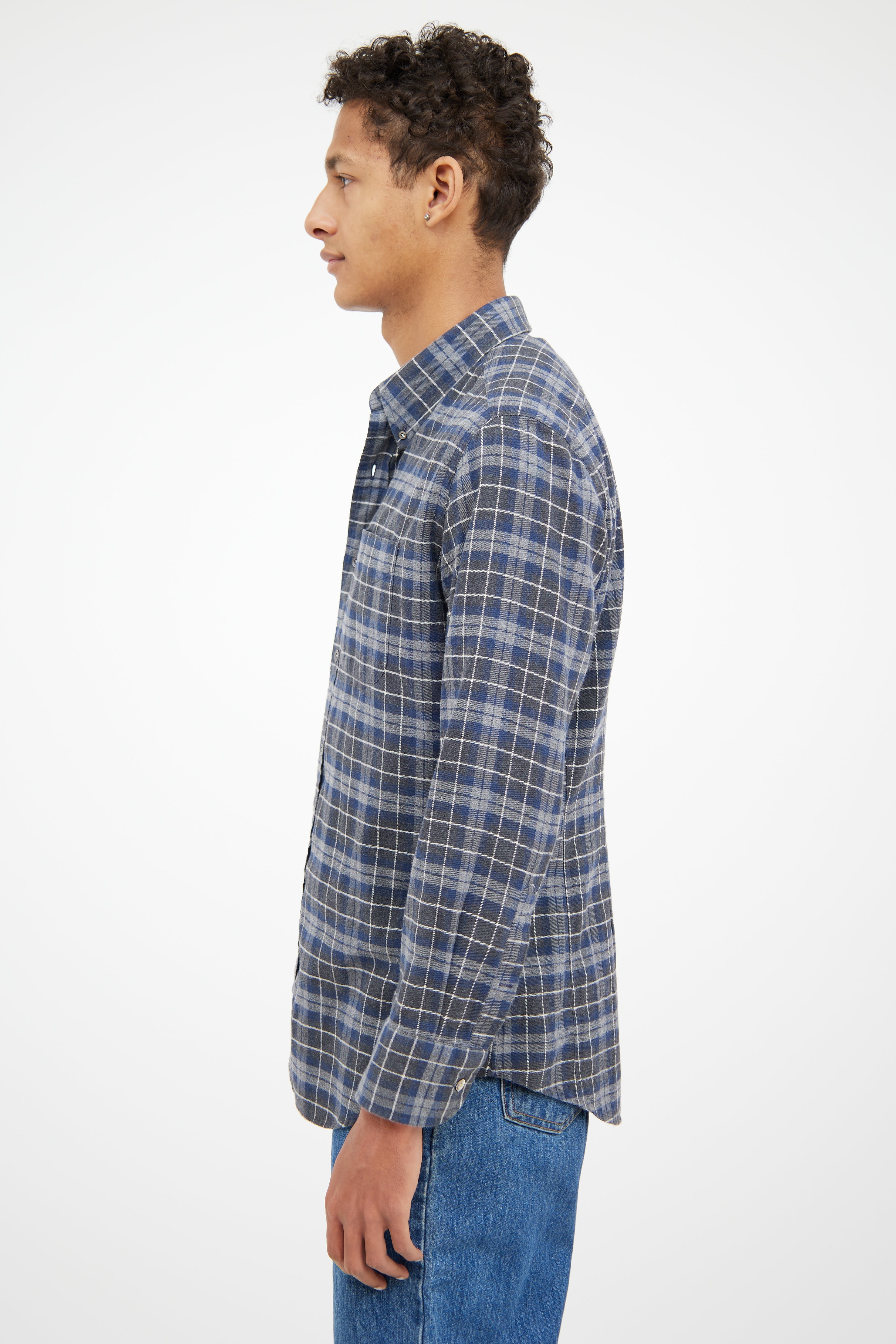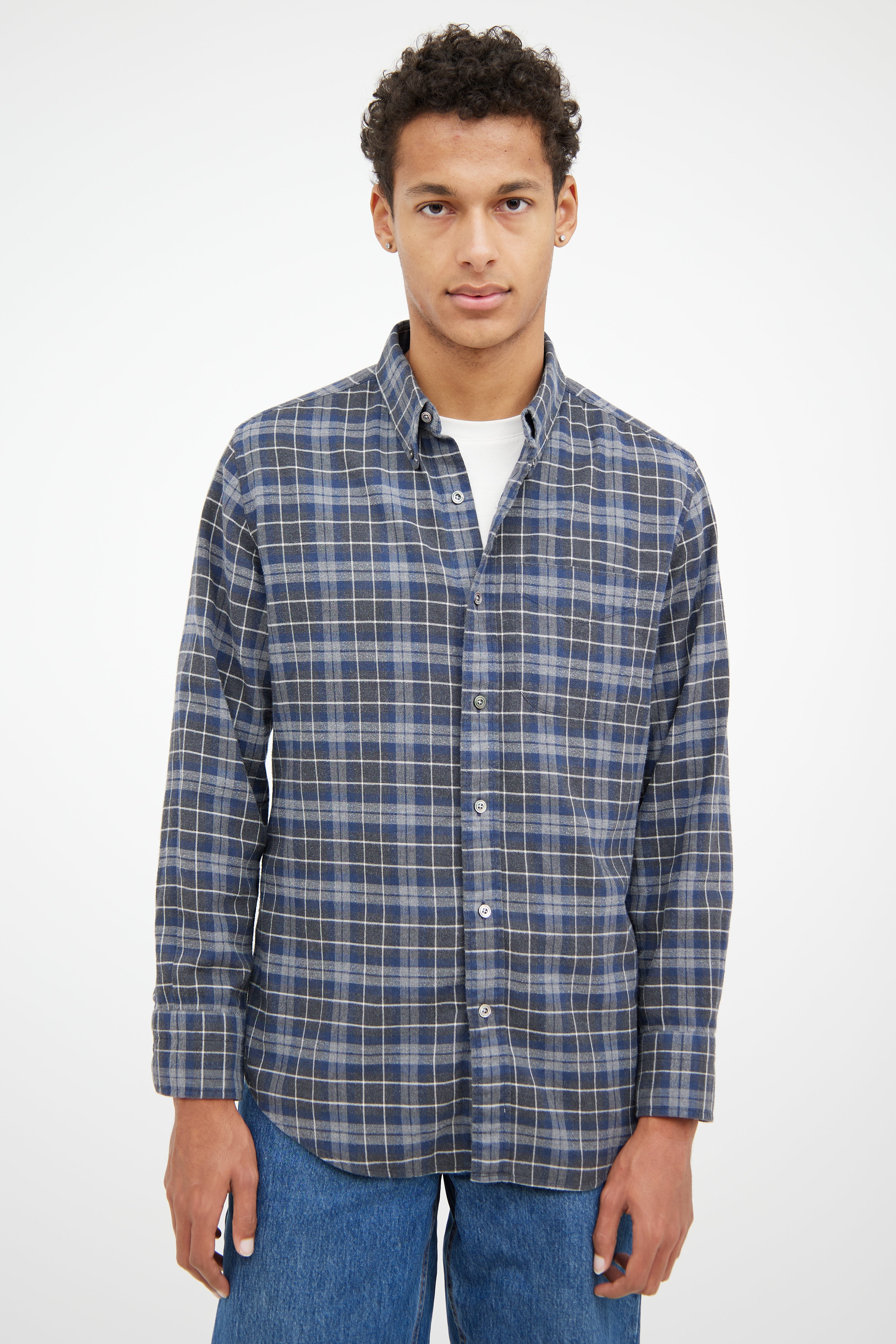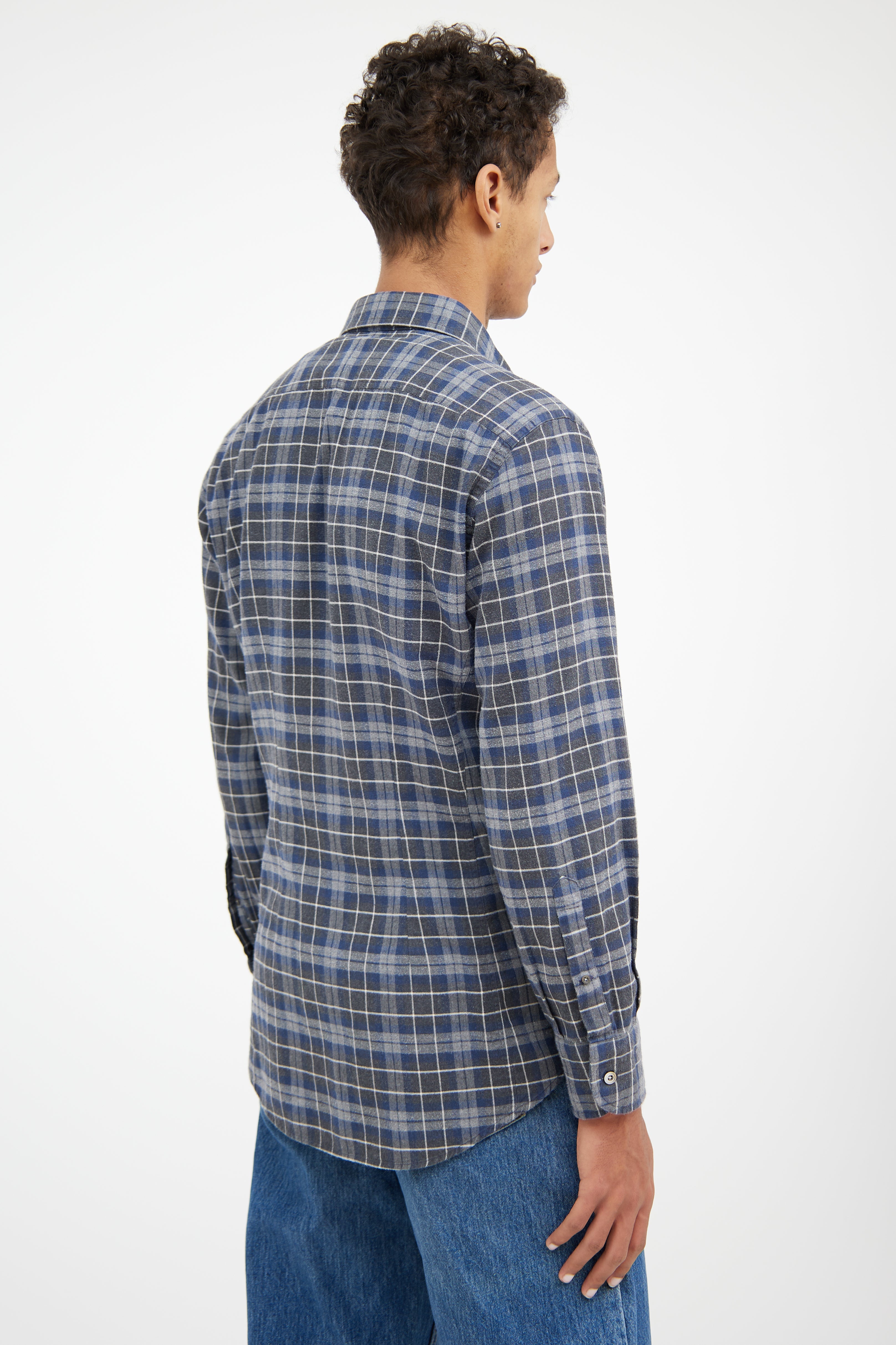 Pre-owned Tom Ford grey and blue flannel shirt featuring pointed collar, slip pocket at chest, button up closure at front and buttoned cuffs.