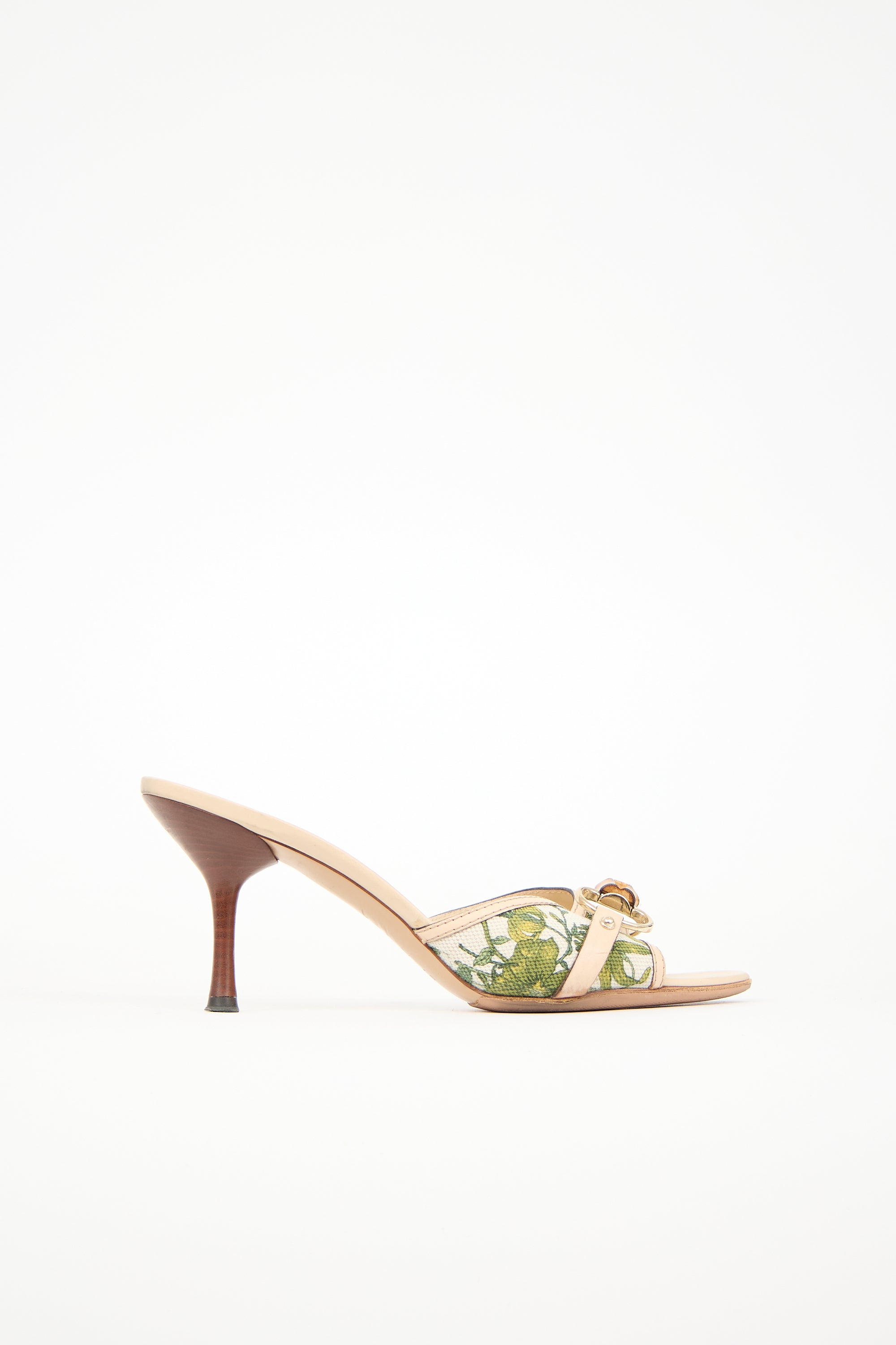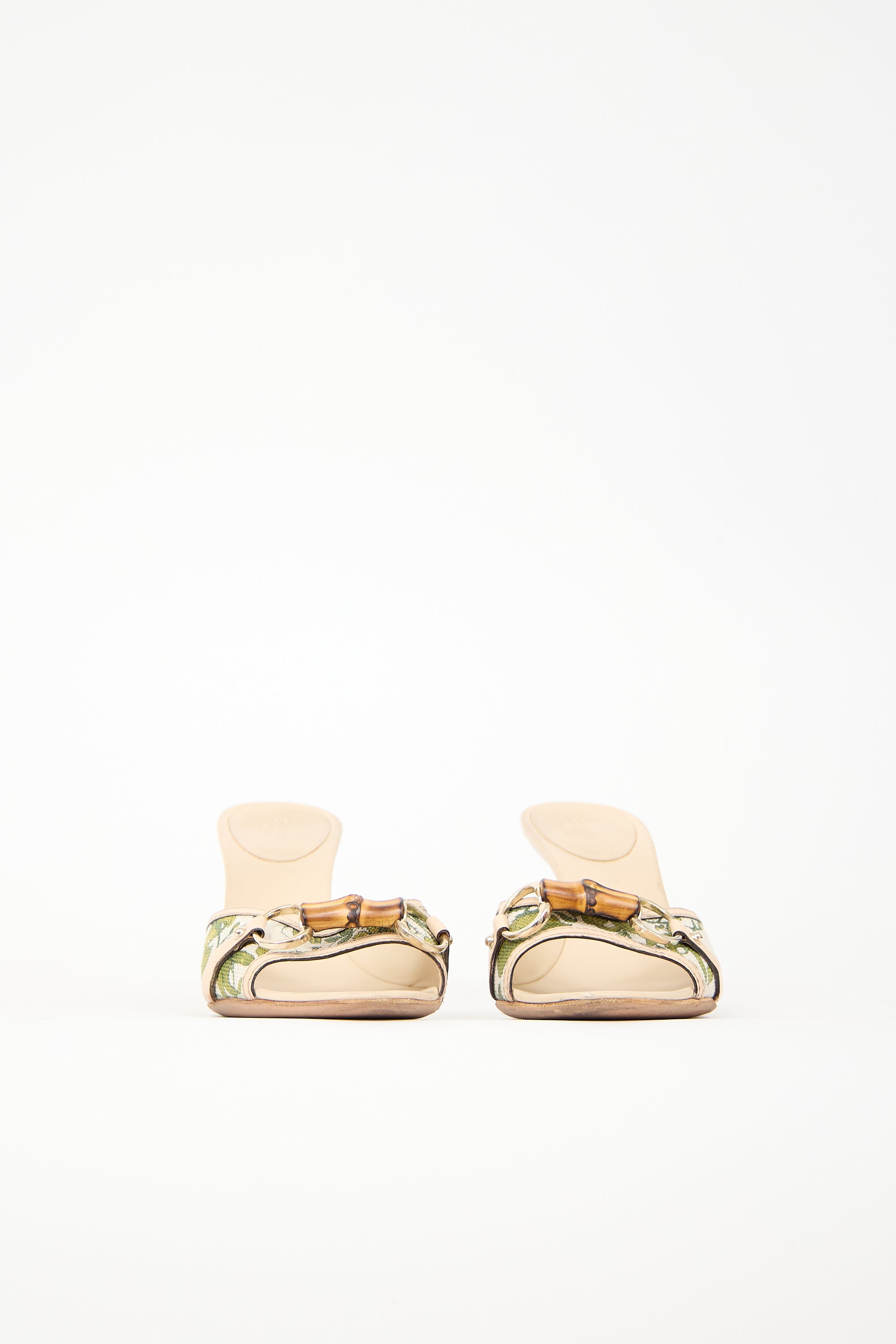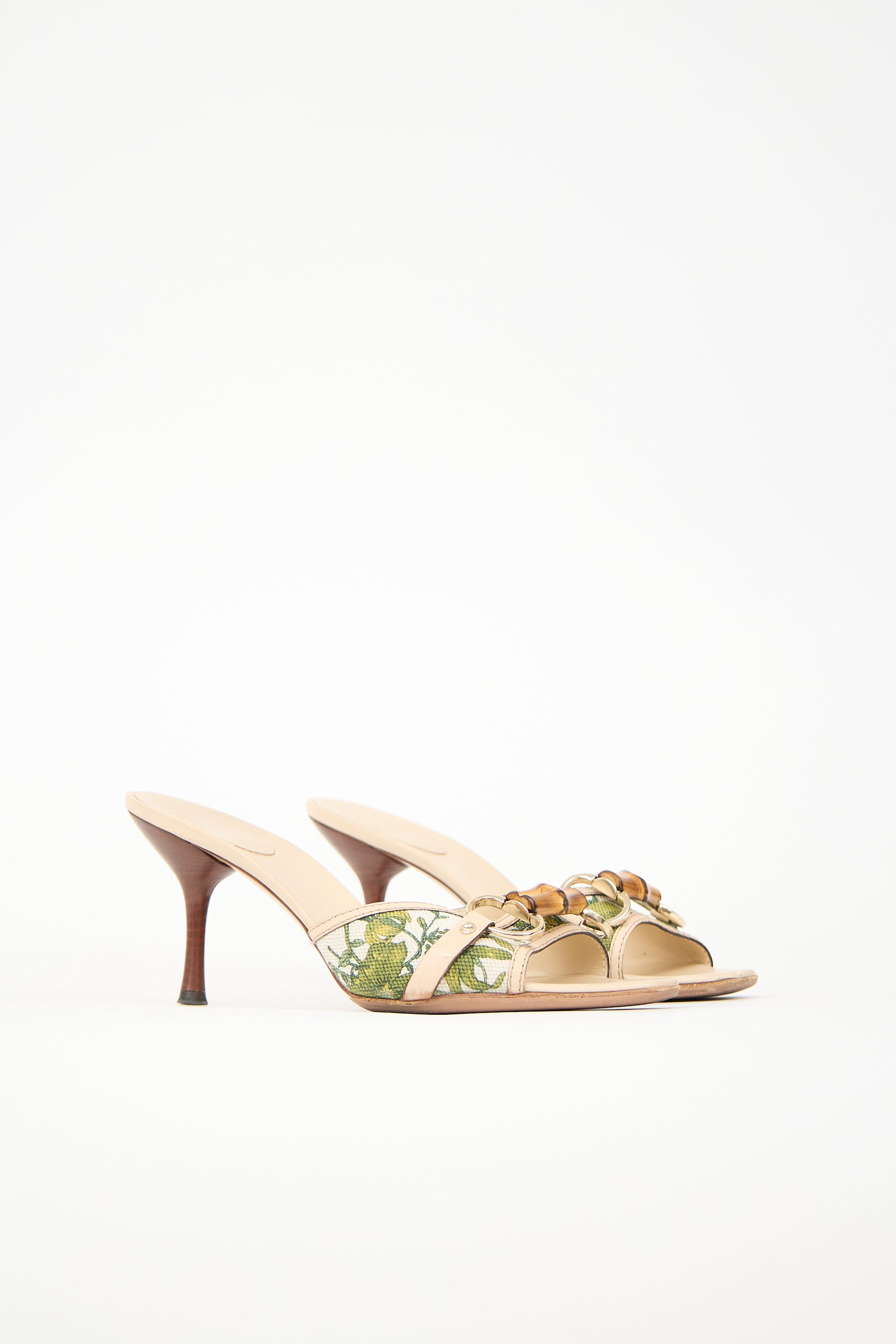 Pre-owned Gucci beige and multicolour mules featuring almond toe, canvas upper with green floral print, leather trim, signature bamboo embellishment at vamp, and brown wooden continental heel.