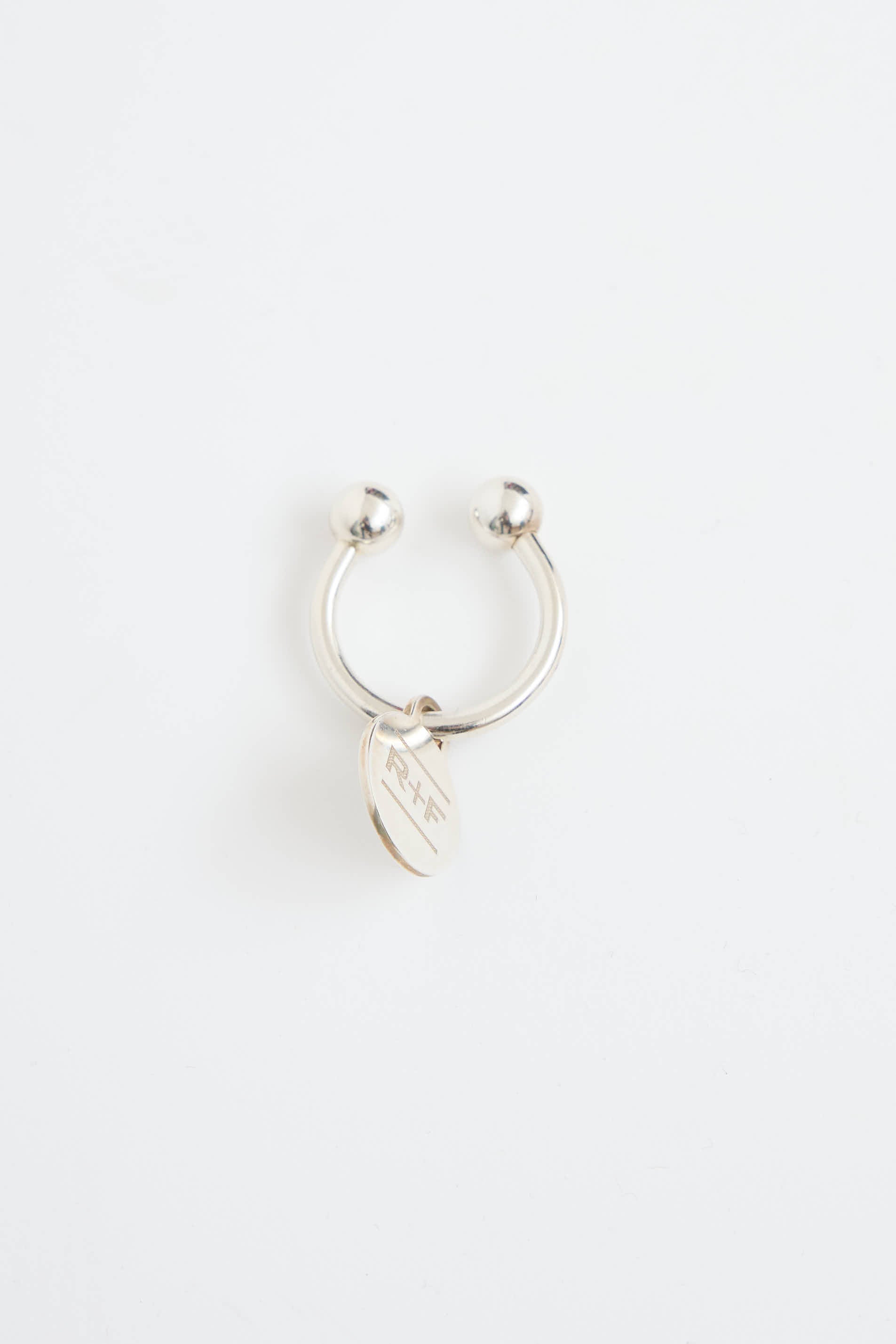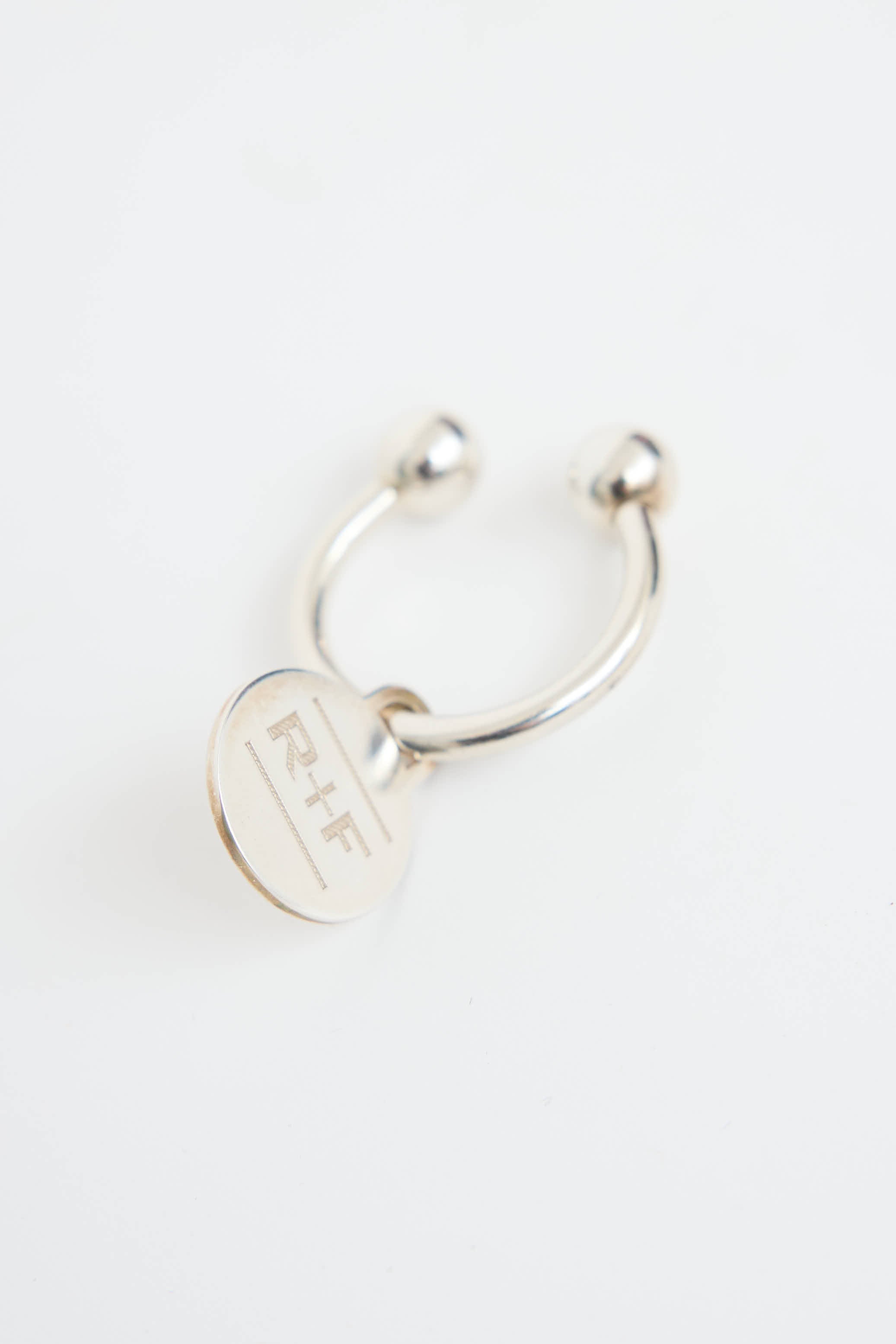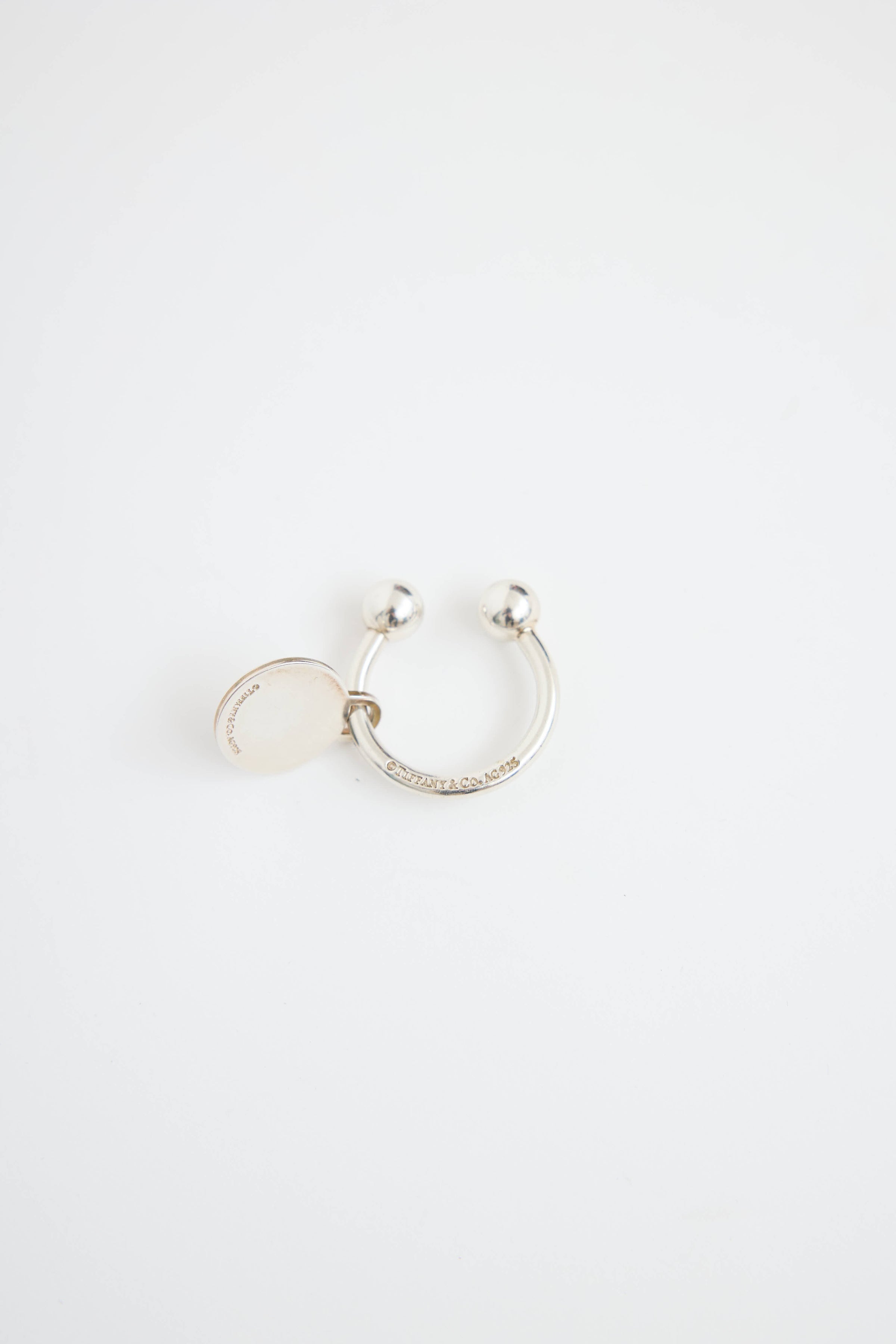 Pre-owned Tiffany & Co. sterling silver key ring featuring "Tiffany & Co." and "925" engraving at front, circular pendant with "R+F" engraving, and removable ball closure.