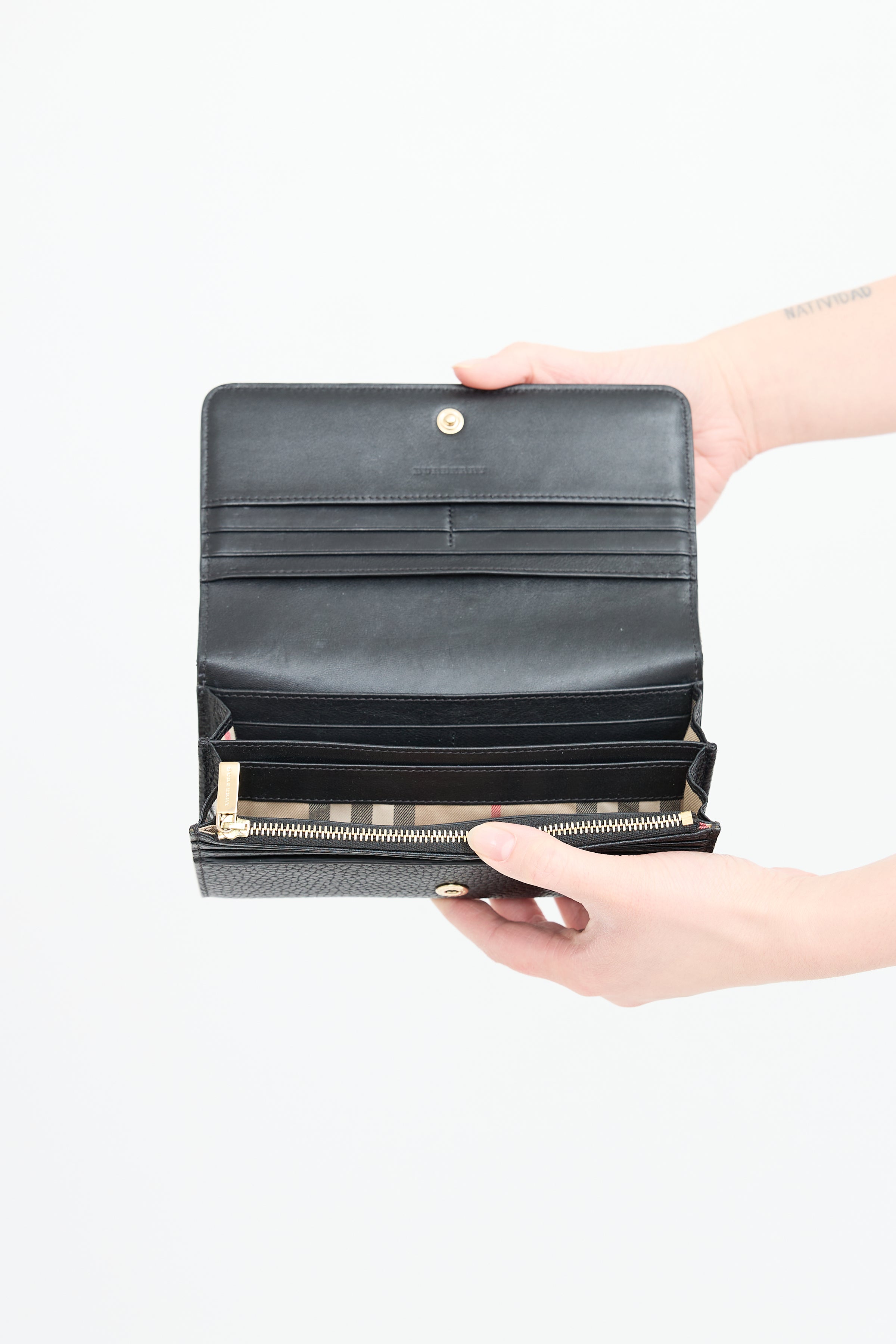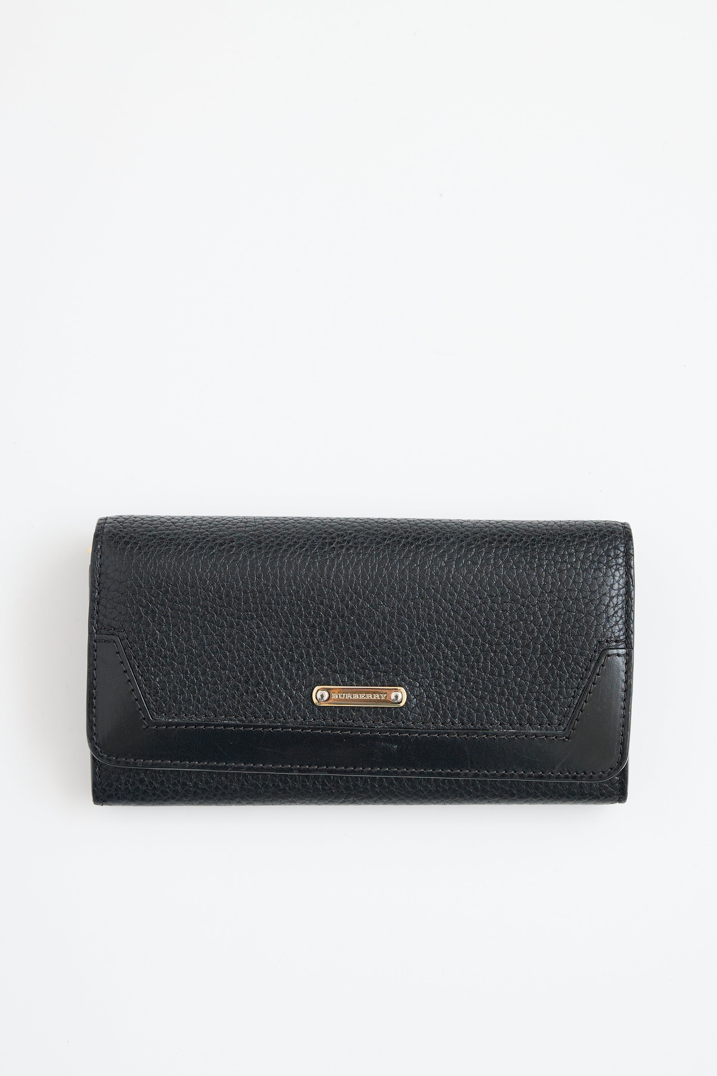 Pre-owned Burberry black continental wallet featuring full grain leather throughout, gold tone logo plaque on front, one exterior slip pocket on back, snap closure, interior lined in leather and signature plaid, one zipper pocket, multiple bill slots and 10 card slots.