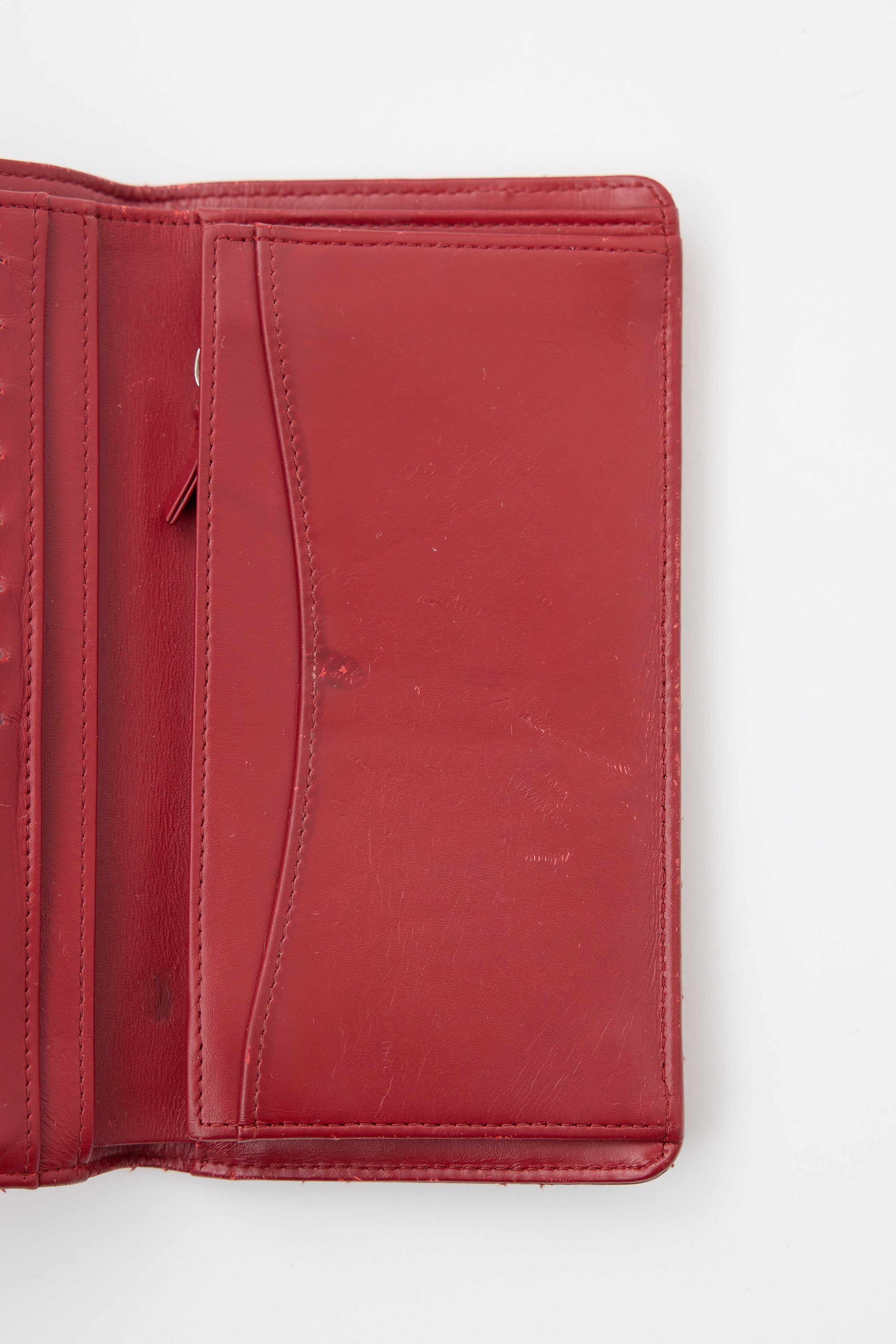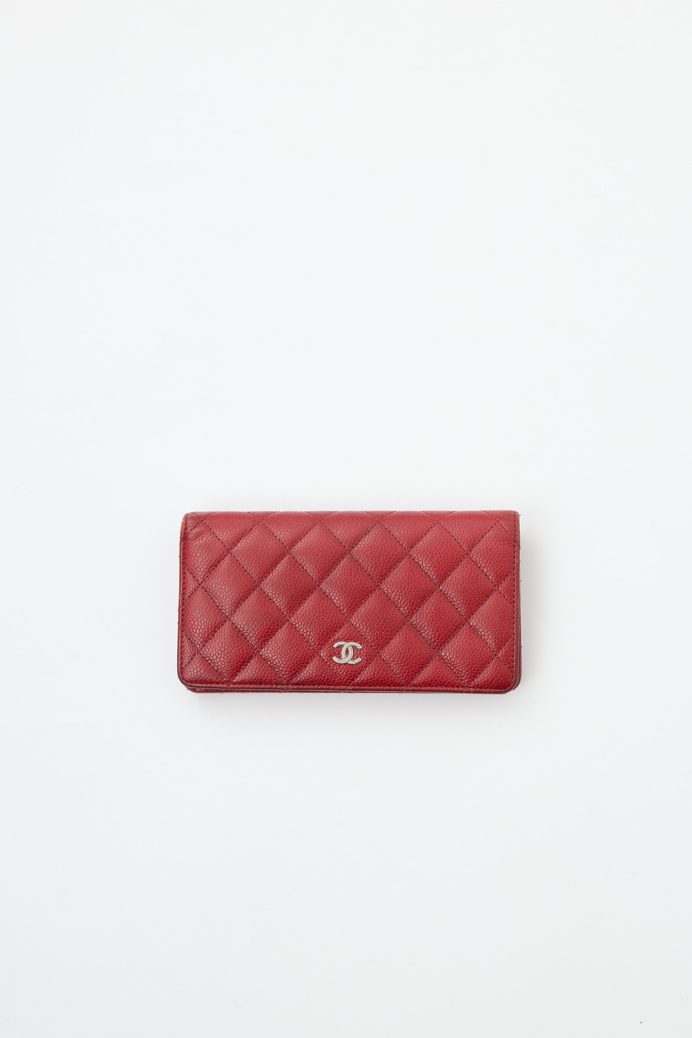 Pre-owned Chanel red Caviar bi-fold wallet featuring quilted leather, slip pocket at back, silver tone CC hardware at front, top flap, one bill compartment, one zip pocket, five slip pockets, 8 card slots, and silver stamped logo at corner.