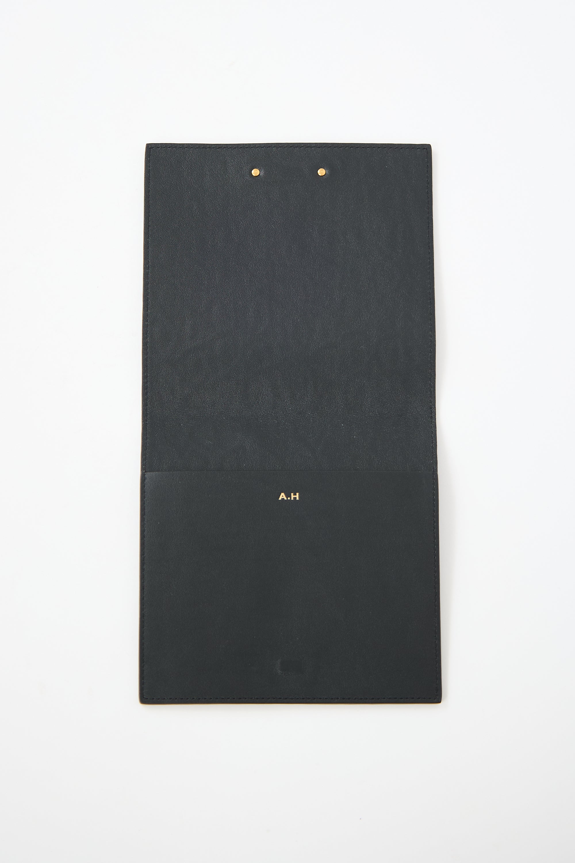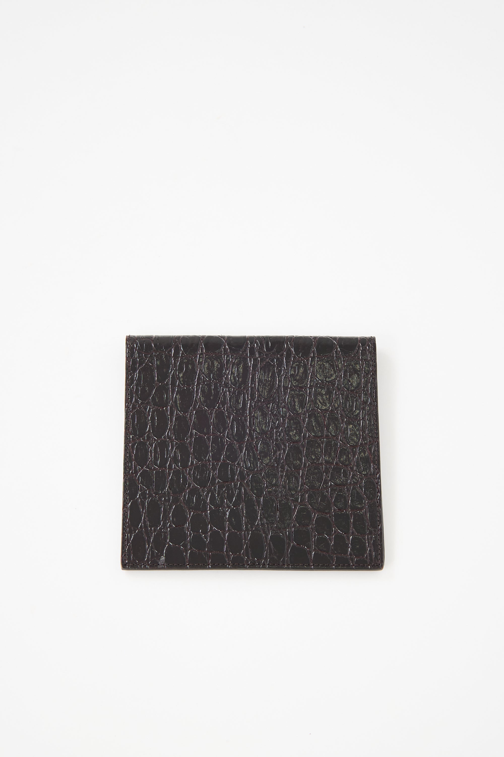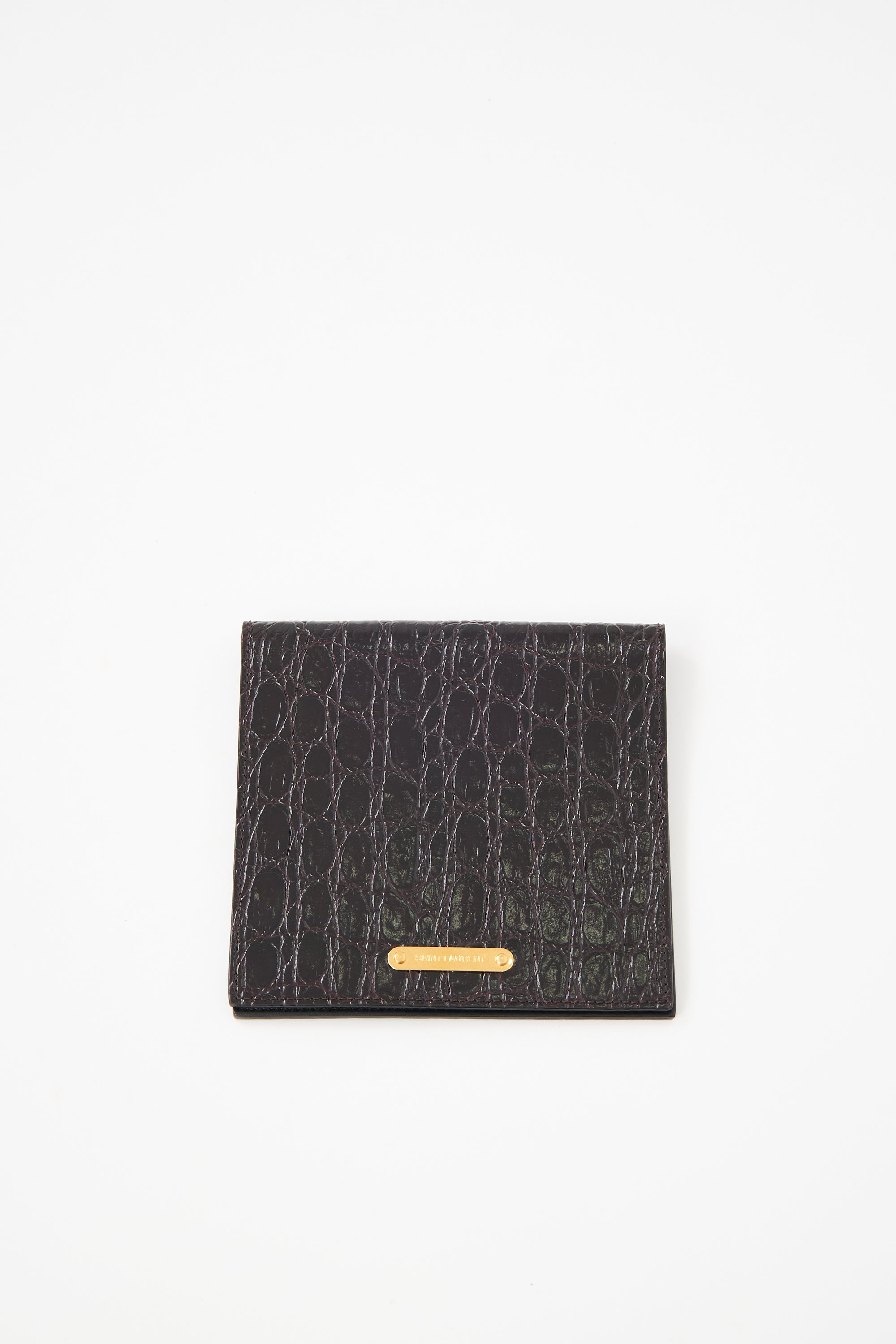 Pre-owned Saint Laurent black leather passport holder featuring embossed croc pattern, gold tone logo hardware at front, magnetic closure, monogram 'A.H.' at interior, and one slip pocket.