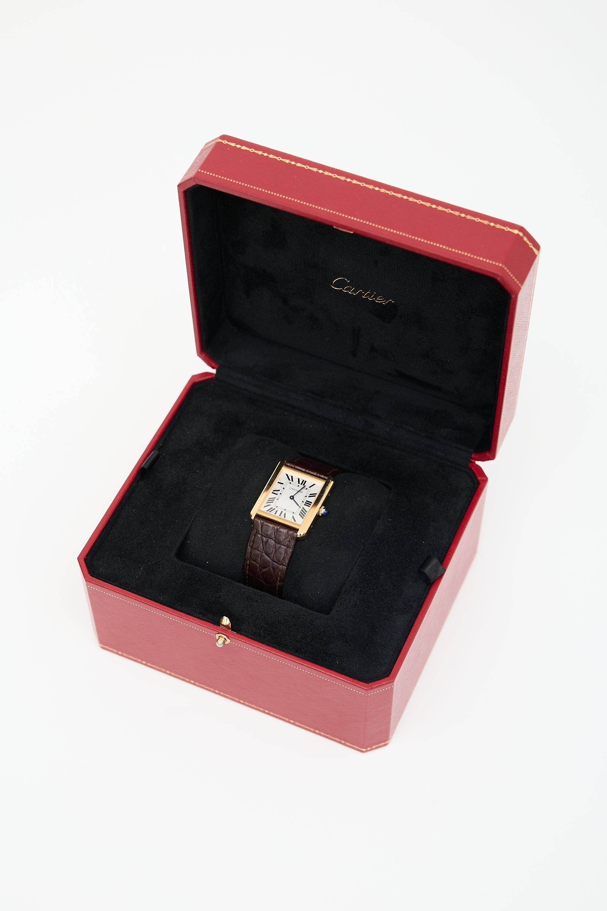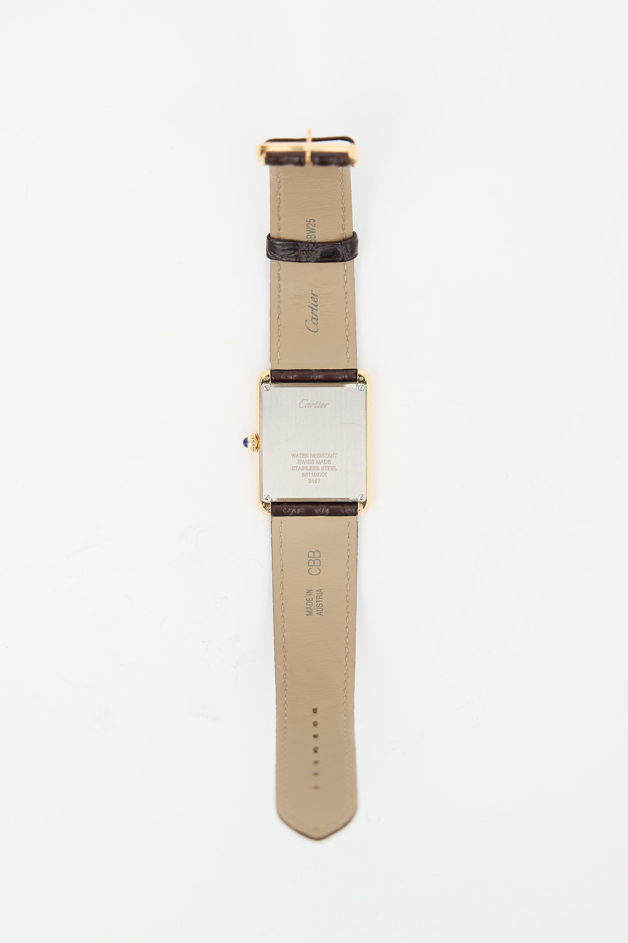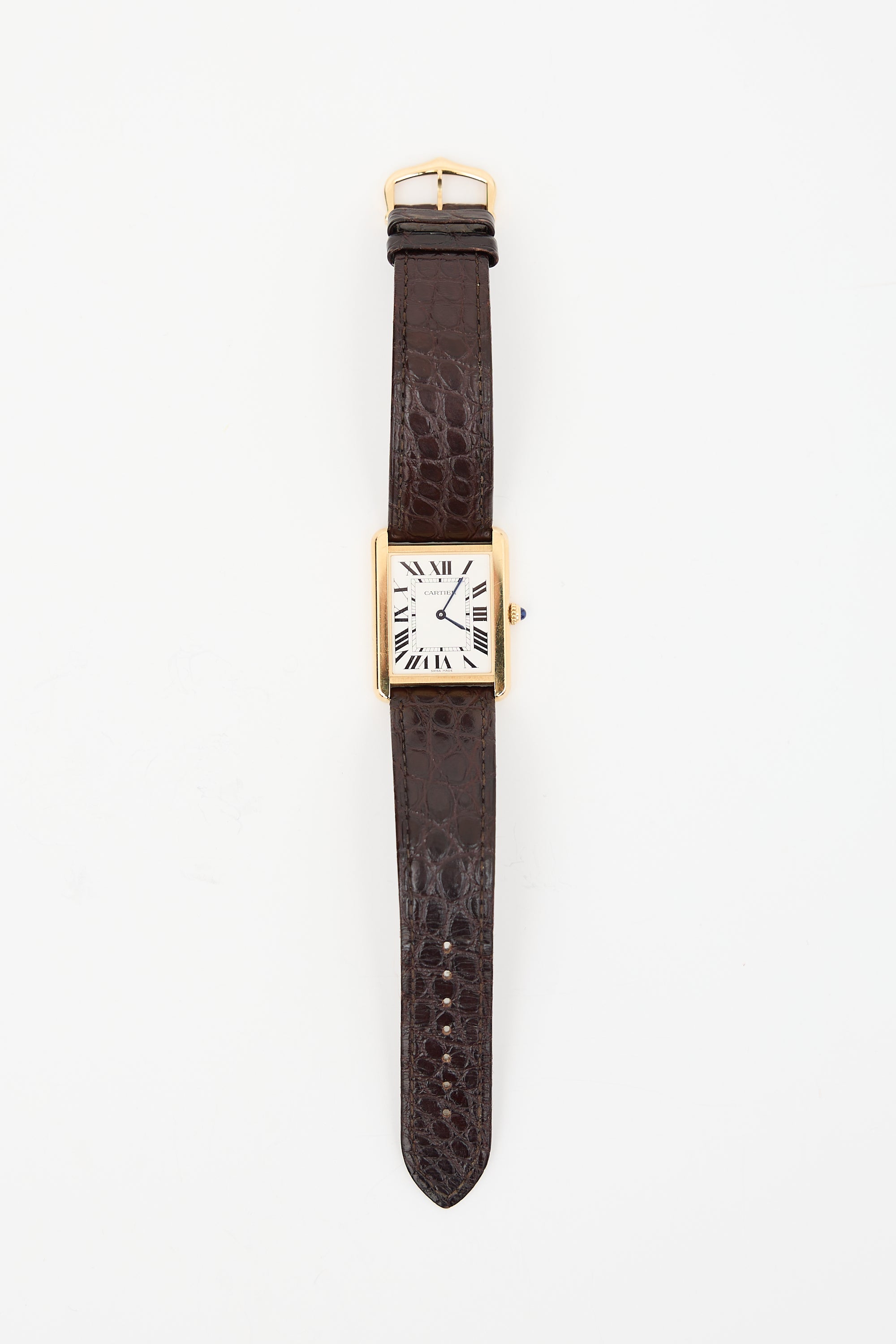 Pre-owned Cartier stainless steel Tank Solo watch featuring an adjustable brown alligator leather strap, 28mm 18k yellow gold case, black Roman numeral dial, and sapphire cabochon. Comes with original box, case, care guide, and card of authenticity.
