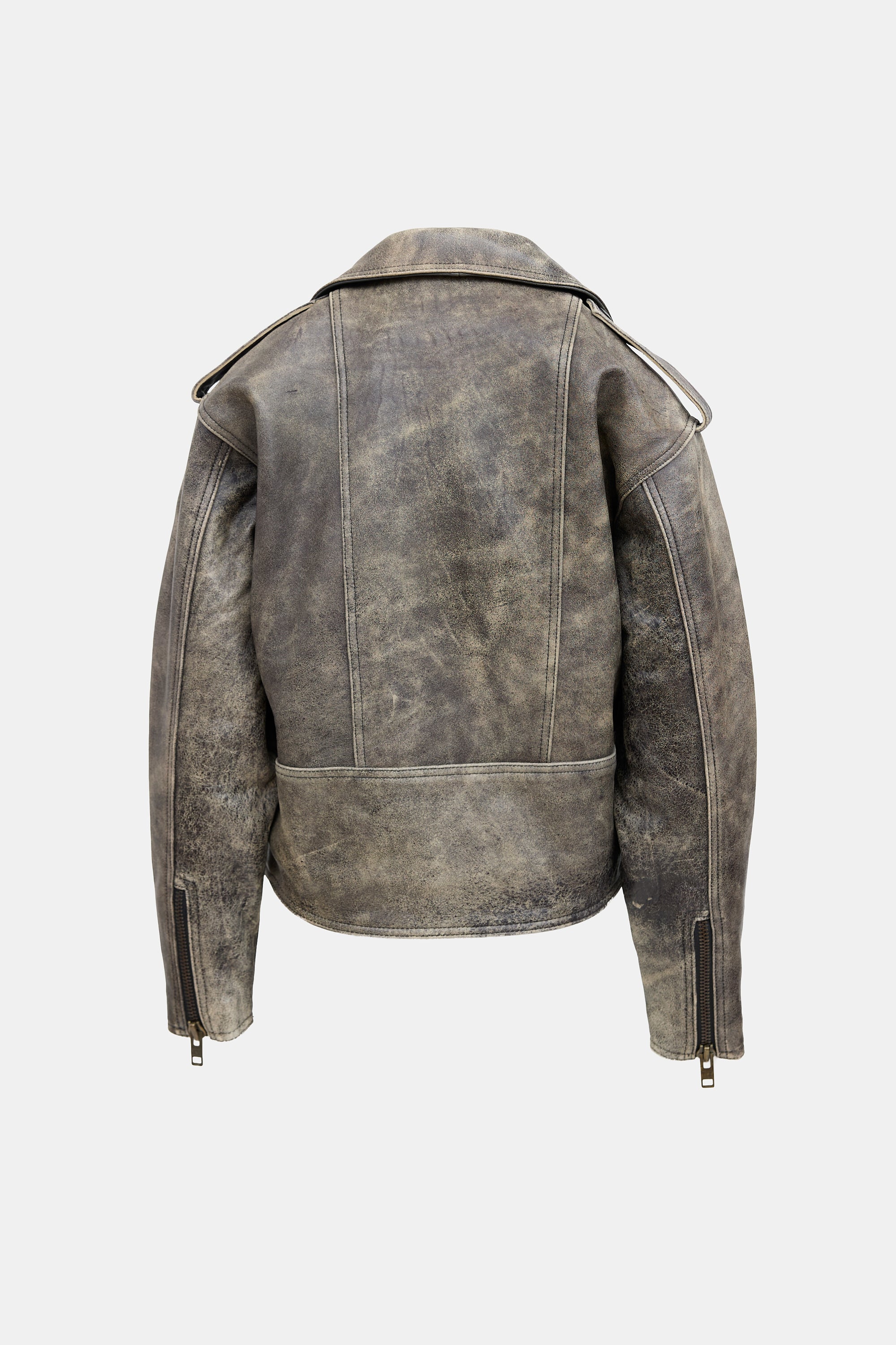 Pre-owned Beau Lax grey leather jacket featuring intentional distressing, zip closure, notched lapel with snap buttons, three zipper pockets at front, zipper cuffs, epaulettes and adjustable buckle belt at waist. Lined.