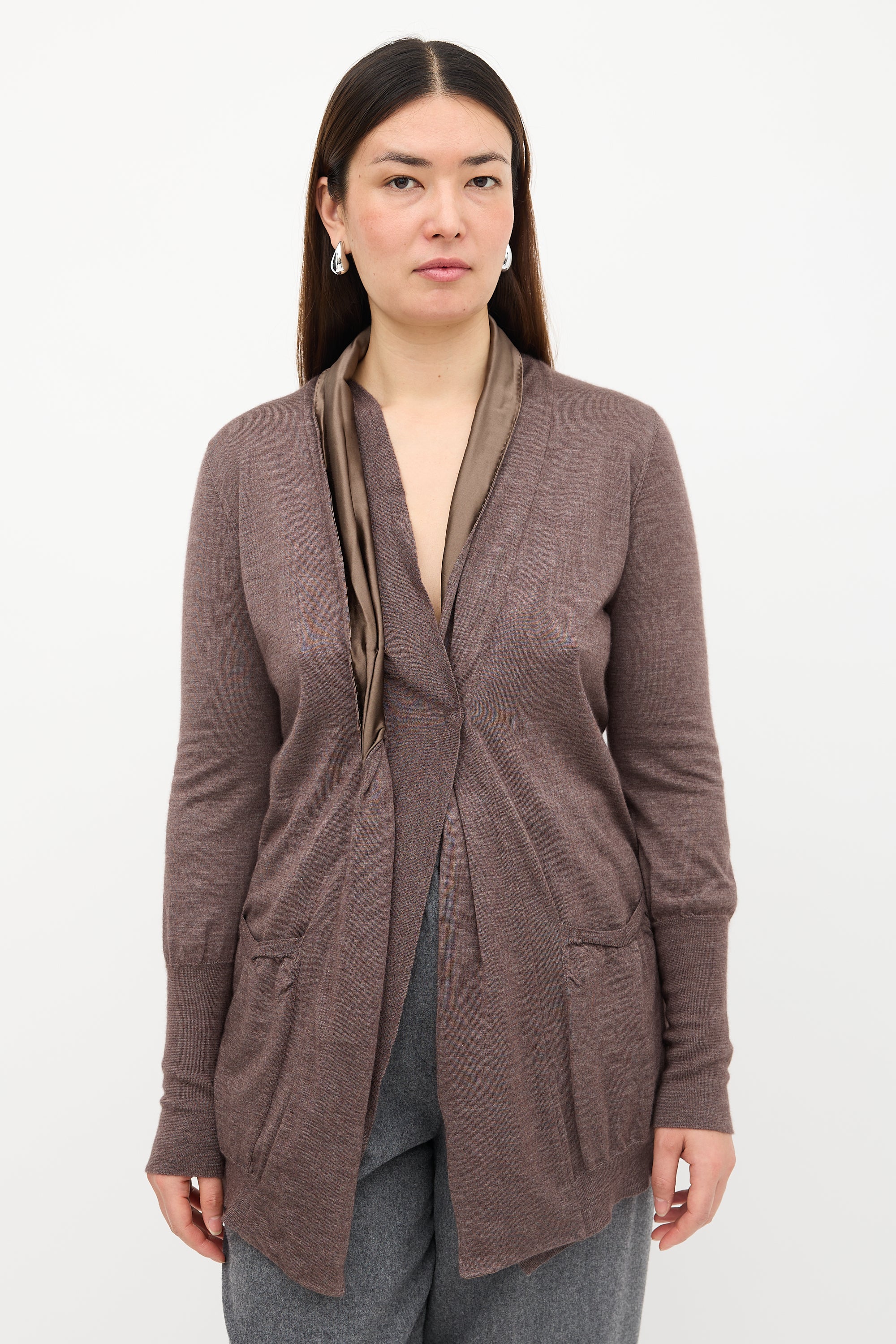 Pre-owned Brunello Cucinelli brown cashmere and silk cardigan featuring a shawl collar with satin trim, concealed snap button closure, pleat at back, two patch pockets at front, and ribbed hem and cuffs.